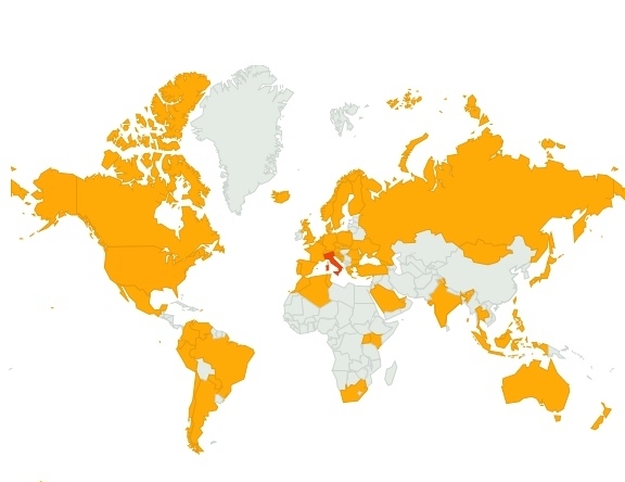 Il mio blog è stato visualizzato in più di 60 Paesi, di cui ho l’onore di fornire un elenco dettagliato, oltre alla mappa che rappresenta fedelmente la porzione di pianeta che Osteriacinematografo è riuscita a raggiungere (o infettare, che dir si voglia), superando di gran lunga le più rosee aspettative del sottoscritto. Grazie davvero da un Oste commosso.