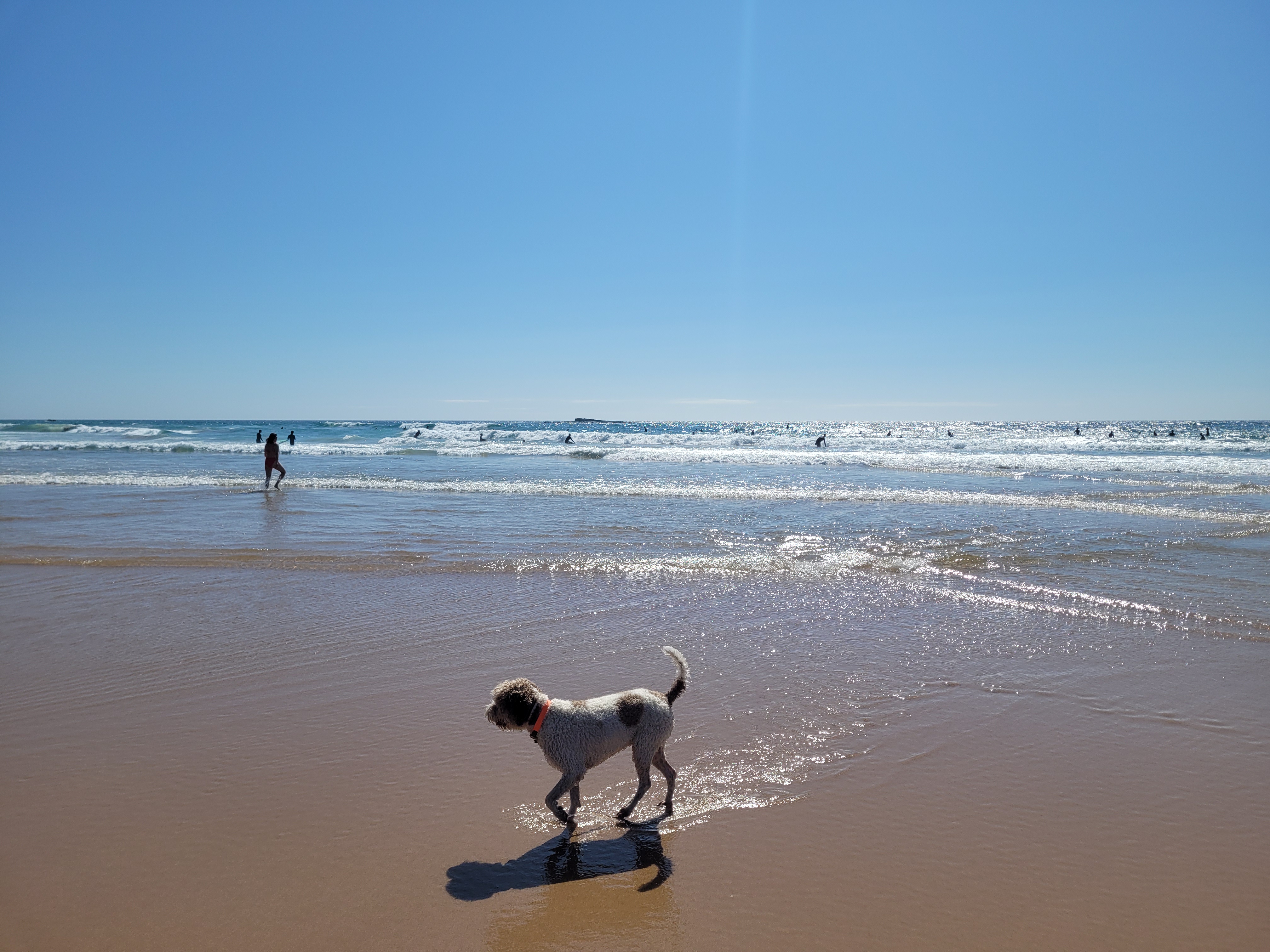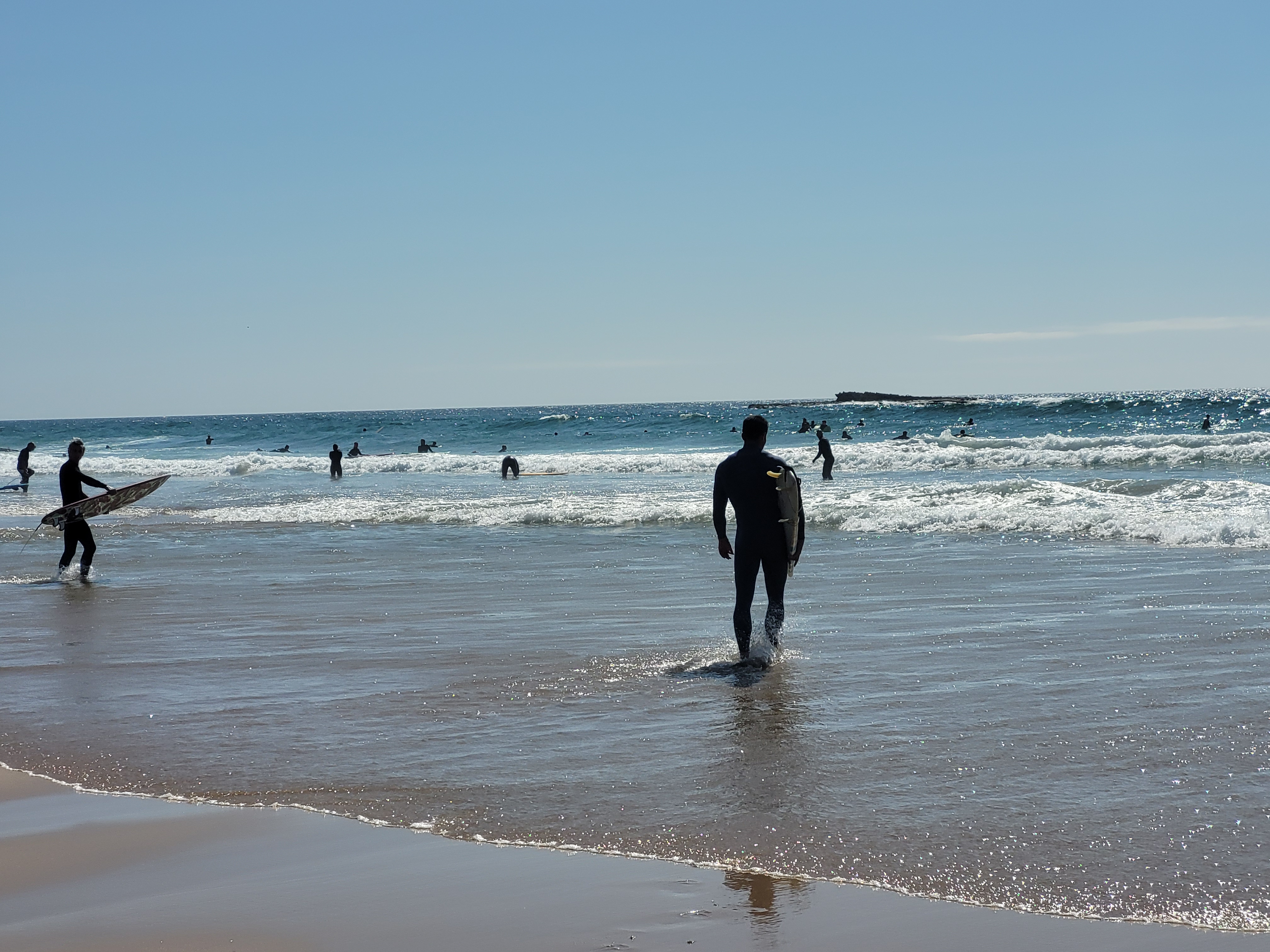 Concludiamo il nostro tour marittimo a Praia Amado, la più bella in assoluto fra quelle visitate, per l’atmosfera rilassata che si può respirare a pieni polmoni da quelle parti. I surfisti punteggiano l’oceano in quel disordine organizzato che è difficile comprendere per noi profani. Da lontano sembra un branco di foche, poi li vedi che galleggiano e si barcamenano e chiacchierano leggeri in attesa dell’onda giusta, col sole enorme a campeggiare alle loro spalle e il vento che domina ogni recesso ed agita il mare.