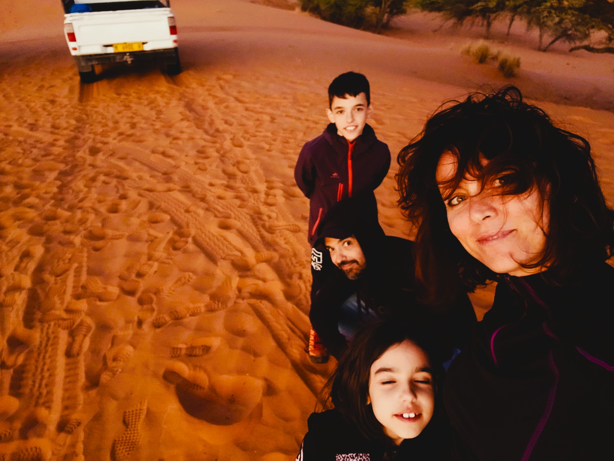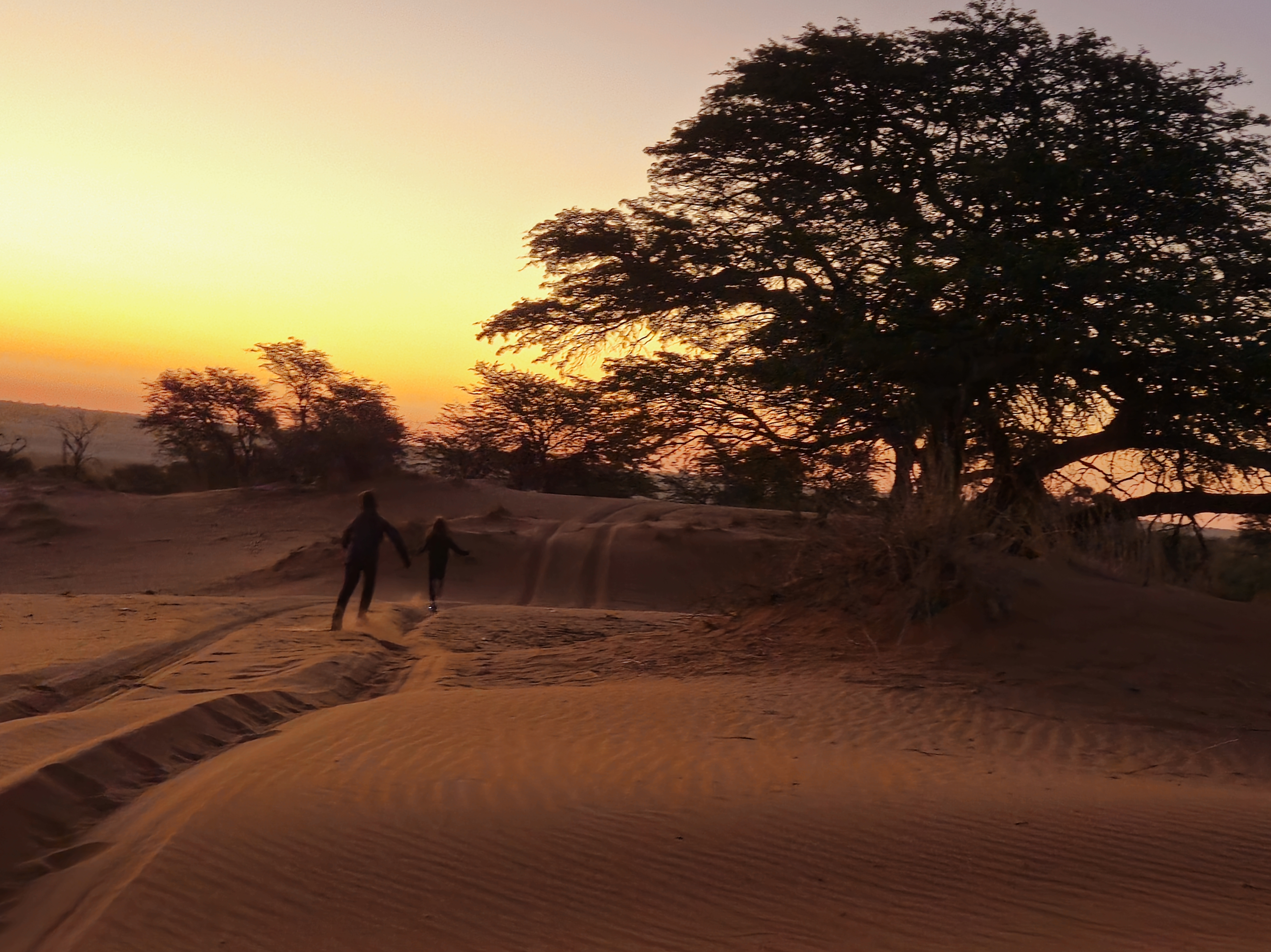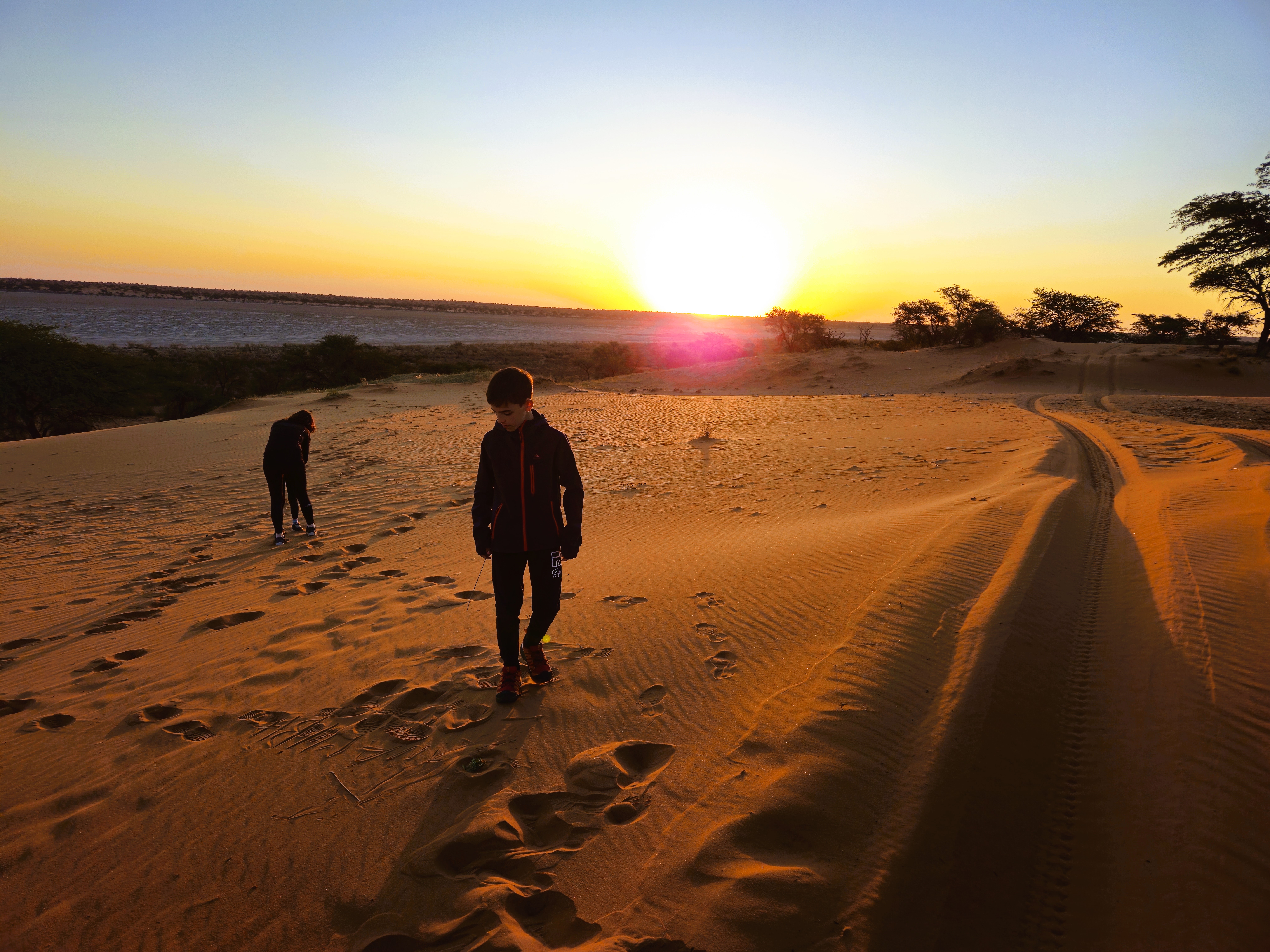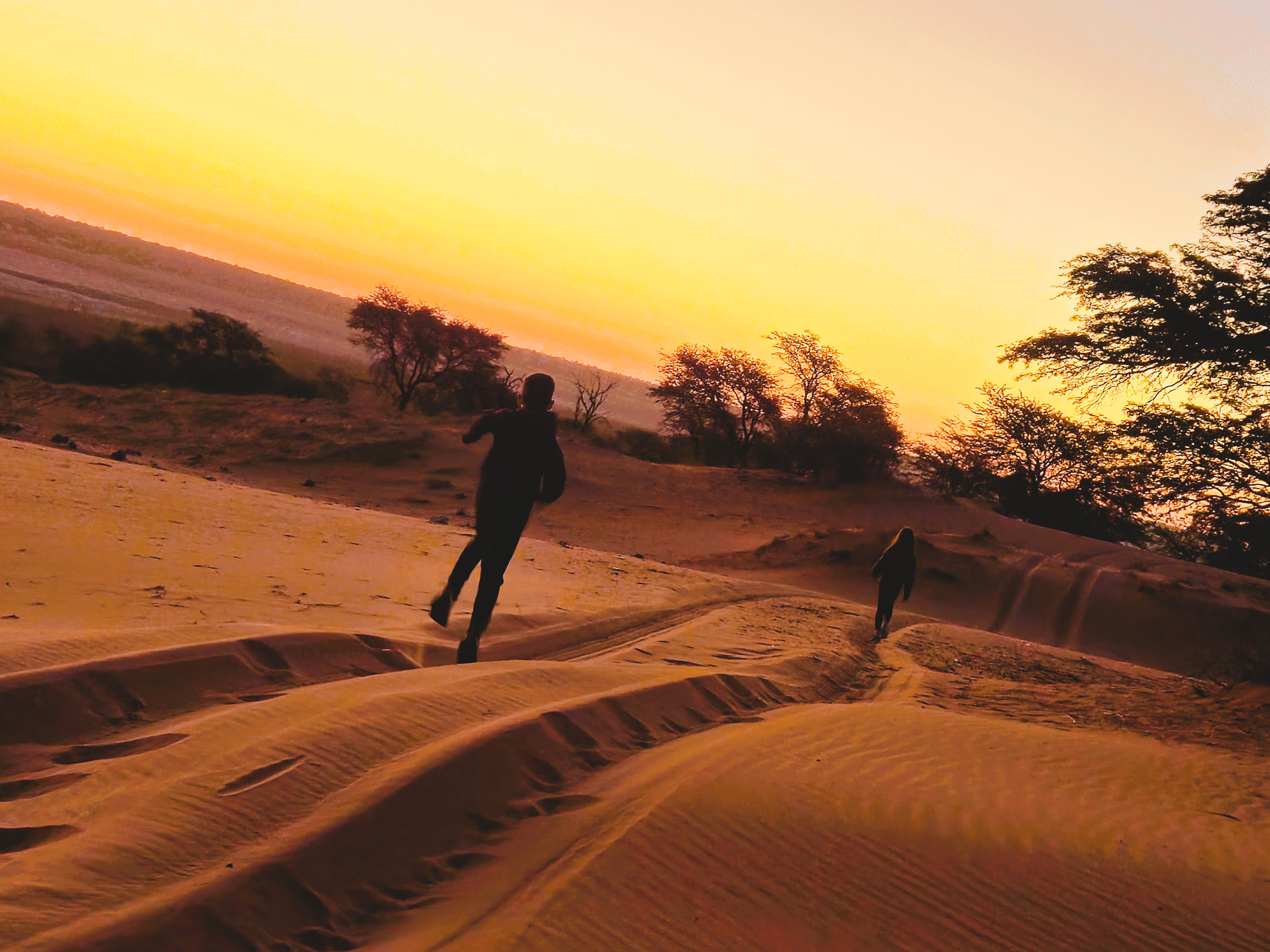 La gita è rilassante, per una volta è stupendo lasciar guidare altri e andare a passo d’uomo senza pensieri. Quando il tramonto si avvicina ci fermiamo sul crinale di alcune dune dorate, da cui la vista del deserto sconfina oltre l’impercettibile. Mentre Mr Janssen e il suo collaboratore allestiscono un piccolo banchetto, noi contempliamo e perlustriamo a piedi quel luogo magico. I bambini corrono su e giù nella sabbia soffice: è bello vederli sorridenti e leggeri dopo una giornata complessa. Ma ormai lo sappiamo, il viaggiatore è incline alle turbolenze, alle frequenti oscillazioni che rendono il cammino imprevedibile. Senza quella imprevedibilità saremmo semplici turisti, indaffarati soltanto a riempire uno spazio recintato da altri.