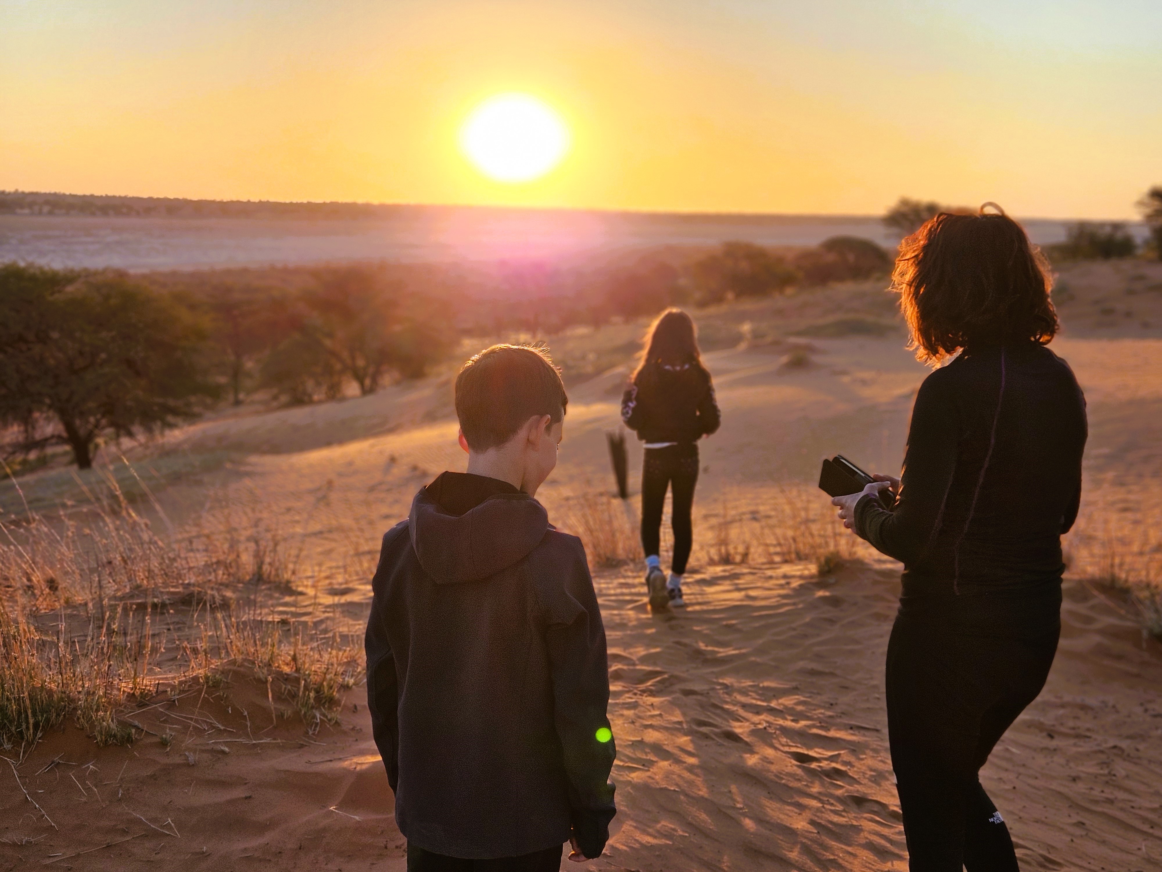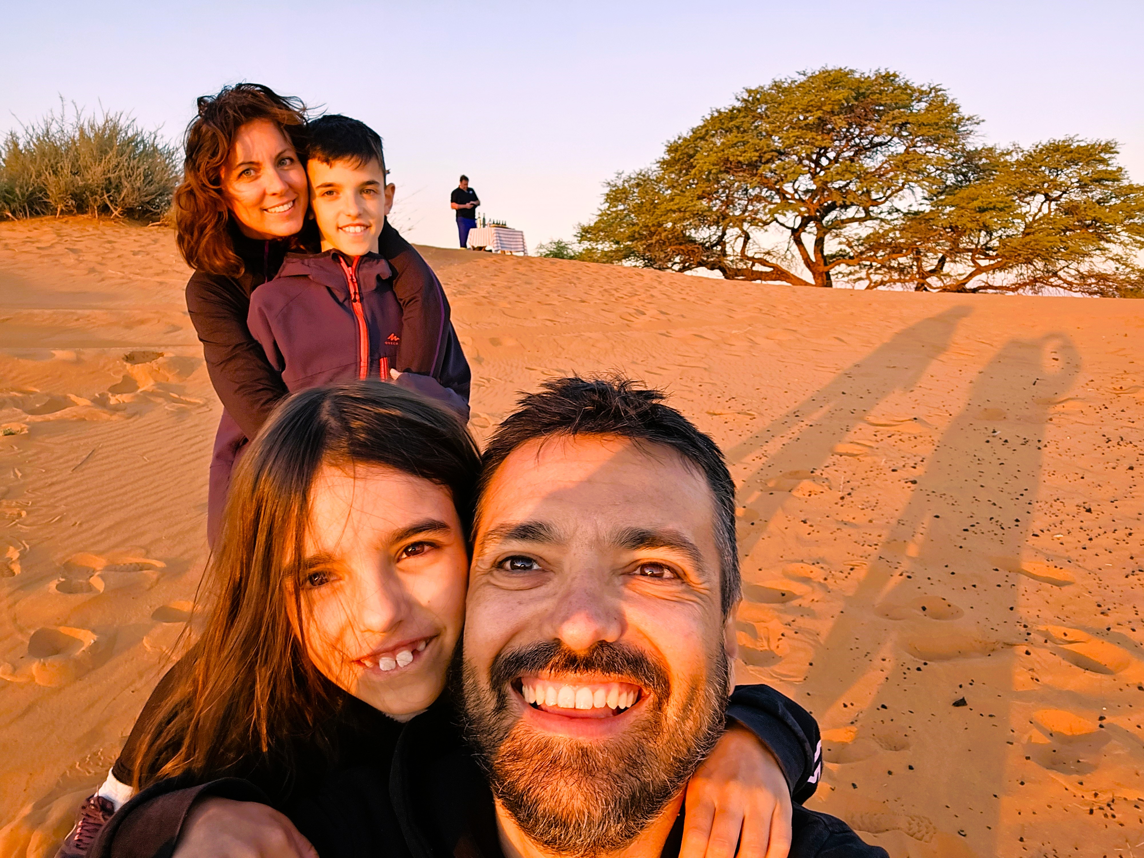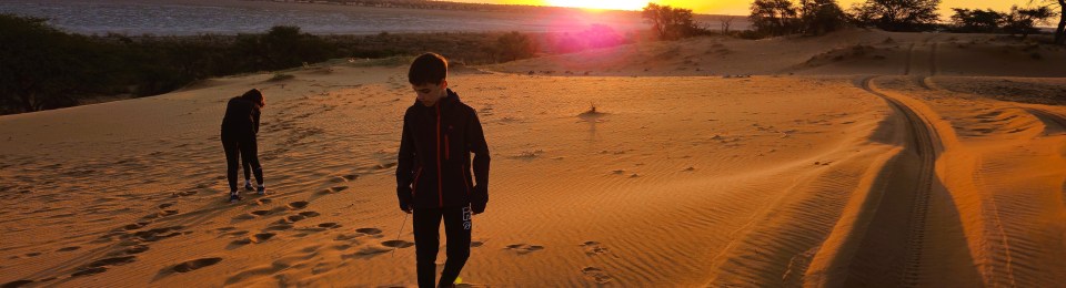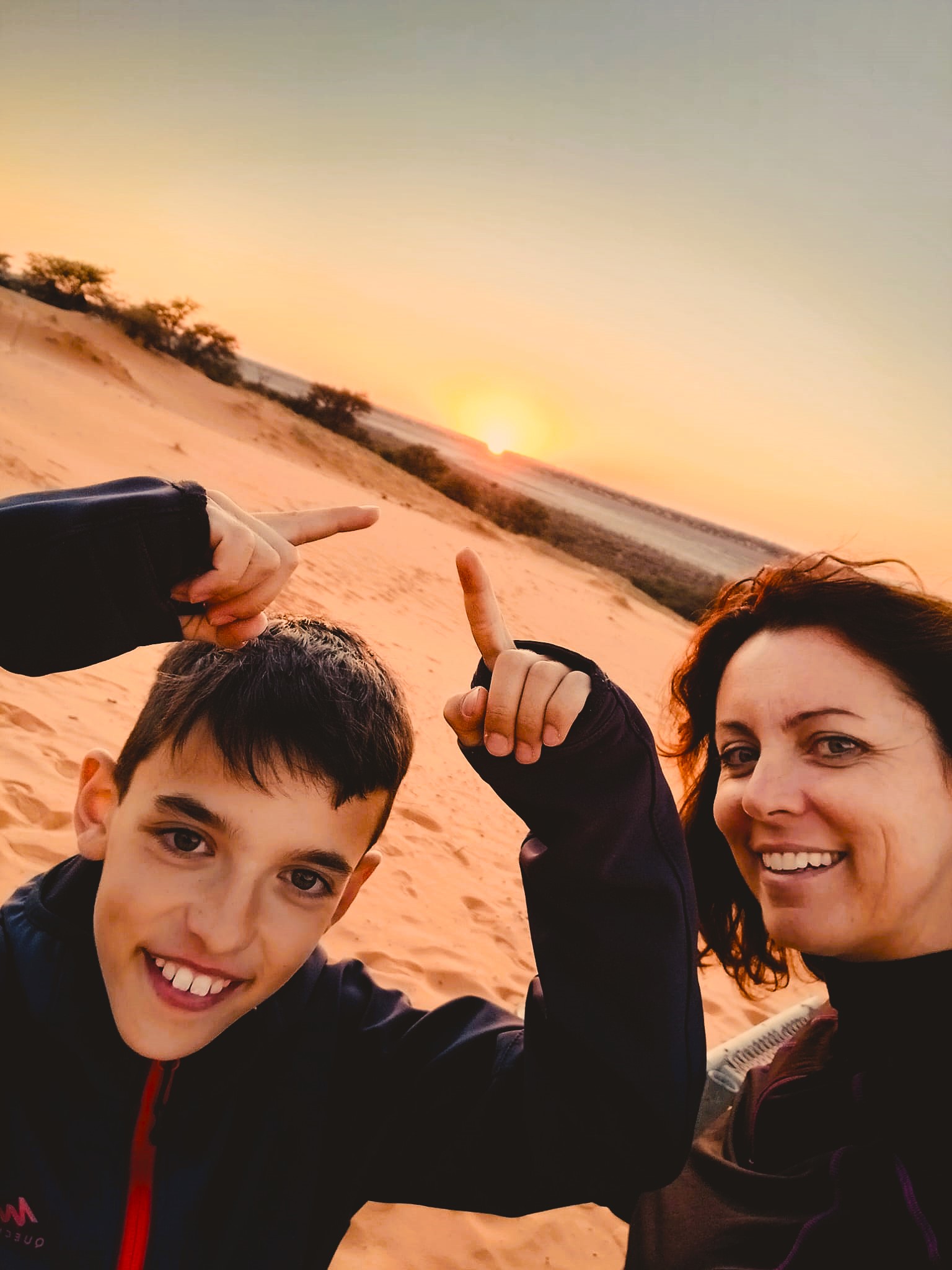 La gita è rilassante, per una volta è stupendo lasciar guidare altri e andare a passo d’uomo senza pensieri. Quando il tramonto si avvicina ci fermiamo sul crinale di alcune dune dorate, da cui la vista del deserto sconfina oltre l’impercettibile. Mentre Mr Janssen e il suo collaboratore allestiscono un piccolo banchetto, noi contempliamo e perlustriamo a piedi quel luogo magico. I bambini corrono su e giù nella sabbia soffice: è bello vederli sorridenti e leggeri dopo una giornata complessa. Ma ormai lo sappiamo, il viaggiatore è incline alle turbolenze, alle frequenti oscillazioni che rendono il cammino imprevedibile. Senza quella imprevedibilità saremmo semplici turisti, indaffarati soltanto a riempire uno spazio recintato da altri.