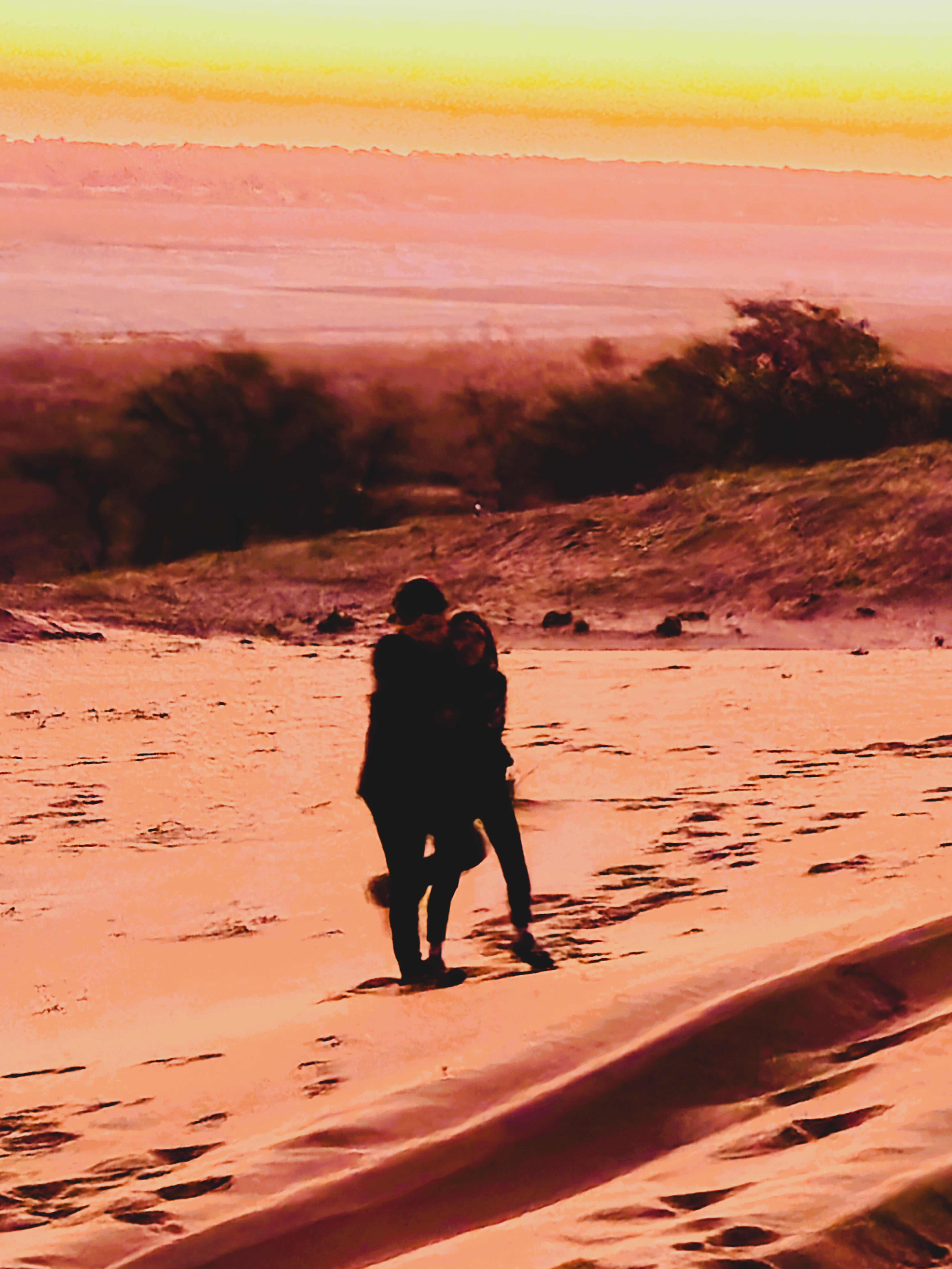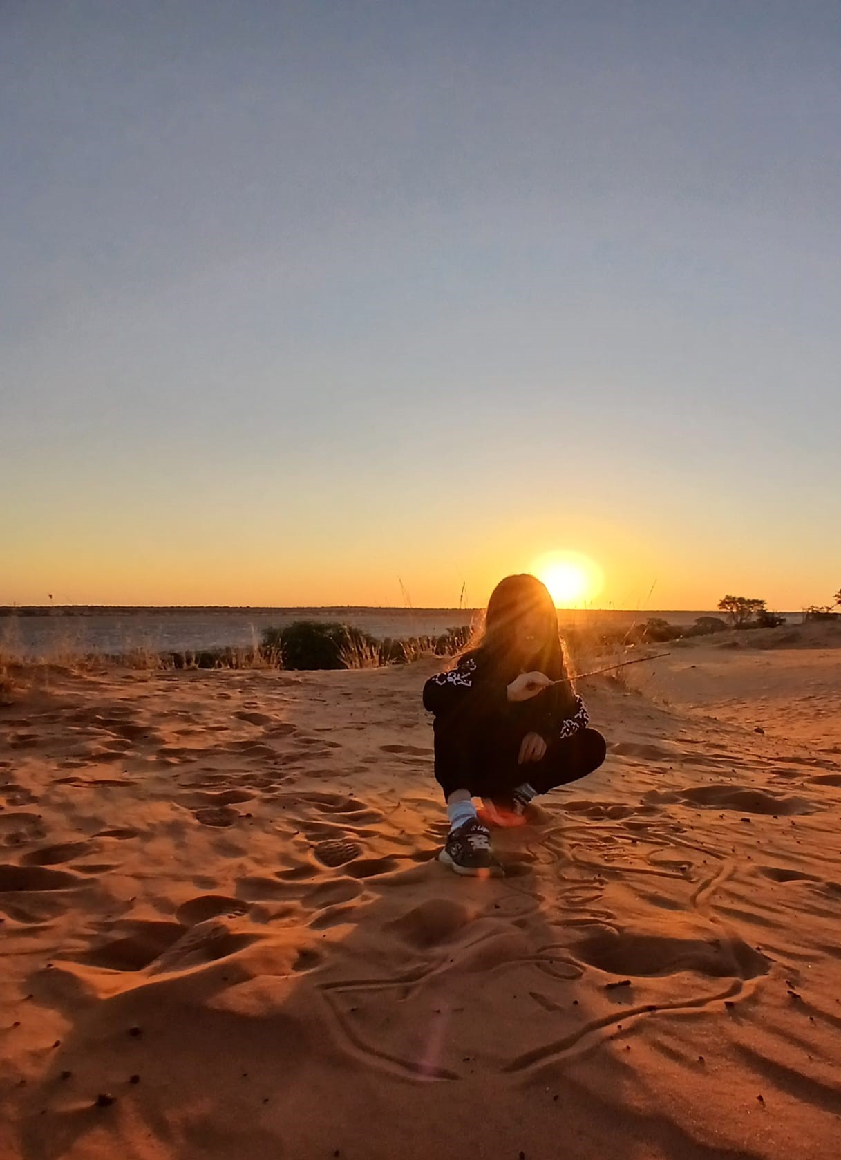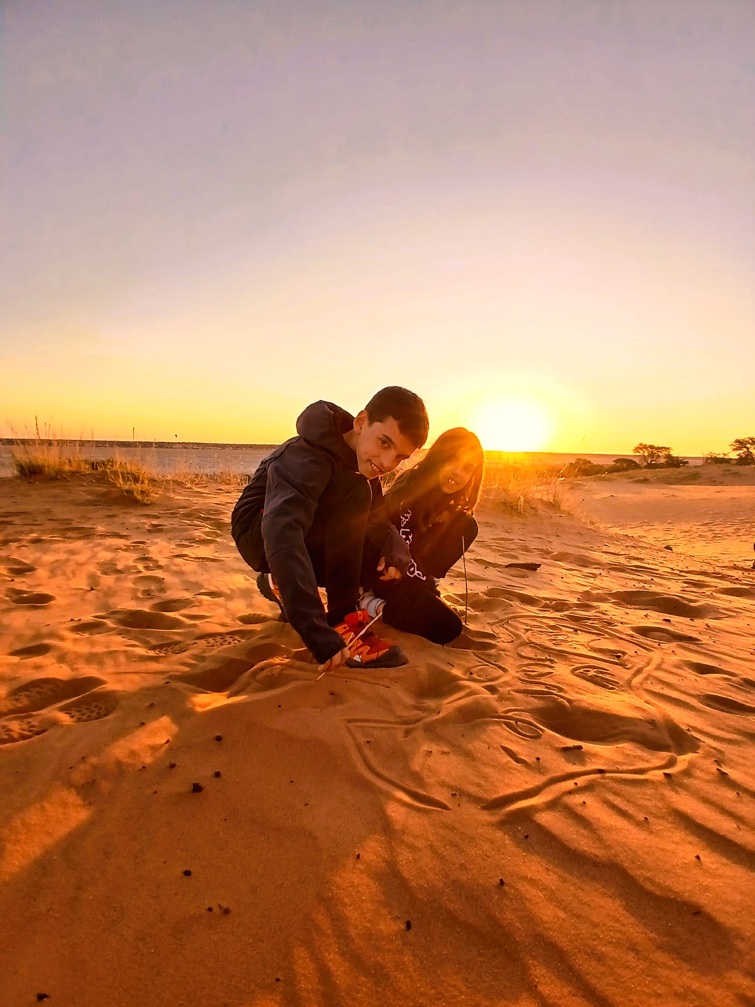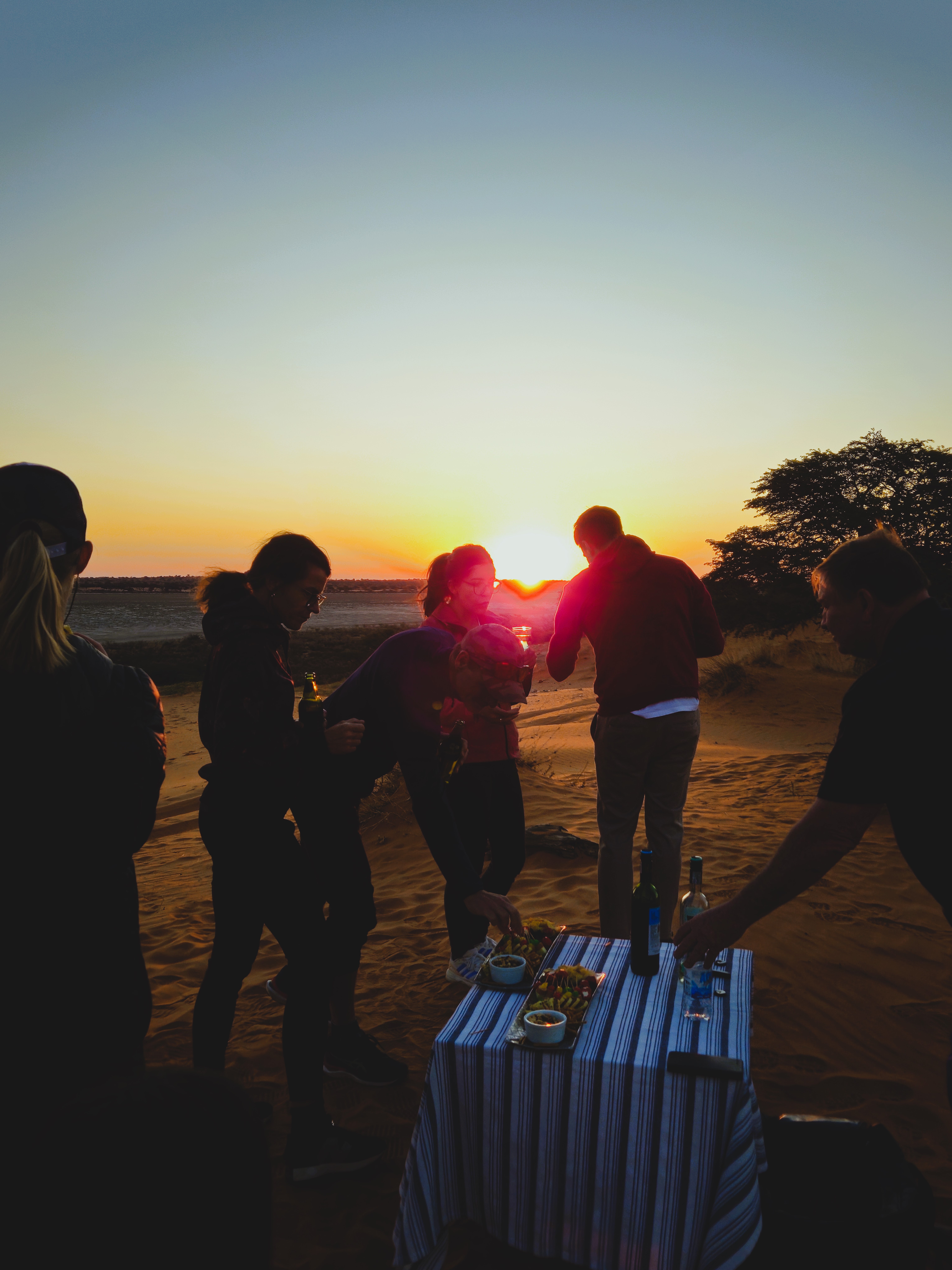La gita è rilassante, per una volta è stupendo lasciar guidare altri e andare a passo d’uomo senza pensieri. Quando il tramonto si avvicina ci fermiamo sul crinale di alcune dune dorate, da cui la vista del deserto sconfina oltre l’impercettibile. Mentre Mr Janssen e il suo collaboratore allestiscono un piccolo banchetto, noi contempliamo e perlustriamo a piedi quel luogo magico. I bambini corrono su e giù nella sabbia soffice: è bello vederli sorridenti e leggeri dopo una giornata complessa. Ma ormai lo sappiamo, il viaggiatore è incline alle turbolenze, alle frequenti oscillazioni che rendono il cammino imprevedibile. Senza quella imprevedibilità saremmo semplici turisti, indaffarati soltanto a riempire uno spazio recintato da altri.