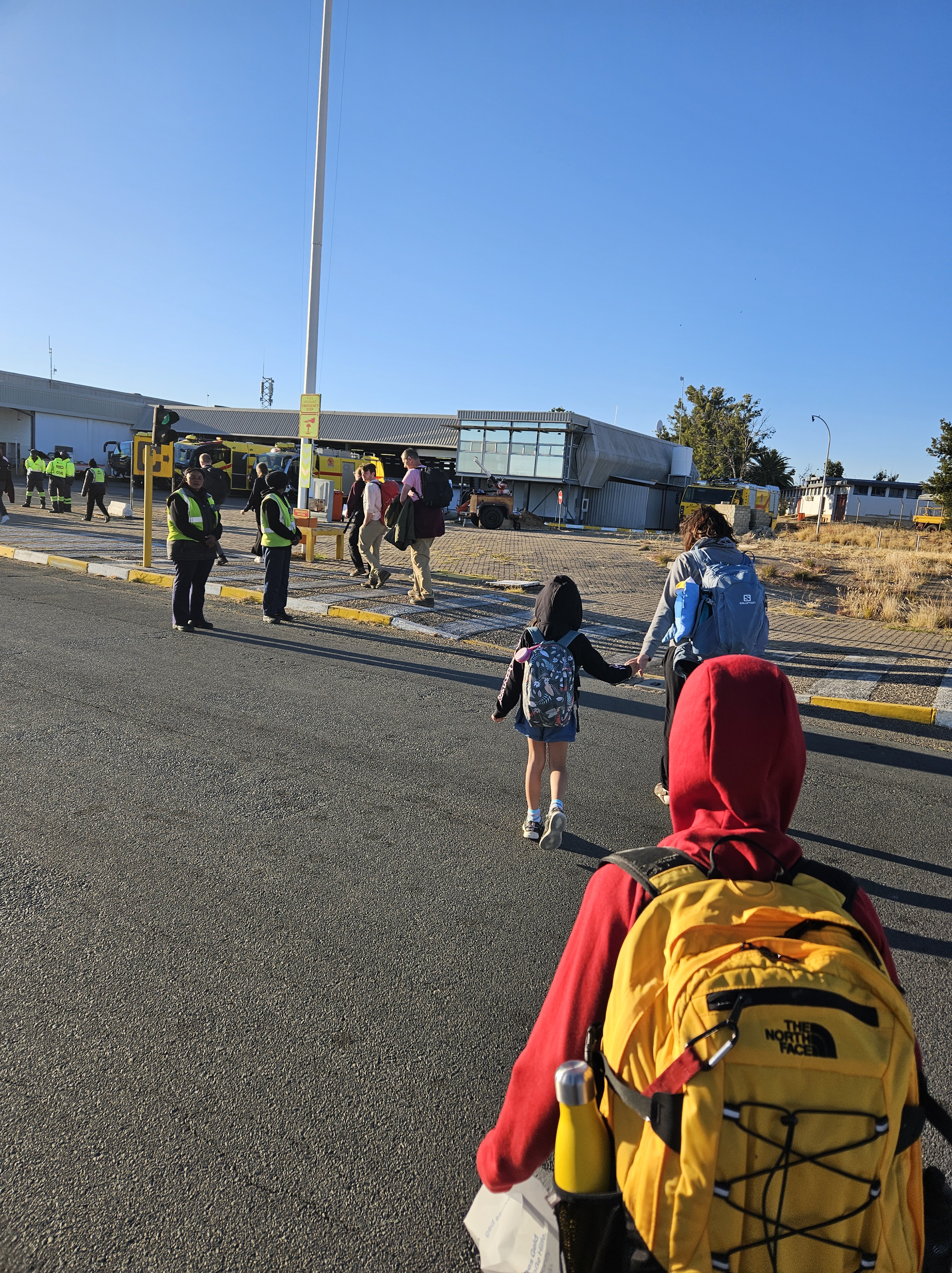 Non appena entrati, ci accolgono il suono delle percussioni e il canto e le grida di un gruppo di donne del luogo. Poi la musica prende forma e si mostra nel trambusto danzante e nel colore fucsia dello sparuto drappello che intrattiene i nuovi arrivati in Namibia. Effettuiamo i controlli piuttosto rapidamente, e anche qui ci chiedono il famigerato certificato di nascita, che però non è in lingua inglese. Indichiamo loro i nomi nostri e dei nostri figli sul magico lasciapassare, un pezzo di carta che per noi vale quanto un biglietto d’oro Wonka. Passiamo oltre e i bagagli stivati tornano rapidamente nella nostra disponibilità. Un altro vantaggio del dover liberare le viscere di un solo aeroplano alla volta.
