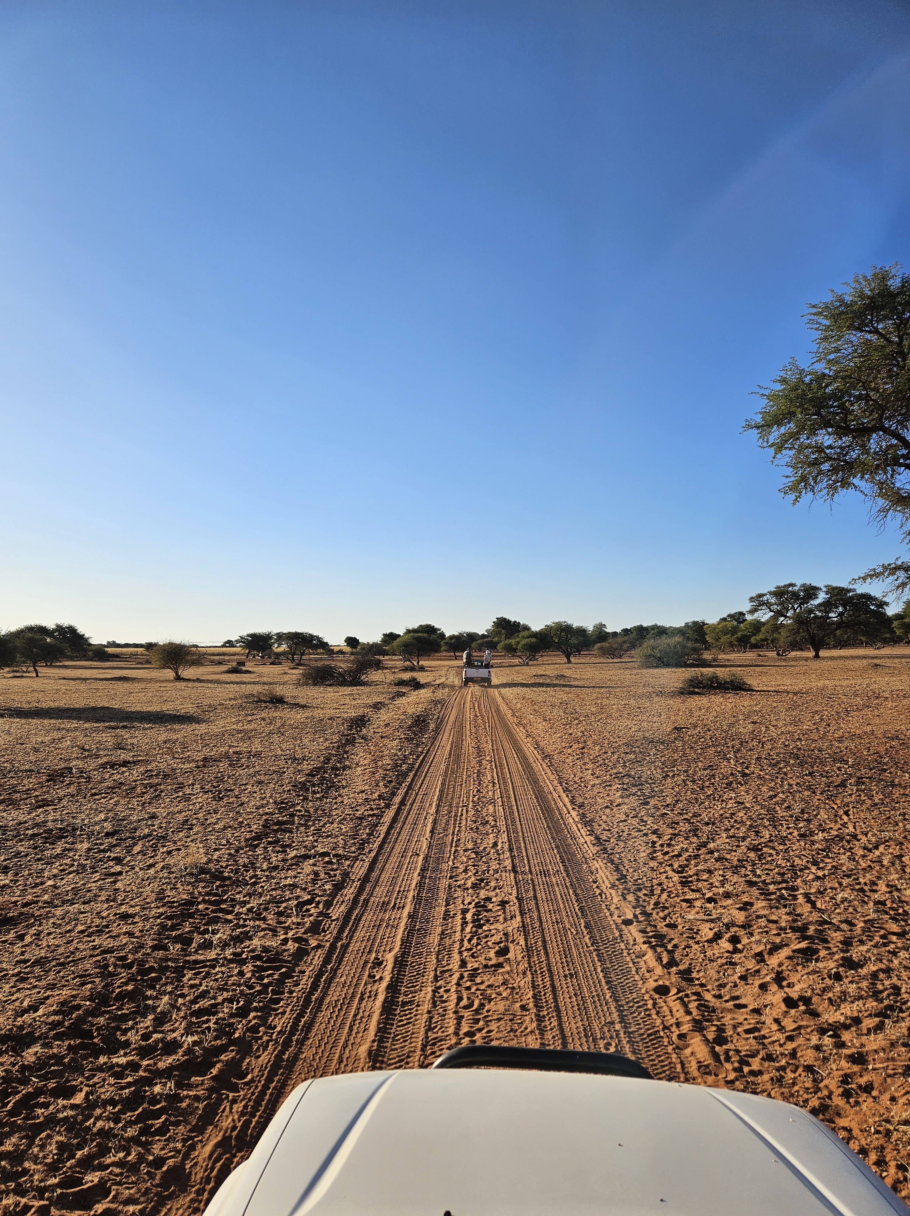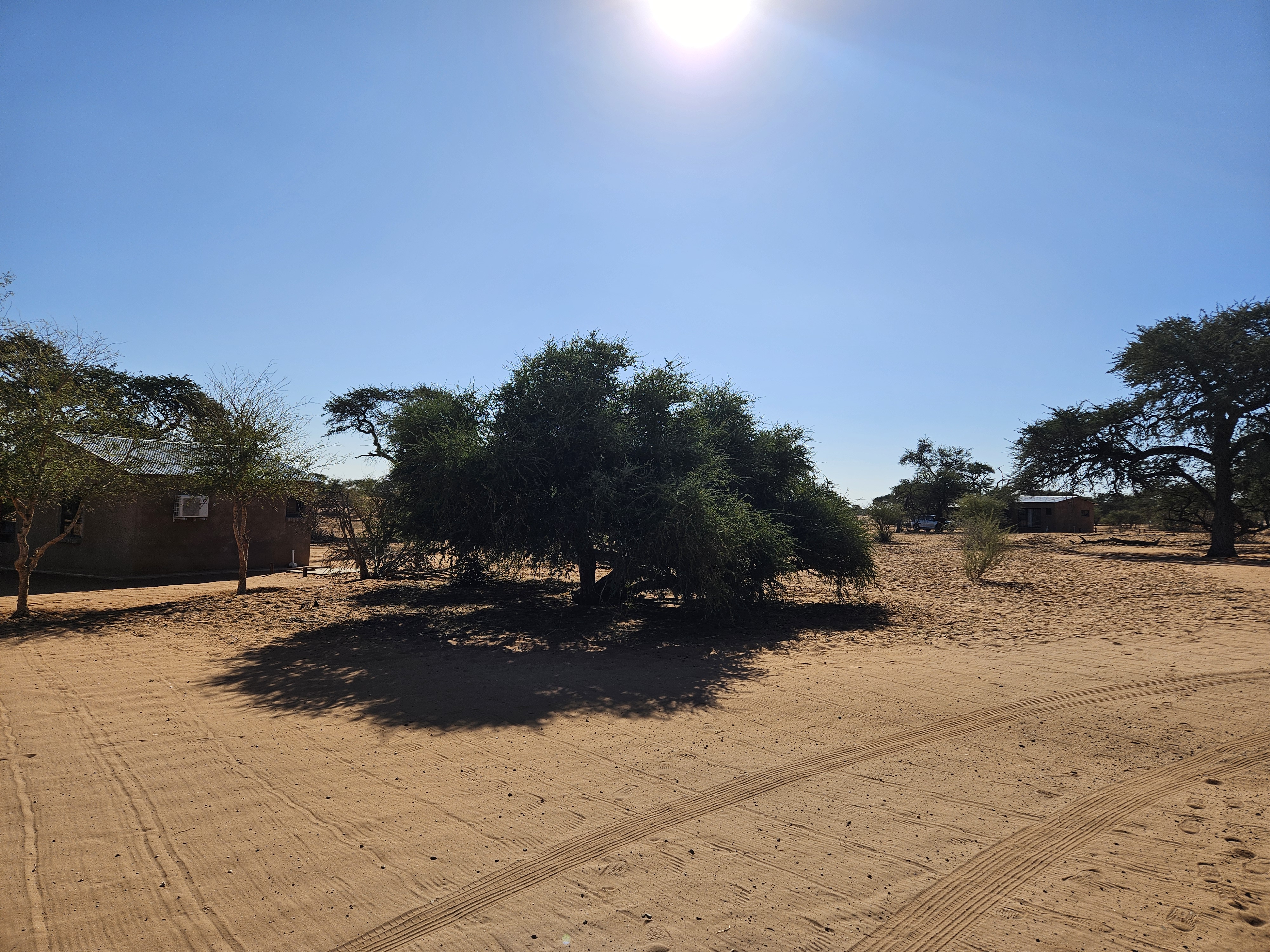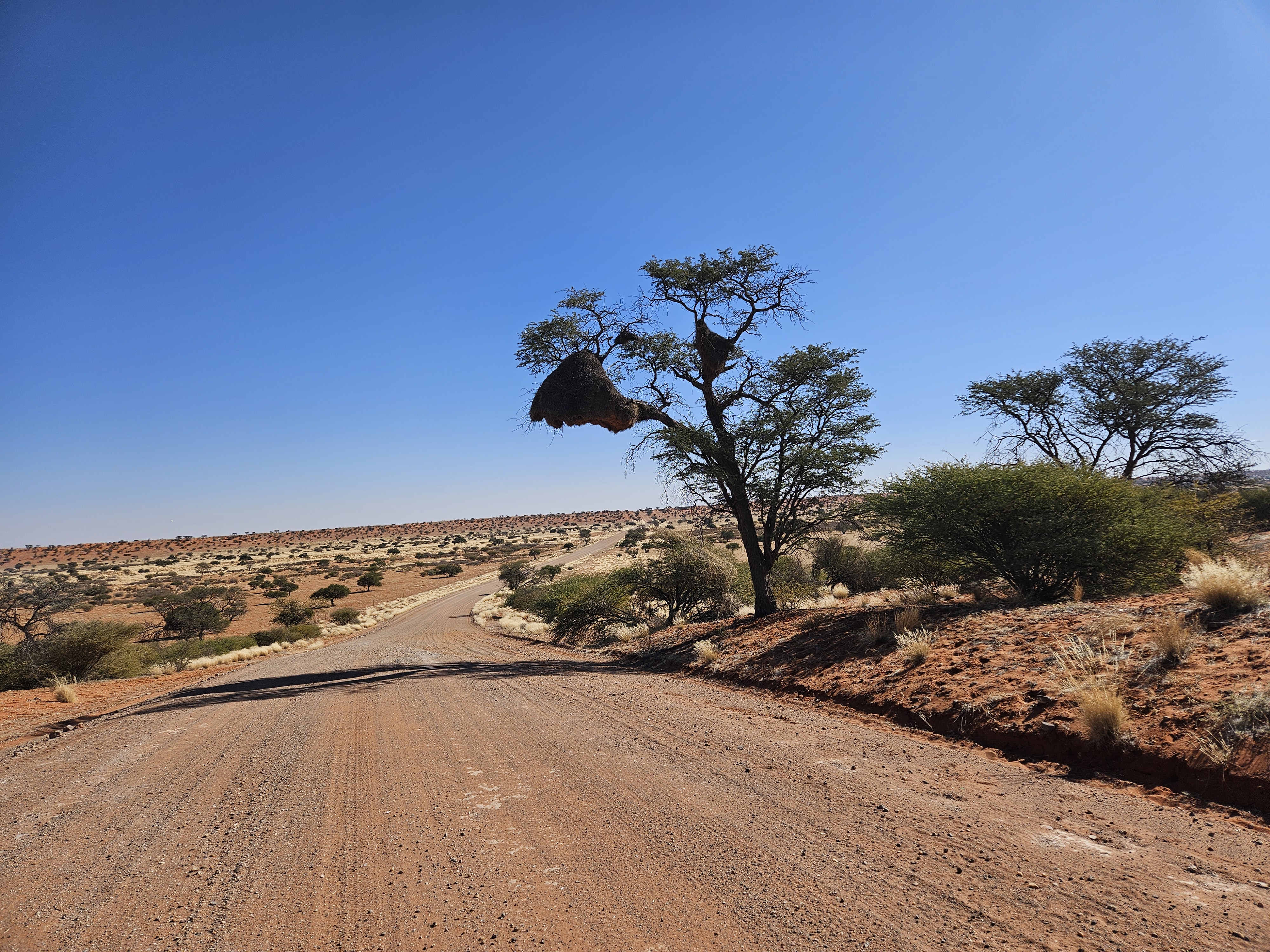 Riprendiamo la via principale e d’un tratto la strada diventa di rocciosa. Dapprima è una roccia abbastanza levigata e piatta, poi frastagliata da solchi orizzontali via via più profondi; infine la strada si trasforma in un dilaniante percorso a ostacoli per evitare buche e massi d’ogni tipo. A quel punto il navigatore impazzisce, e di colpo il tempo di percorrenza aumenta fin quasi a raddoppiare. Mi fermo accanto all’unica jeep che incrociamo per km e un uomo mi spiega che ho imboccato una parallela della strada principale (ma questo lo sapevo già), una via più immersa nel Kalahari, che la strada è tutta così, e che ormai è troppo tardi per tornare indietro: devo proseguire il mio calvario fino a destinazione.