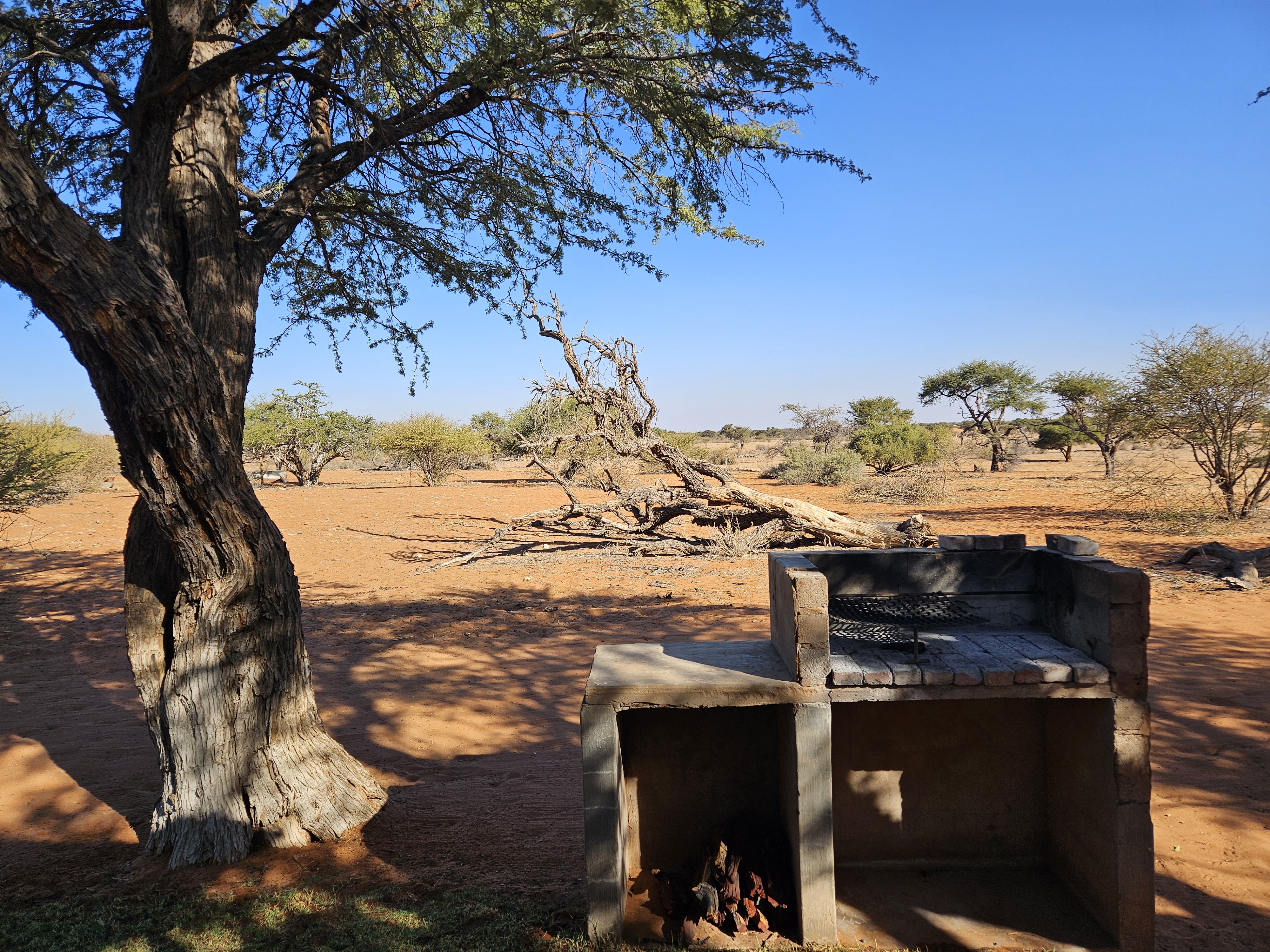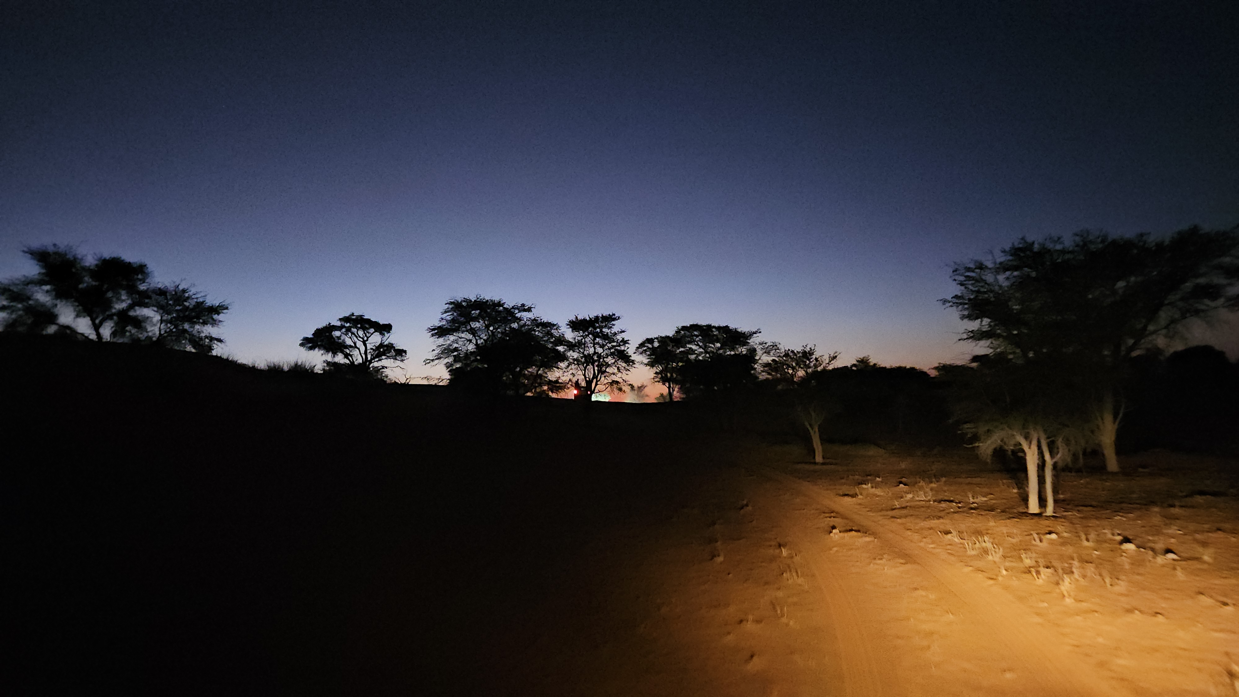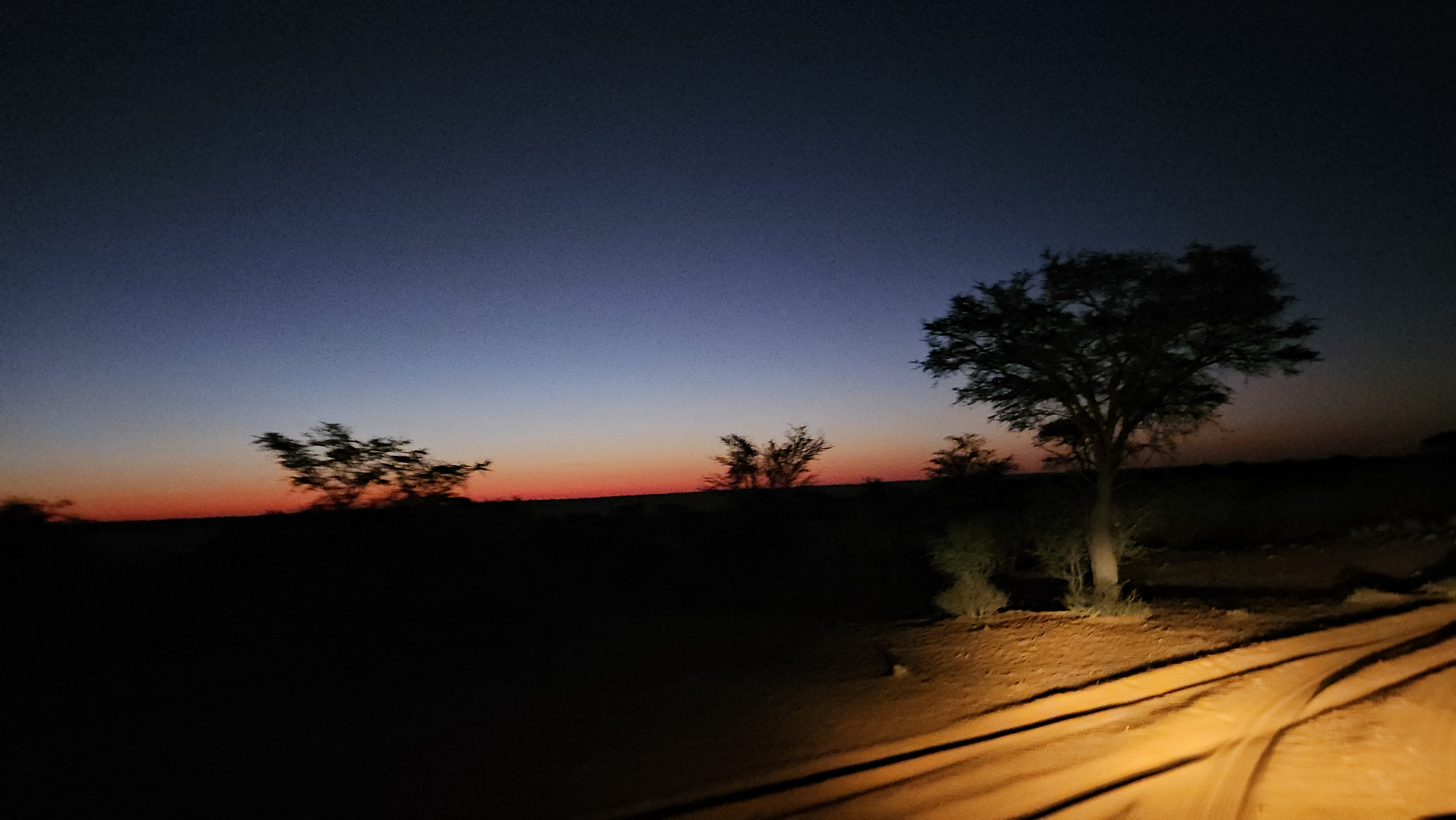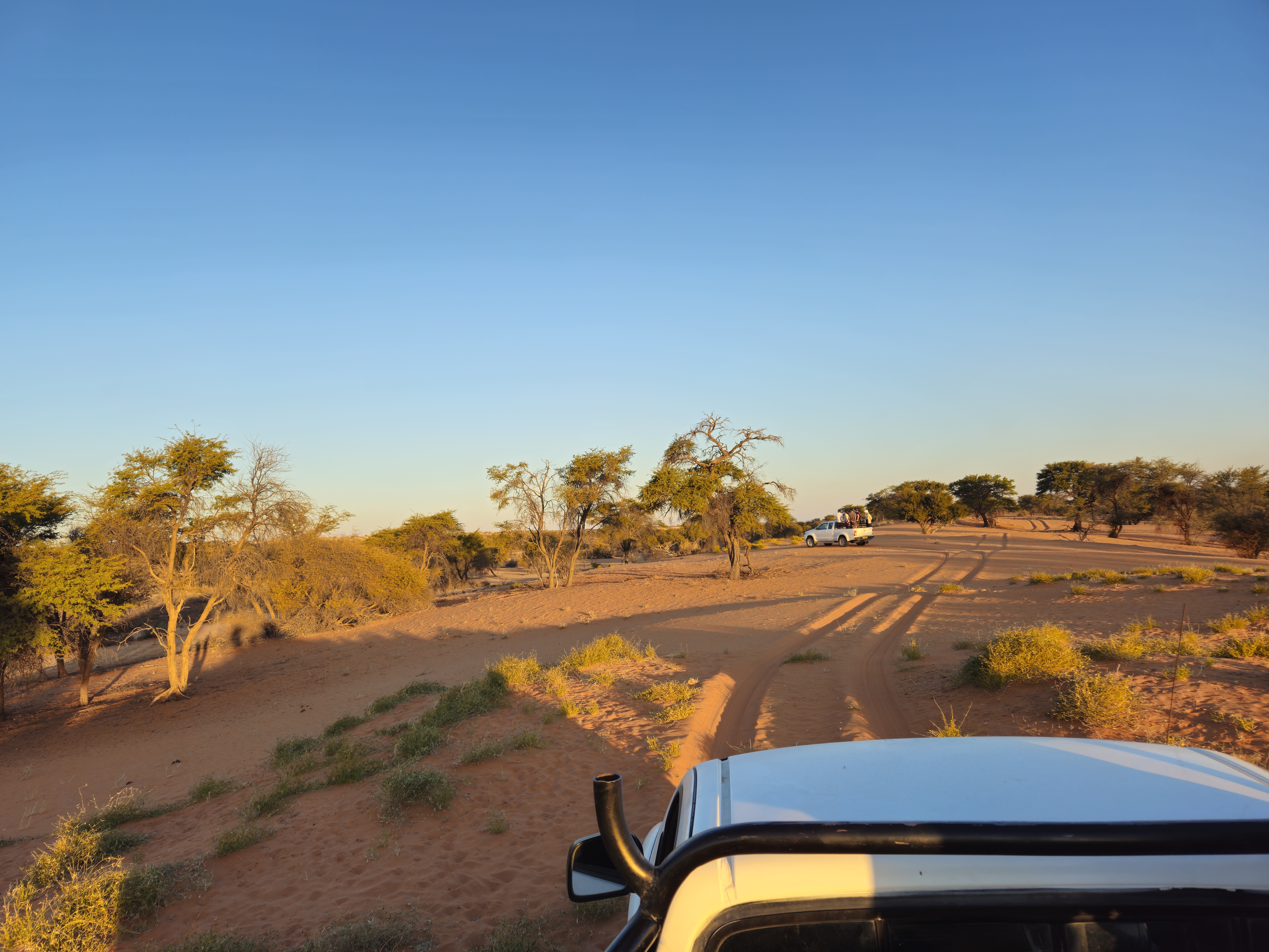 Riprendiamo la via principale e d’un tratto la strada diventa di rocciosa. Dapprima è una roccia abbastanza levigata e piatta, poi frastagliata da solchi orizzontali via via più profondi; infine la strada si trasforma in un dilaniante percorso a ostacoli per evitare buche e massi d’ogni tipo. A quel punto il navigatore impazzisce, e di colpo il tempo di percorrenza aumenta fin quasi a raddoppiare. Mi fermo accanto all’unica jeep che incrociamo per km e un uomo mi spiega che ho imboccato una parallela della strada principale (ma questo lo sapevo già), una via più immersa nel Kalahari, che la strada è tutta così, e che ormai è troppo tardi per tornare indietro: devo proseguire il mio calvario fino a destinazione.