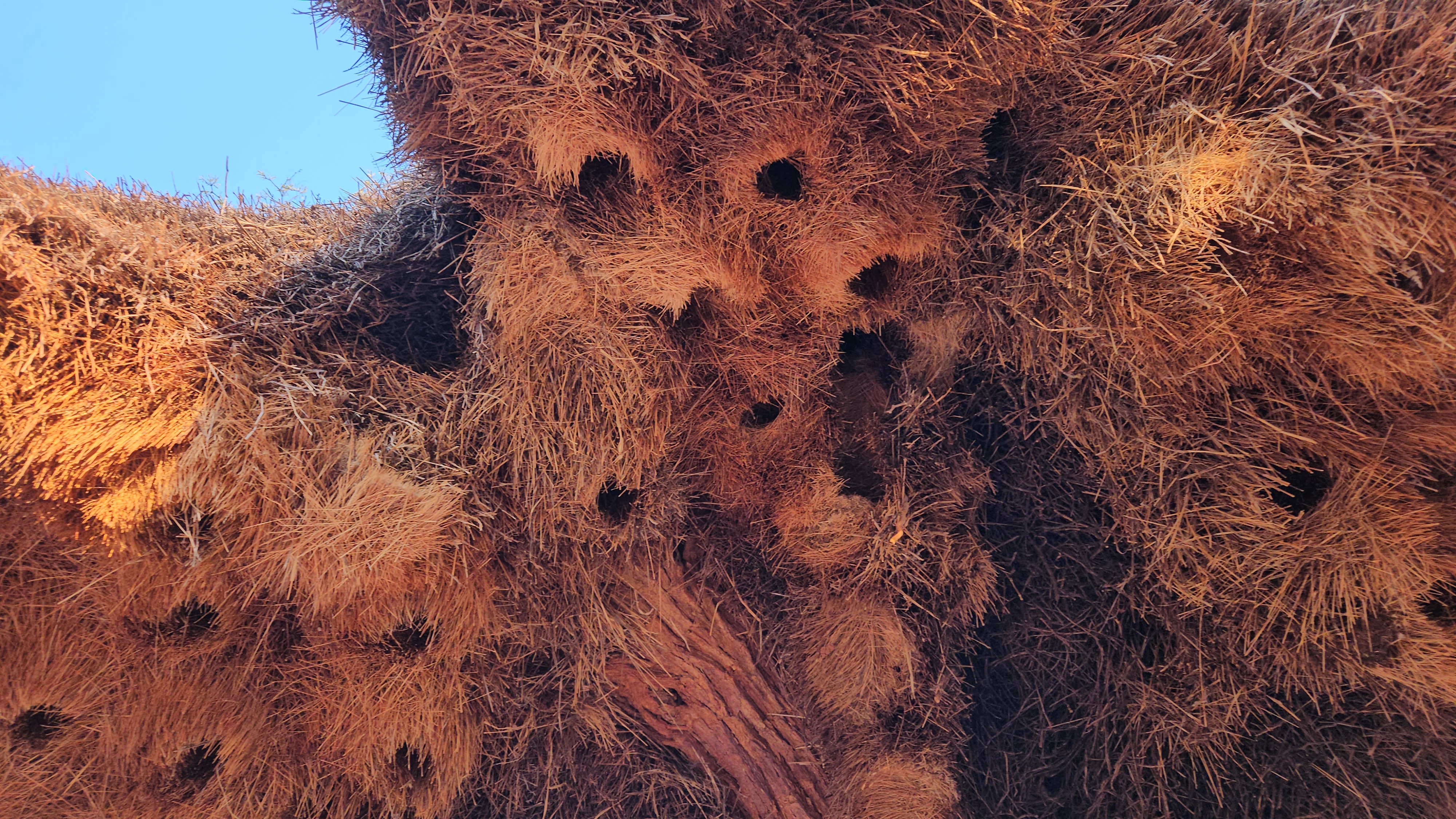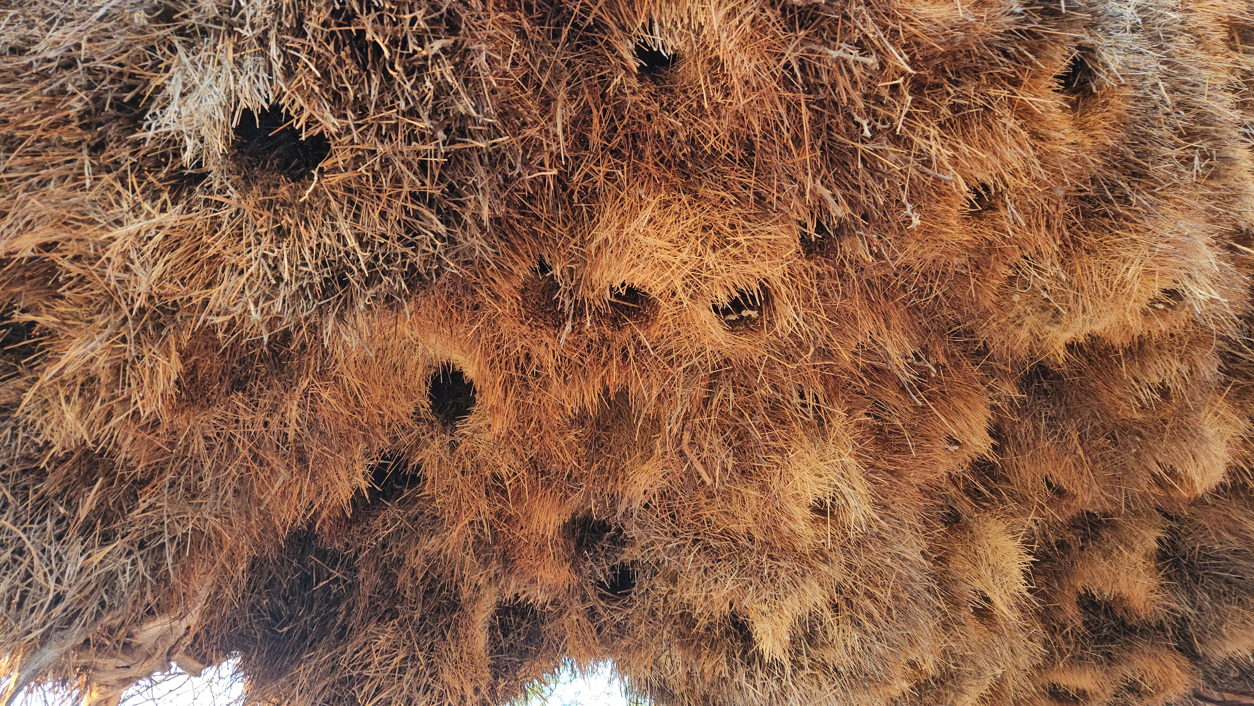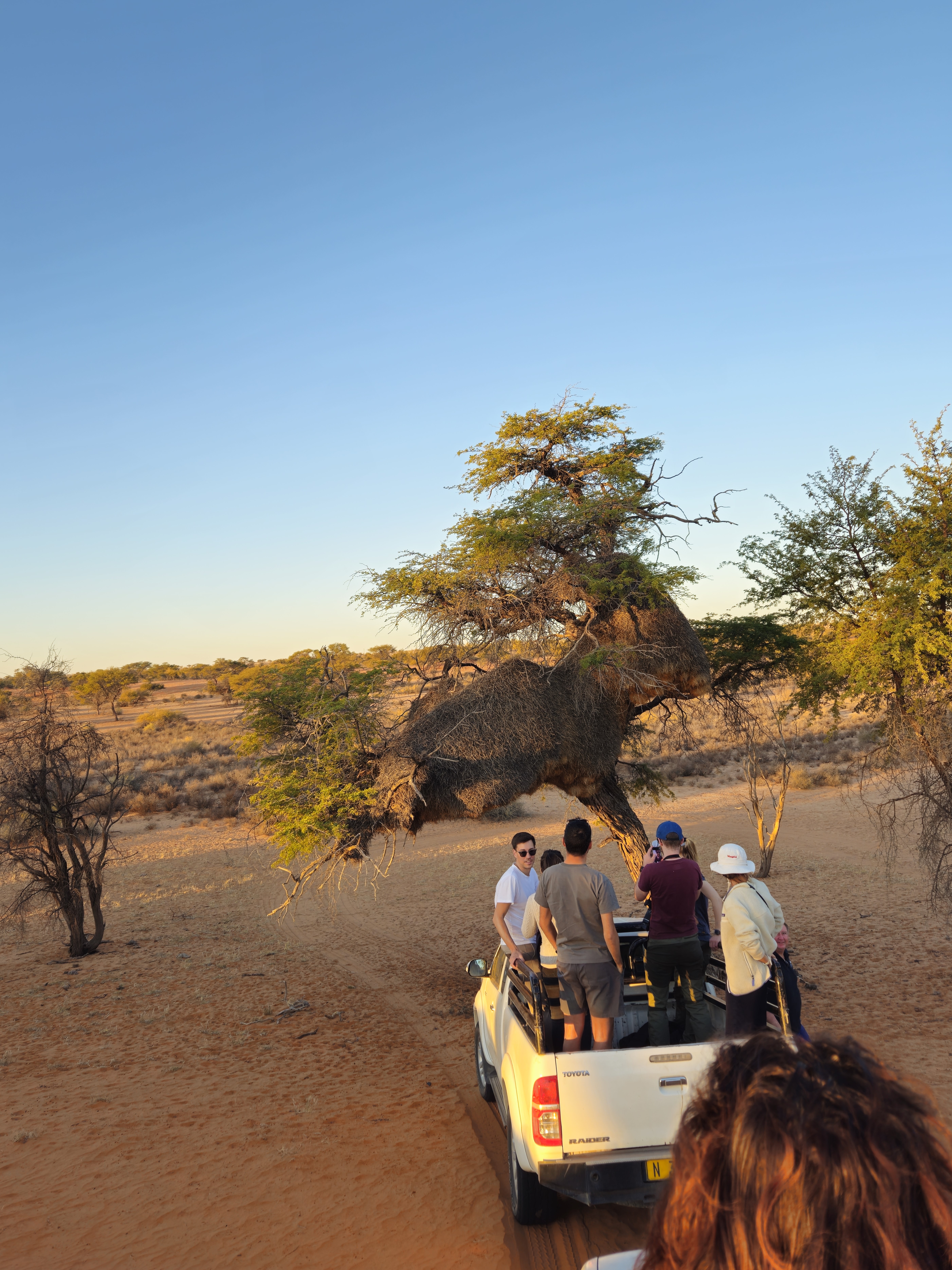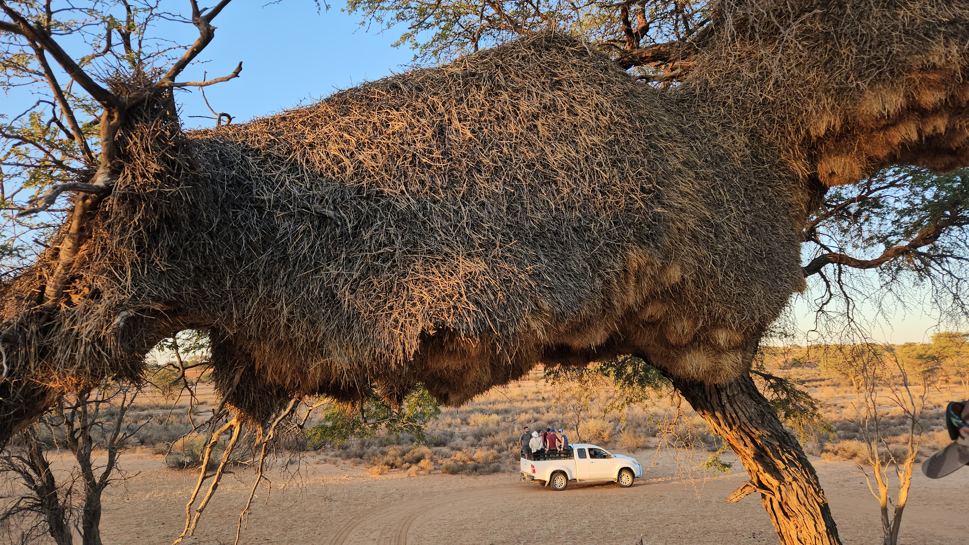 Avvistiamo gazzelle, zebre e una giraffa, e poi ci fermiamo sotto un nido di uccelli enorme, abbarbicato come altri a un grosso ramo. Questi nidi contengono uccelli a centinaia, e i piccoli passaggi posizionati nella parte sottostante somigliano al ventre gravido di una specie aliena. I volatili producono un concerto celestiale, composto di suoni e motivetti che inducono all’allegria e alla spensieratezza. Ce li godiamo per qualche istante, prima che il motore venga riavviato. Ci hanno raccontato che questi nidi durano finchè il ramo non cede sotto il peso eccessivo. Capiterà poi di vederne tanti accasciati qua e là nei giorni a venire.