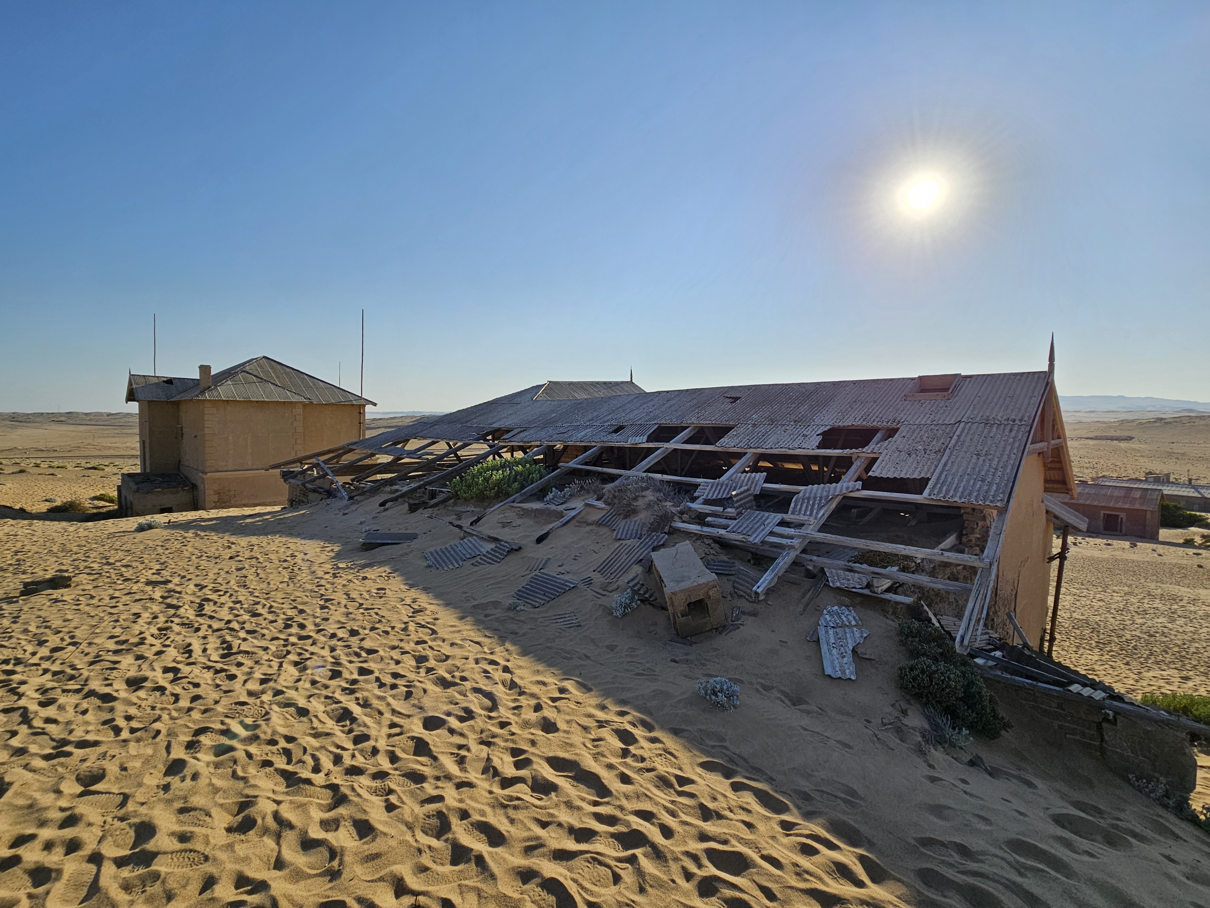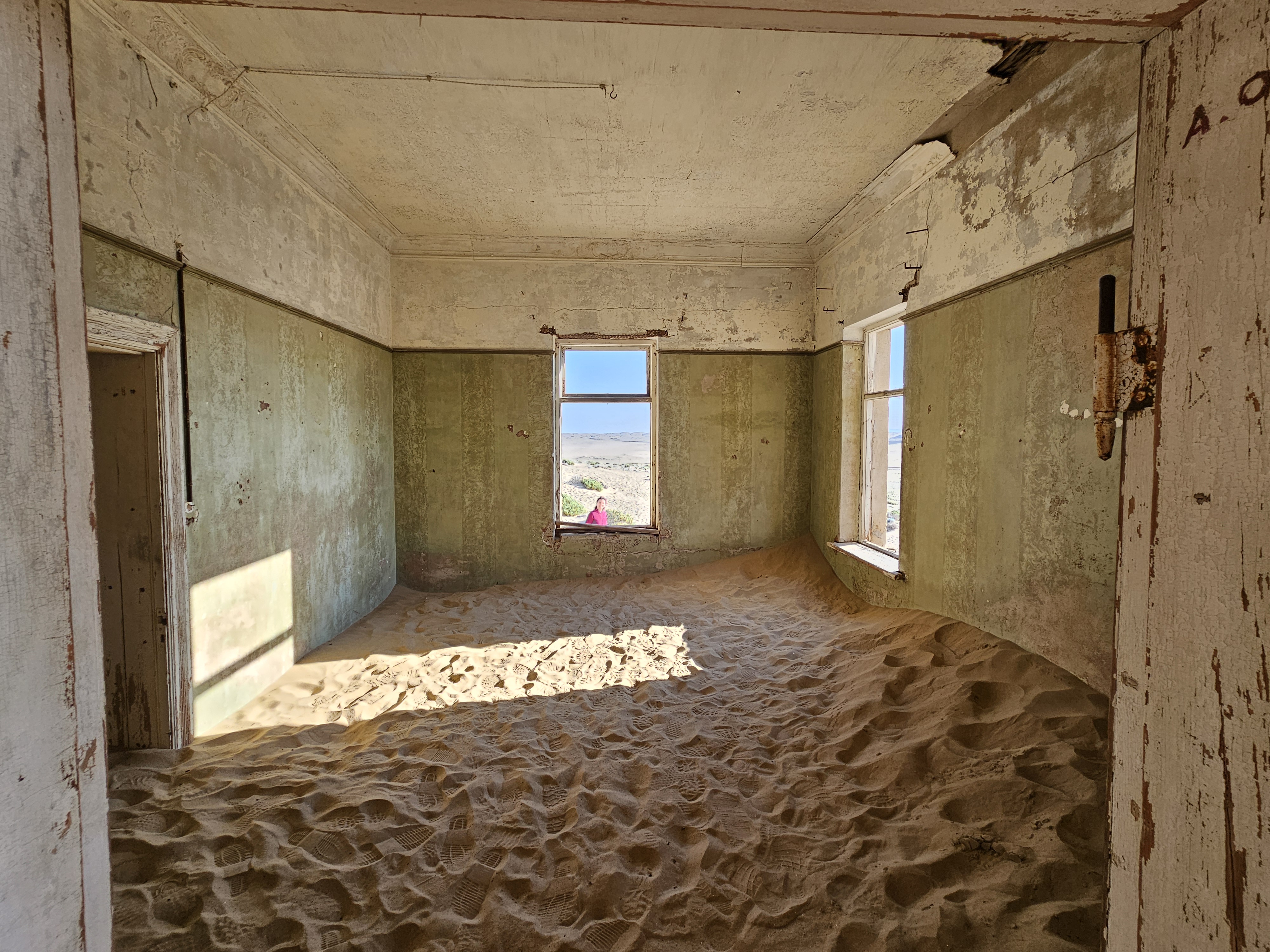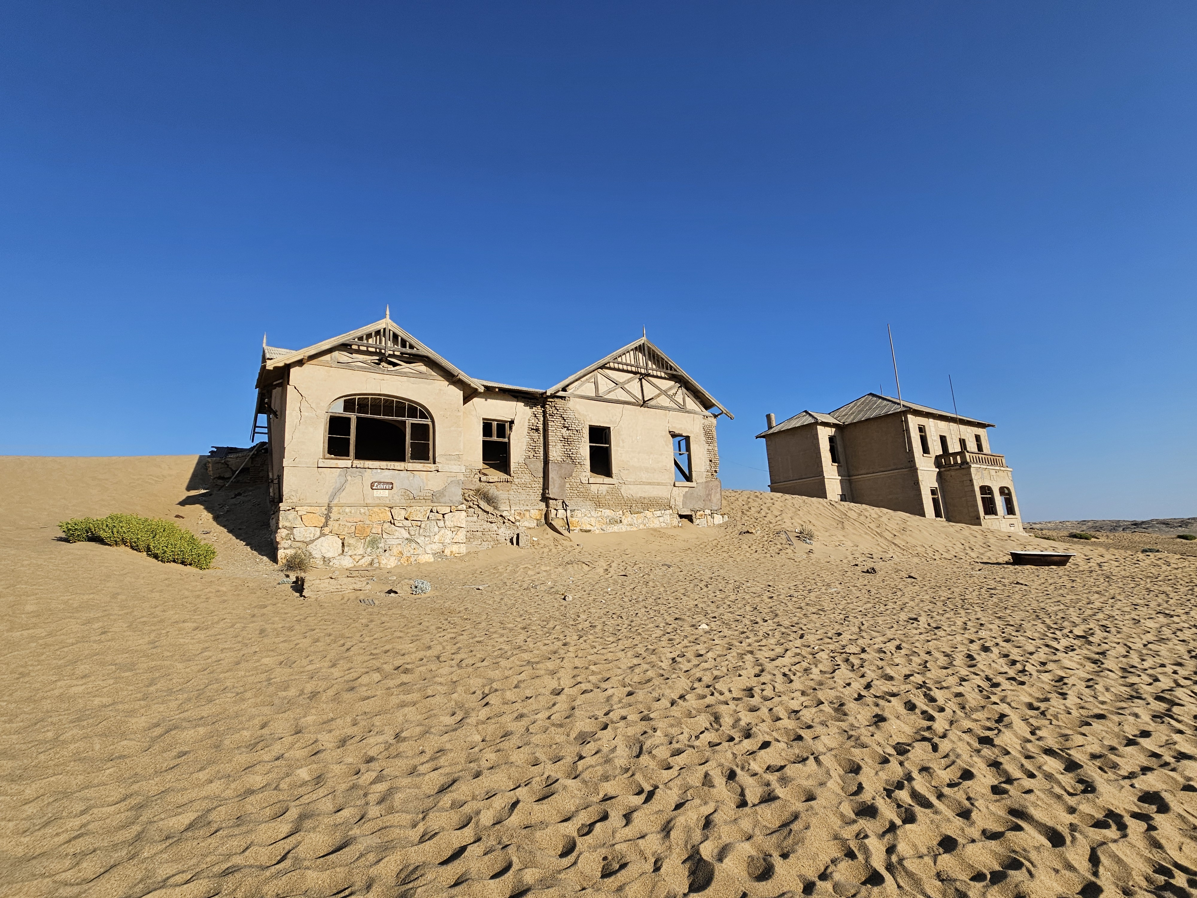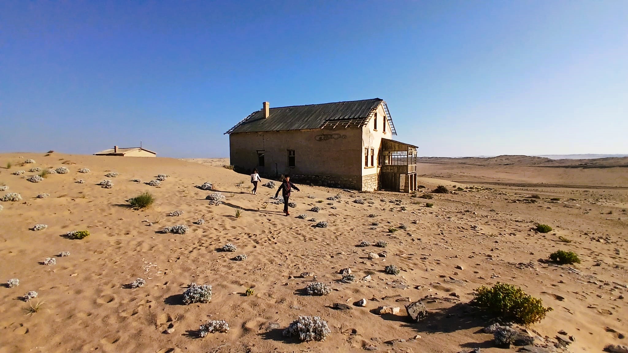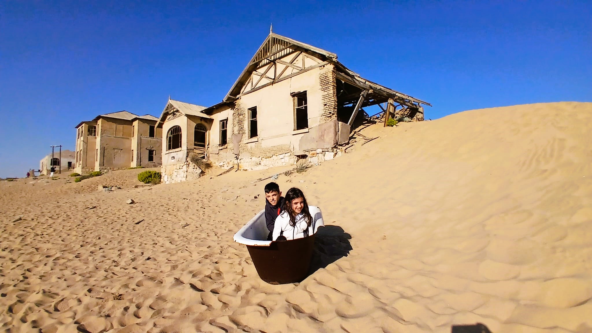 Ci dirigiamo prima verso le dune più alte, le Beverly Hills di Kolmanskop, dove vivevano il direttore, il contabile, l’architetto Herr Ziegler, l’insegnante (l’inflessibile signorina Hussmann), il Quartiermastro, un sottufficiale incaricato degli approvvigionamenti, e l’ingegnere minerario Kolle. Sembra impossibile che qui, all’inizio del 1900, vivessero a un certo punto fra le 2000 e le 3000 persone, eppure è così.