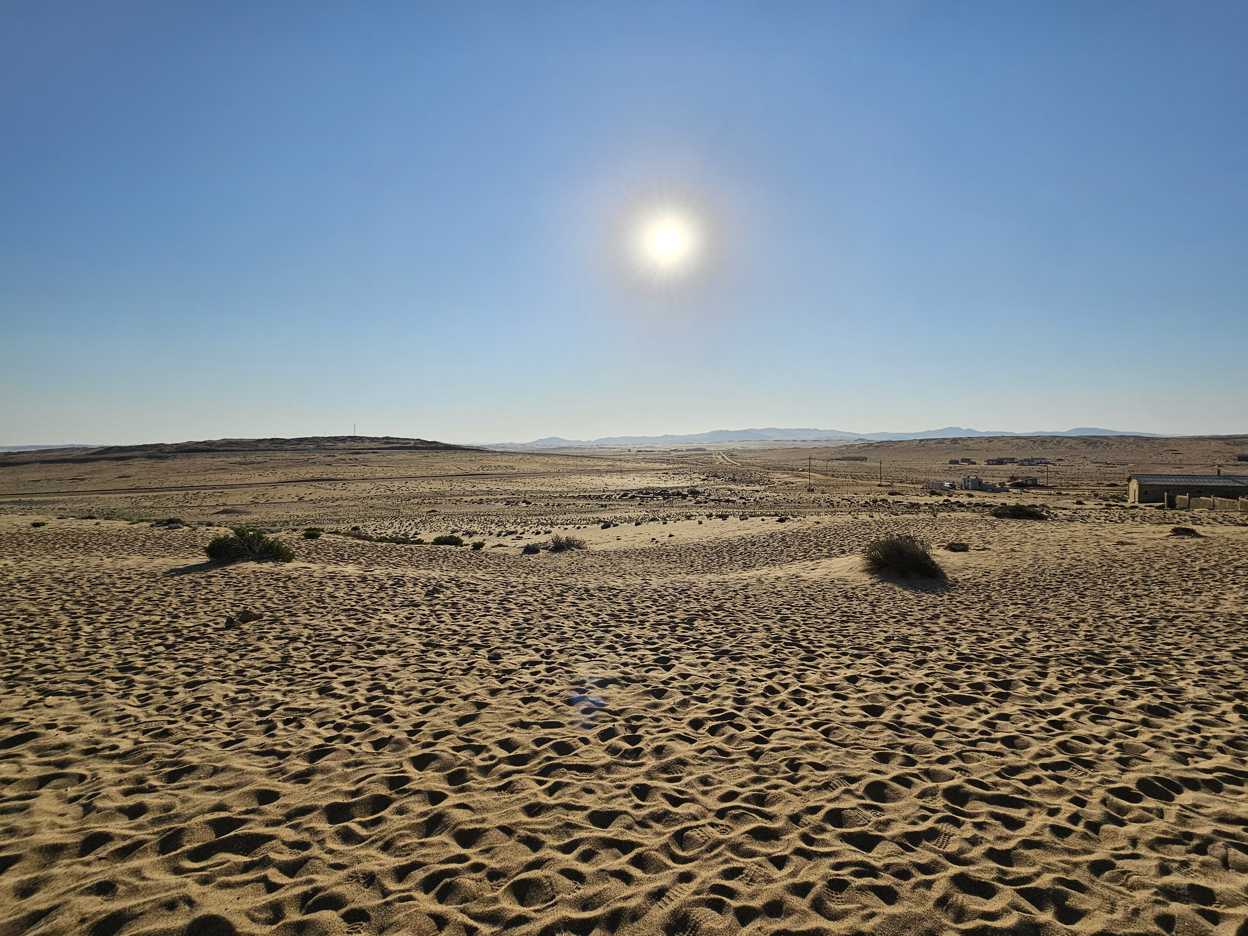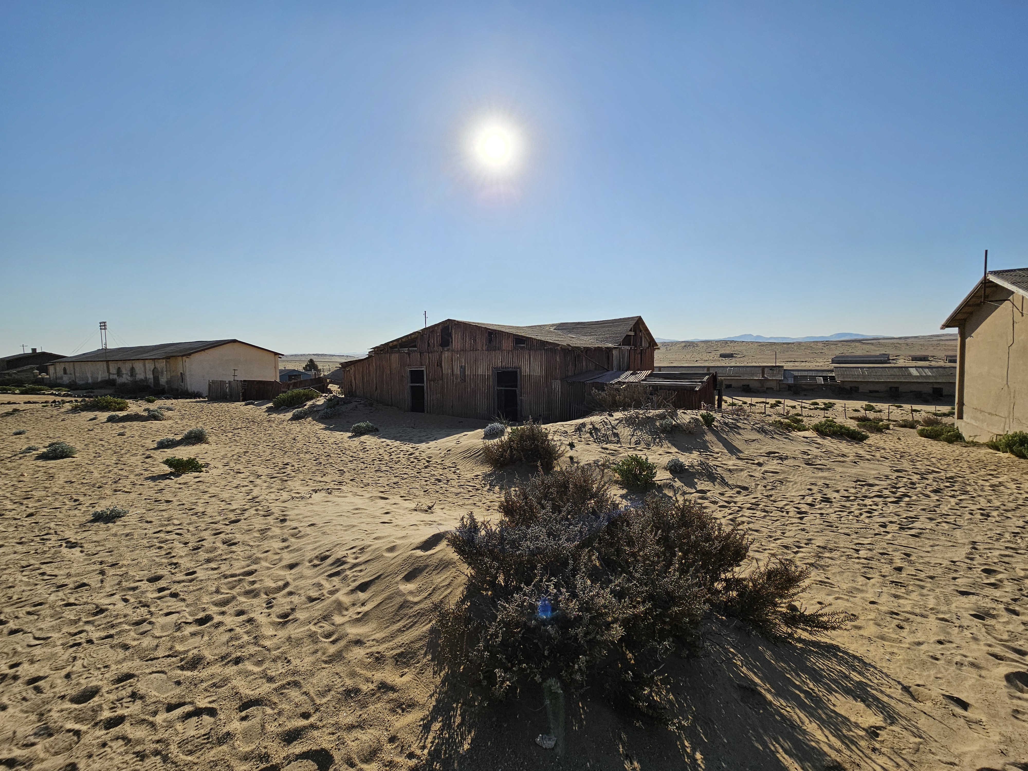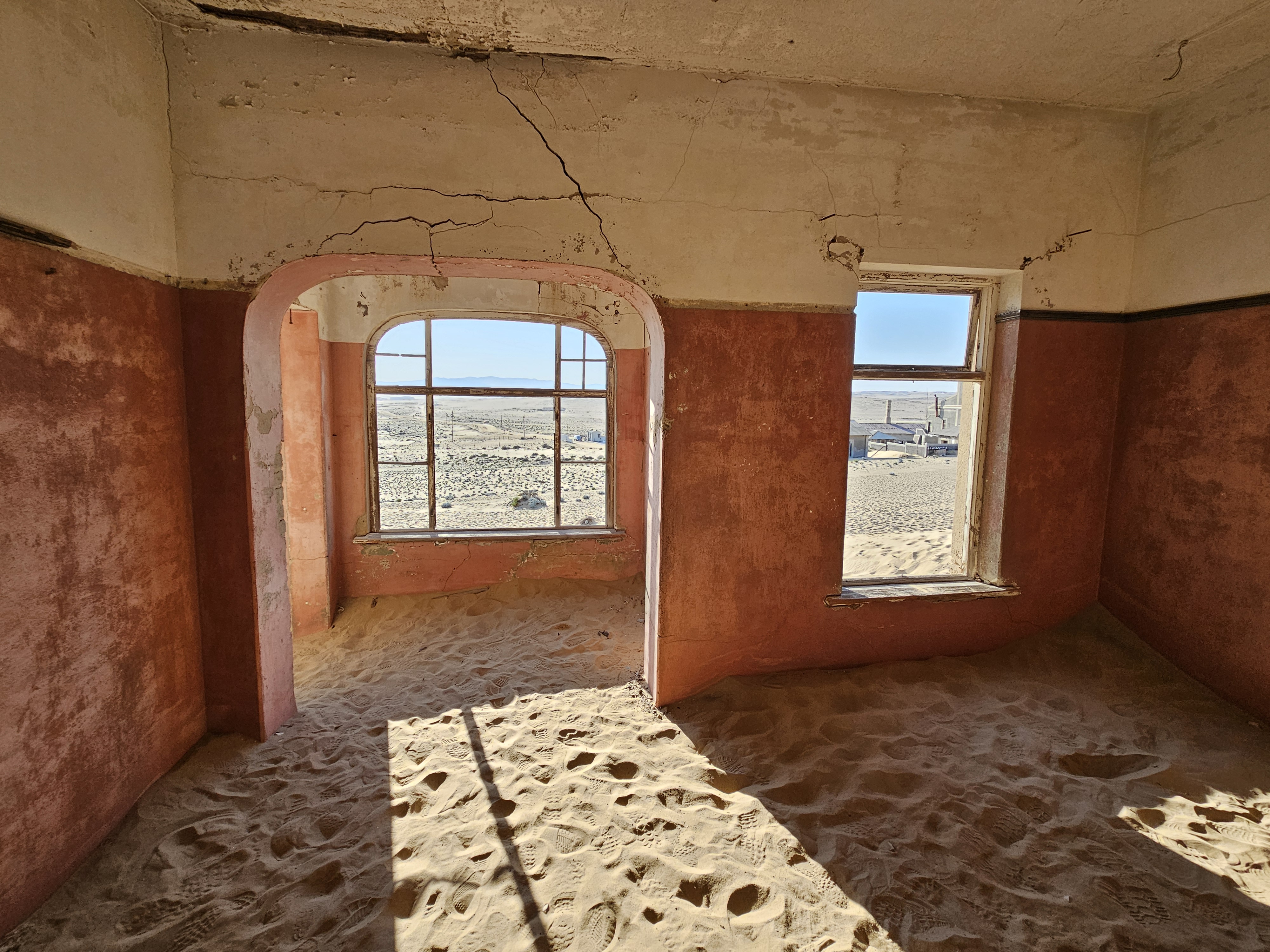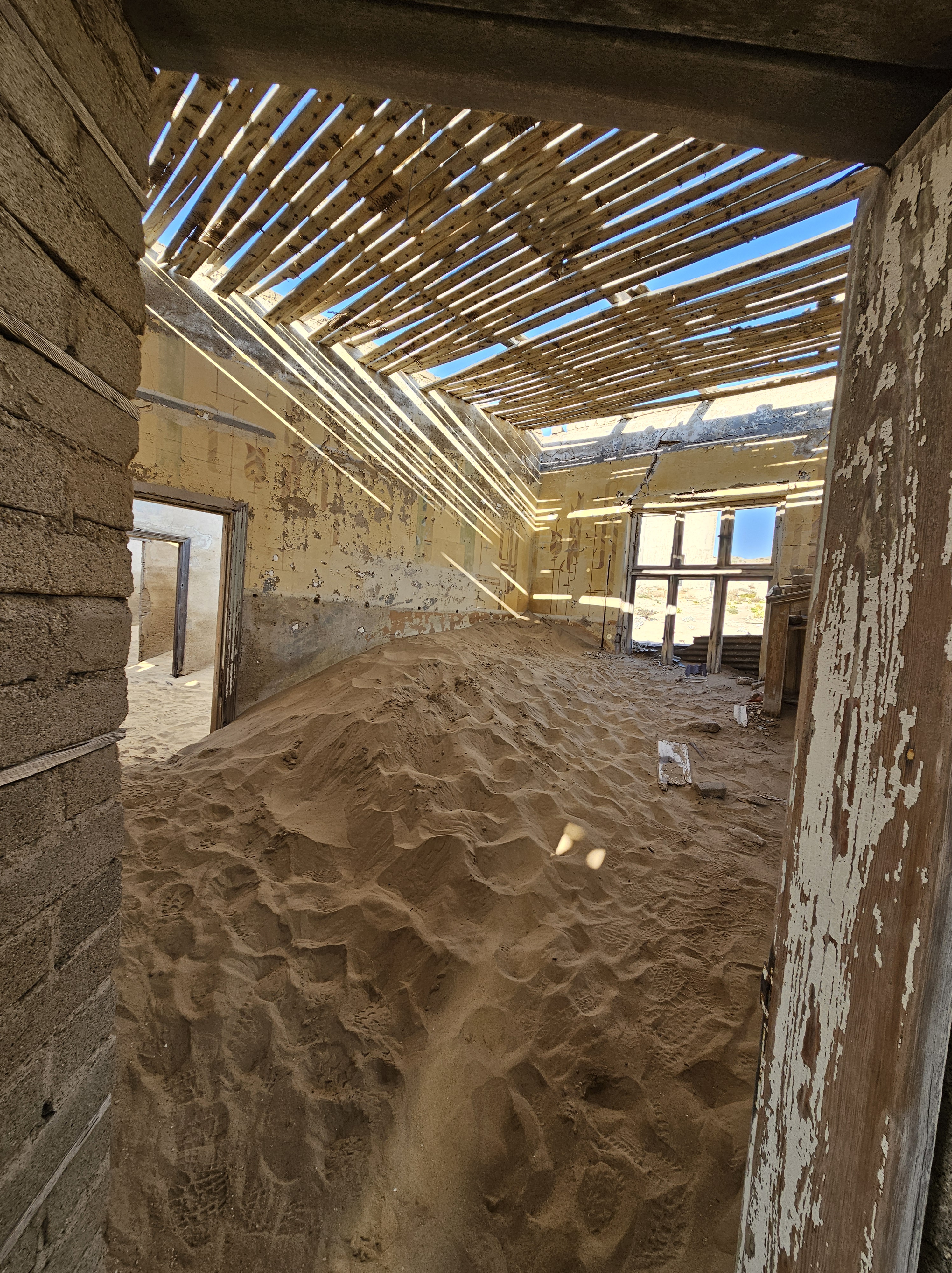 Ci dirigiamo prima verso le dune più alte, le Beverly Hills di Kolmanskop, dove vivevano il direttore, il contabile, l’architetto Herr Ziegler, l’insegnante (l’inflessibile signorina Hussmann), il Quartiermastro, un sottufficiale incaricato degli approvvigionamenti, e l’ingegnere minerario Kolle. Sembra impossibile che qui, all’inizio del 1900, vivessero a un certo punto fra le 2000 e le 3000 persone, eppure è così.