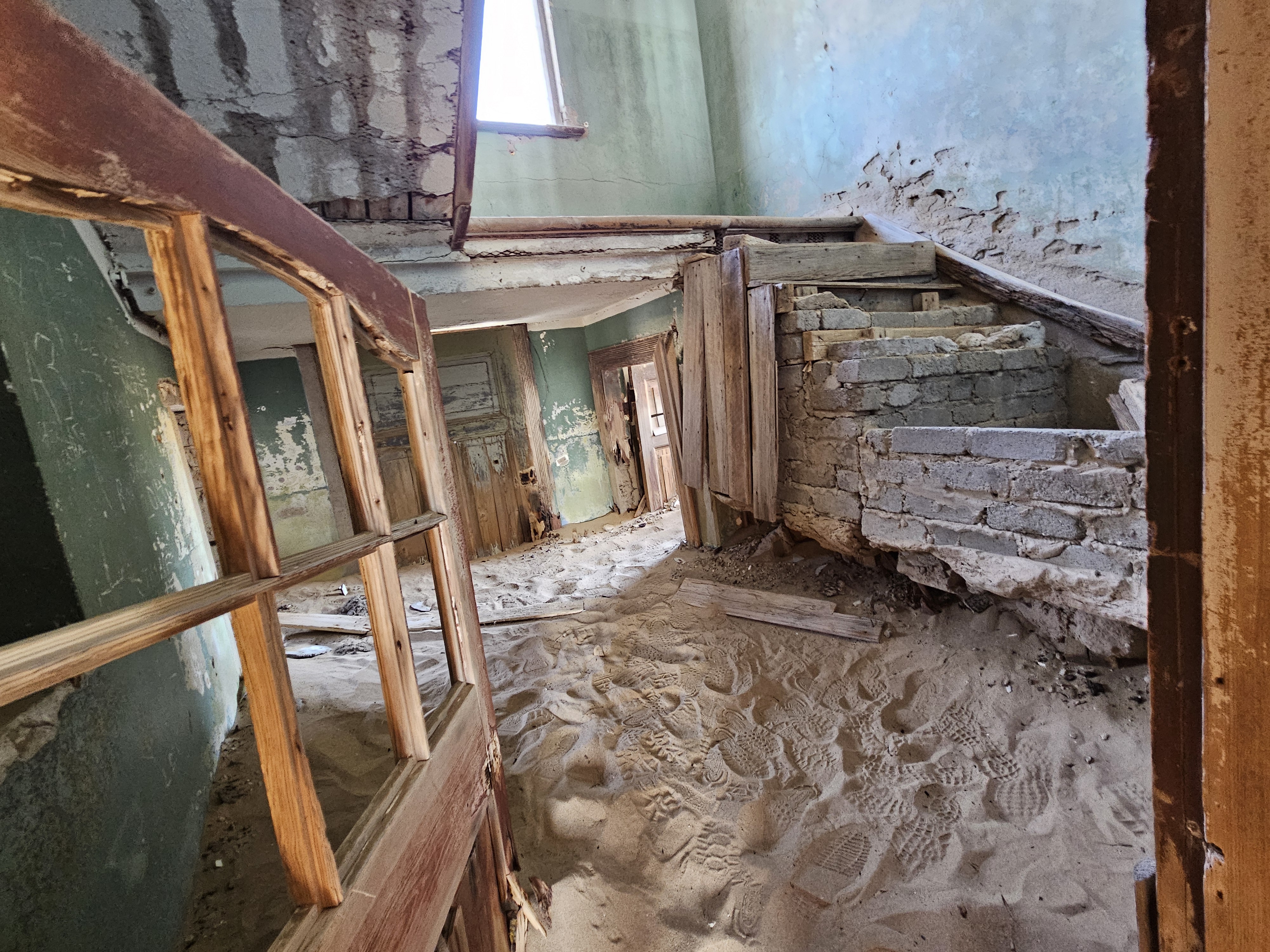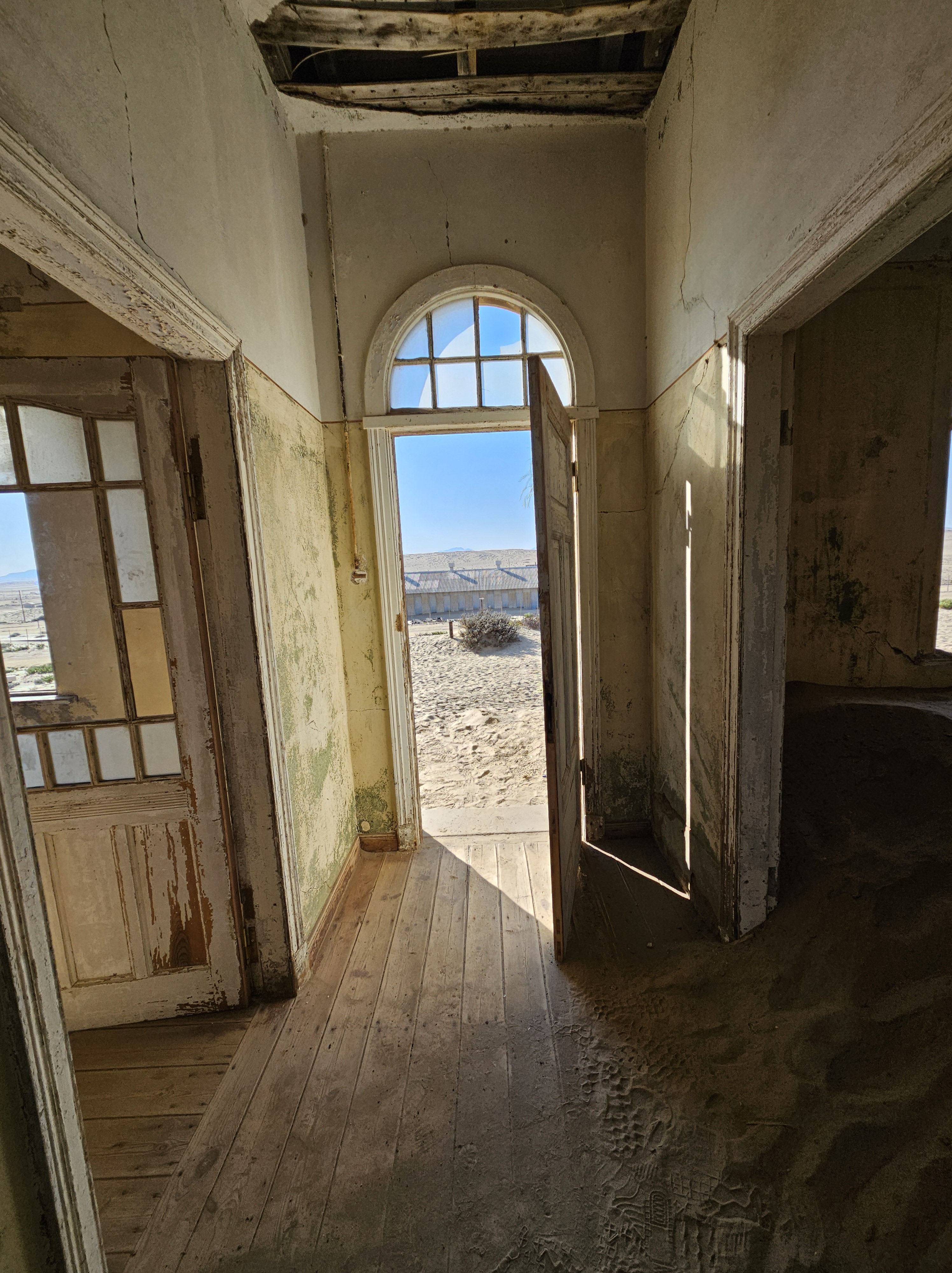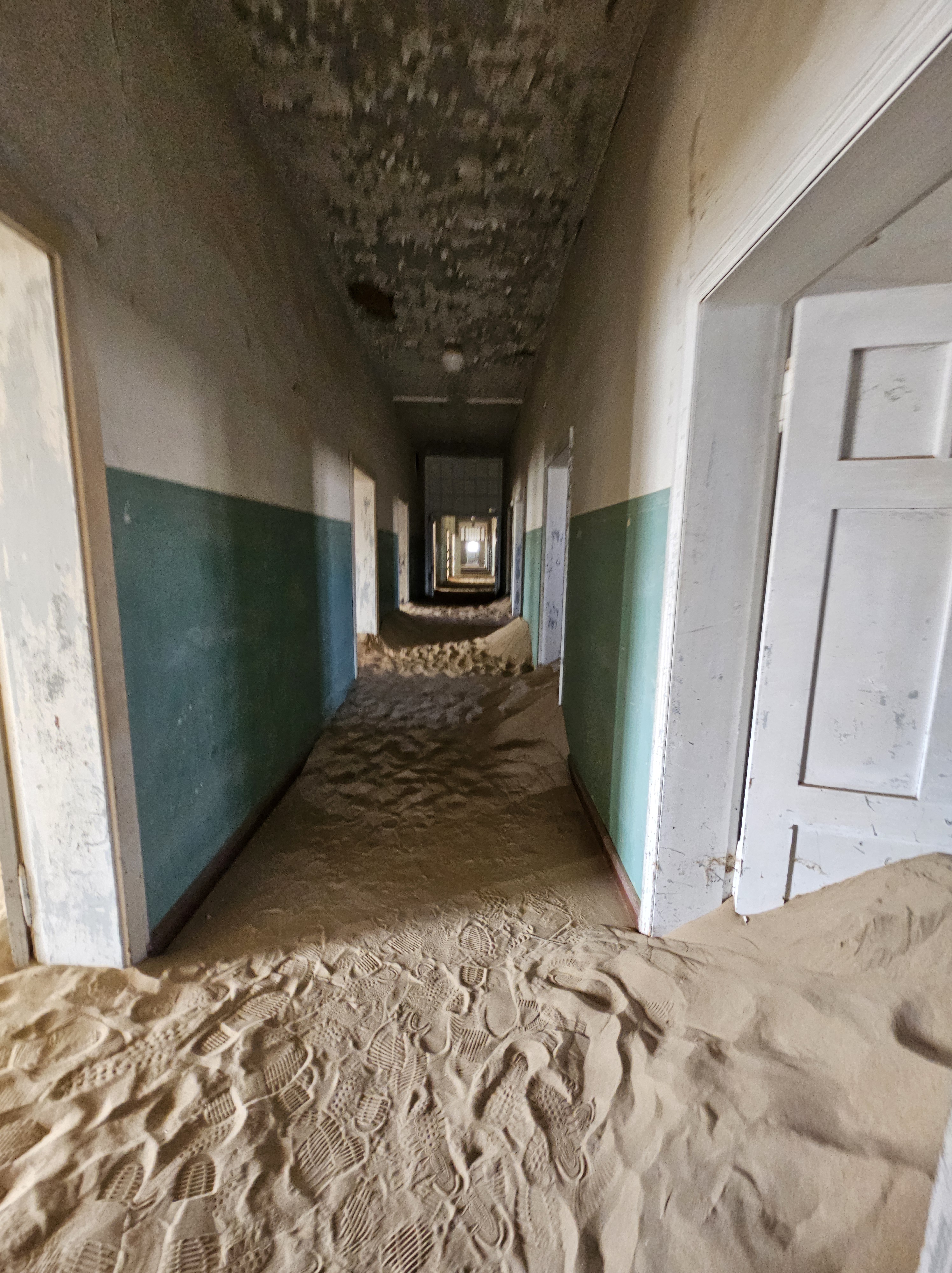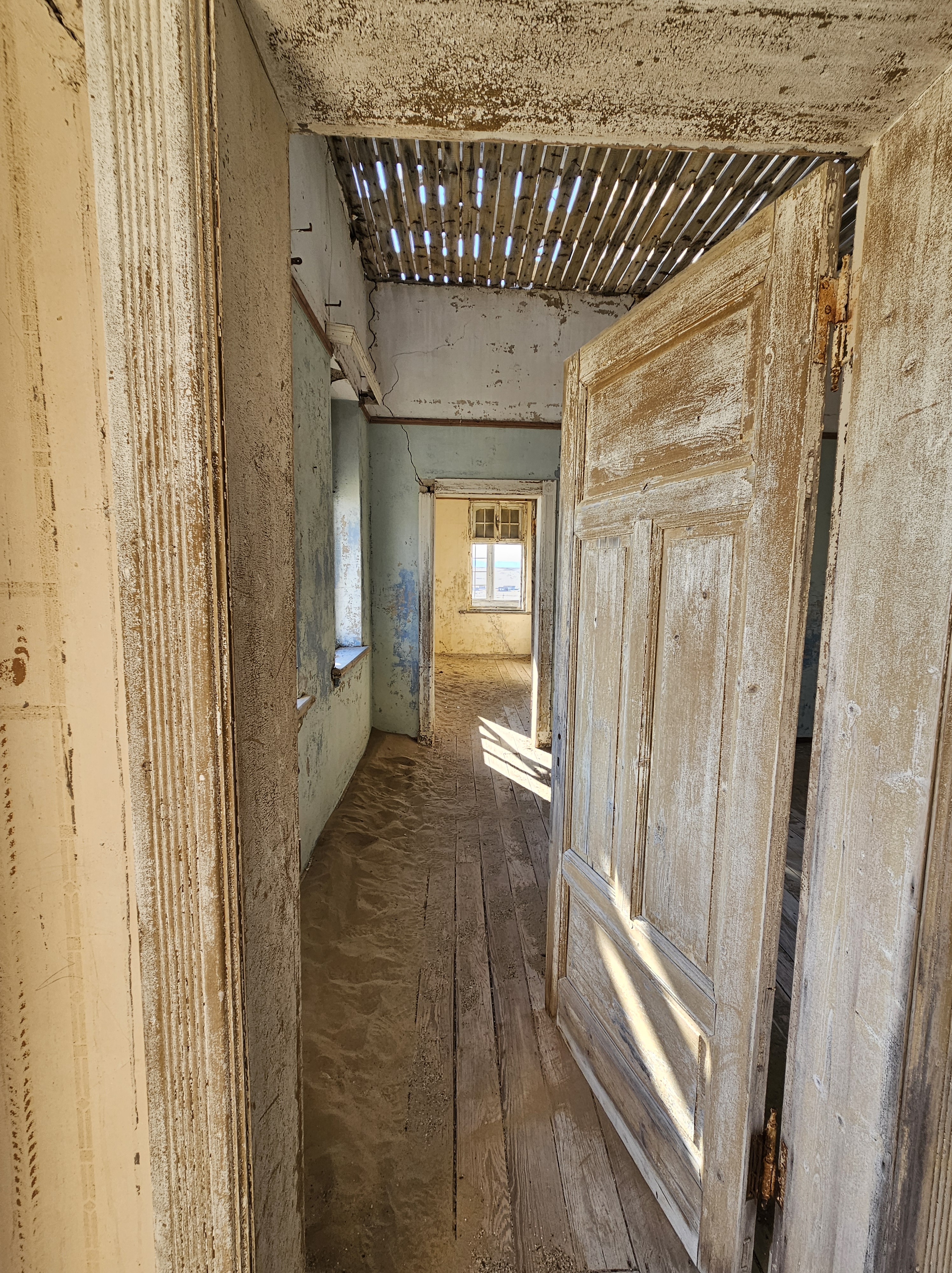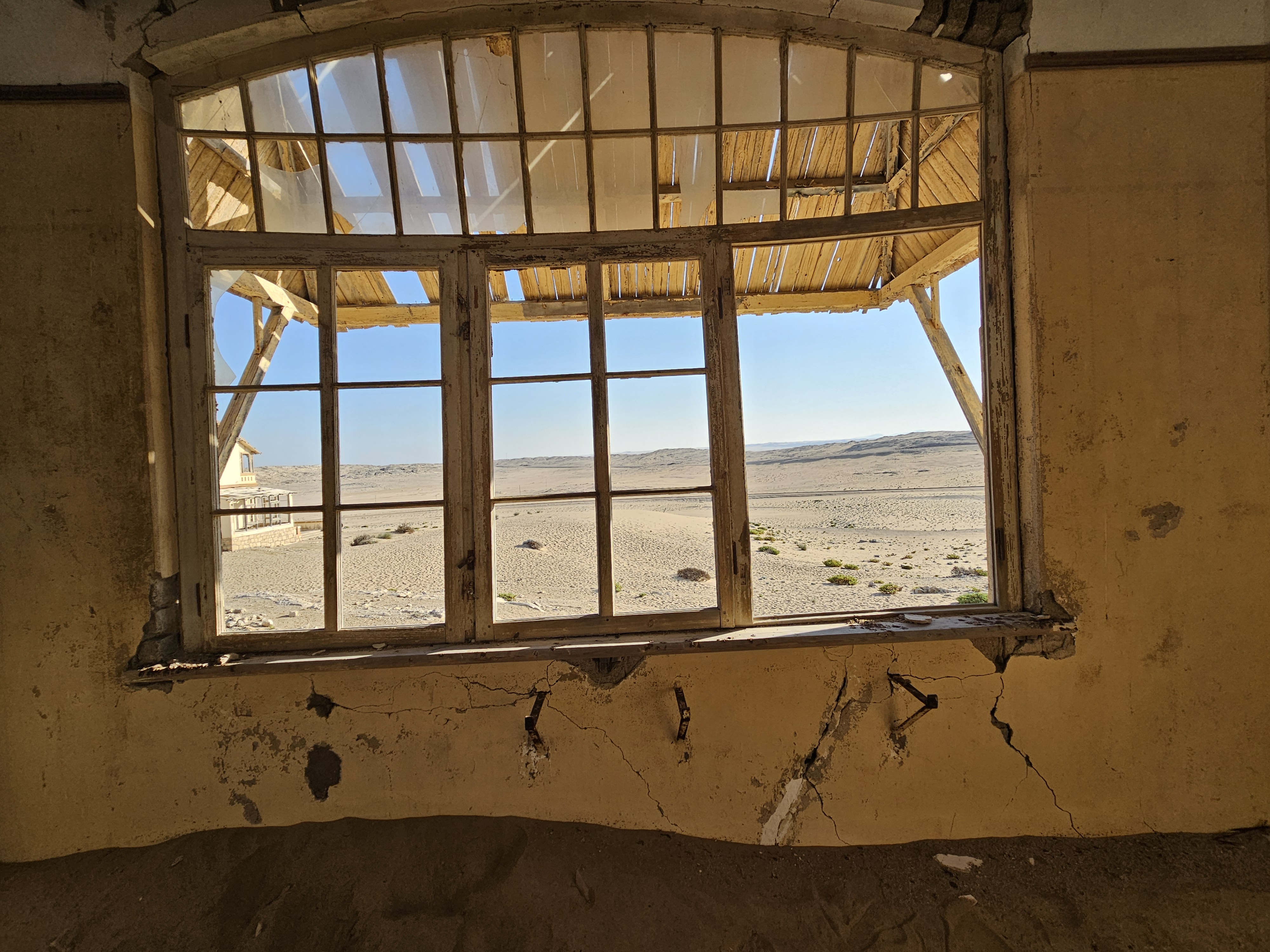 Ci dirigiamo prima verso le dune più alte, le Beverly Hills di Kolmanskop, dove vivevano il direttore, il contabile, l’architetto Herr Ziegler, l’insegnante (l’inflessibile signorina Hussmann), il Quartiermastro, un sottufficiale incaricato degli approvvigionamenti, e l’ingegnere minerario Kolle. Sembra impossibile che qui, all’inizio del 1900, vivessero a un certo punto fra le 2000 e le 3000 persone, eppure è così.