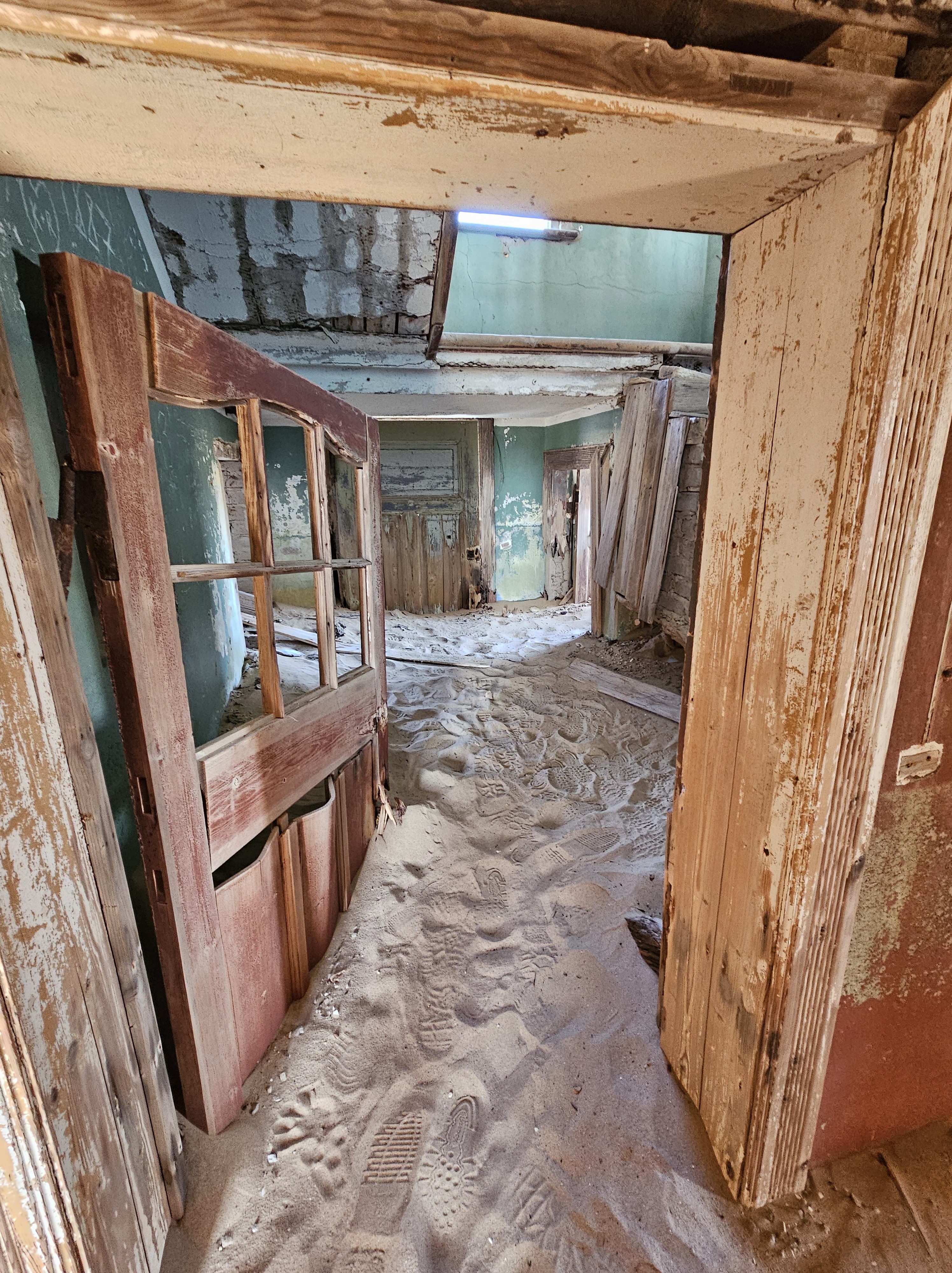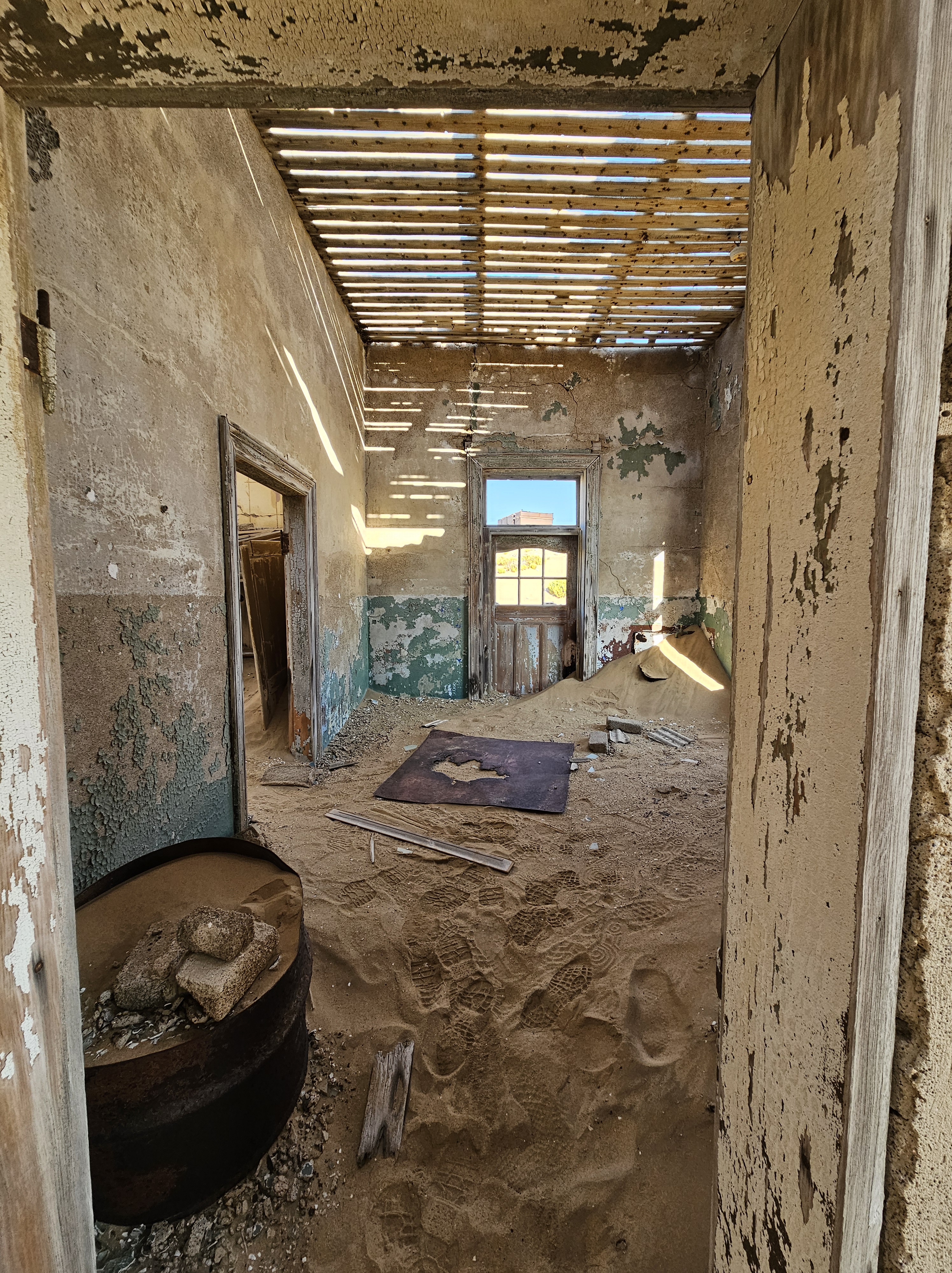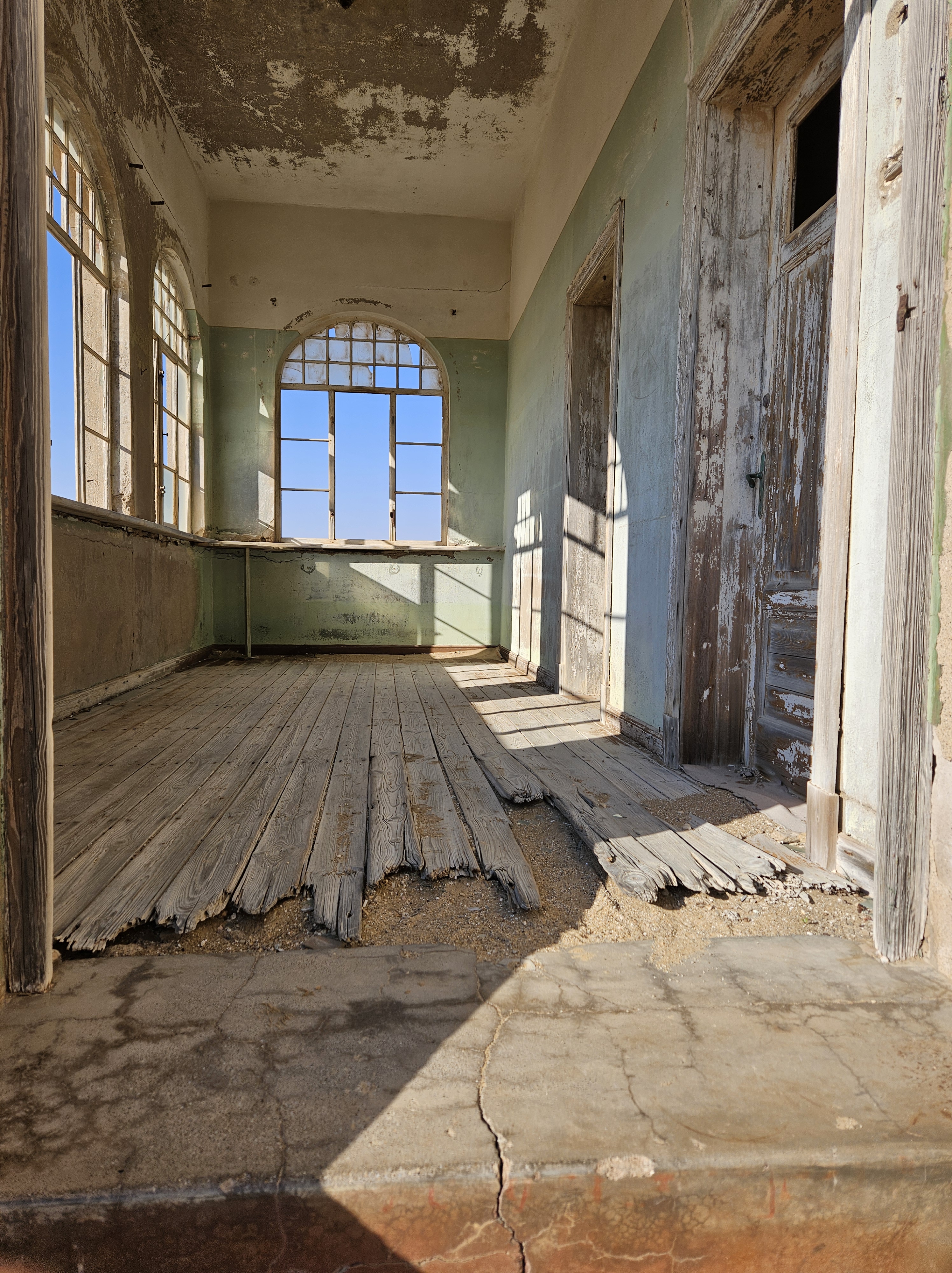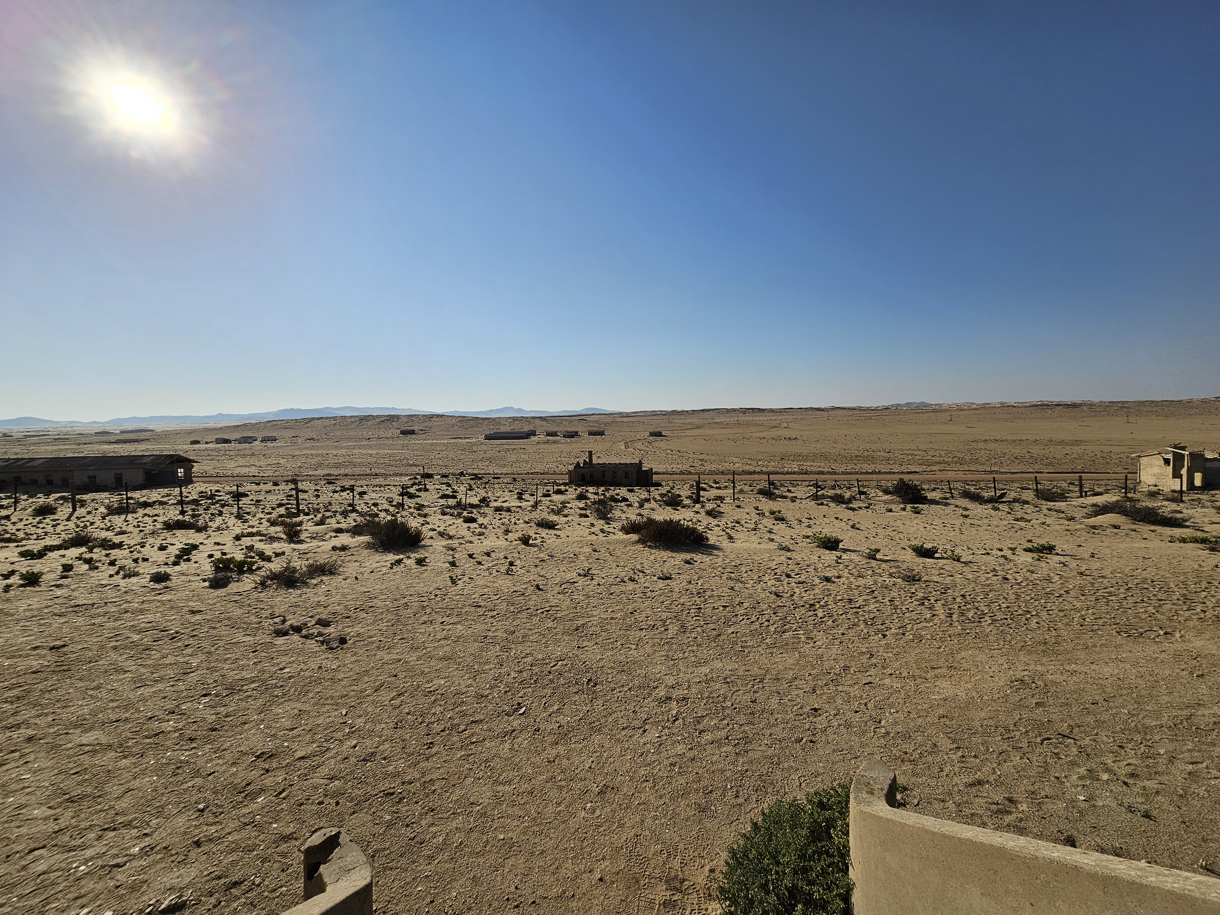 Ci dirigiamo prima verso le dune più alte, le Beverly Hills di Kolmanskop, dove vivevano il direttore, il contabile, l’architetto Herr Ziegler, l’insegnante (l’inflessibile signorina Hussmann), il Quartiermastro, un sottufficiale incaricato degli approvvigionamenti, e l’ingegnere minerario Kolle. Sembra impossibile che qui, all’inizio del 1900, vivessero a un certo punto fra le 2000 e le 3000 persone, eppure è così.