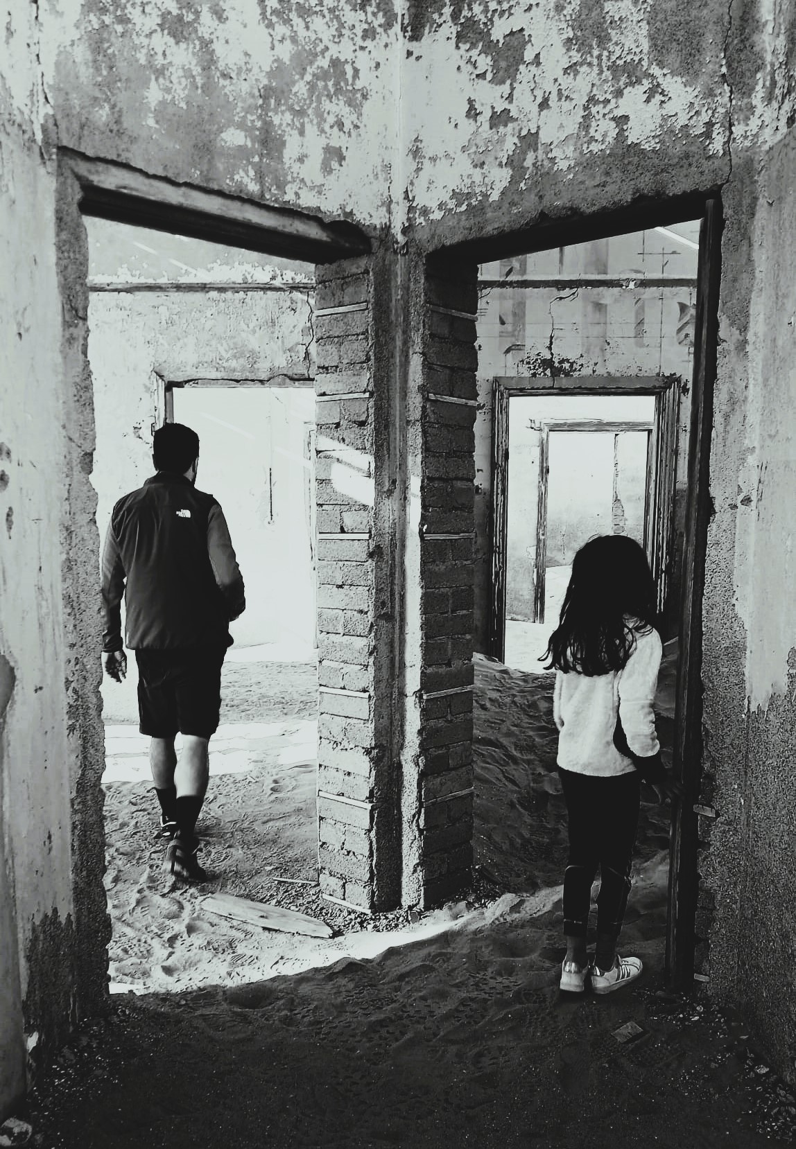 La sabbia che invade ogni superficie disponibile rende comunque l’idea della lotta impari e incessante dell’uomo col deserto, che avanza senza sosta e senza poterlo arginare. Questo luogo lascia intuire anche quanto il deserto potrebbe contenere, quanto possa aver fagocitato e poi nascosto nel corso del tempo. Quanta vita è sepolta laggiù? Possiamo provare a immaginare le vicende quotidiane della gente che un tempo viveva qui, ma non possiamo sapere quante storie e vite e oggetti abbia inghiottito il deserto nei secoli. Sabbia ovunque, sabbia sulle scale e nelle scarpe, sabbia nel vento e fra le idee, sabbia che pervade ogni spazio, che corrode materiali e ricordi, che racchiude in sé e poi annulla il passato nelle sue profondità, digerendolo come i vermi di Arrakis.