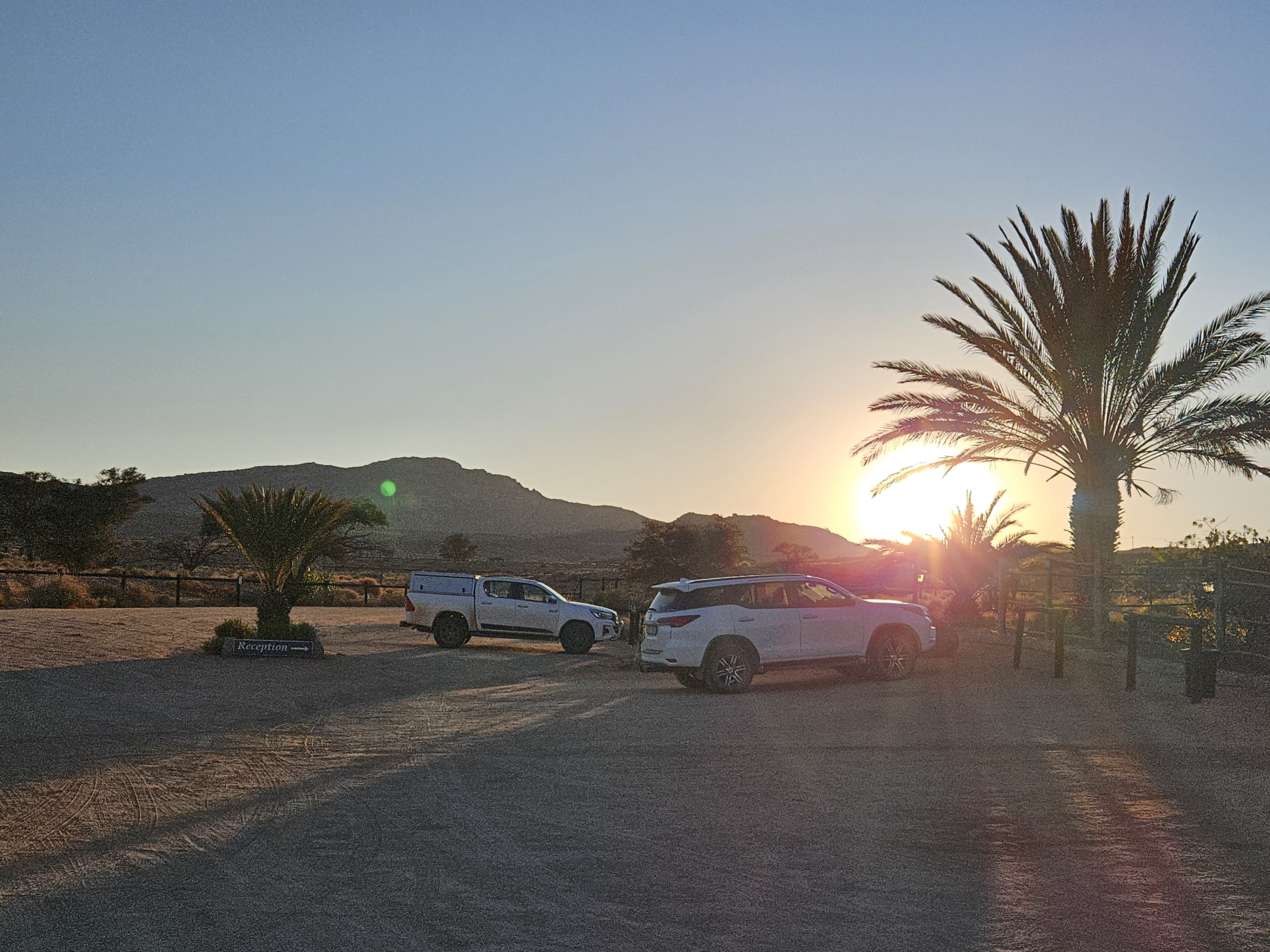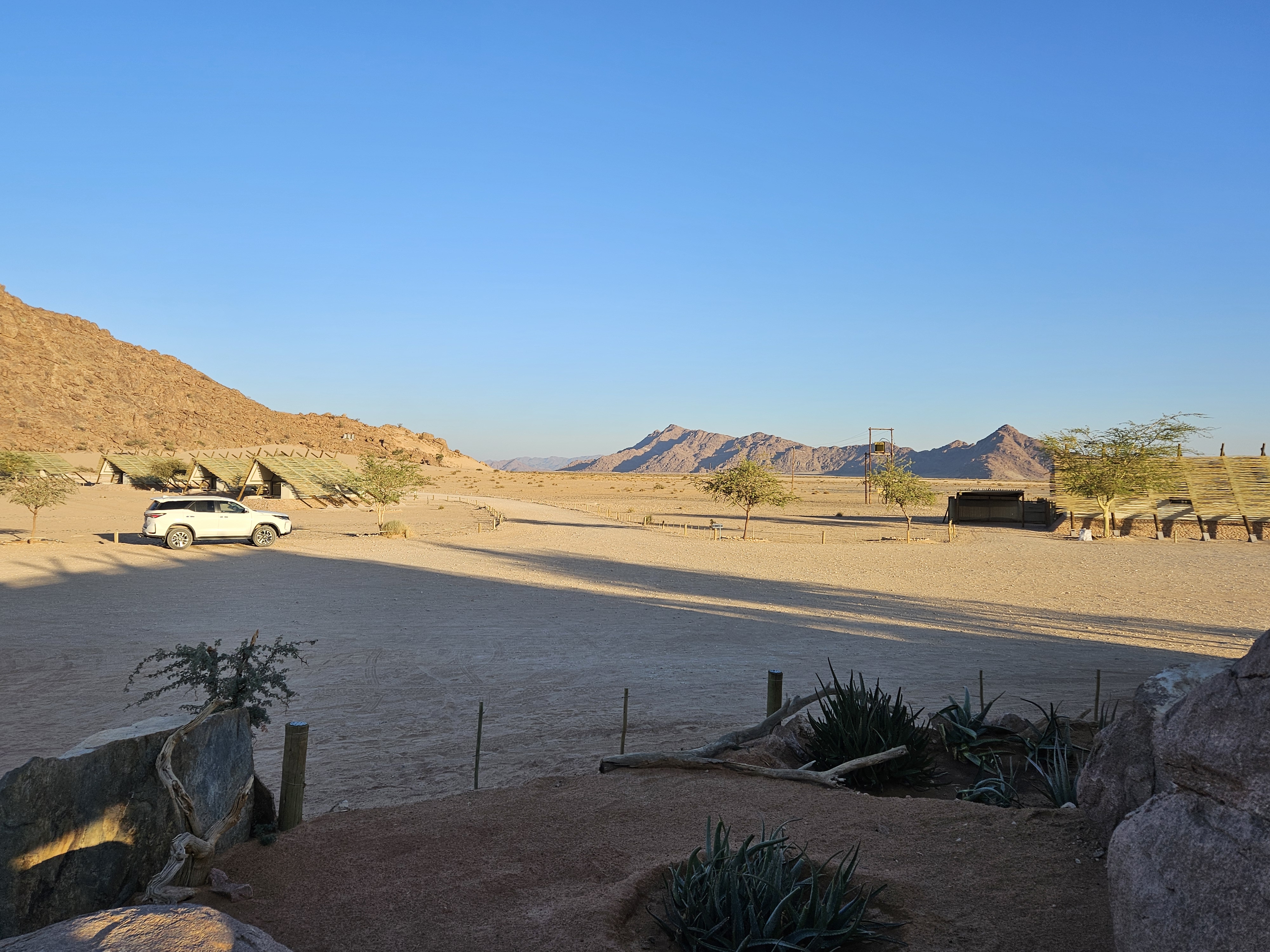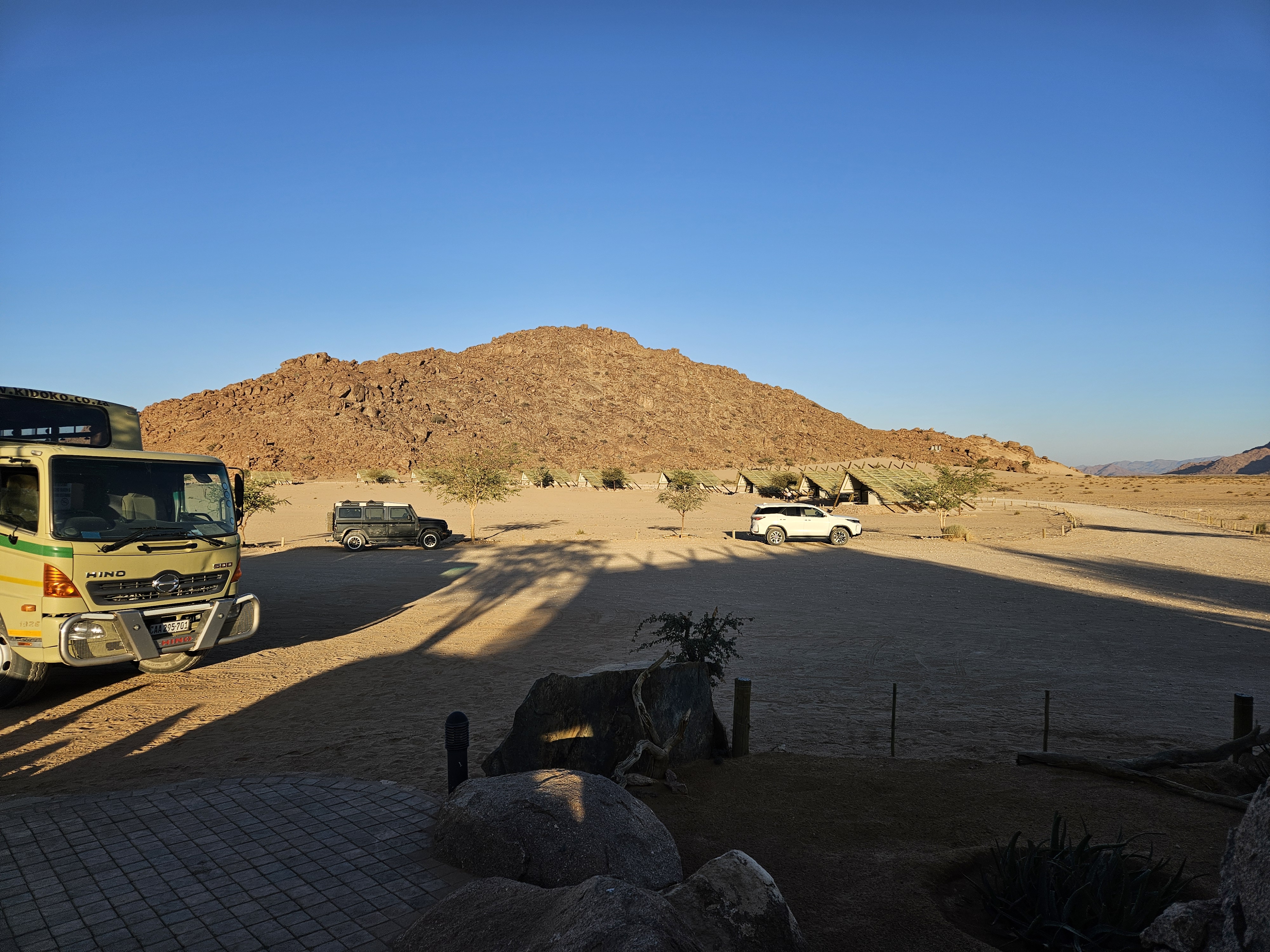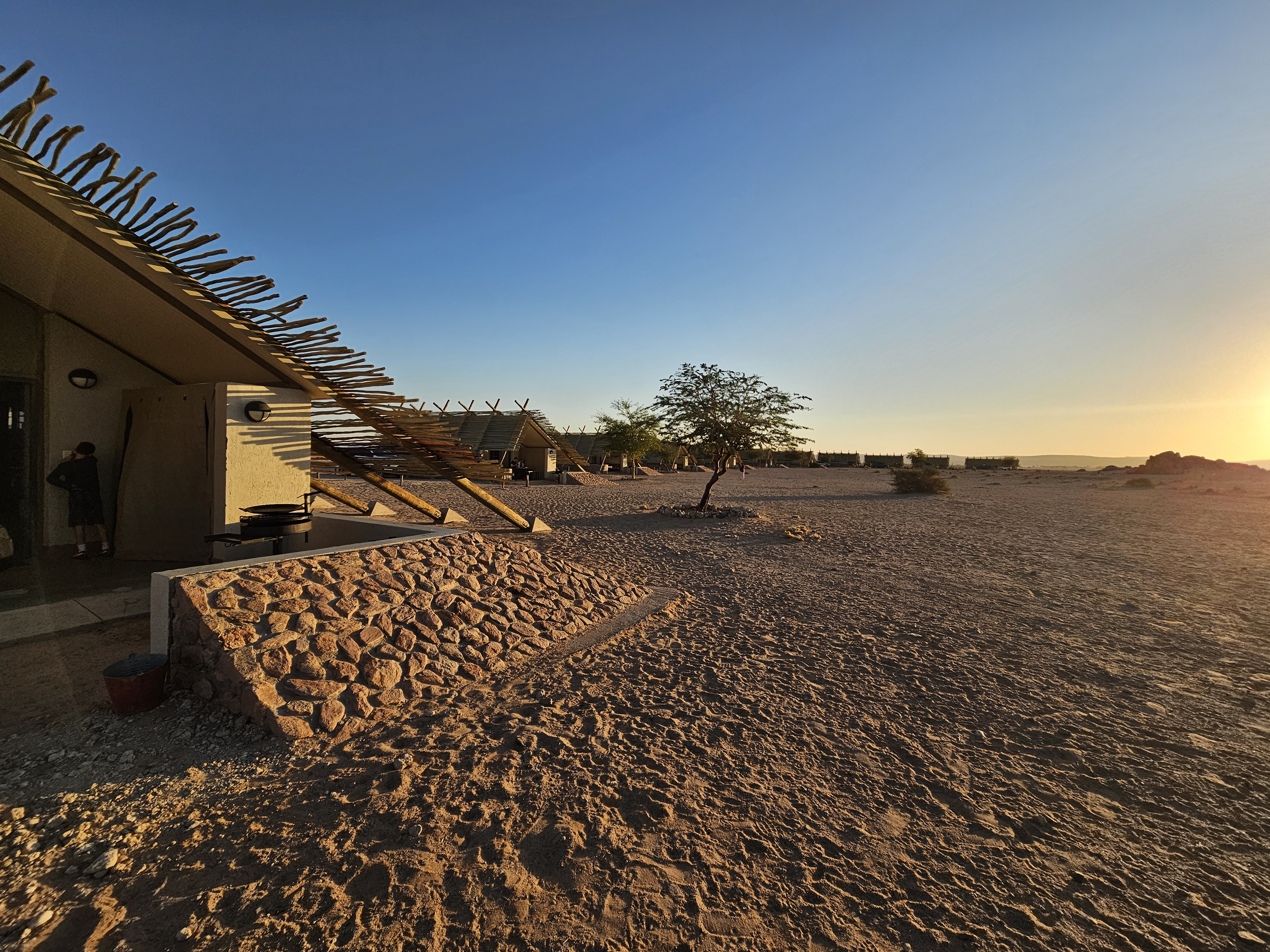 Sono le 17e30 quando saltiamo nell’iperspazio con il Millennium Falcon, arrivando a destinazione, il Desert Quiver Camp, un altro luogo difficile da ipotizzare, con una dozzina di bungalow disposti a mezzaluna alla periferia di Mos Eisley, noto porto spaziale del pianeta Tatooine. Questa sarà la nostra casa per ben due giorni. Al check in Rafa Leao ci consegna le chiavi, ci spiega che -se abbiamo bisogno di un ristorante- possono prenotarci quello del Sossusvlei Lodge, con cui sono convenzionati. Diciamo di si, ma senza rendercene perfettamente conto. In questo momento diremmo si a tutto, probabilmente.