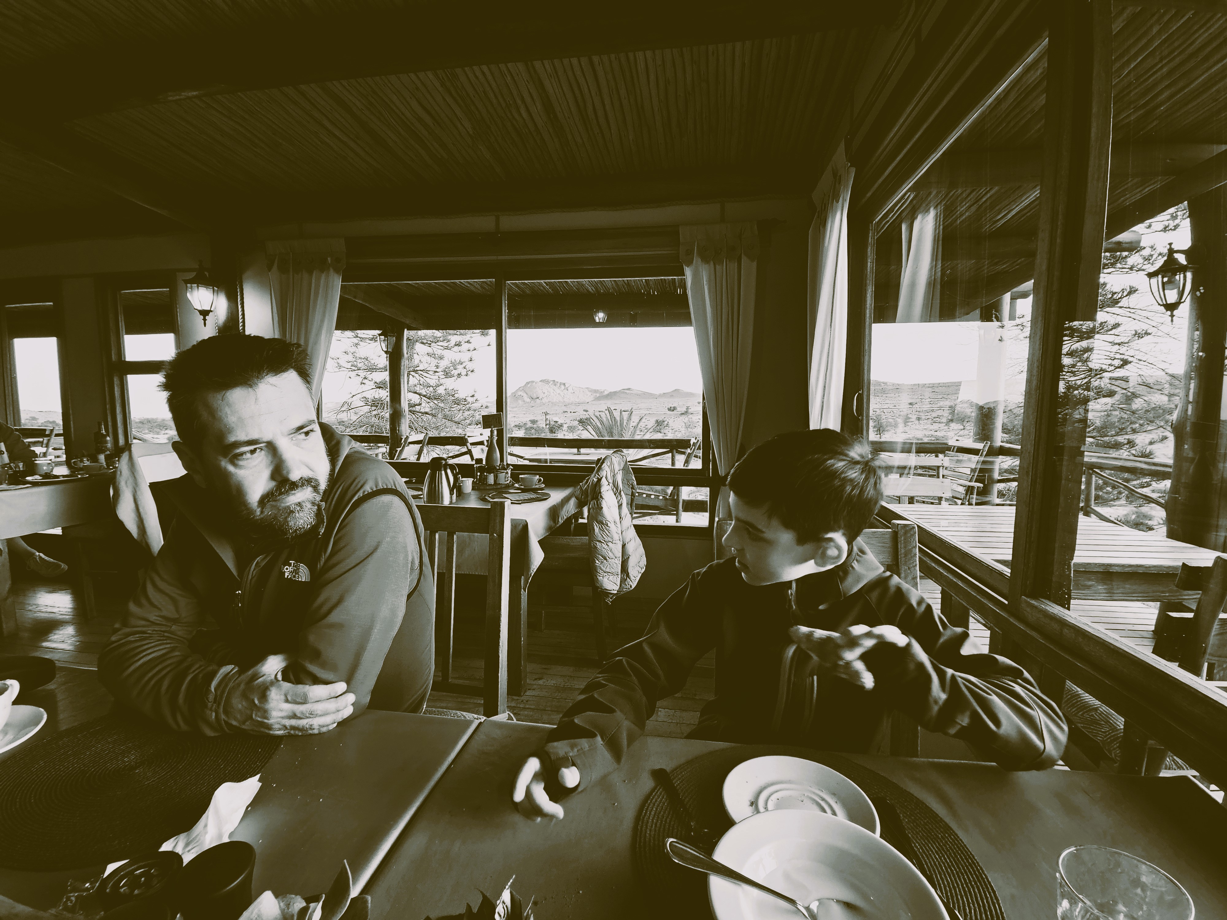 Avremmo dovuto svegliarci prima, dato che oggi abbiamo parecchia strada davanti, ma non riusciamo a presentarci a colazione prima delle 7e30. Siamo lenti e rilassati, troppo rilassati! Io sono persino accartocciato, dentro, nel groviglio disorganico dei pensieri del mattino, che non sono mai elaborazioni fluide o sensate, e fuori, sul viso segnato da una notte probabilmente tormentata e sulla scia dei monosillabi gutturali che la mia natura primordiale impone prima che il caffè mi faccia tornare -per così dire- normale.