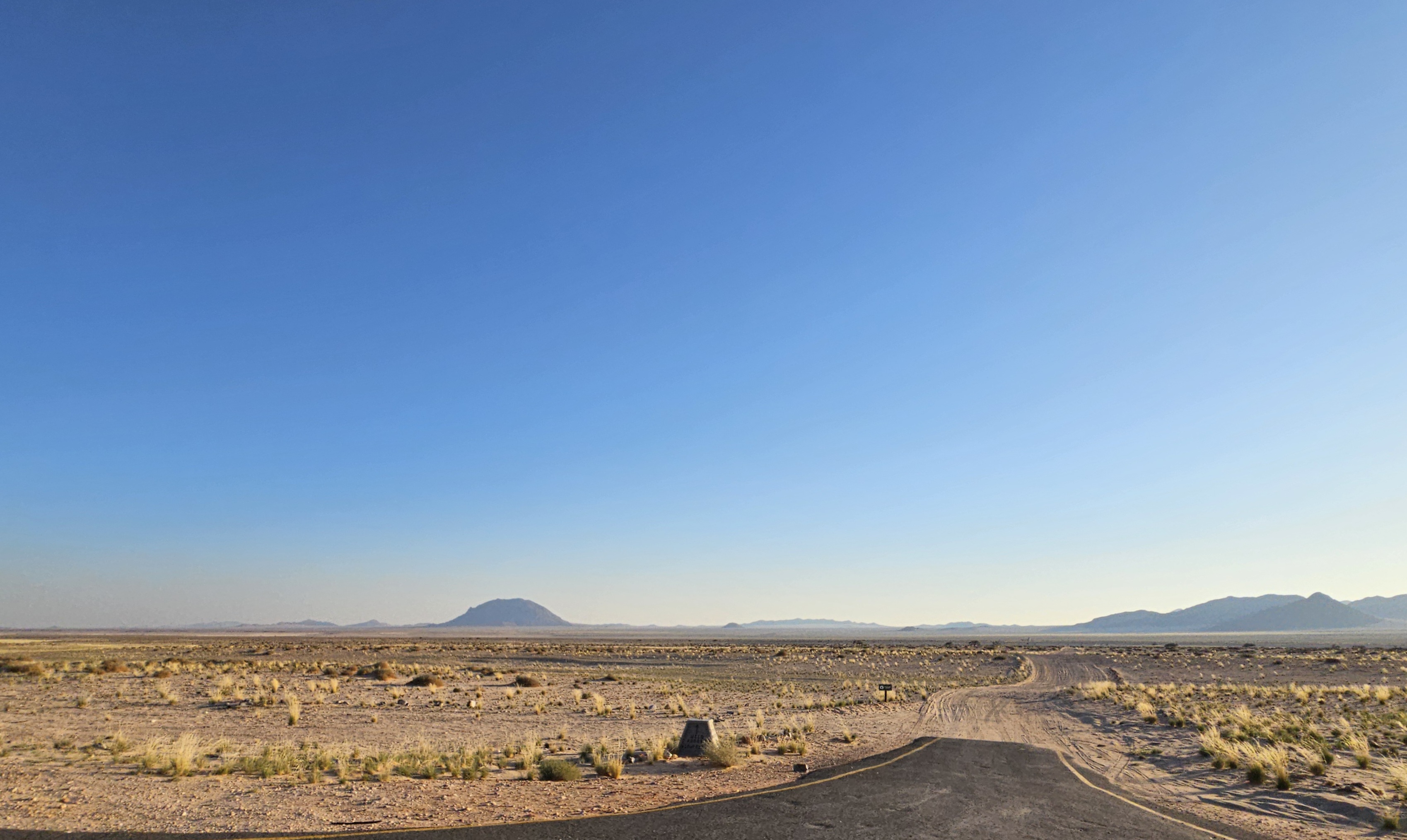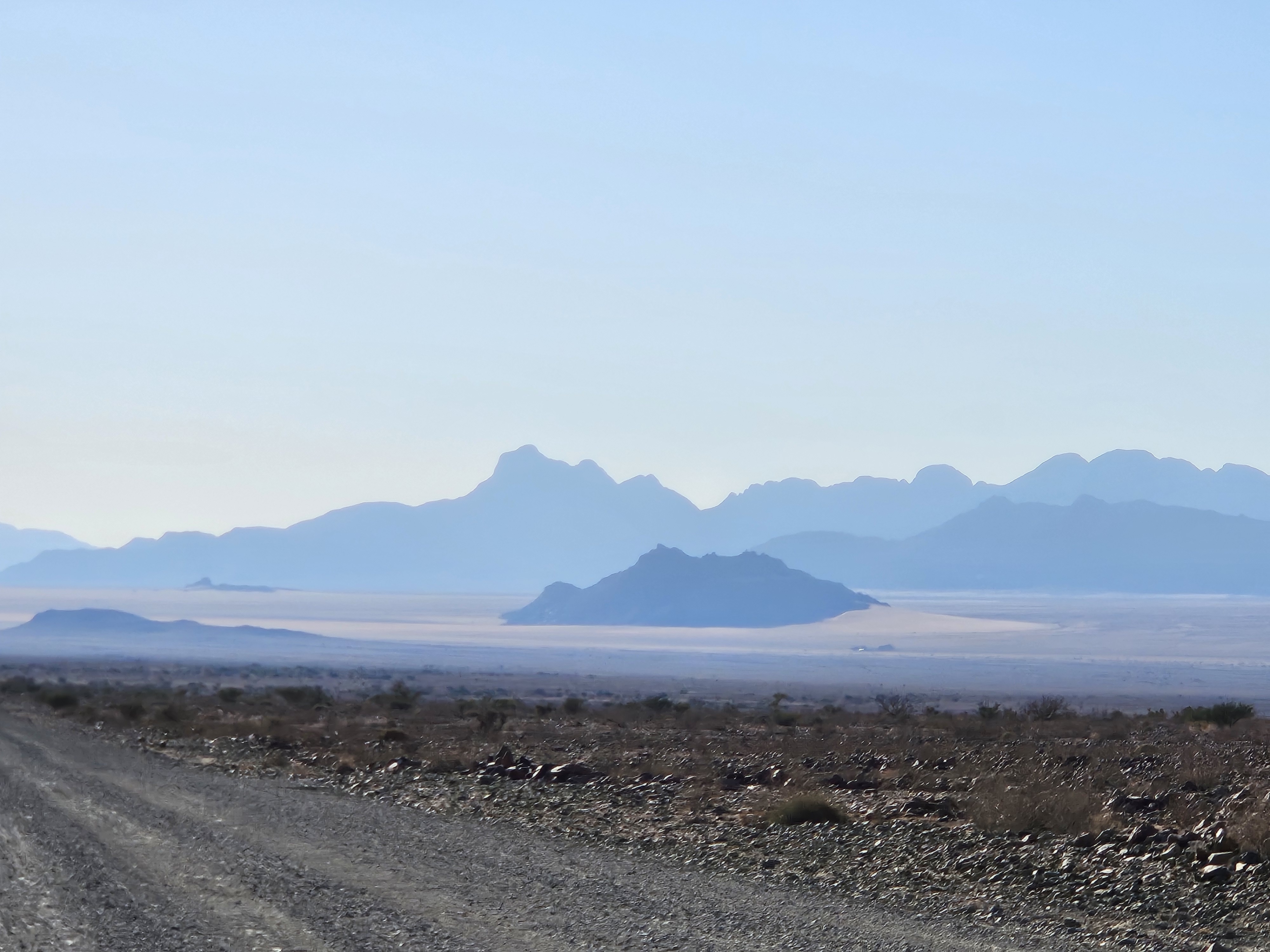 Chiacchieriamo tranquillamente, ripassiamo le tappe e il percorso del giorno, e confermiamo la scelta di andare a vedere la città fantasma di Kolmanskop, che comporterà una deviazione importante, non per la distanza che implica in sè, ma perché si somma alla strada che verrà dopo. Quindi da Aus andremo verso Luderitz, a ovest, percorrendo la B4 prima in un senso e poi nell’altro. Sono circa 250 km di ottima strada che però anticipano la deviazione successiva: anziché proseguire sulla strada canonica per Sesriem, tappa finale di giornata, noi imboccheremo la meno frequentata D707, una pista di sabbia e pietra che attraversa un altopiano incastonato fra il deserto del Namib a ovest e la catena dei Monti Tiras a est. Dopo di che la C27 ci condurrà fino a destinazione. Oltre le due ore e mezzo iniziali, avremo altre 5 ore abbondanti di strada davanti, sperando che tutto proceda regolarmente e senza intoppi.