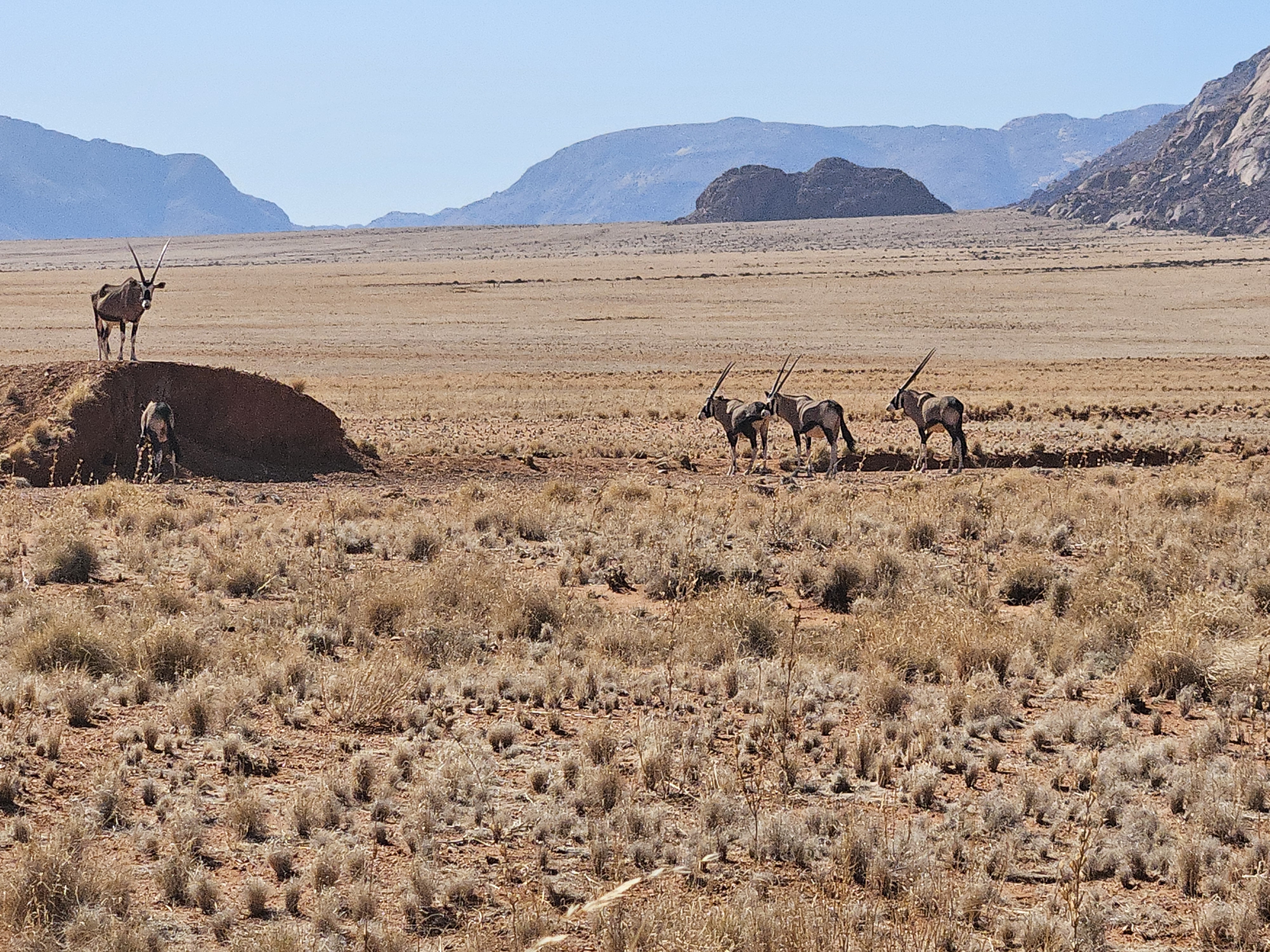 A un certo punto la strada non è più una strada ma una semplice pista dai margini sempre più blandi e incerti, non ha quasi più confini e disorienta ulteriormente chi l’attraversa. Incontriamo un gruppo di orici in prossimità di una roccia, e ci fermiamo ad osservarli. Uno di essi si staglia elegantemente su questo grosso masso piatto. La sua posa è regale, altezzosa, e si rivolge ai suoi simili dall’alto in basso, come se avesse qualcosa di importante da comunicare in nome della sua nobile stirpe. Forse è il loro re, o forse chissà. Alle sue spalle, la regina osserva ogni dettaglio con attenzione, come se avesse scritto lei stessa il discorso e ne stesse testando l’efficacia.