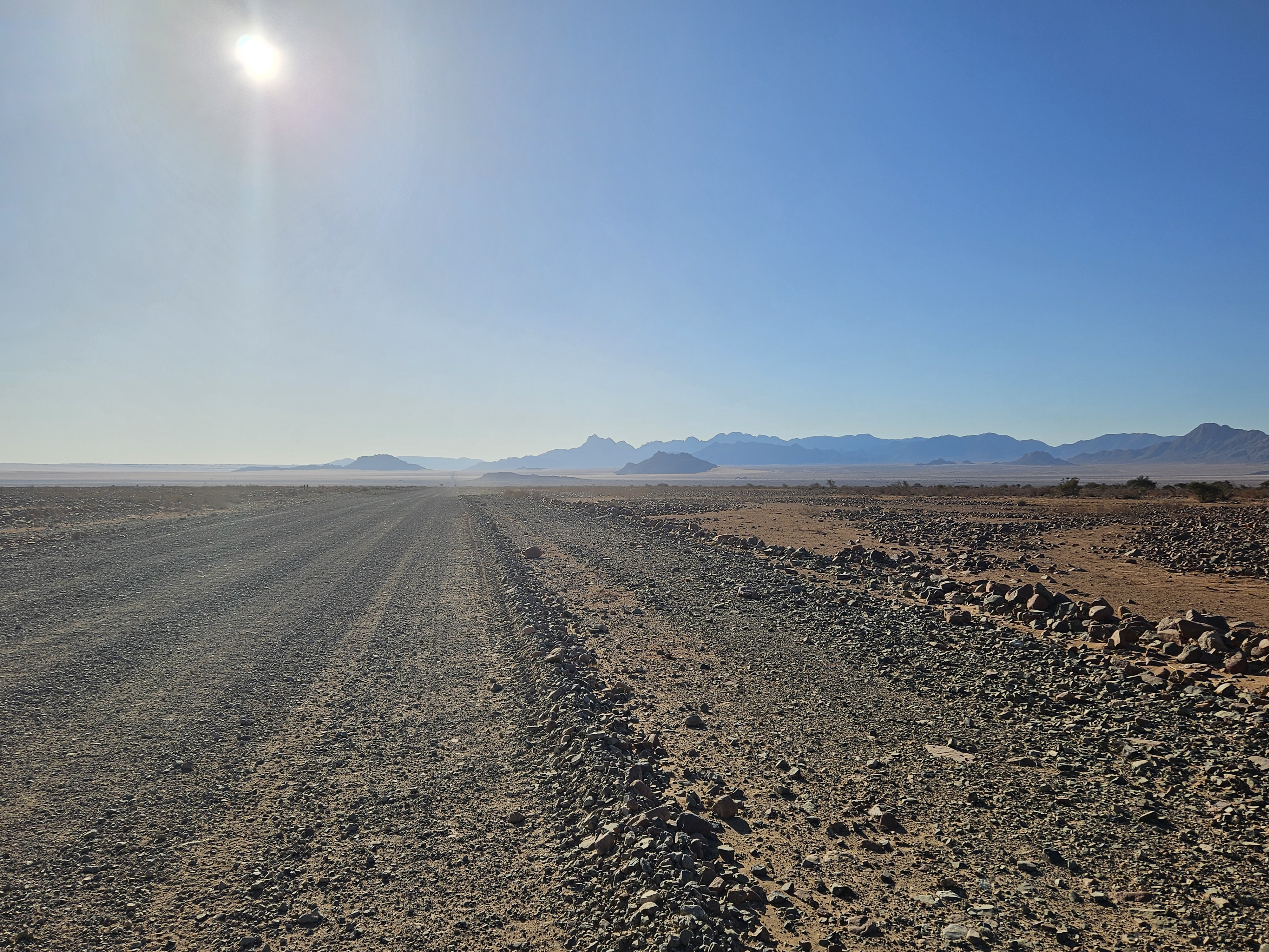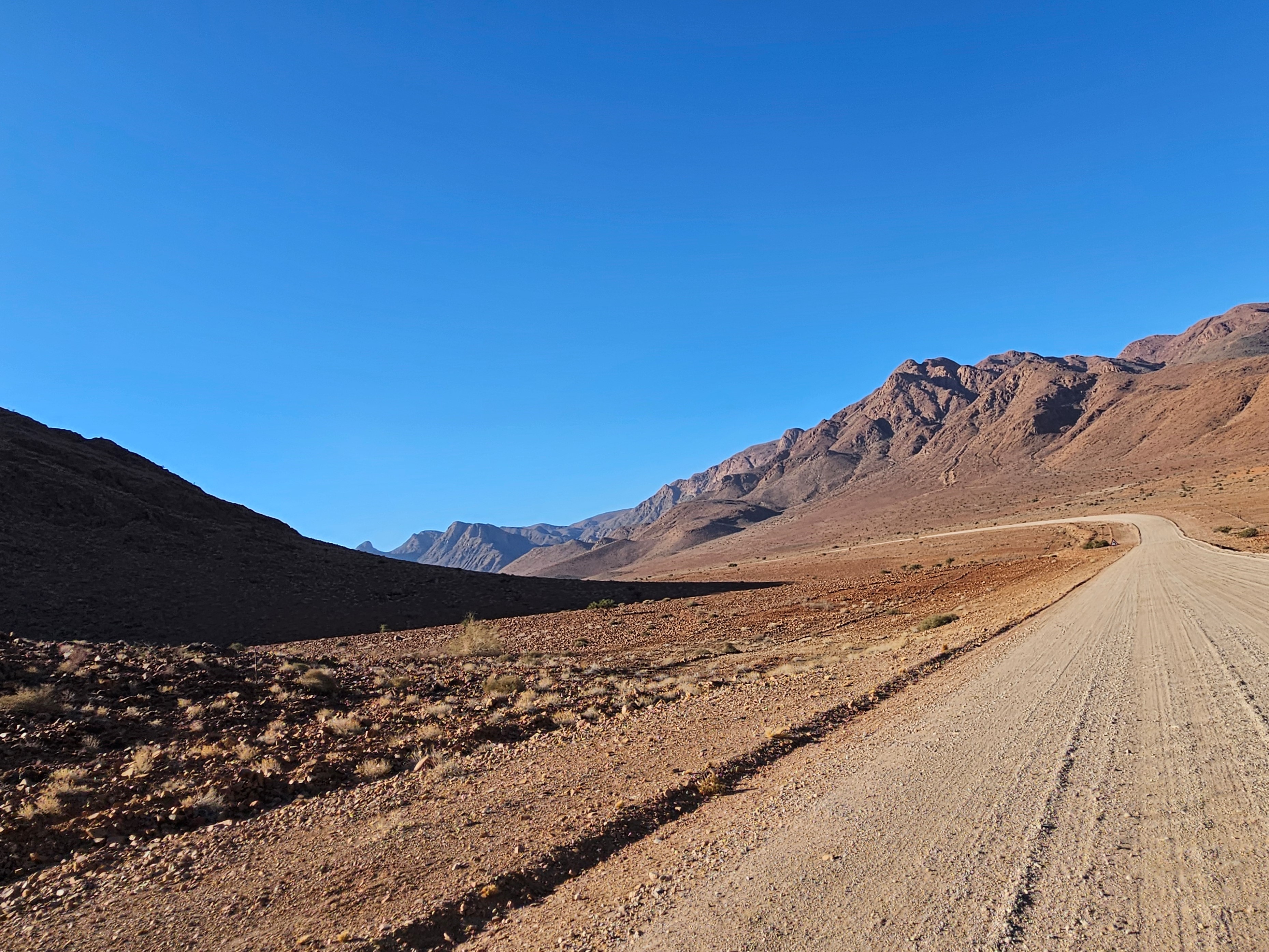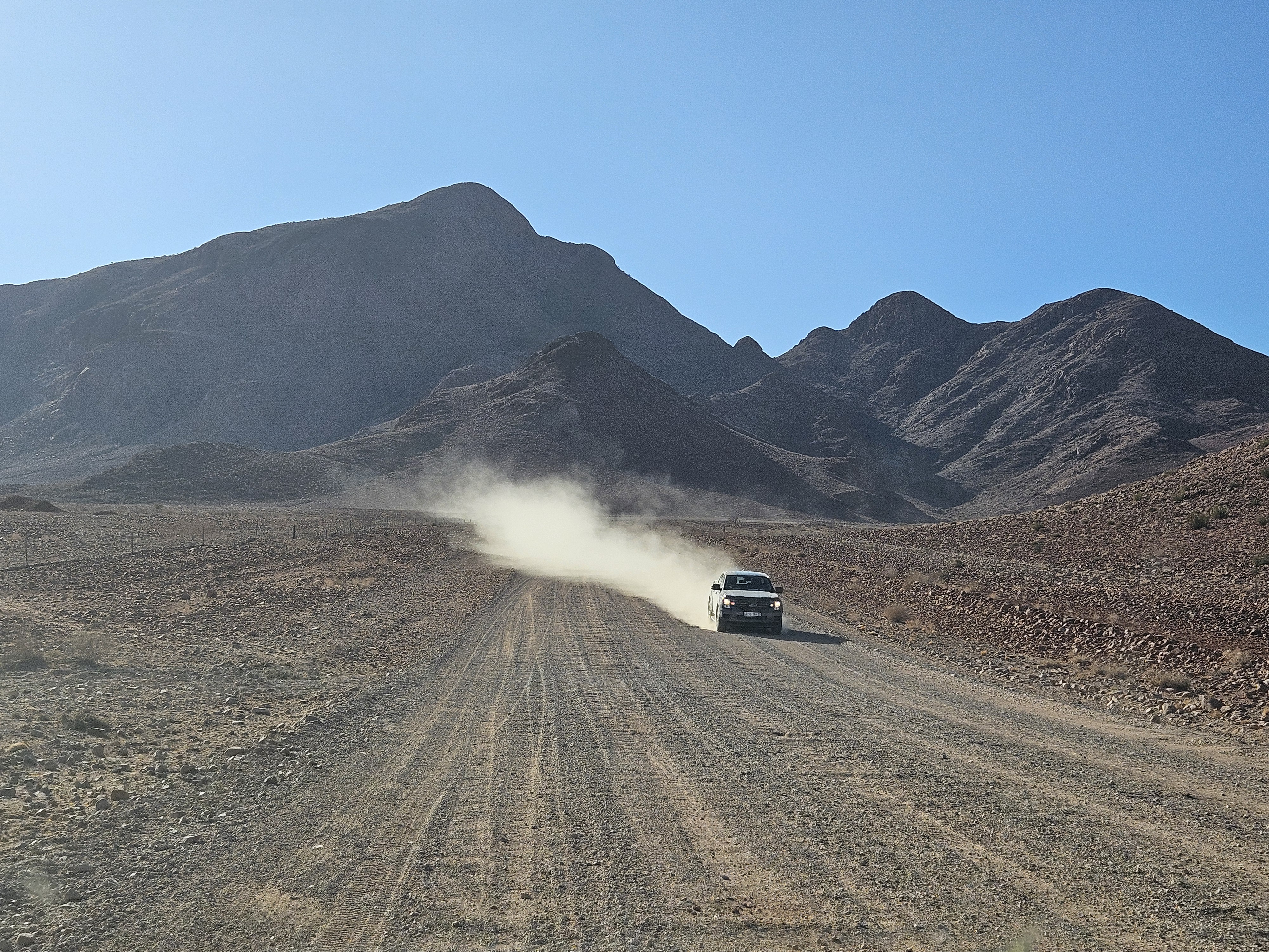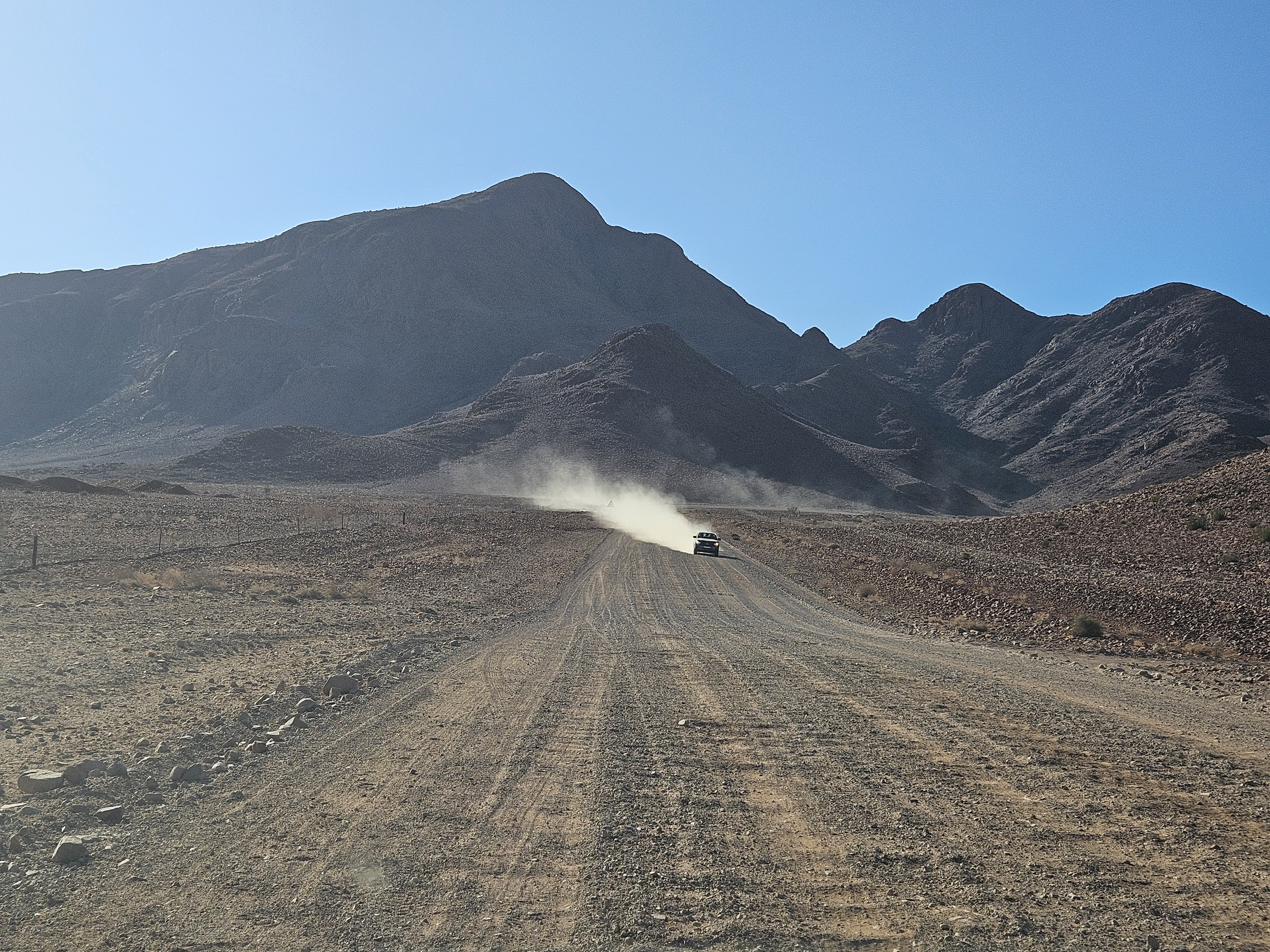Facciamo un attimo fatica a capire dove andare perché le mappe off line non ci sostengono più nel Namib. Ma poi l’intuito di Franci prevale e ci riporta sulla retta via, ma con una sorpresa. Inizia una brutta C, il terreno intorno si fa più brullo e scuro, molto simile ad alcuni territori dell’entroterra islandese, ma la strada sembra persino peggiorare, perché i solchi si fanno via via più profondi e la strada più dura, tanto che le gomme andrebbero sgonfiate ancora un po’, se Spes Bona non fosse soltanto il nome di un crocevia, un non luogo a cavallo di altri non luoghi.