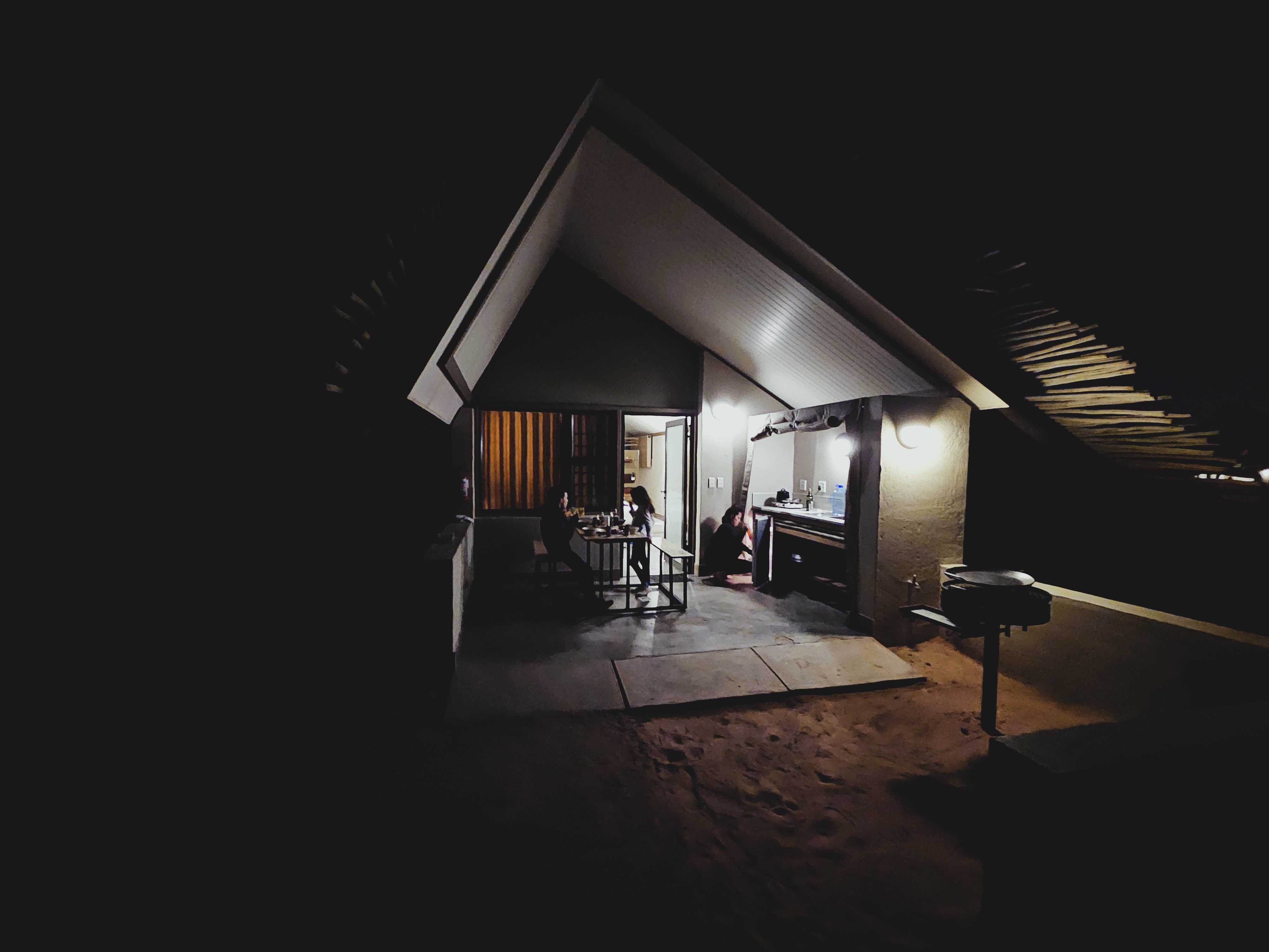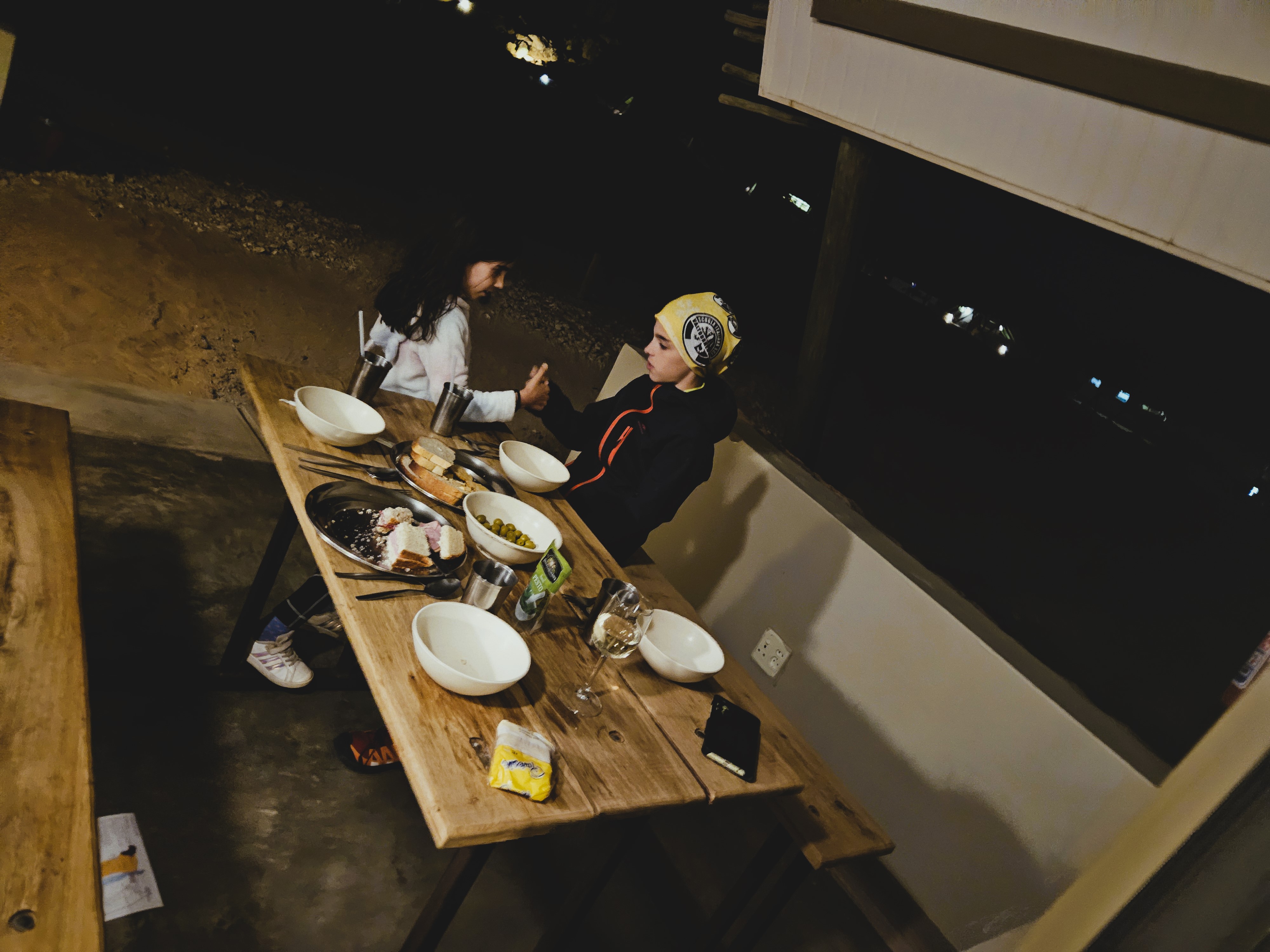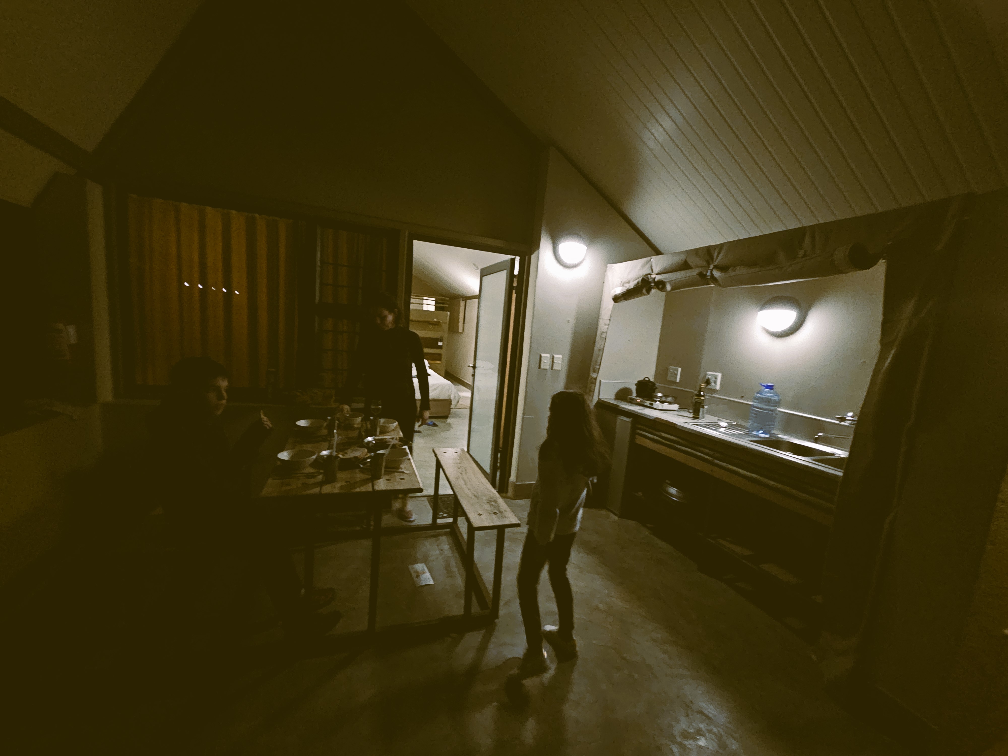 Franci si reca in reception per annullare la prenotazione della cena, poi torna e iniziamo ad apparecchiare. Cerchiamo le vettovaglie vicino al frigo, poi di lato, e poi sotto, e sopra, scrutando ogni angolo del nostro curioso lodge, ma non c’è traccia di piatti, pentole e quant’altro serva per cucinare. Ci siamo ormai arresi al fatto di prendere la via del ristorante, e Franci torna in reception per l’ennesima volta. Ma anziché con l’orario della prenotazione, torna con un box nero bello grande, che contiene tutto il necessario per cucinare. Siamo felici di poter restare lì. Il tramonto è magnifico, la pasta è più che decente e a noi piace allestire una propaggine di casa durante i nostri vagabondaggi, e quando il luogo lo concede Franci ci supporta con la sua abilità in cucina. Anche stavolta ha fatto tutto il possibile con gli ingredienti a disposizione.
