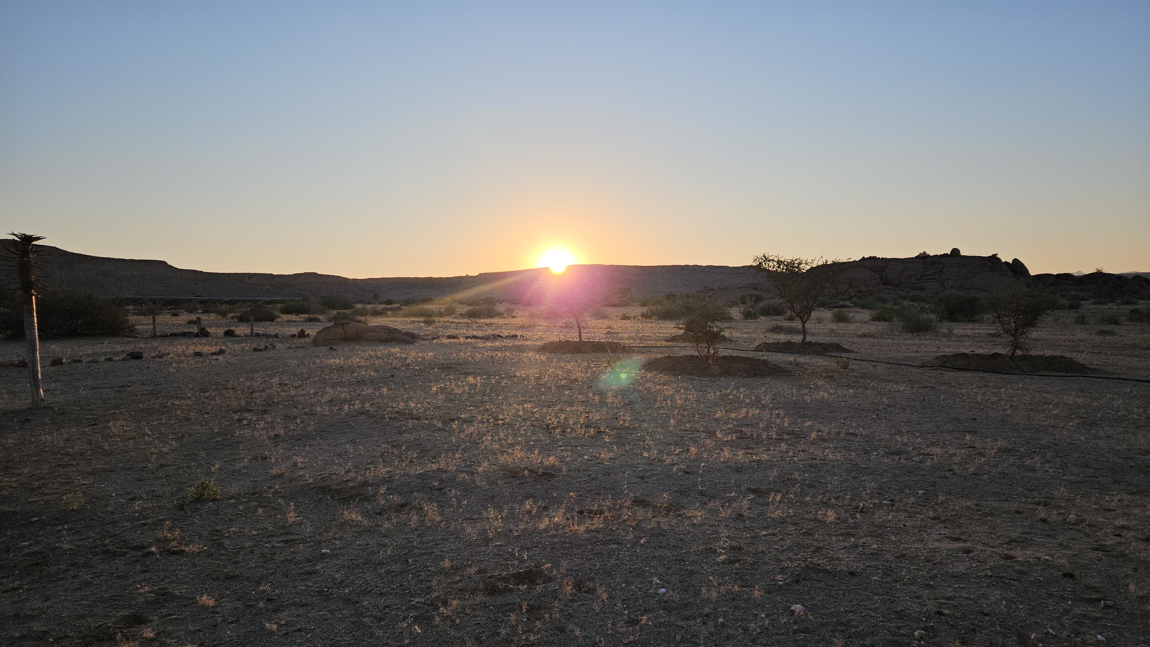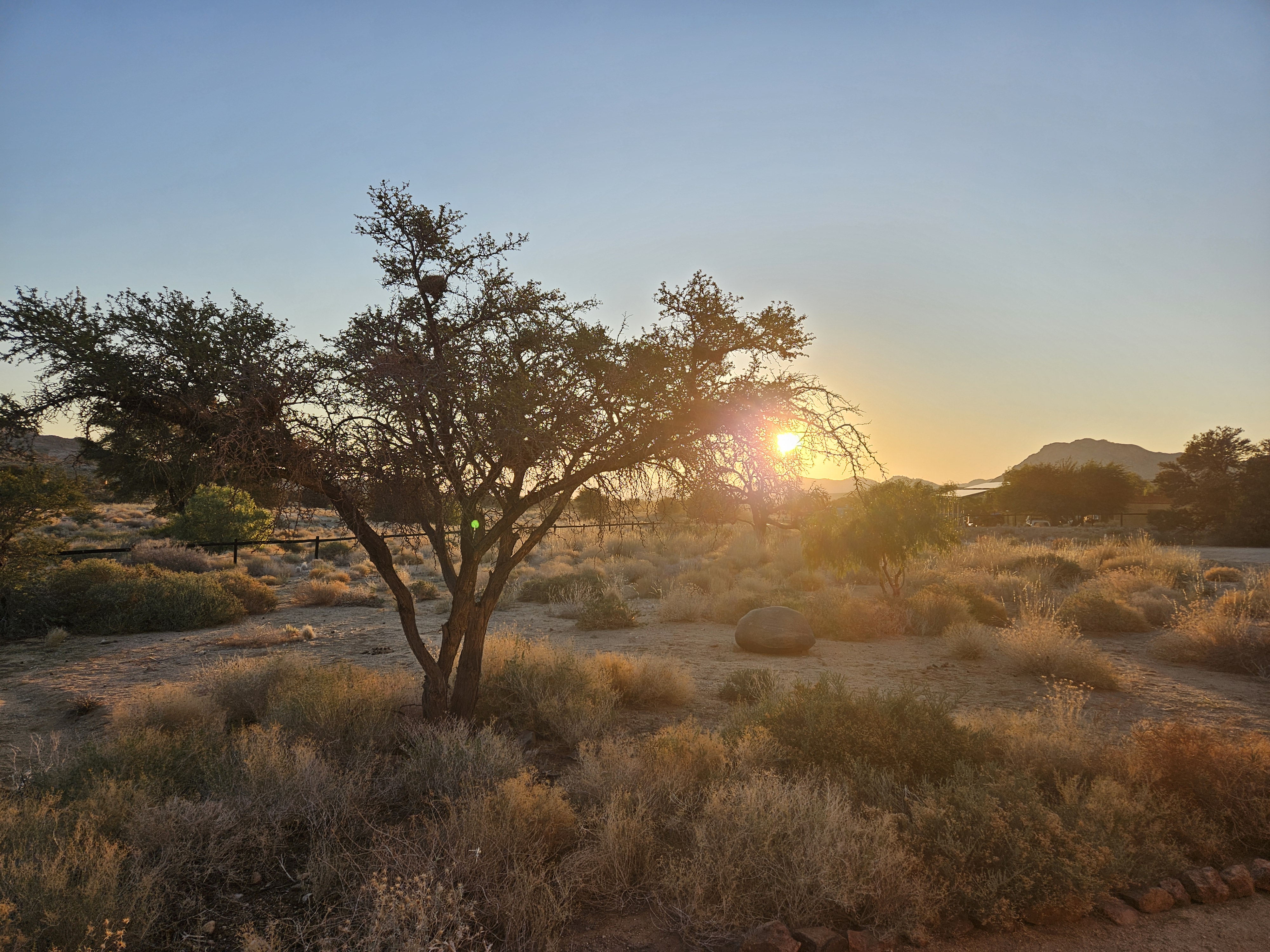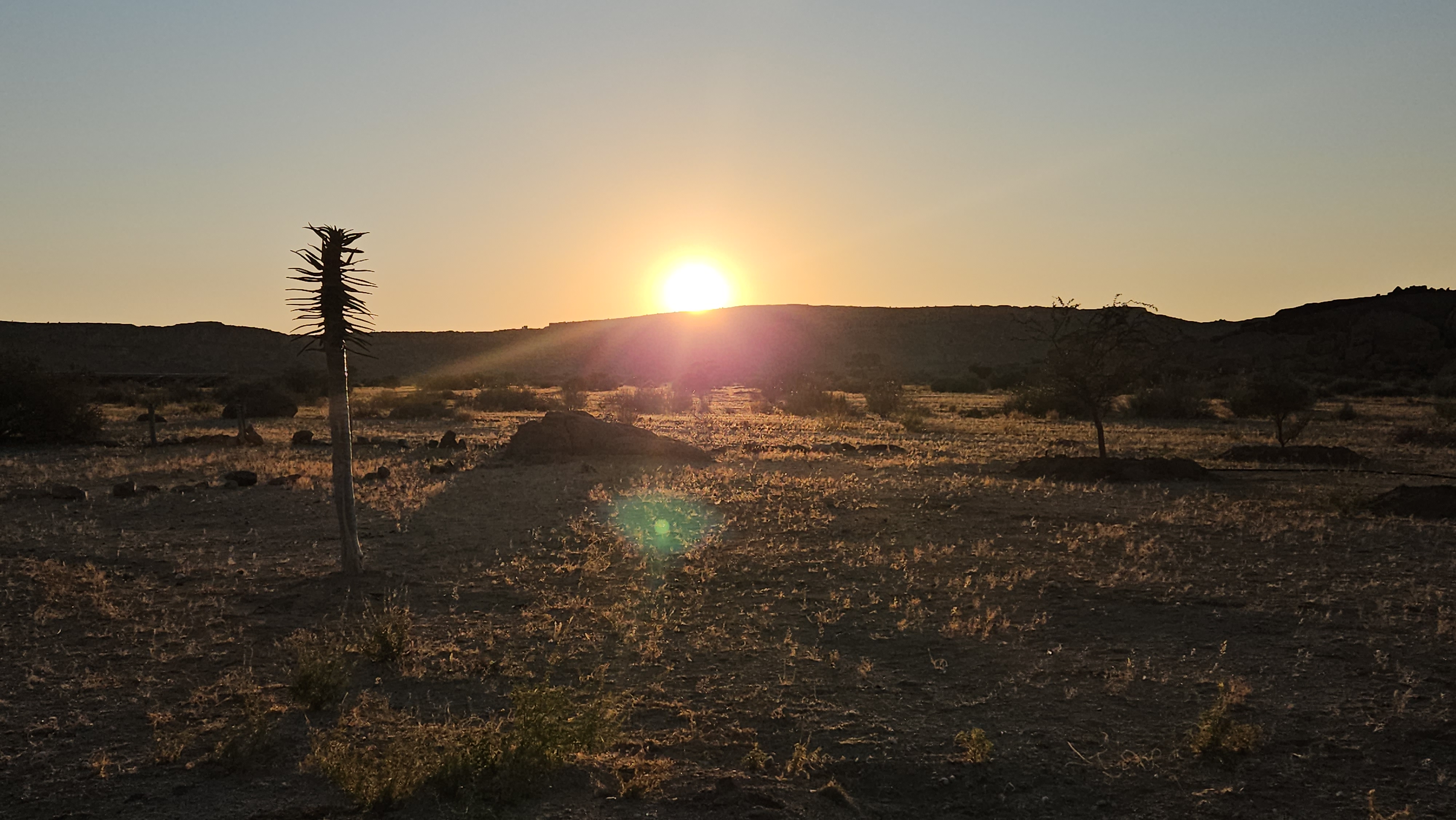 E’ fresco, ma non freddo, il vento è tagliente e scorbutico ma impercettibile alla vista, se non fosse per la sabbia che di tanto in tanto gorgoglia in leggeri mulinelli. Micro ballerine evanescenti danzano sulla superficie brulla per poi dissolversi nell’etere. La vegetazione è composta da coriacei e taciturni arbusti, da qualche solitario albero faretra e da altre specie ad esso riconducibili.