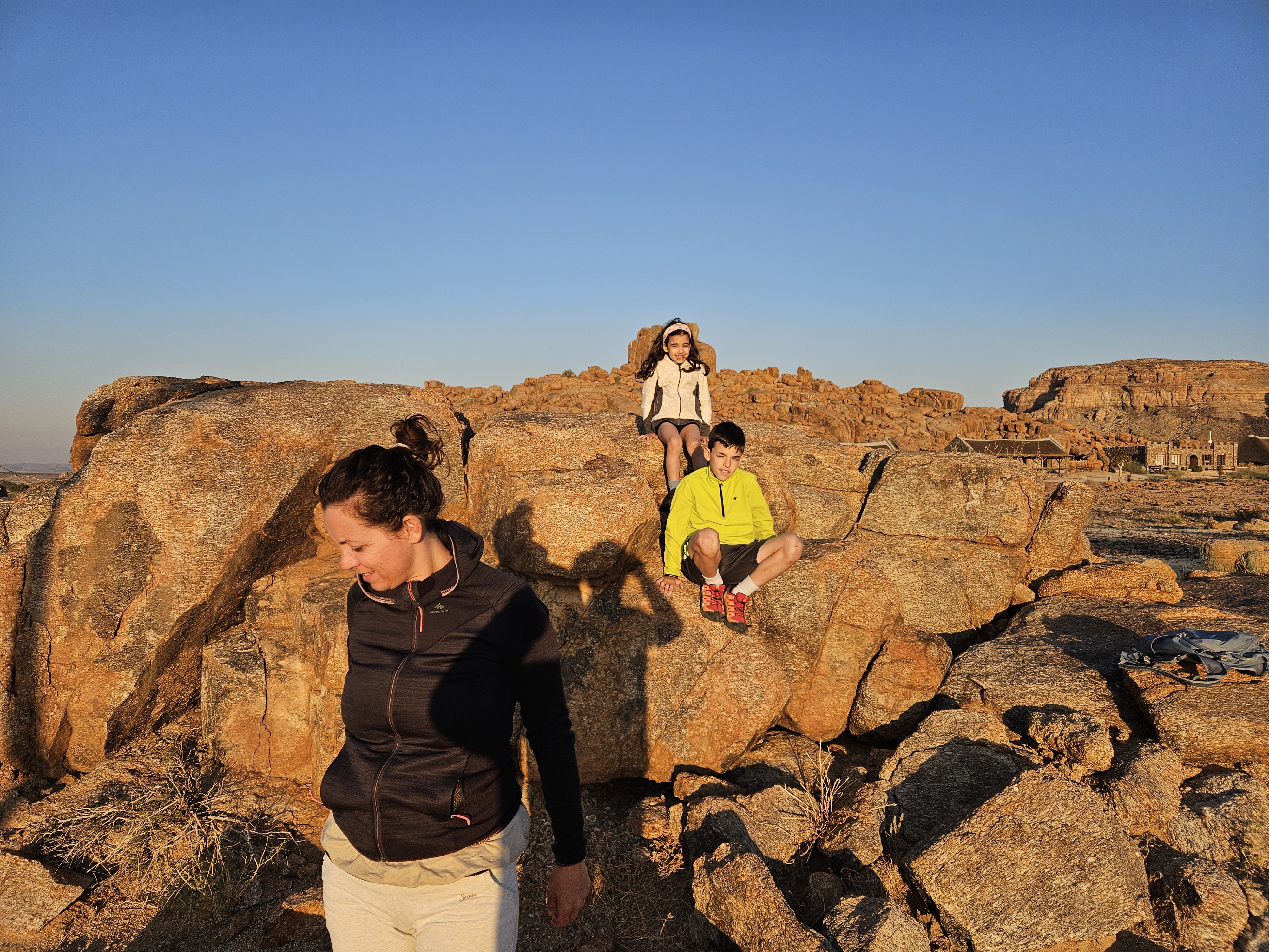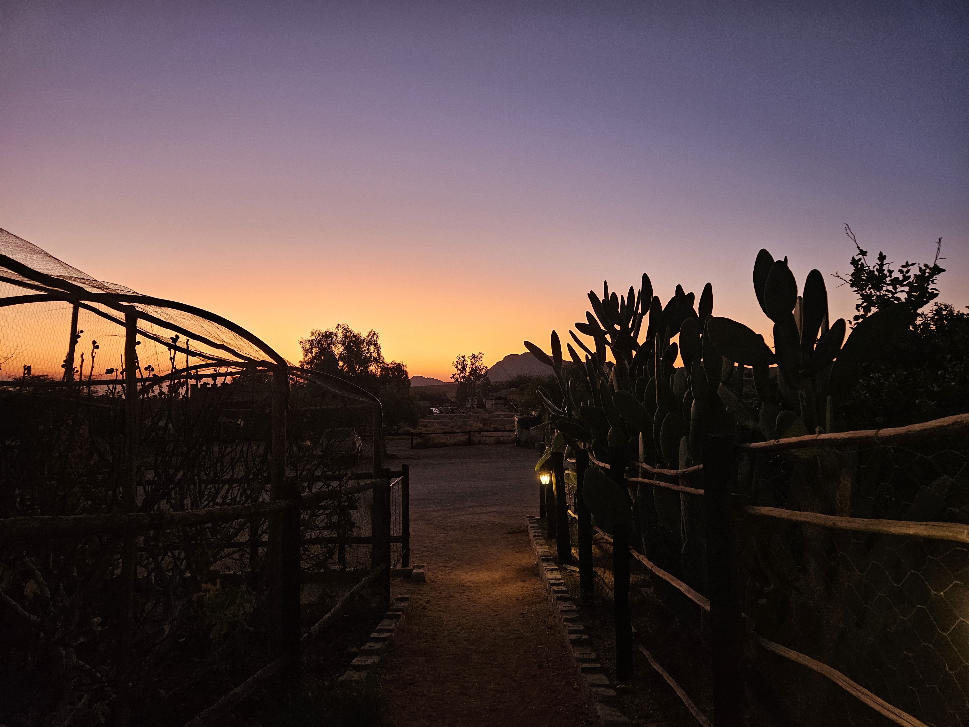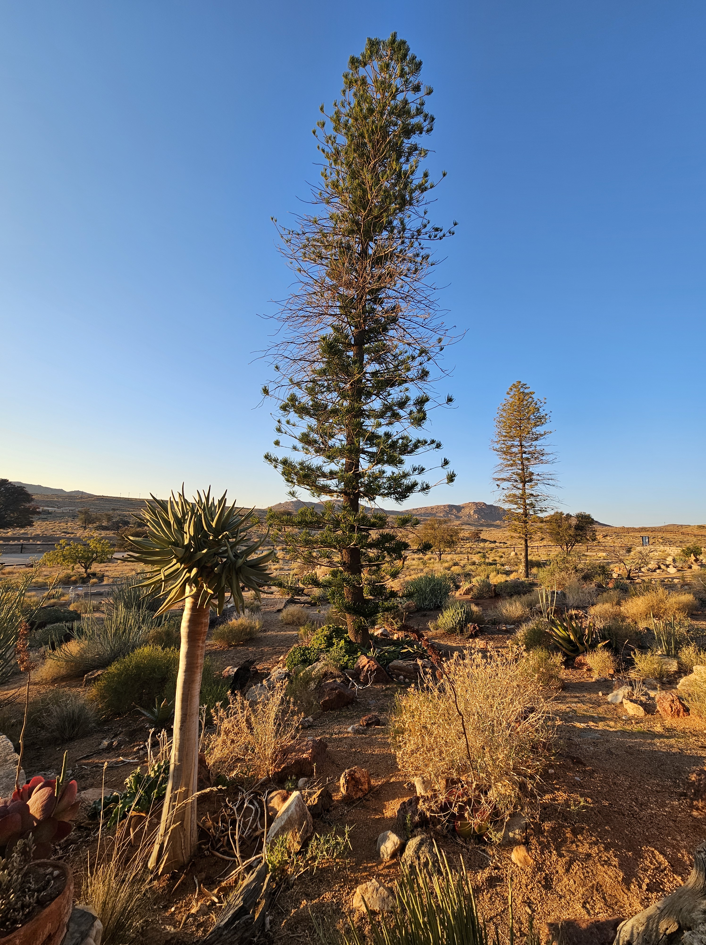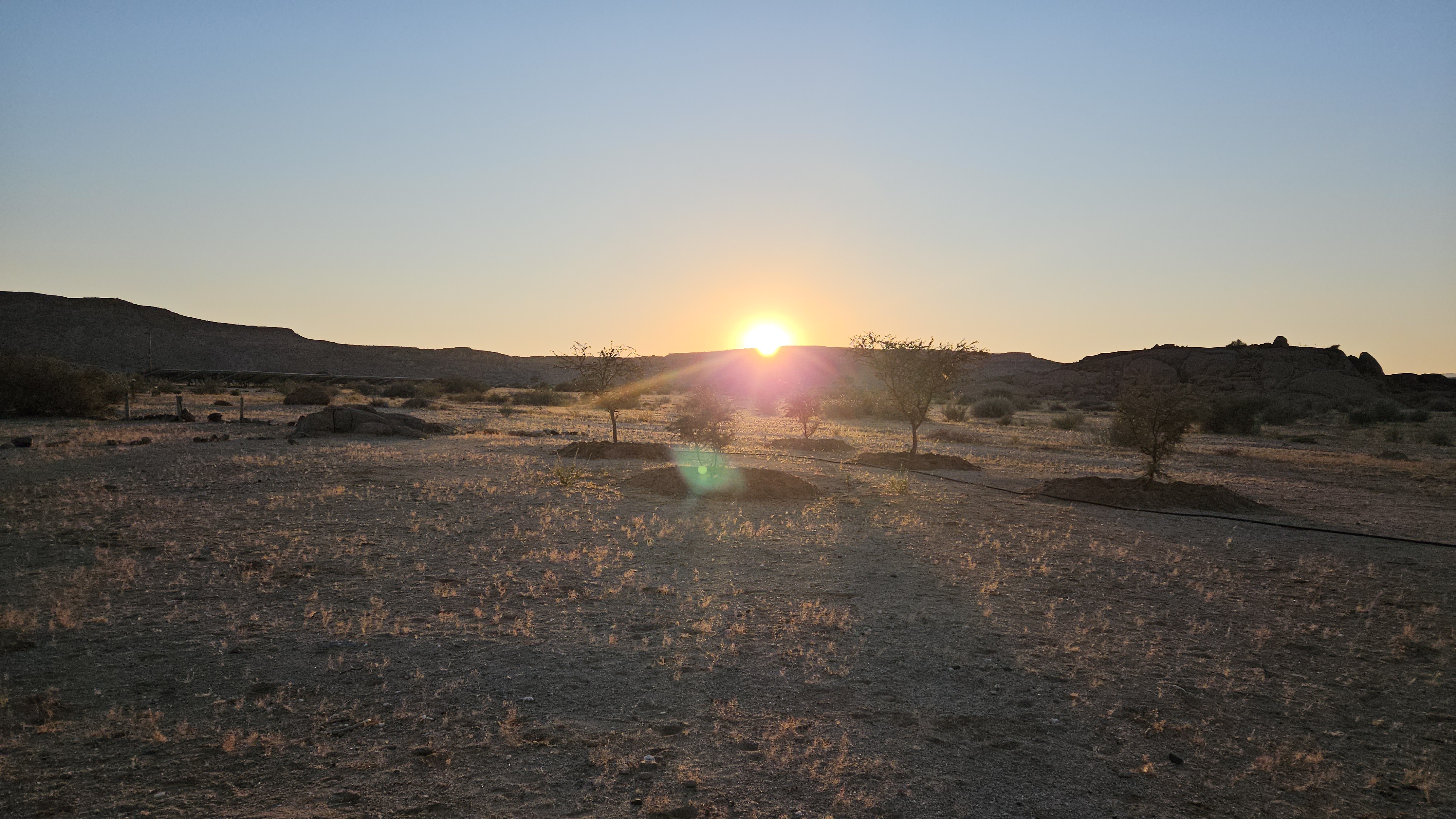 E’ fresco, ma non freddo, il vento è tagliente e scorbutico ma impercettibile alla vista, se non fosse per la sabbia che di tanto in tanto gorgoglia in leggeri mulinelli. Micro ballerine evanescenti danzano sulla superficie brulla per poi dissolversi nell’etere. La vegetazione è composta da coriacei e taciturni arbusti, da qualche solitario albero faretra e da altre specie ad esso riconducibili.