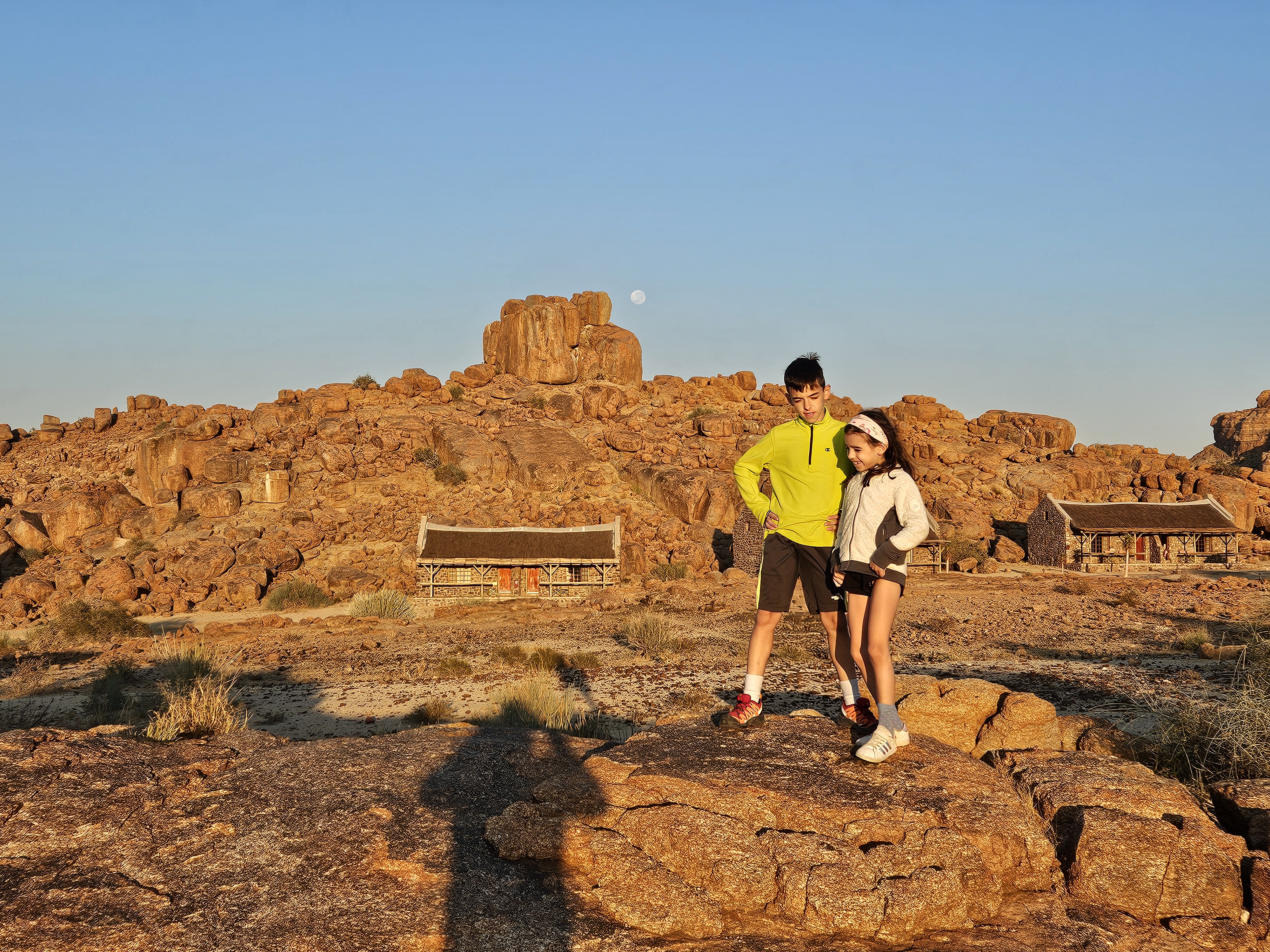 Qui in Namibia l’alba è più luminosa ma algida, di un azzurro freddo e surreale. La luna – attonita- sembra immobile, quasi si fosse persa, e si guardasse intorno per ritrovare il sentiero di casa. O forse è amareggiata, vorrebbe giocare l’ultima volta a nascondino, ma gli amici si sono ritirati dopo l’ultimo giro. Tana libera tutti, e una volta divincolati, i corpi celesti hanno riconquistato le proprie orbite con un guizzo cosmico. Robusti dorsi d’aragosta contrastano col blu cobalto del cielo ed esaltano il pallore estatico del nostro desolato satellite.