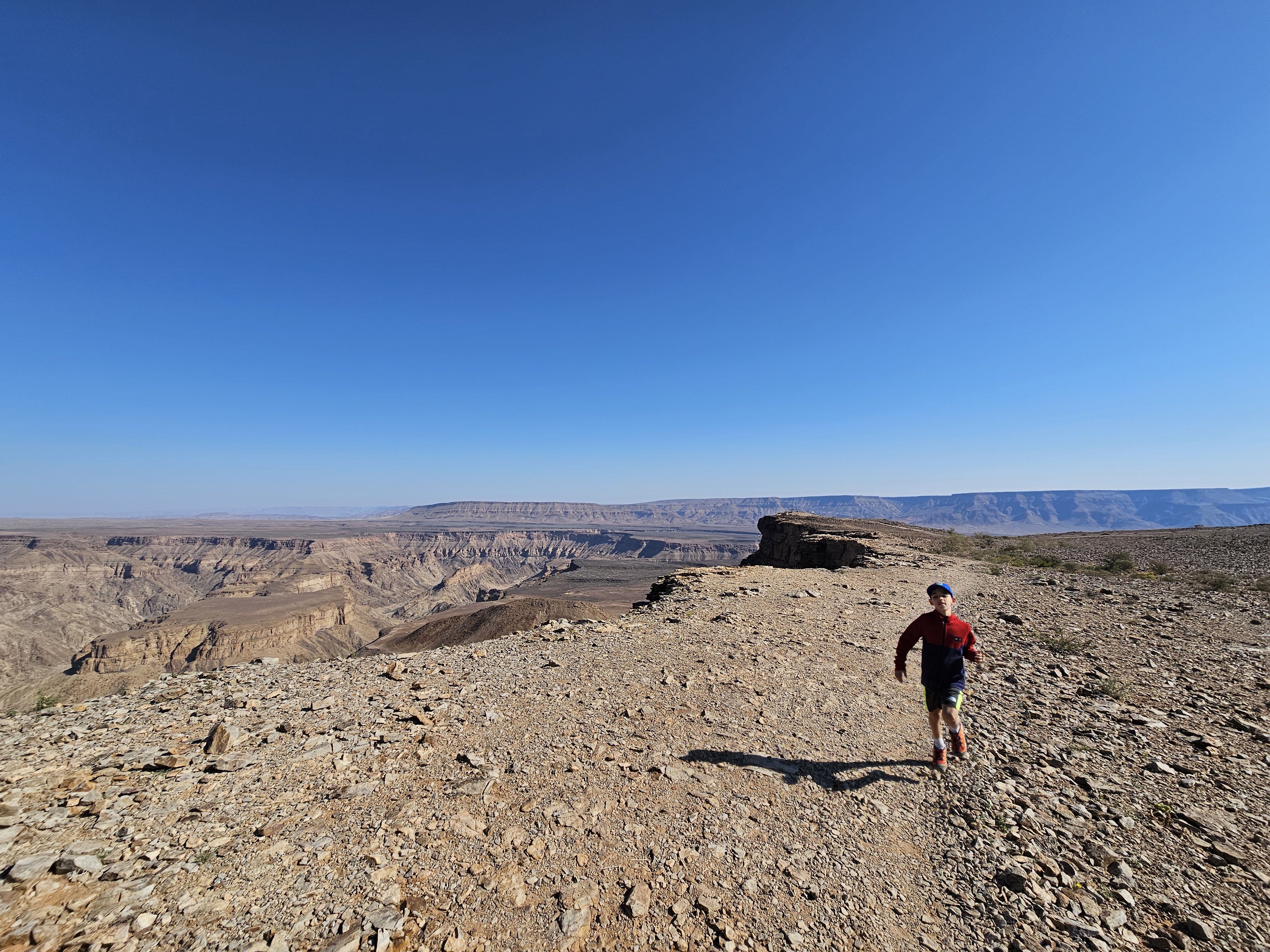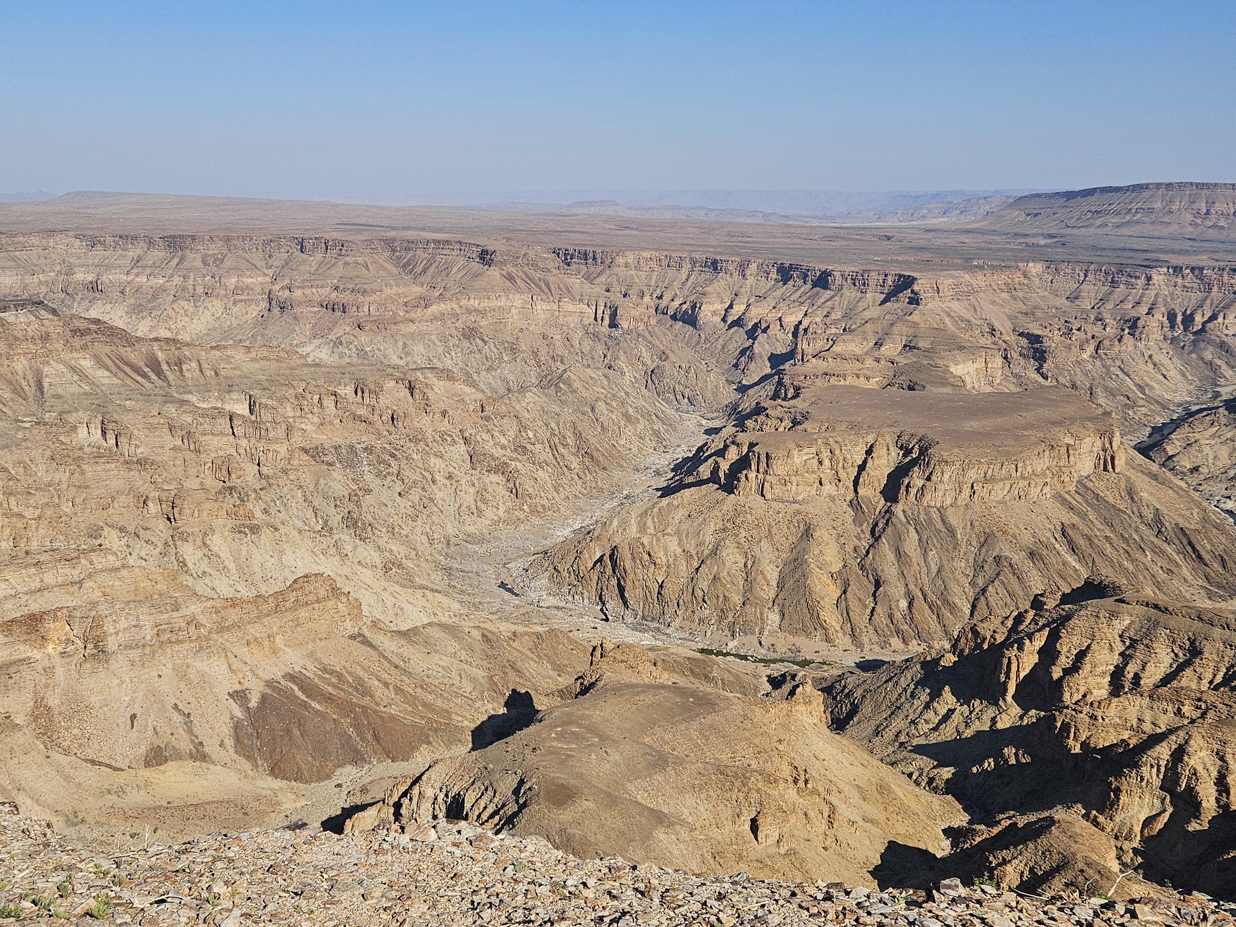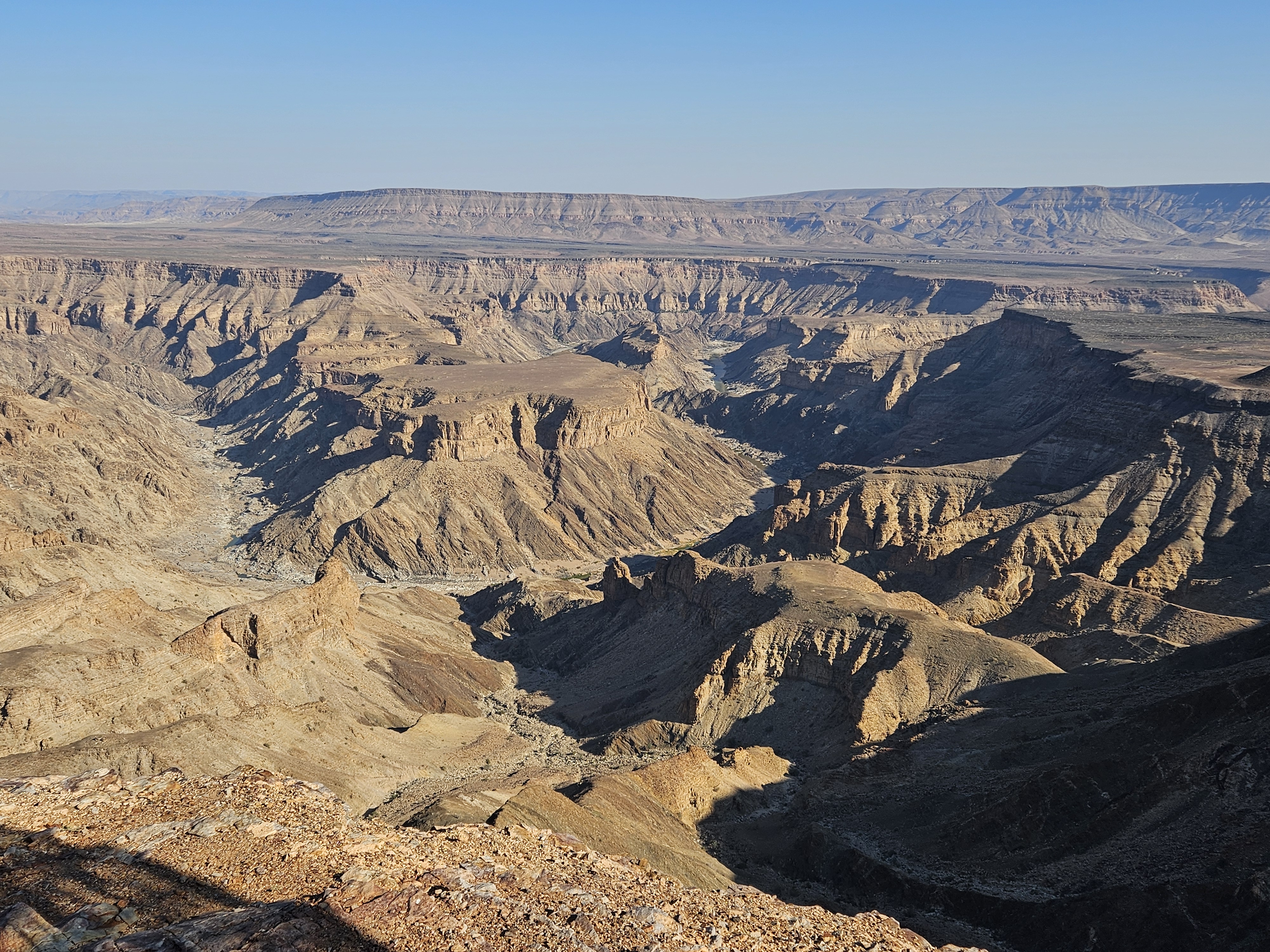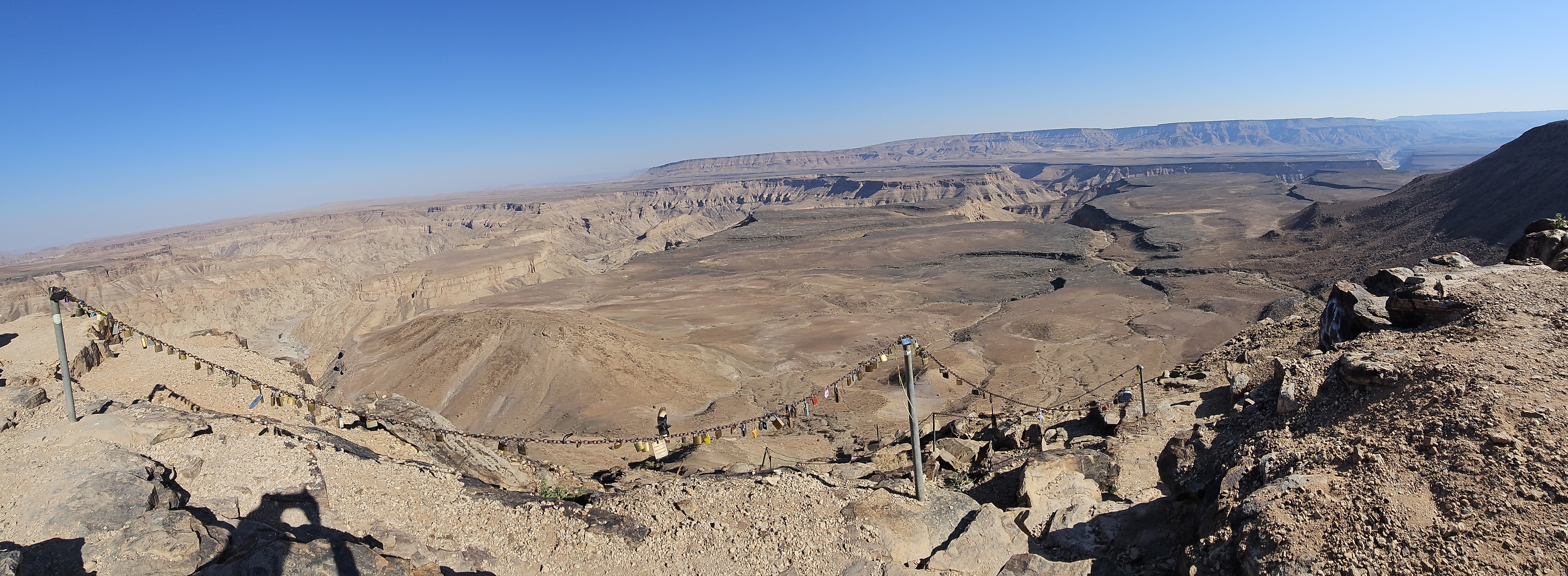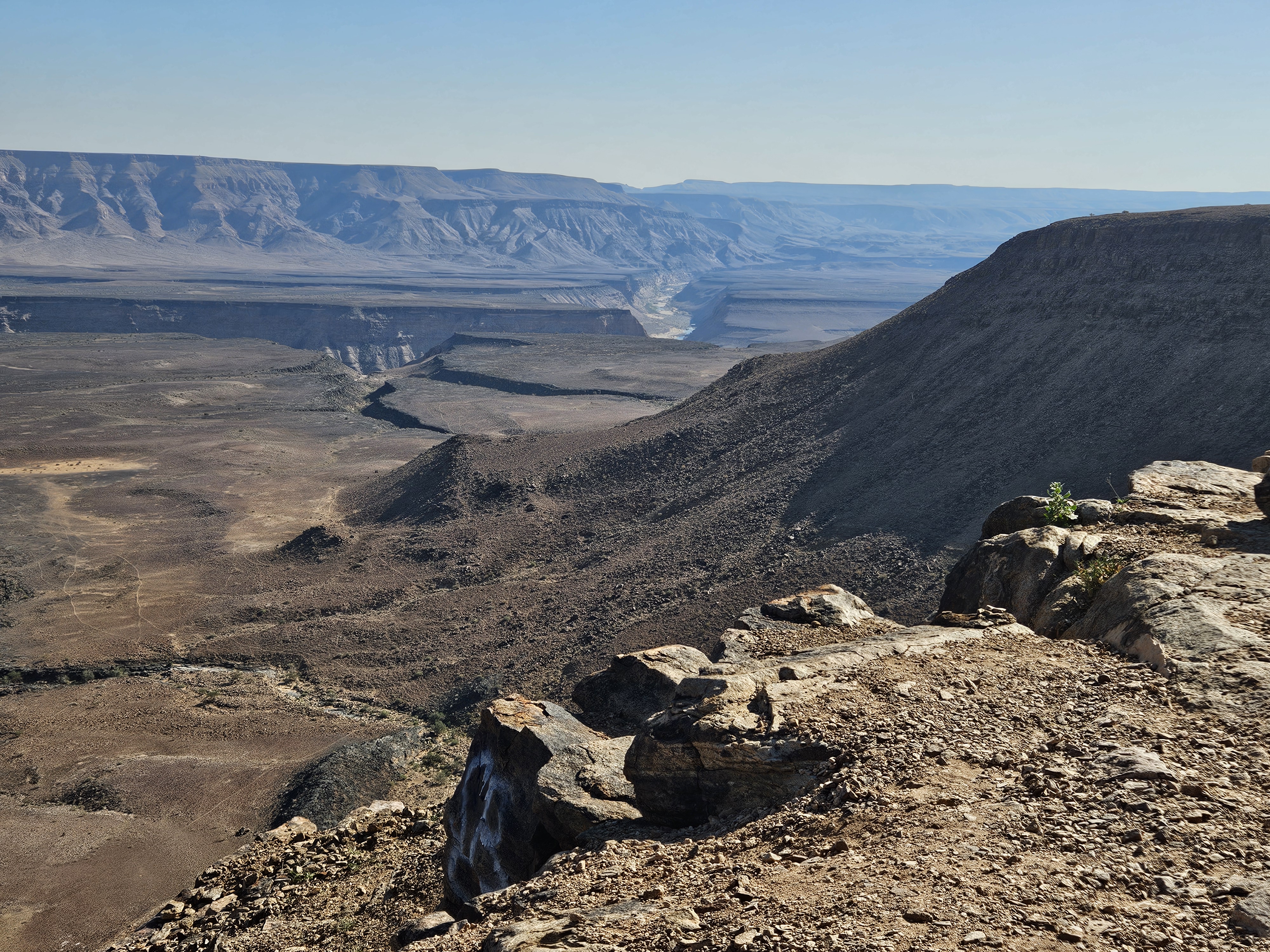 Il canyon si estende per 160 km e sprofonda oltre i 500 metri in alcuni punti. Generato da sismi primordiali devastanti e dall’attività erosiva ed escavatrice del (fu) possente fiume Fish, oggi è un luogo prevalentemente arido. L’impatto visivo è potentissimo e lascia senza fiato: uno spettacolo dirompente, che racconta il passato e descrive il presente in modo inesorabile. Non sembra infinito come il Grand Canyon, ma la sensazione che ho avuto è di poterlo percepire meglio, più compiutamente, rispetto al gigante americano, che in alcuni tratti è talmente vasto da sembrare inconcepibile per i sensi umani.