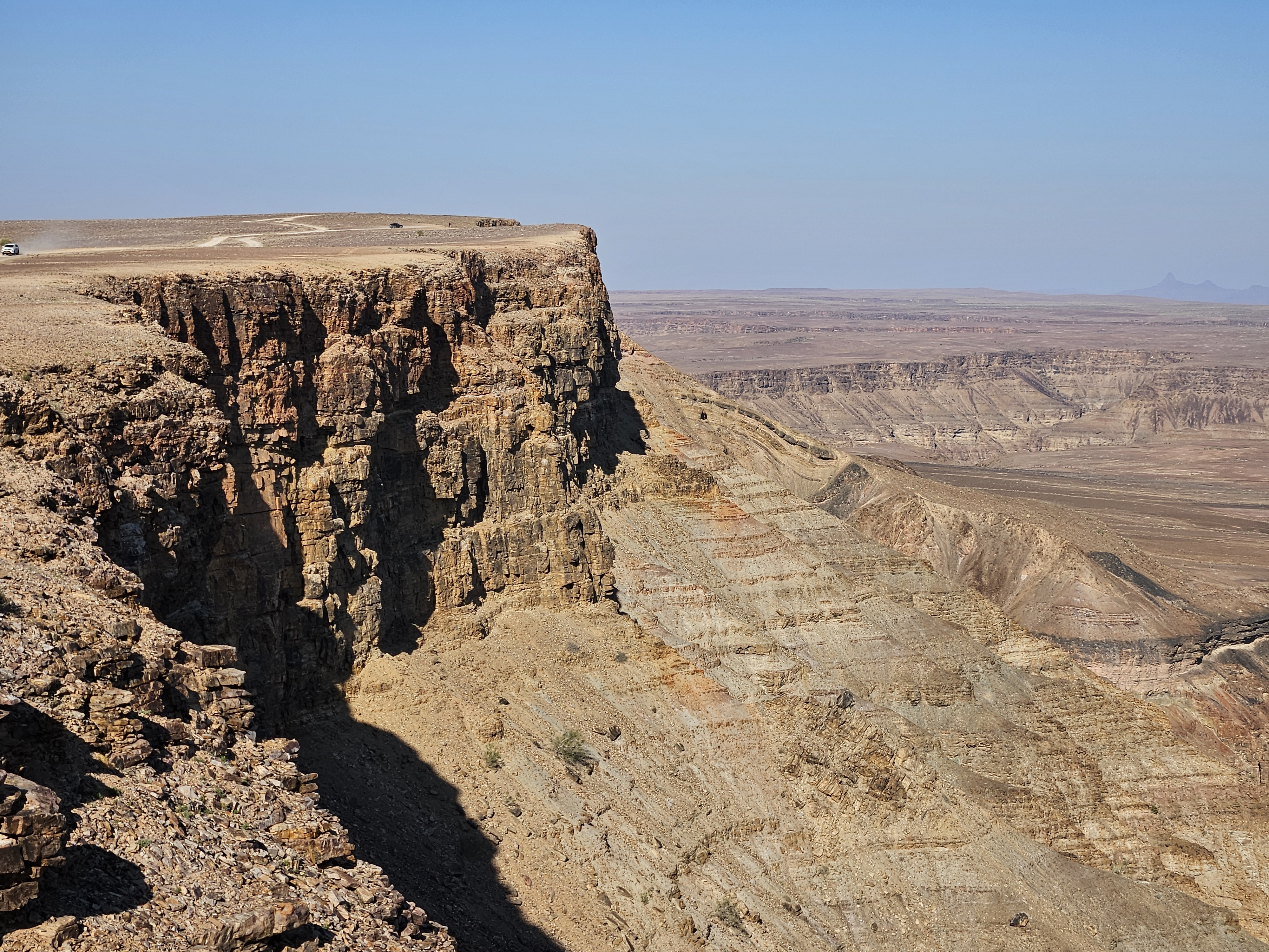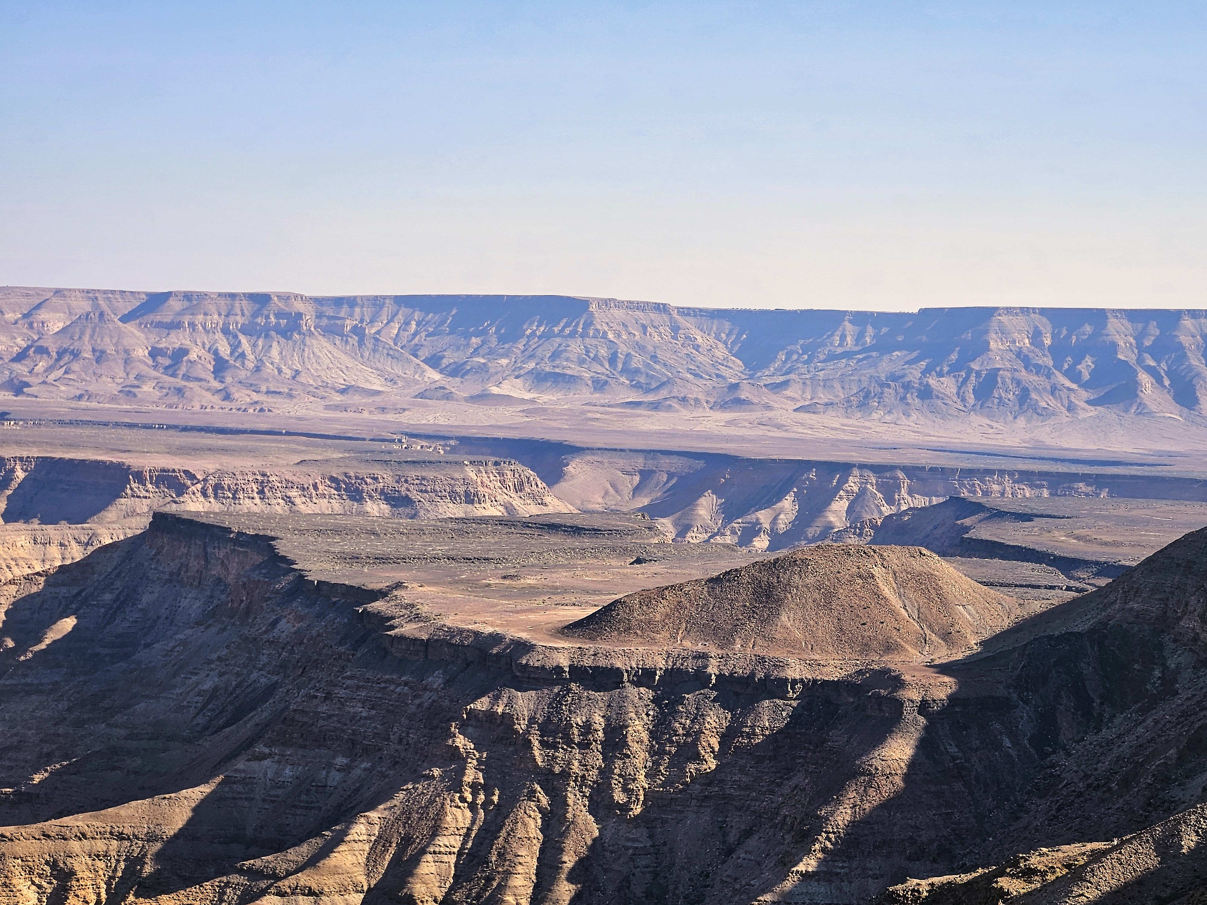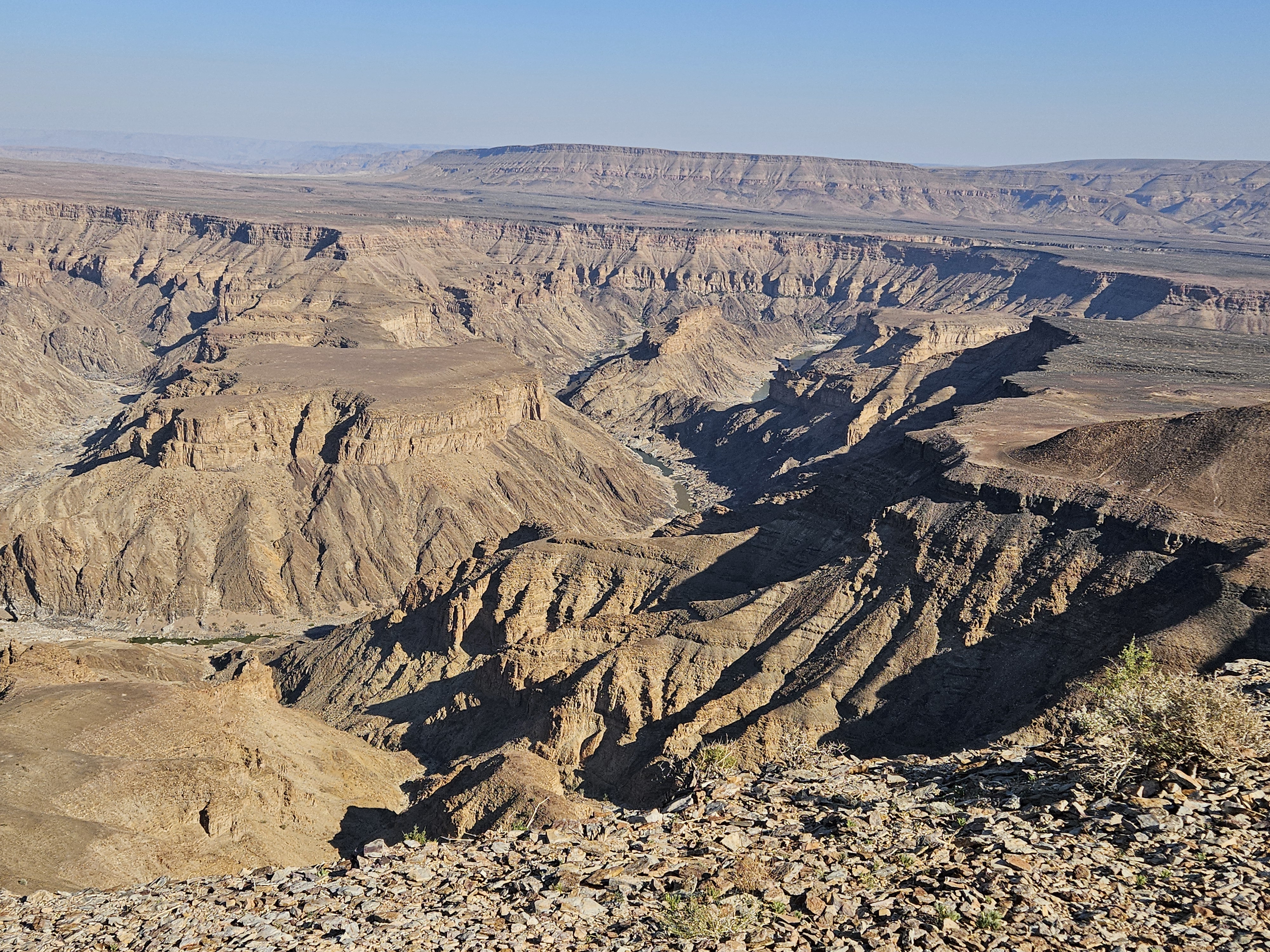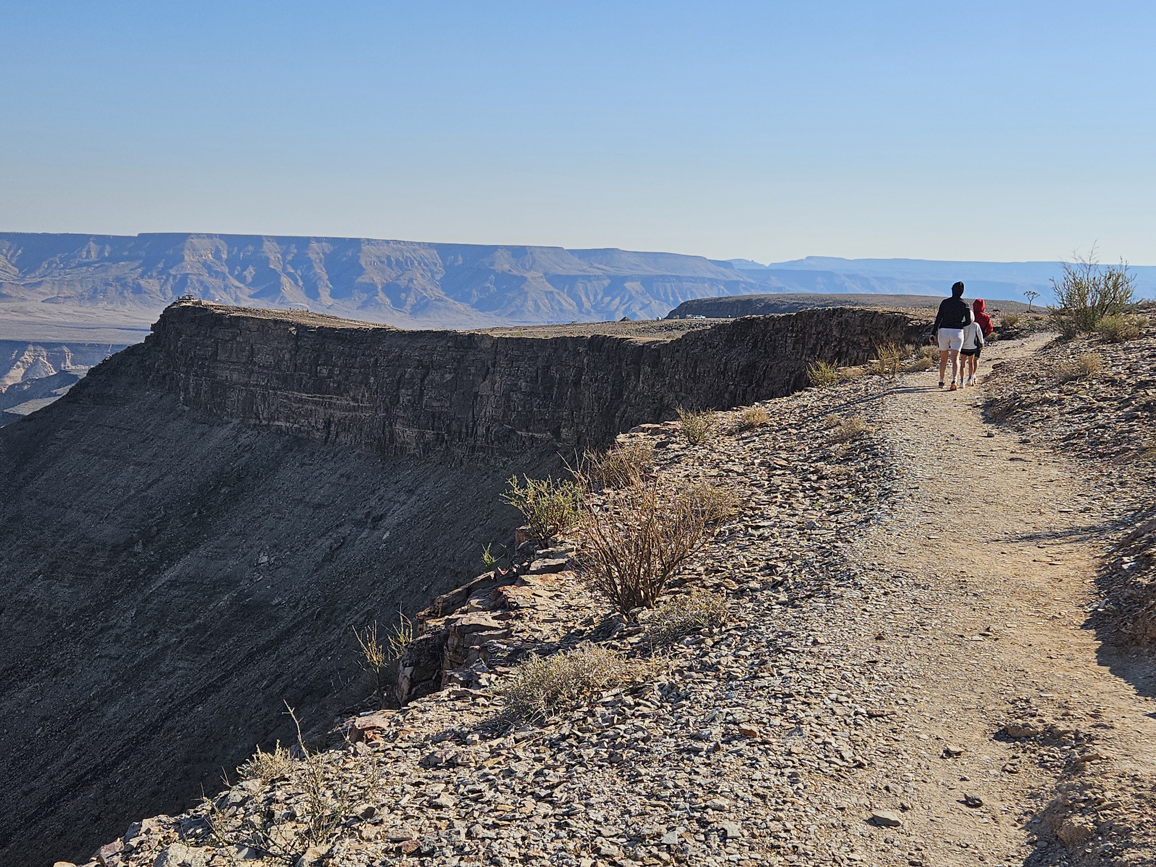 Il canyon si estende per 160 km e sprofonda oltre i 500 metri in alcuni punti. Generato da sismi primordiali devastanti e dall’attività erosiva ed escavatrice del (fu) possente fiume Fish, oggi è un luogo prevalentemente arido. L’impatto visivo è potentissimo e lascia senza fiato: uno spettacolo dirompente, che racconta il passato e descrive il presente in modo inesorabile. Non sembra infinito come il Grand Canyon, ma la sensazione che ho avuto è di poterlo percepire meglio, più compiutamente, rispetto al gigante americano, che in alcuni tratti è talmente vasto da sembrare inconcepibile per i sensi umani.