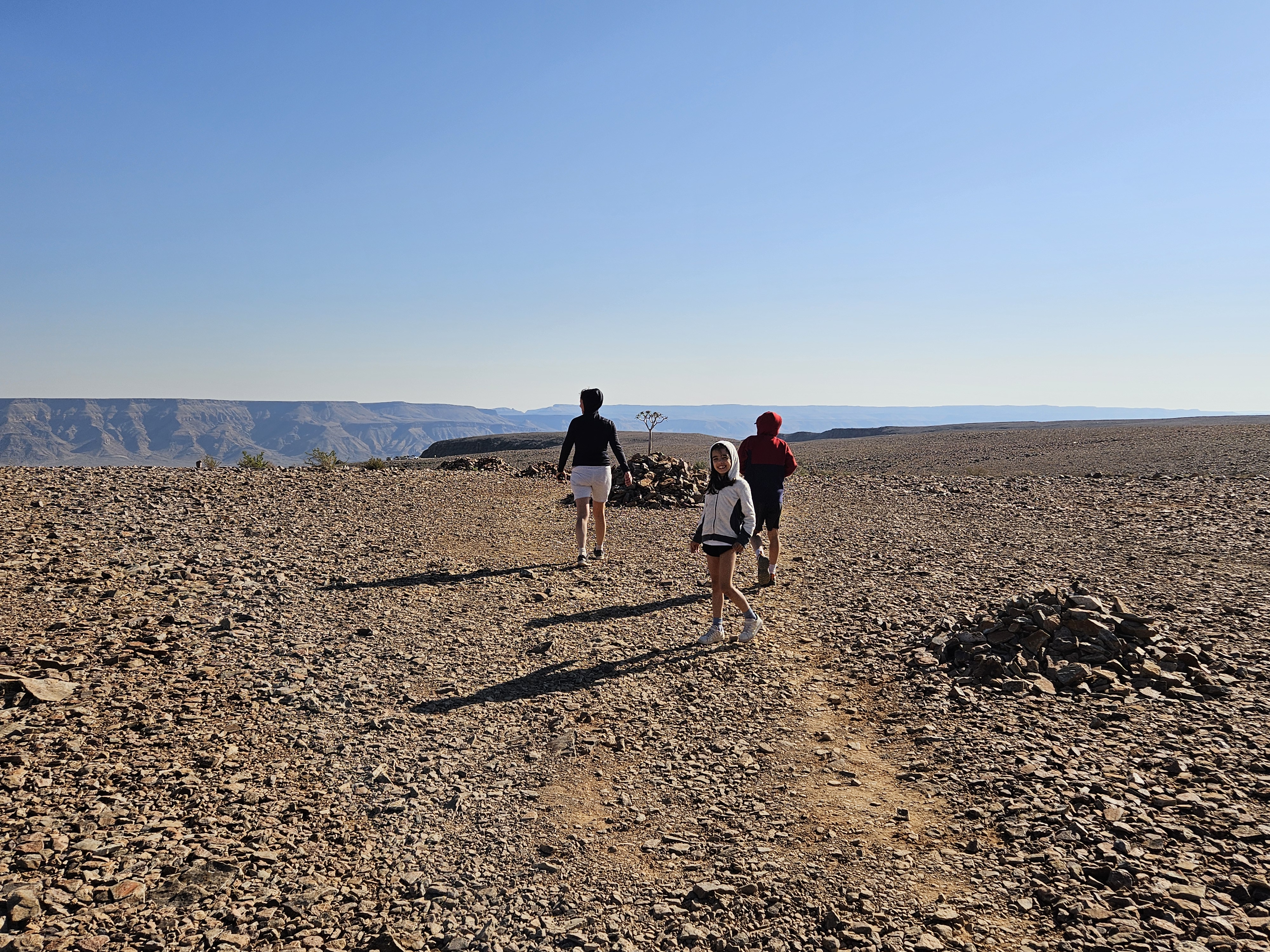 Mangiamo col solito appetito del mattino, pianifichiamo la giornata, facciamo gli zaini e sistemiamo l’automobile, per poi dirigerci al Fish River Canyon. L’ingresso è a soli venti minuti, il punto informazioni è spartano, le indicazioni dell’addetta scarne, ma il percorso è quasi obbligato e proseguiamo oltre senza indugio. Siamo patiti di mappe e cartine, ma in tal senso avremo poche soddisfazioni in Namibia.