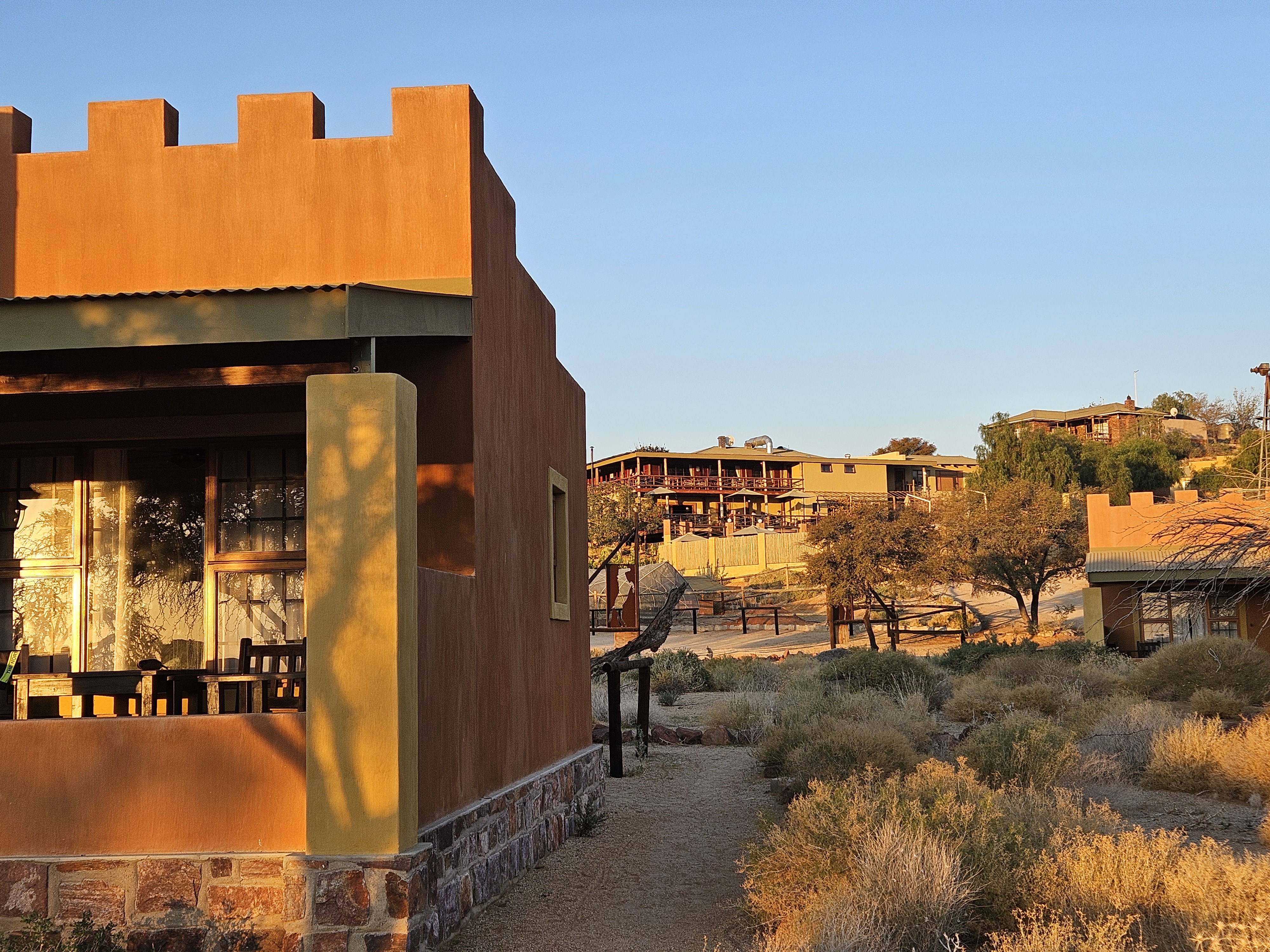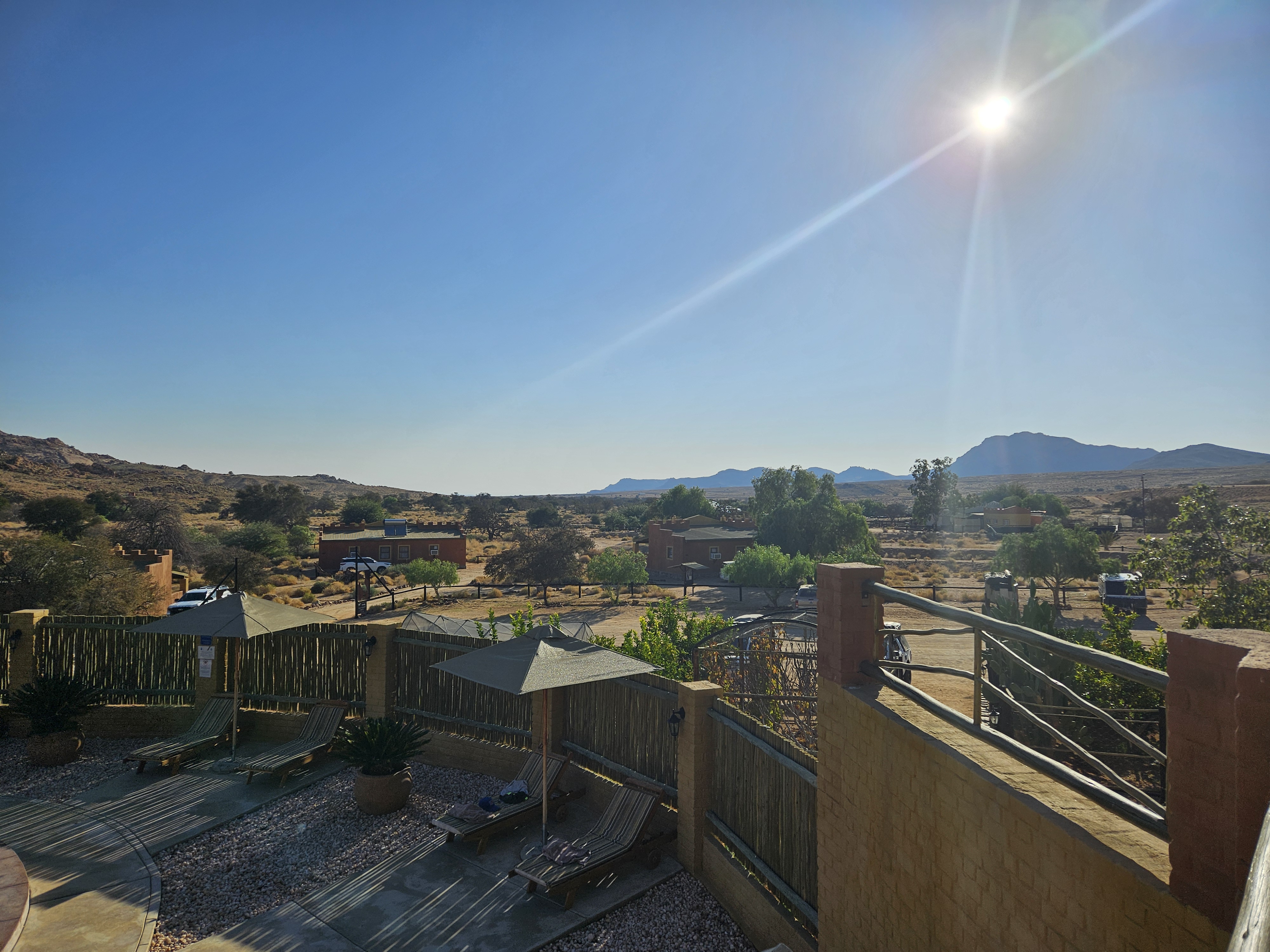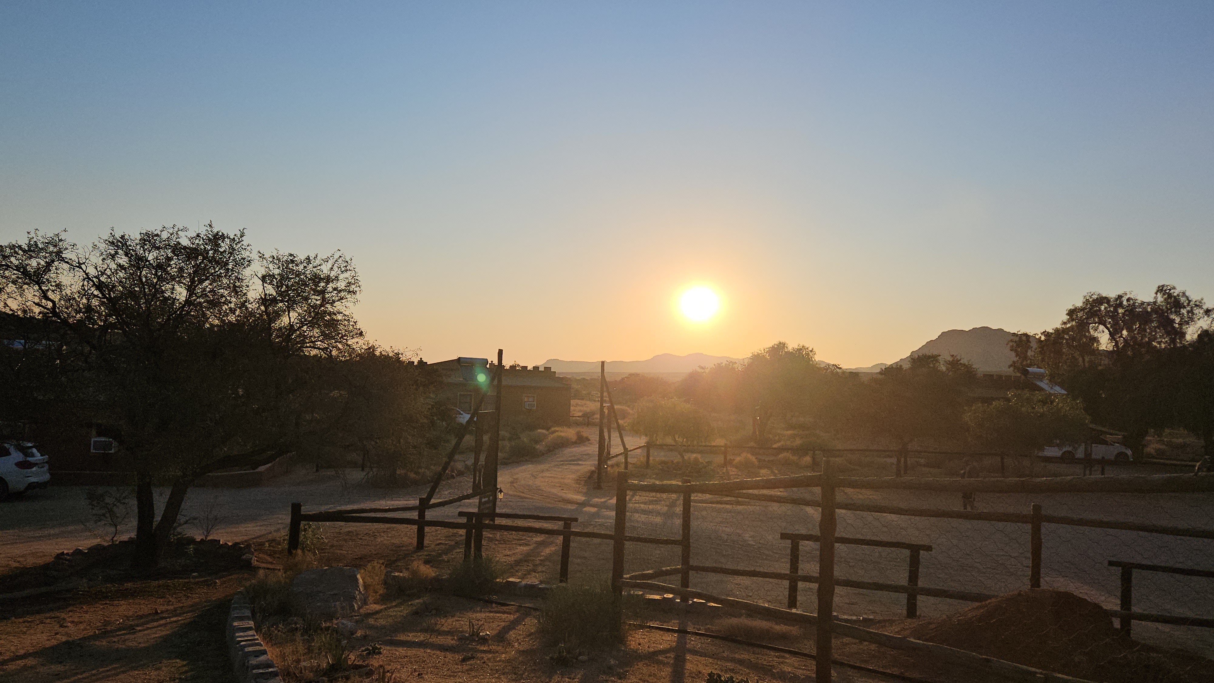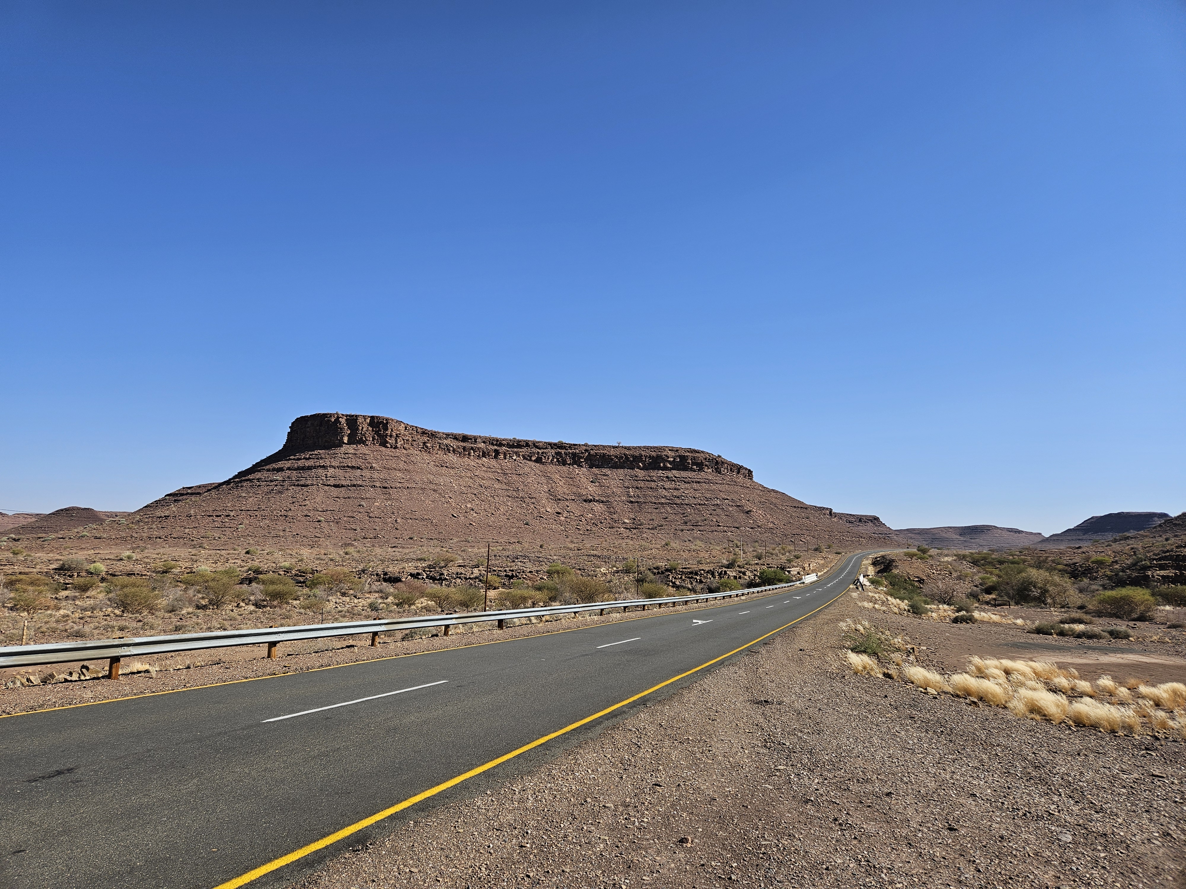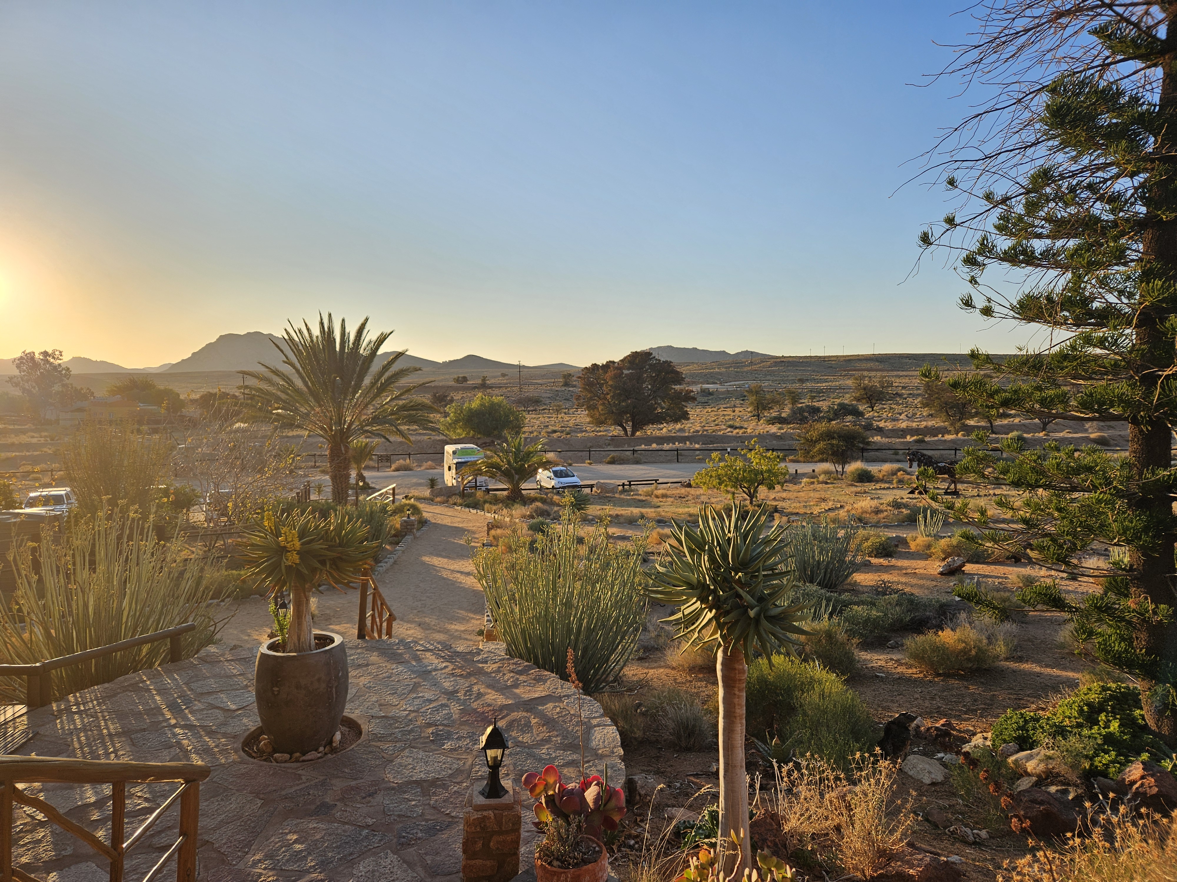 Ma lasciamo la mente dello scrittore vagare nel brodo primordiale del pensiero primigenio e torniamo a noi. Ci concediamo una foto nel punto che segna l’inizio del sentiero verso il fondo del canyon, come per immortalare l’inizio di un percorso mai percorso, e poi torniamo indietro. Sono le 12e30, è ora di andare. Abbiamo tre ore scarse di macchina e oggi vogliamo rilassarci ancora un po’, anche perché l’indomani prevede con ogni probabilità la tappa più pesante del viaggio. Siamo diretti ad Aus, dato che alloggeremo nei paraggi, al Klein Aus Vista Desert Horse Inn, così chiamato perché nei paraggi ci sono pianure popolate da cavalli selvaggi, pronipoti dei cavalli che arrivarono insieme ai coloni tedeschi e che hanno saputo adattarsi e riprodursi in queste terre.