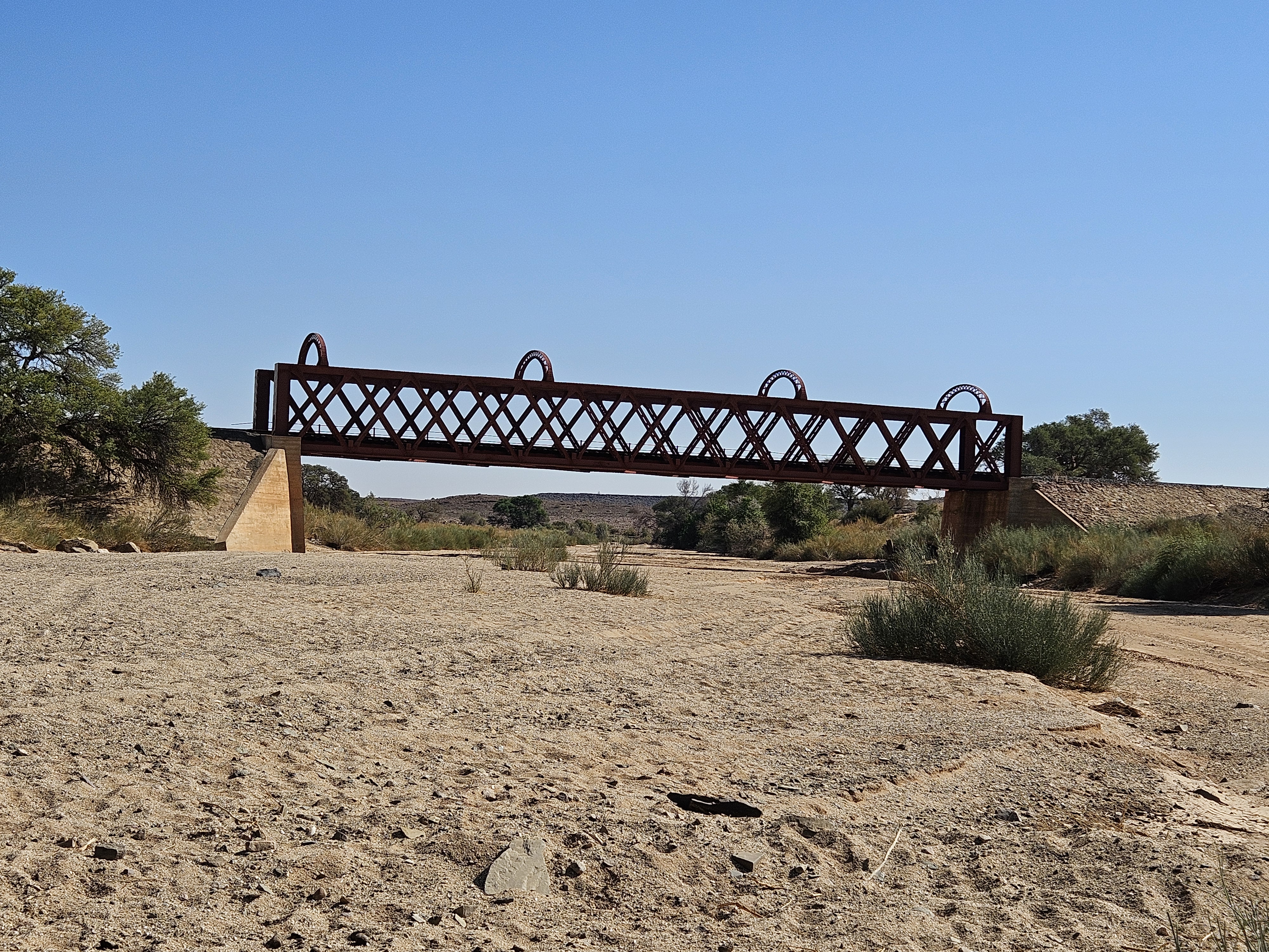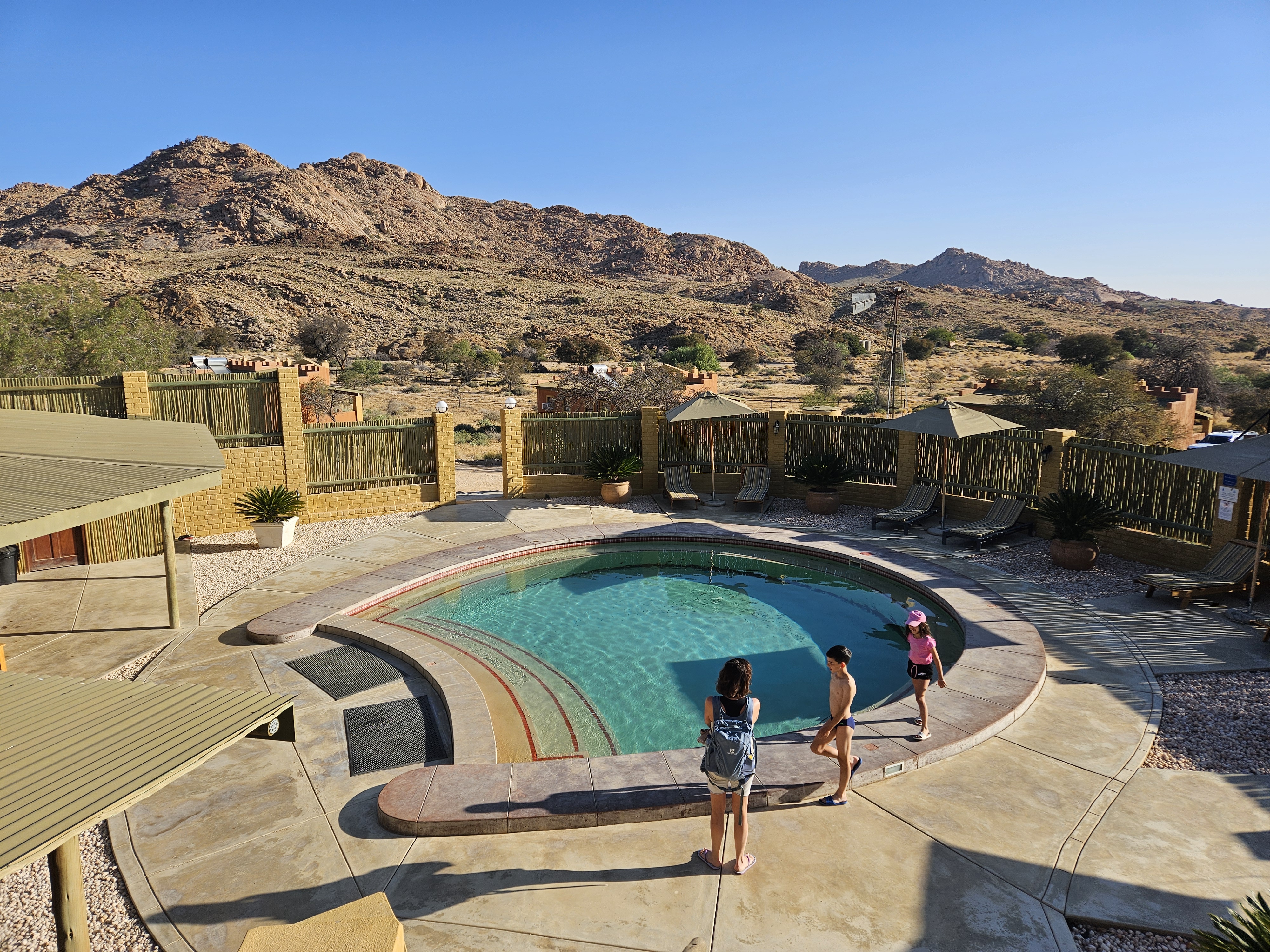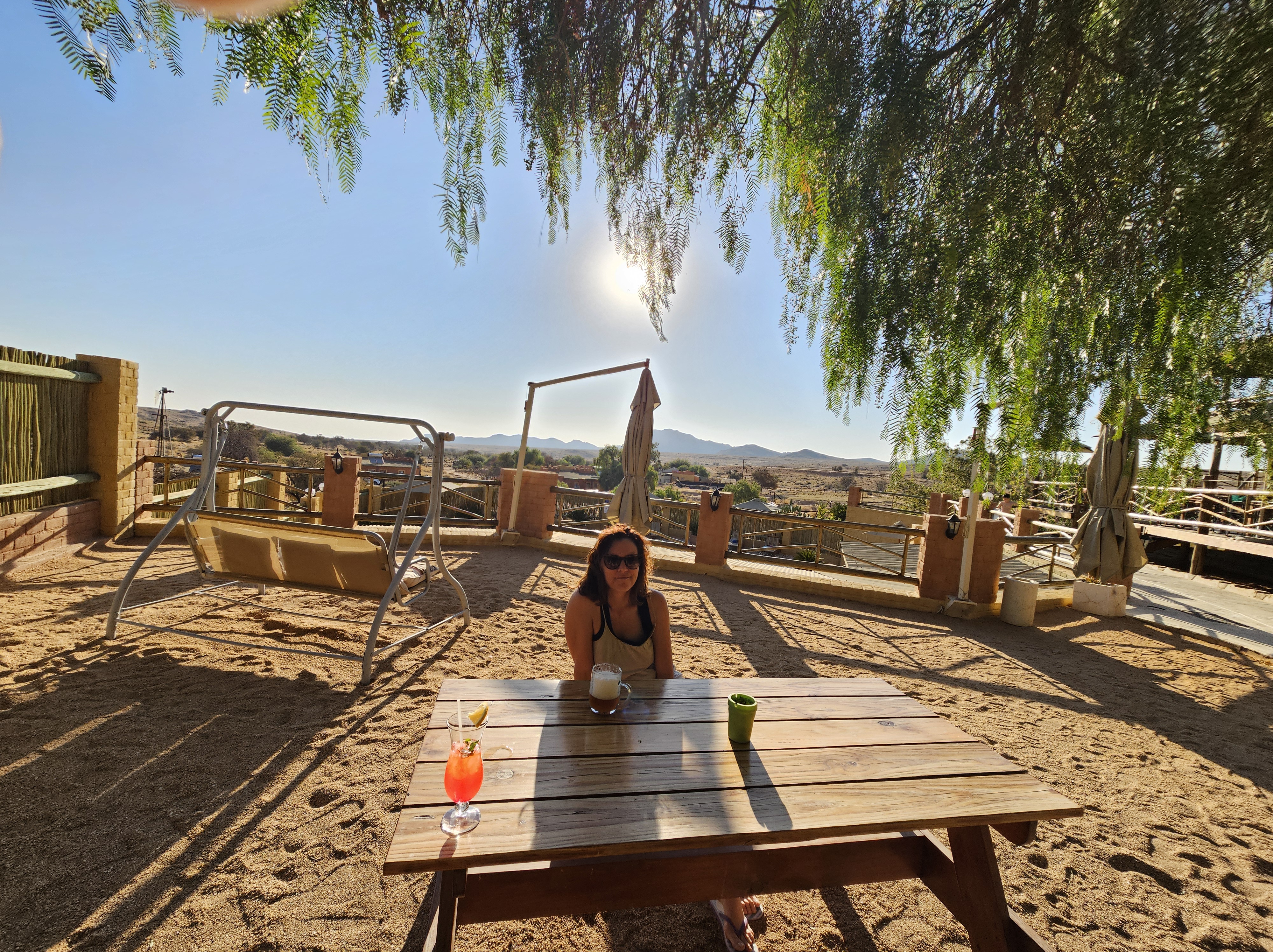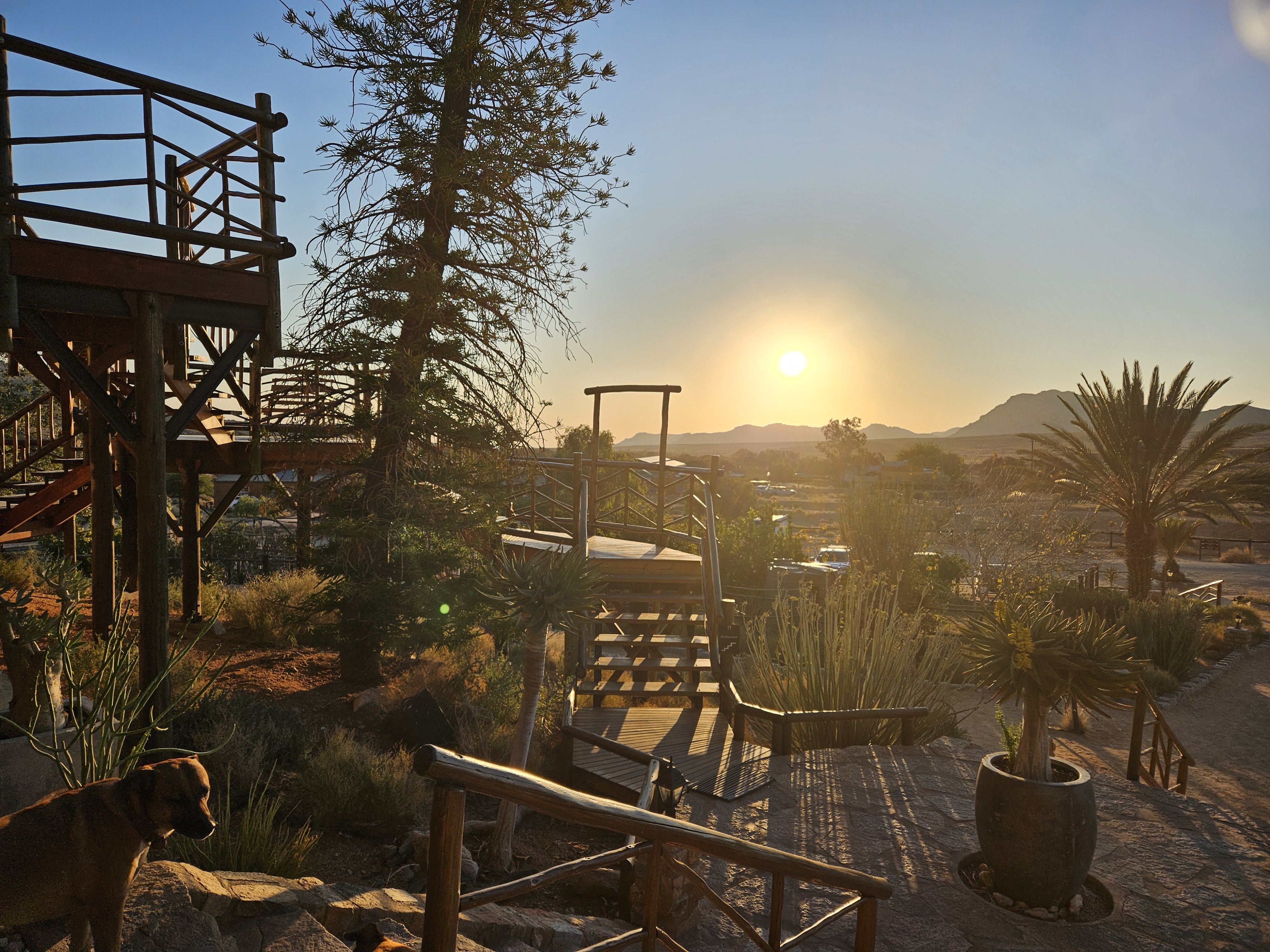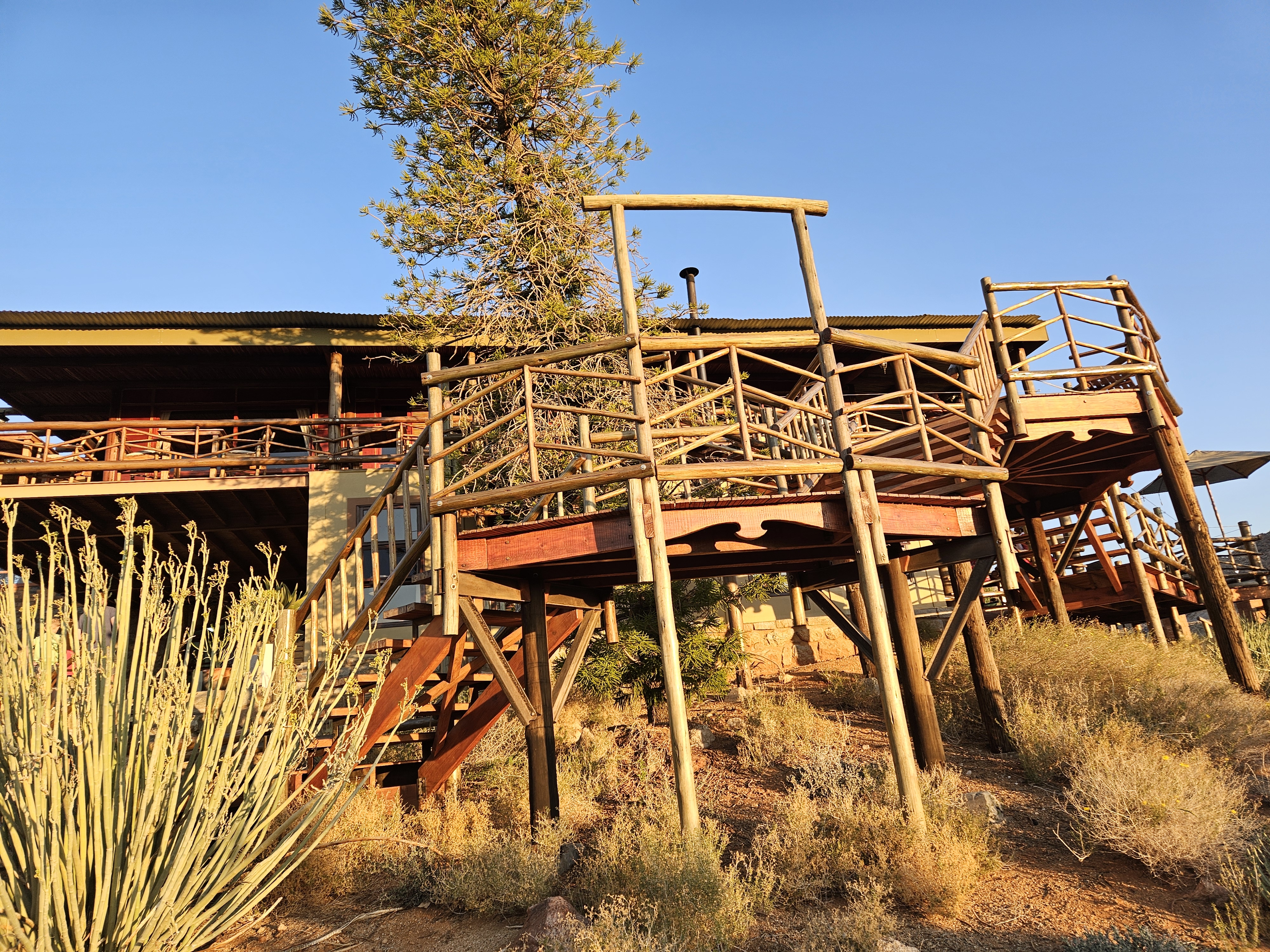 Ma lasciamo la mente dello scrittore vagare nel brodo primordiale del pensiero primigenio e torniamo a noi. Ci concediamo una foto nel punto che segna l’inizio del sentiero verso il fondo del canyon, come per immortalare l’inizio di un percorso mai percorso, e poi torniamo indietro. Sono le 12e30, è ora di andare. Abbiamo tre ore scarse di macchina e oggi vogliamo rilassarci ancora un po’, anche perché l’indomani prevede con ogni probabilità la tappa più pesante del viaggio. Siamo diretti ad Aus, dato che alloggeremo nei paraggi, al Klein Aus Vista Desert Horse Inn, così chiamato perché nei paraggi ci sono pianure popolate da cavalli selvaggi, pronipoti dei cavalli che arrivarono insieme ai coloni tedeschi e che hanno saputo adattarsi e riprodursi in queste terre.