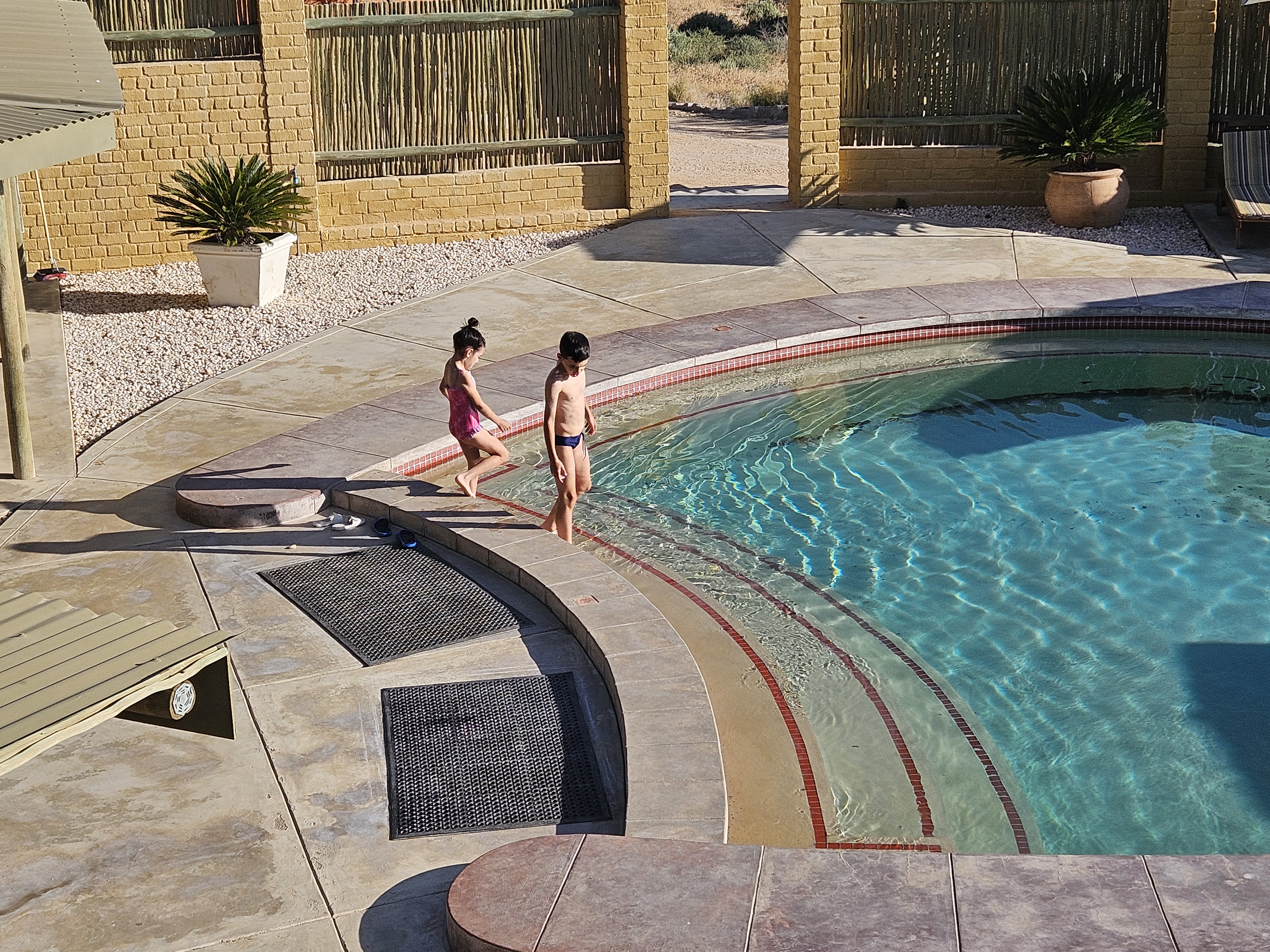 Il Vista Desert Horse sembra un fortino, carico com’è di legno possente e di presunti bastioni difensivi. Lo cingiamo volentieri d’assedio. Il gestore ha un viso da pazzo, alla Malcolm McDowell, ma sembra simpatico. Ci indica un bungalow, dove ci andiamo a rimettere in sesto. I bambini vanno di fretta, e anche noi. Gim e Iri vogliono farsi un tuffo in piscina, mentre io e Franci vogliamo goderci il pomeriggio bevendoci qualcosa di fresco.