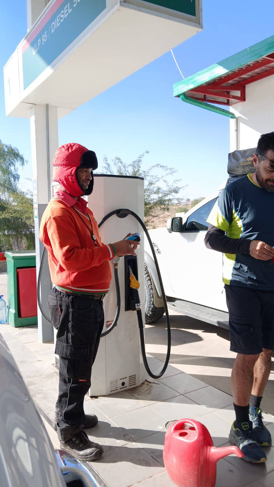 Ci fermiamo presso l’unica stazione funzionante della zona. Si, perché ci siamo resi conto fin dal primo giorno che la Namibia è piena di Ghost Stations, un modo di dire da me coniato che, per l’assonanza con Gas Station, faceva parecchio ridere le persone a cui ne parlavo. Avremo mille difetti, ma noi italiani abbiamo un talento formidabile per le amenità e i giochi di parole. La pompa presso cui ci fermiamo funziona, ma a modo suo. Fuori fa caldo, ma l’addetto indossa un pesante cappello rosso, con tanto di para orecchi. Vai a capire perché.