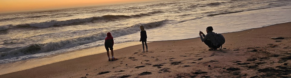 Pochi passi e siamo sul mare. La forza dell’acqua è possente, la spiaggia bella e selvaggia. Tanta gente fa il bagno, cosa che stranamente i nostri bambini, che hanno già assaggiato le acque gelide dell’Atlantico del nord, si astengono dal fare. Il sole rosso fuoco incombe e furoreggia, scende verso la linea dell’orizzonte stendendo i propri raggi fra le onde e tutto intorno. E’ un luogo di pace e relax, che sa di Hemingway. Il frusciare e l’infrangersi del mare sono gli unici elementi sonori disponibili. Ci concediamo piaceri semplici. Gelato per i bimbi, flights di birra per mamma e papà.