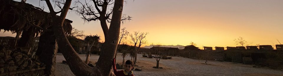 Stiamo entrando nelle terra dei Damara. Arriviamo al Daureb Isib Campsite verso le 17e30. Il luogo è scarico di vegetazione ma ha il suo fascino. E’ un buen retiro più che gradito dopo il travaglio patito. Anzi è il più bel luogo al mondo, sito alla fine di uno sforzo cosmico. Parcheggiamo, tiriamo fuori i bagagli. Sono fiero di aver portato la mia famiglia a destinazione in sicurezza e rispettando il piano di viaggio. E’ il momento di riposarmi. Stendermi sulle lenzuola candide e pulite è un piacere profondo, difficile da descrivere. E’ un brivido lieve che percorre il corpo da cima a fondo, un formicolio elettrizzante che mi rilassa solo in parte, concedendomi un sonno breve e leggero, ma significativo.