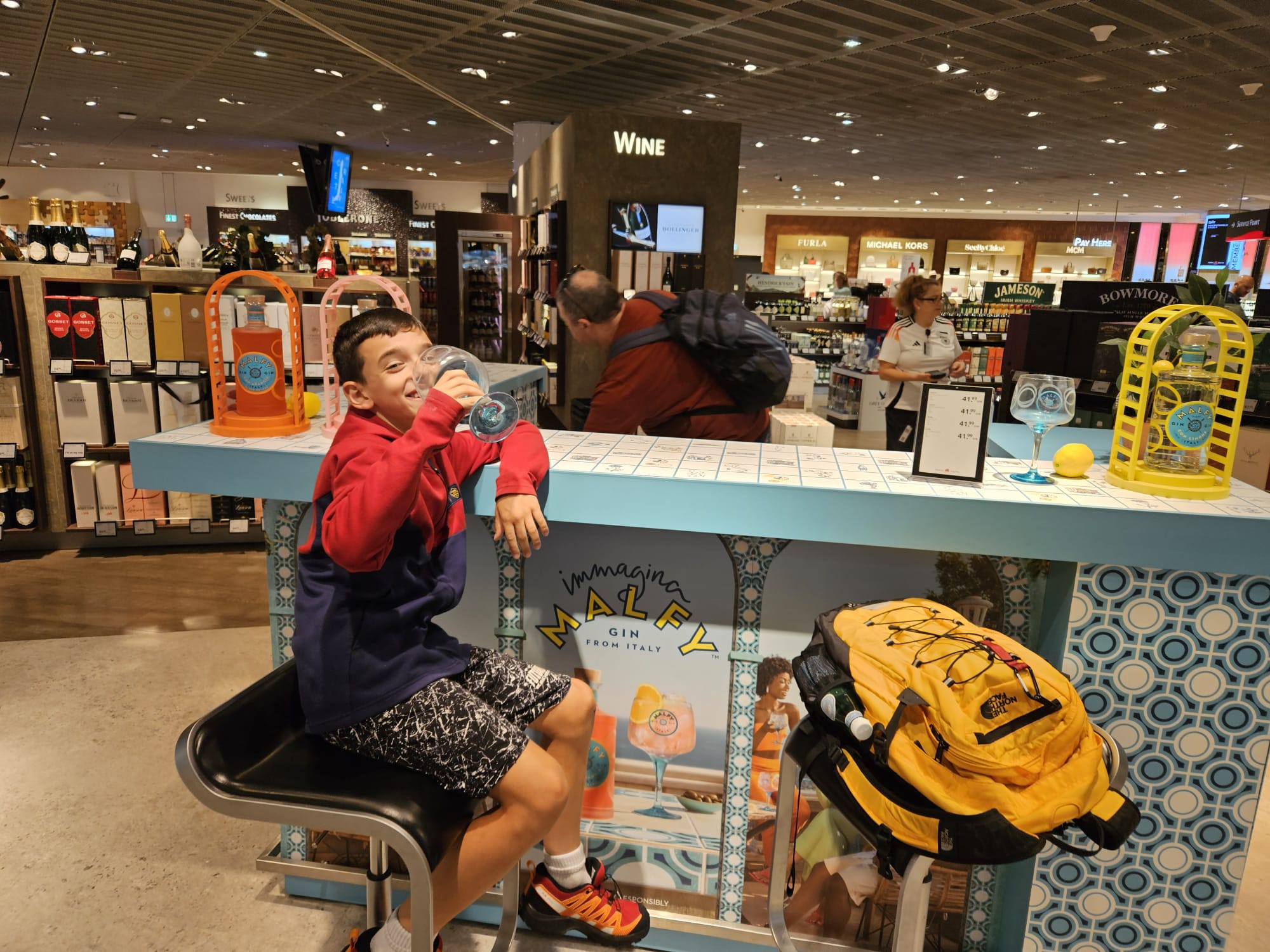 I miei vanno al bagno, io corro al bar a bermi una birra, che quasi mi strozzo in gola per decomprimere il terrore vissuto nell’ultima mezzora. Ci calmiamo, siamo felici, ma i bambini fanno più storie del solito. Irene non trova pace, probabilmente abbiamo un accumulo di stress e stanchezza sulle spalle da smaltire. Comunque, partiamo, l’imbarco è lento e comporta un ritardo: ritrovare uno slot utile per il decollo implica un’ora di attesa a bordo. Niente di grave per noi, mentre altri viaggiatori sono praticamente certi di aver perso la coincidenza a Francoforte.