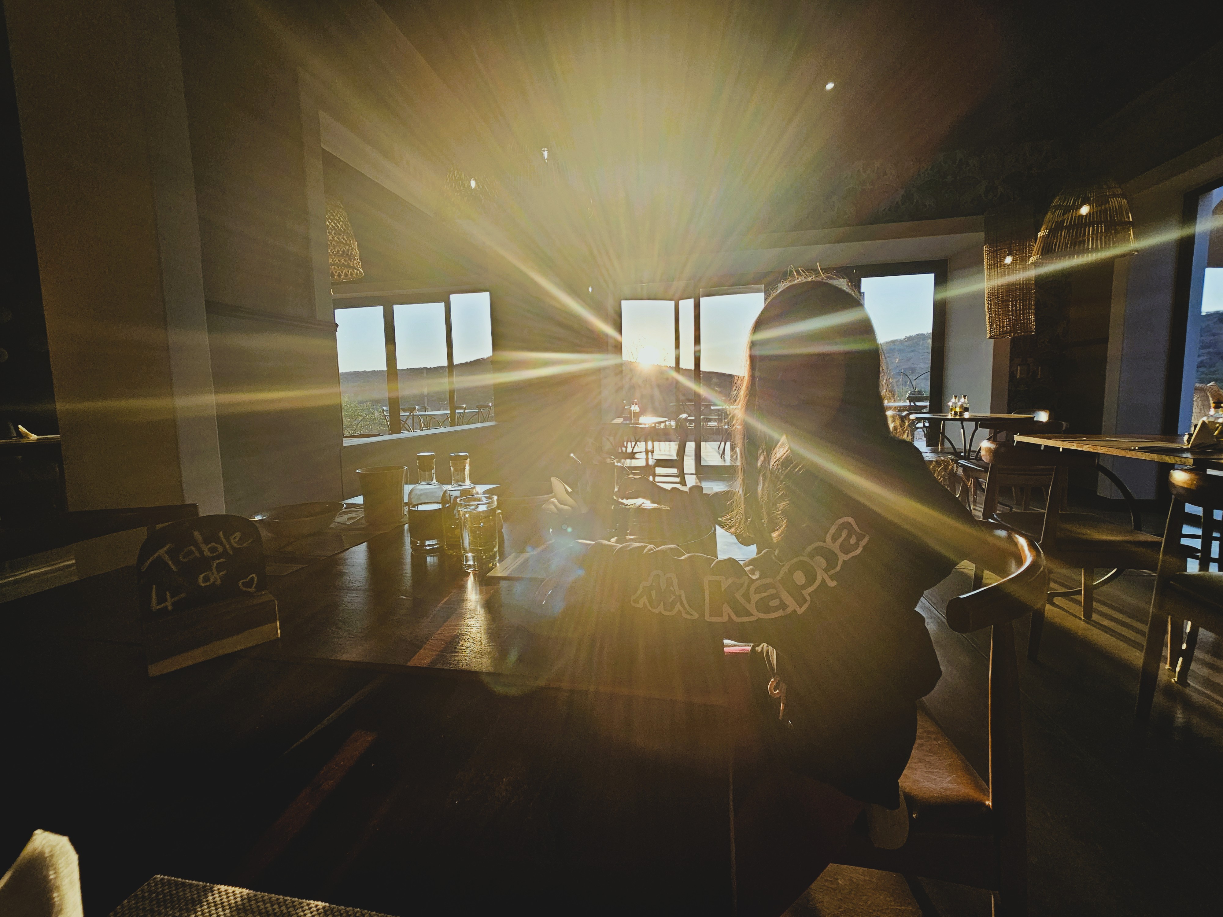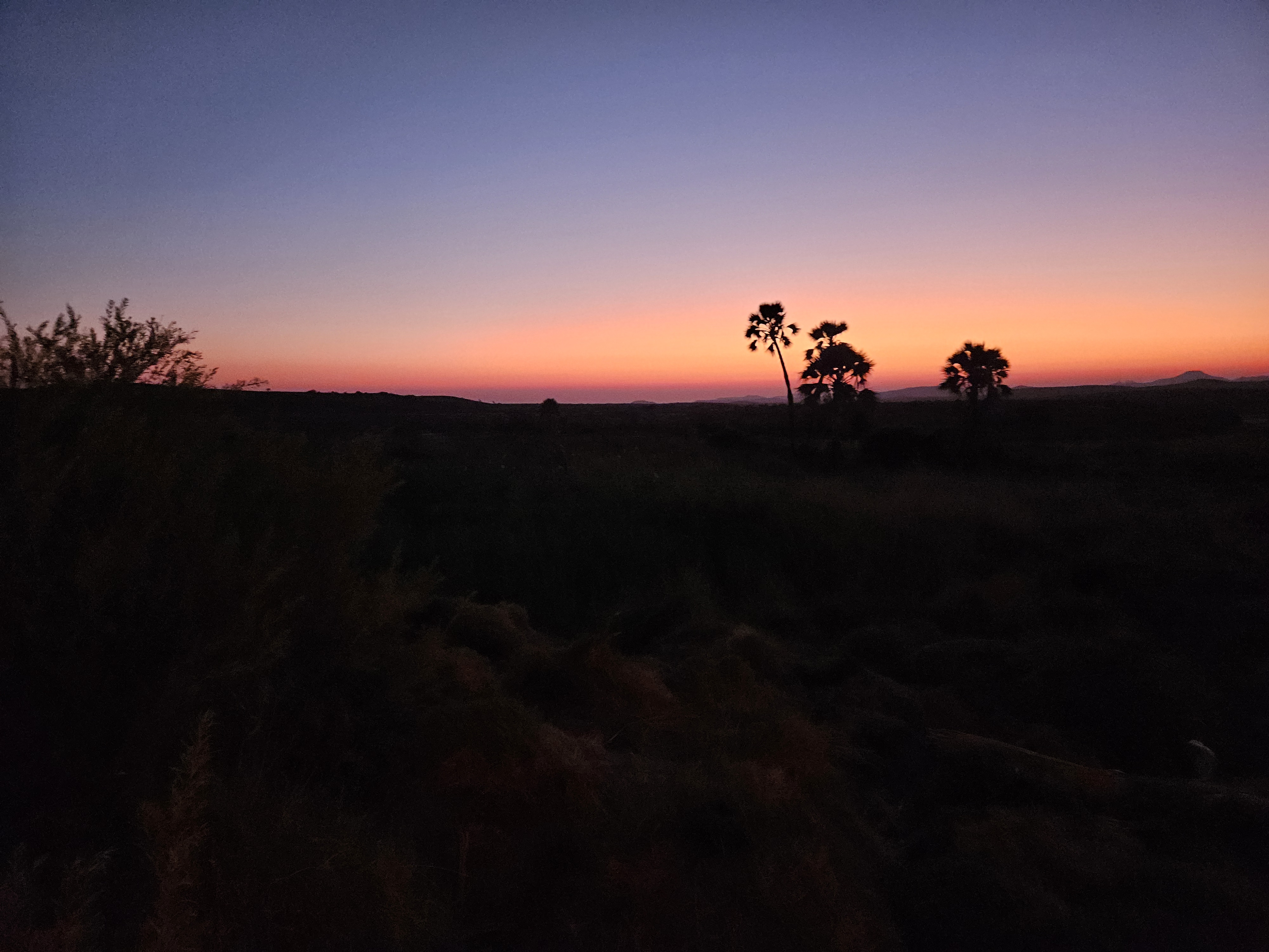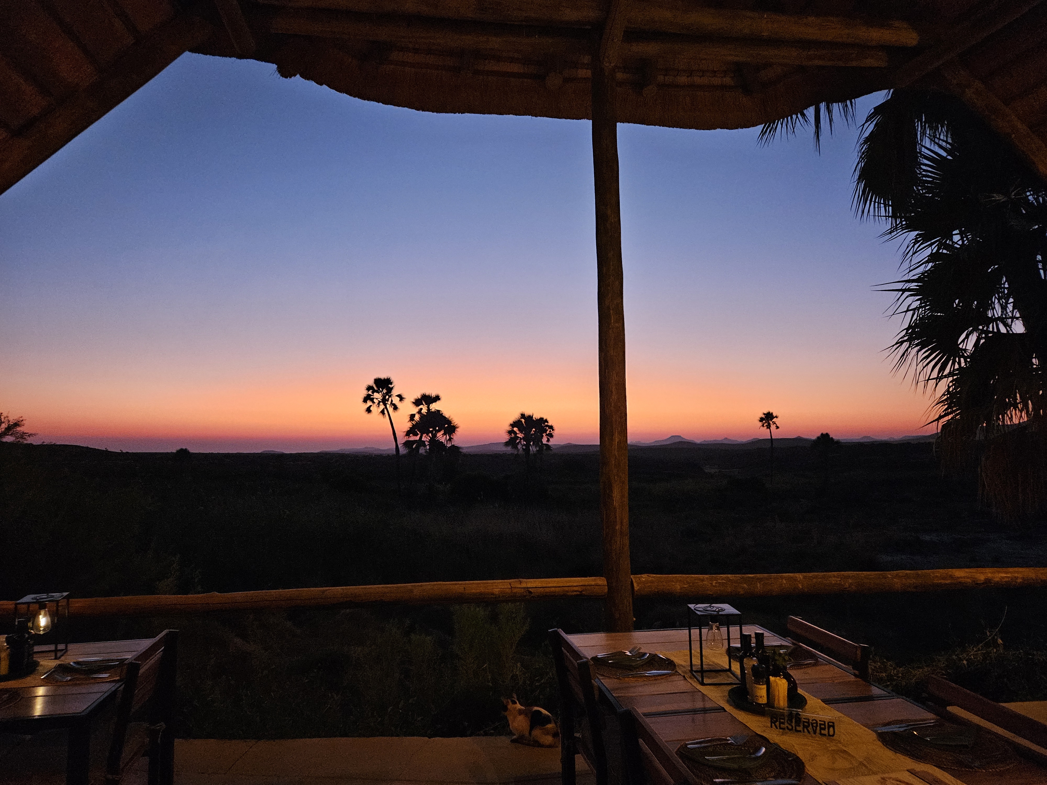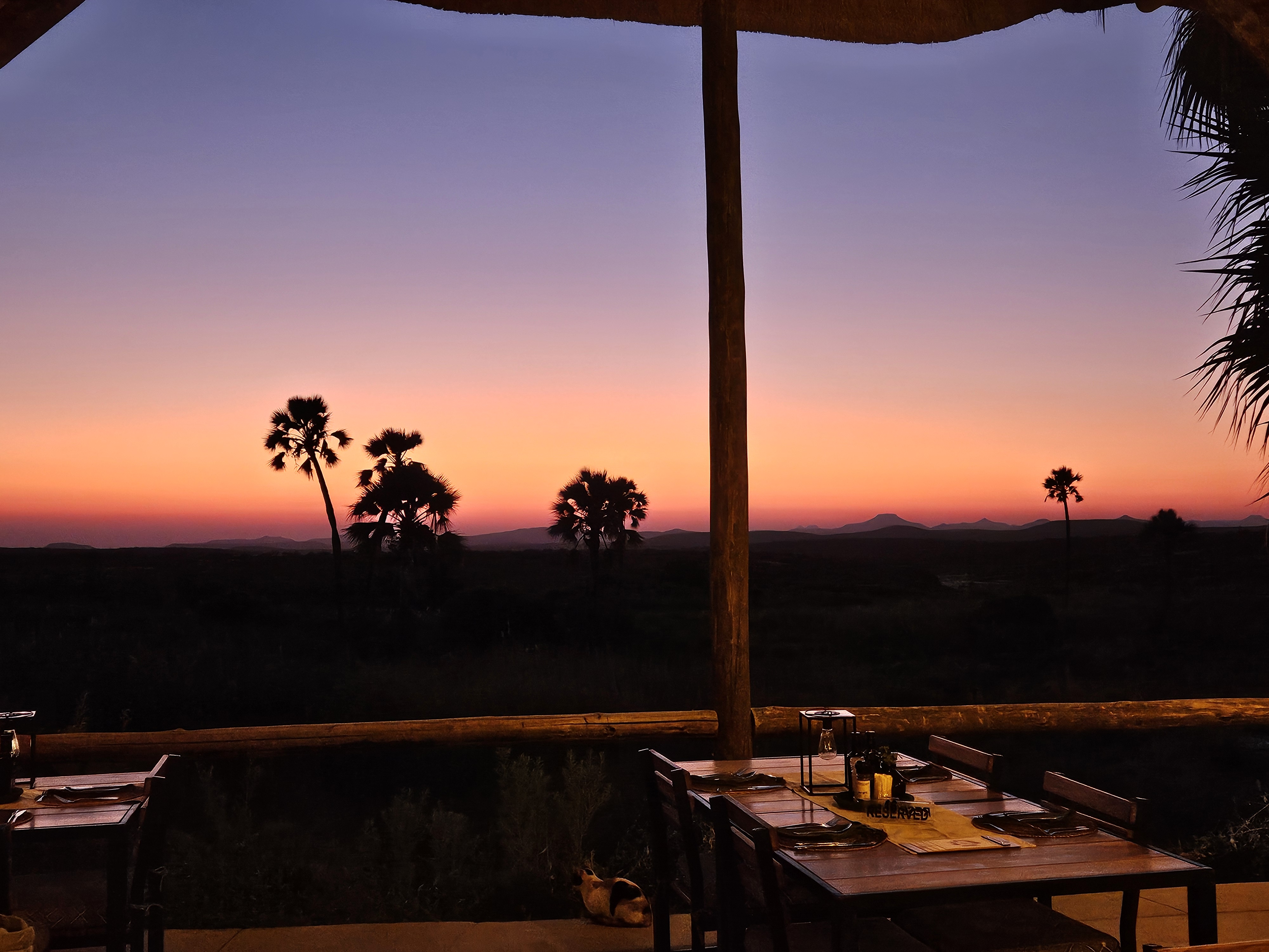 Ci diamo una ripulita e andiamo verso il ristorante. Ceniamo in una bella terrazza in legno, affacciata sul tramonto del Kunene. Abbiamo davanti un’Africa diversa adesso, più verde e misteriosa. Ci immergiamo nel caos cromatico crepuscolare della zona torrida. In dieci giorni non avevamo mai visto una vegetazione tanto densa. Le palme aggiungono un tocco esotico al contesto: sembra di essere Altrove per l’ennesima volta, rispetto a ieri, rispetto a una settimana fa, rispetto a ogni momento vissuto.