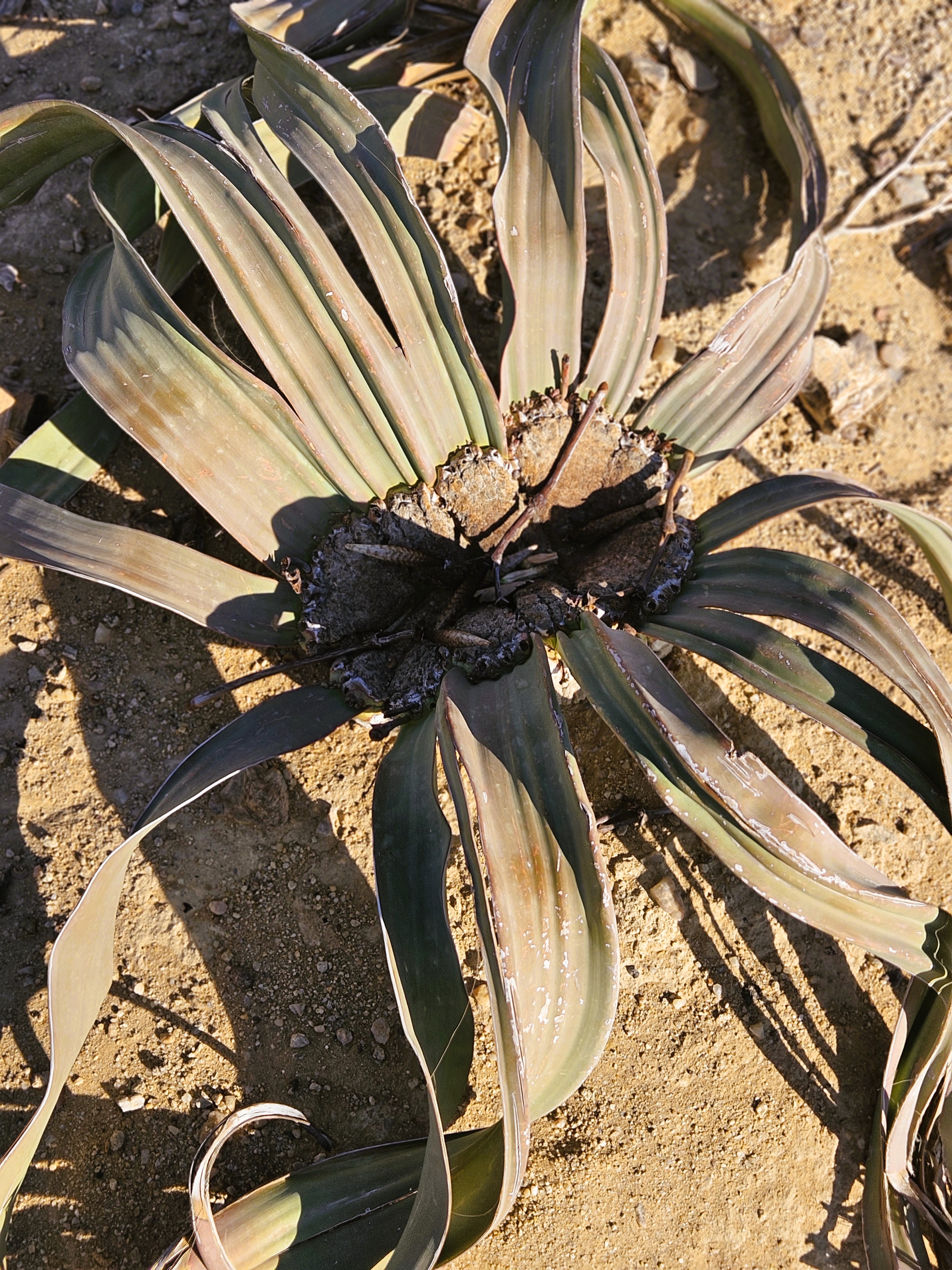 Qui abbiamo anche l’opportunità di osservare da vicino la Welwitschia Mirabilis, una pianta straordinaria, un organismo talmente antico da essere considerato un fossile vivente. Essa è uno dei simboli della Namibia: è infatti raffigurata nello stemma nazionale, per via della sua longevità e della sua tenace resistenza all’ambiente arido e alle condizioni avverse di un deserto che la bracca e cinge d’assedio da ogni dove. Alcuni esemplari di Welwitschia vivono su questa terra da migliaia di anni, e sono annoverabili fra gli esseri viventi più vecchi al mondo. Le foglie che la caratterizzano si snodano contorte ai lati del tronco tozzo che ne costituisce il cuore. La pianta si nutre grazie a una radice profonda e alla nebbia carica dell’umidità dell’oceano. Un capolavoro di ingegneria naturale.