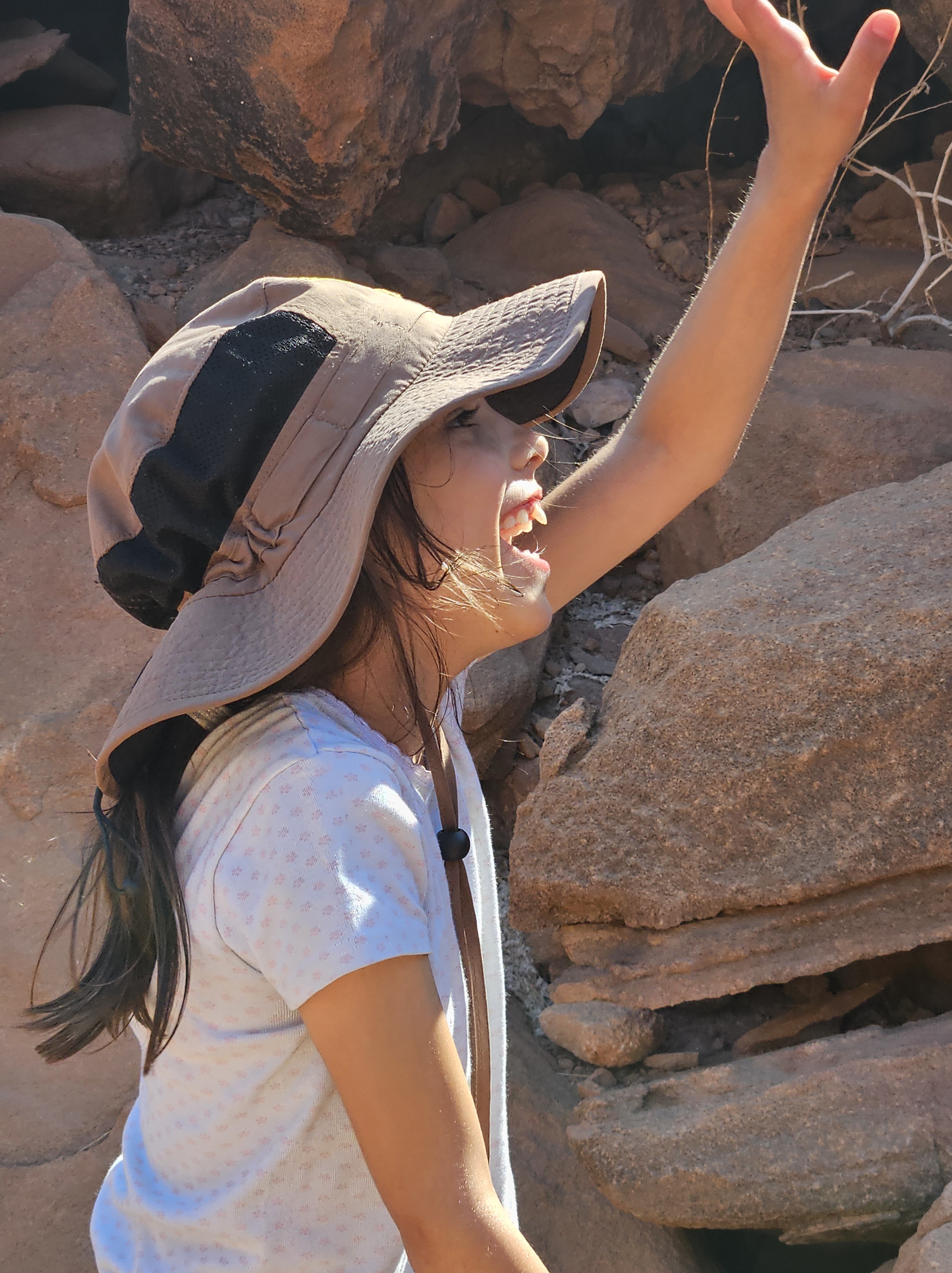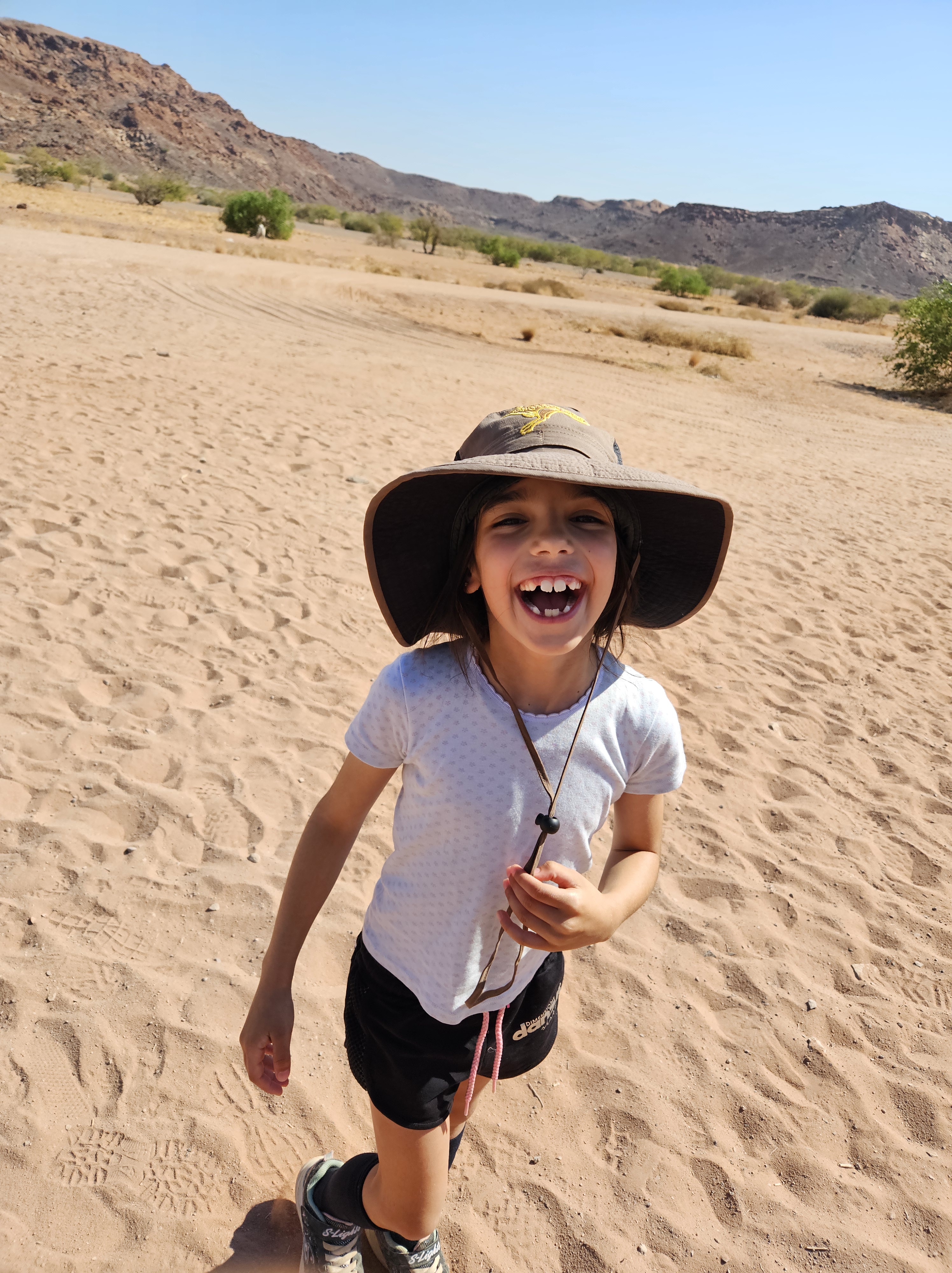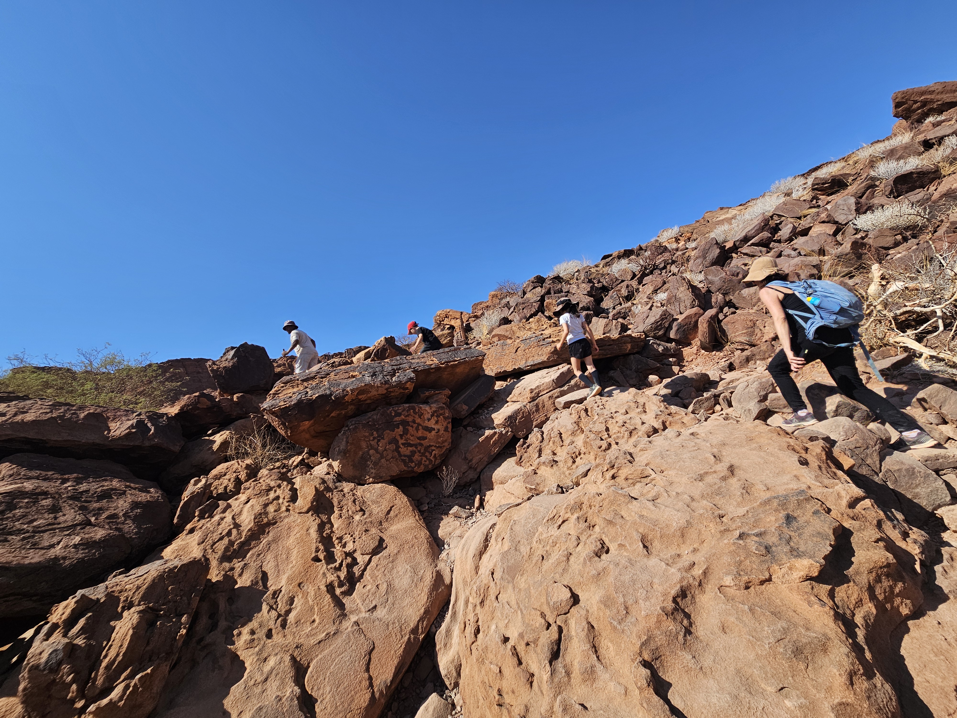 Il sole adesso inizia a picchiare forte ma il clima resta secco e gradevole. Le incisioni rupestri di Twyfelfontein sono state realizzate dagli antenati dei San, un popolo di cacciatori-raccoglitori che viveva nella zona. Queste incisioni, che raffigurano animali, figure umane e simboli risalenti a oltre 1000 anni fa, sono considerate fra le più importanti collezioni di arte rupestre in Africa. In certi casi gli animali vengono raffigurati vicino alle proprie impronte, come se si trattasse di una sorta di mappatura delle specie utile a collegare un dato animale alle tracce lasciate sul terreno. Chissà che non servisse a educare i più giovani? E’ una passeggiata molto gradevole, in cui Irene, che si era svegliata con un piglio positivo e travolgente, inizia a dare piccoli segnali di cedimento e follia. Ciò verrà confermato dalle performance attoriali nelle ore successive.