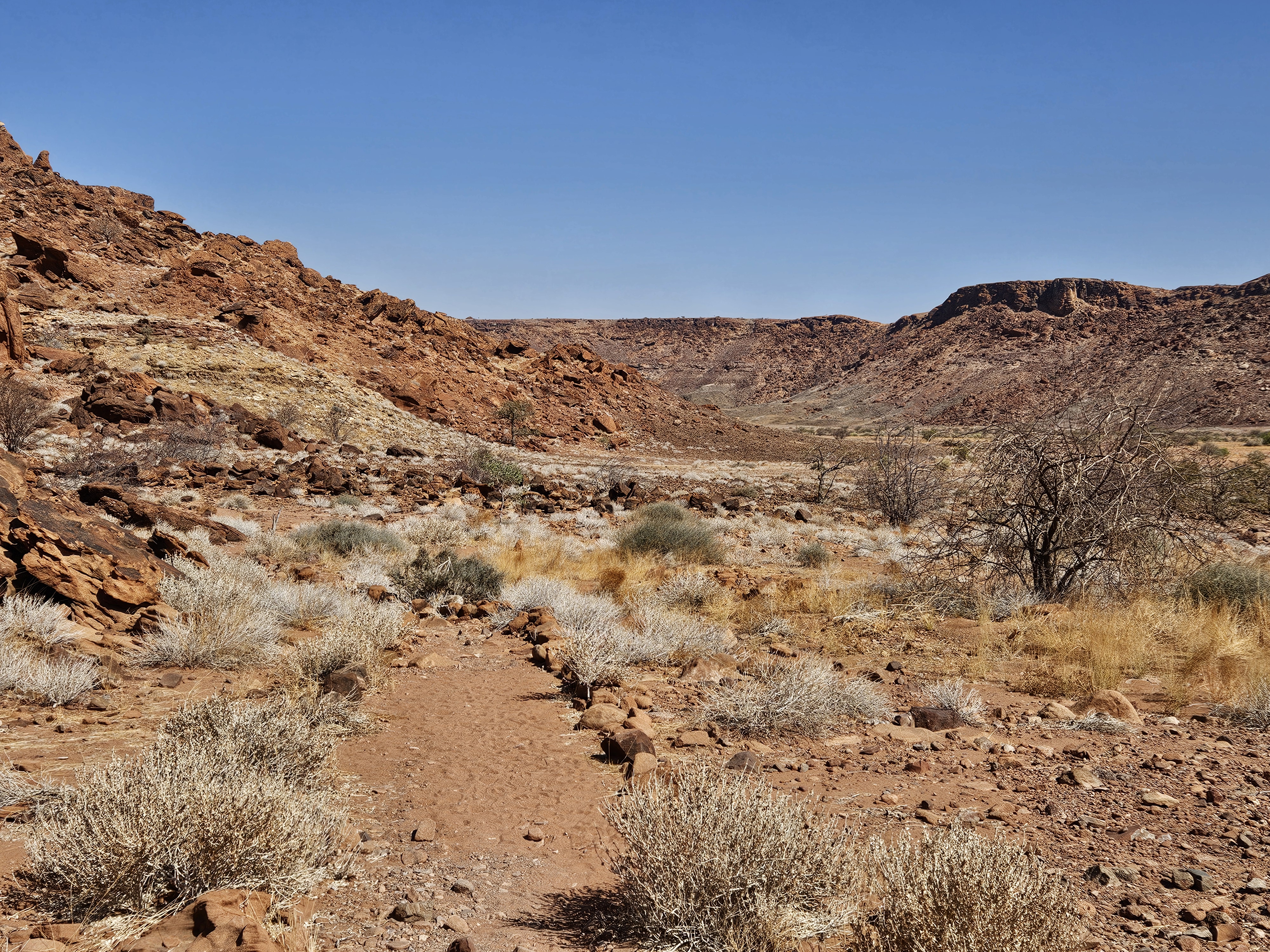 La prossima tappa è la vallata di Twyfelfontein. Dopo un breve tratto di C39 svoltiamo a sinistra per la D2612, che si rivela ben presto insidiosa. E’ una strada di terra e pietra, modulata su più livelli paralleli molto stretti, e con lastricati taglienti che impongono ben più di una preoccupazione. Più ci avviciniamo alla meta e più la strada diventa impraticabile. Mi sposto a destra, a sinistra, poi sopra e sotto per trovare la via migliore. Ma non c’è scampo. A un certo punto una jeep del parco mi sorpassa a velocità sconsiderata. Arriviamo a destinazione tirando un sospiro di sollievo.