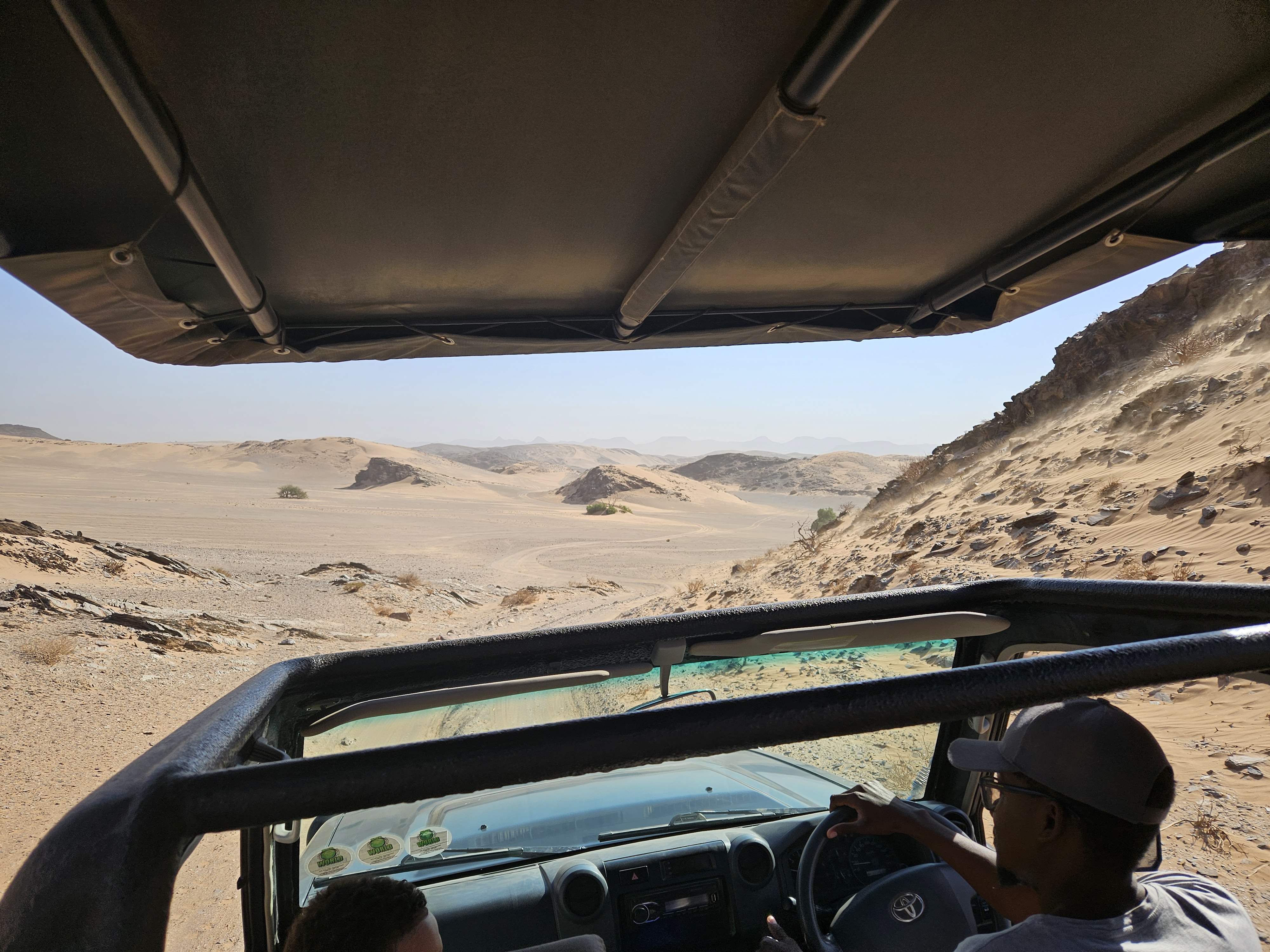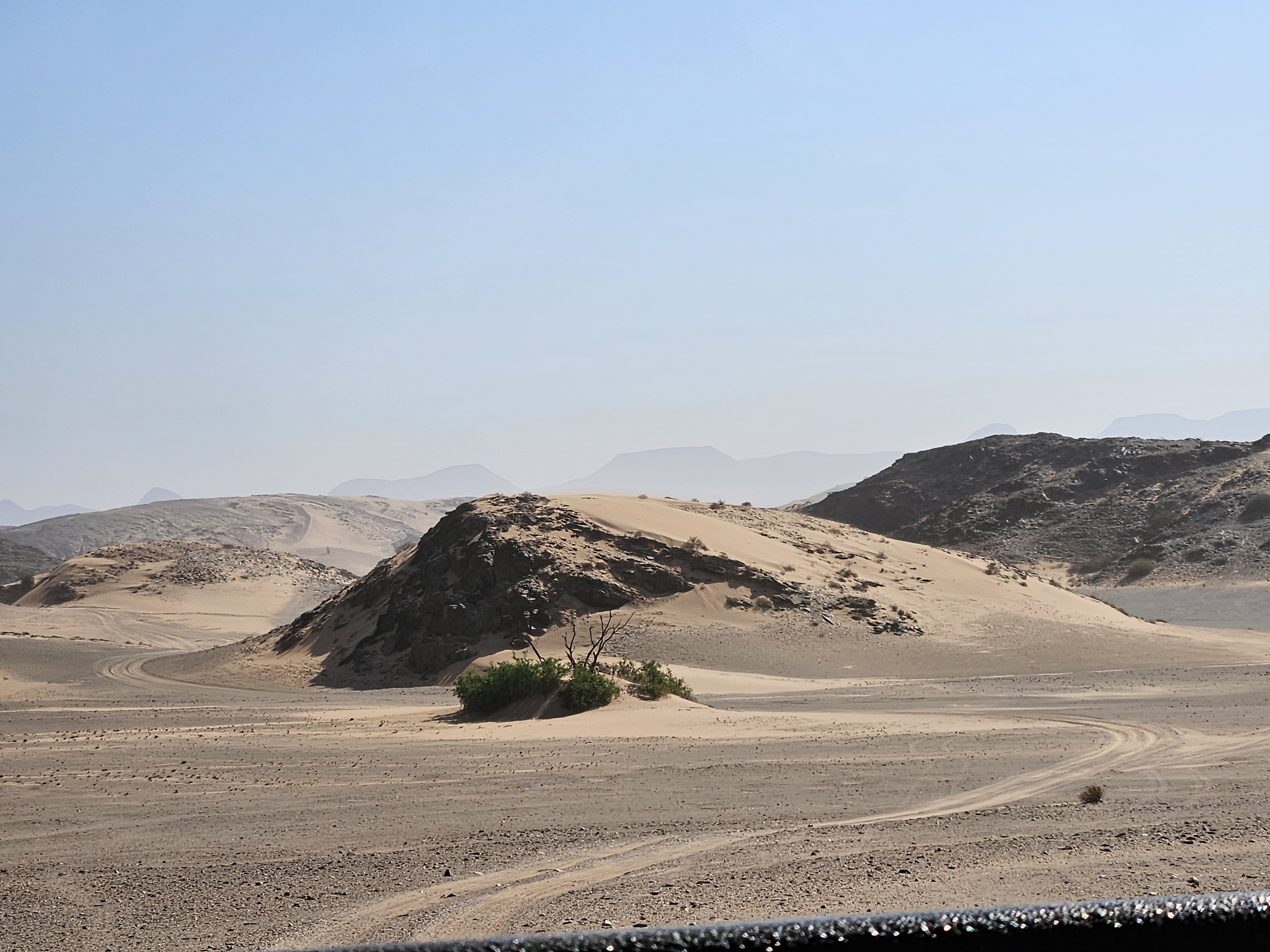 Osserviamo ancora un po’ la famigliola compatta e poi filiamo via. Sarei rimasto a lungo ad osservarli, ma la strada da fare è tanta. Il nostro mezzo inizia a dare qualche segnale di malfunzionamento fra le dune. Piccoli colpi di tosse. Il giovane namibiano scende, da un occhio al motore, controlla il telefono, ma non c’è campo e ripartiamo. Mad Max si dimostra abile e rapido su un terreno totalmente dissestato. Procediamo a grandi passi, subendo anche meno il vento in questa direzione. Risaliamo la vasta conca e torniamo nella parte più guidabile.