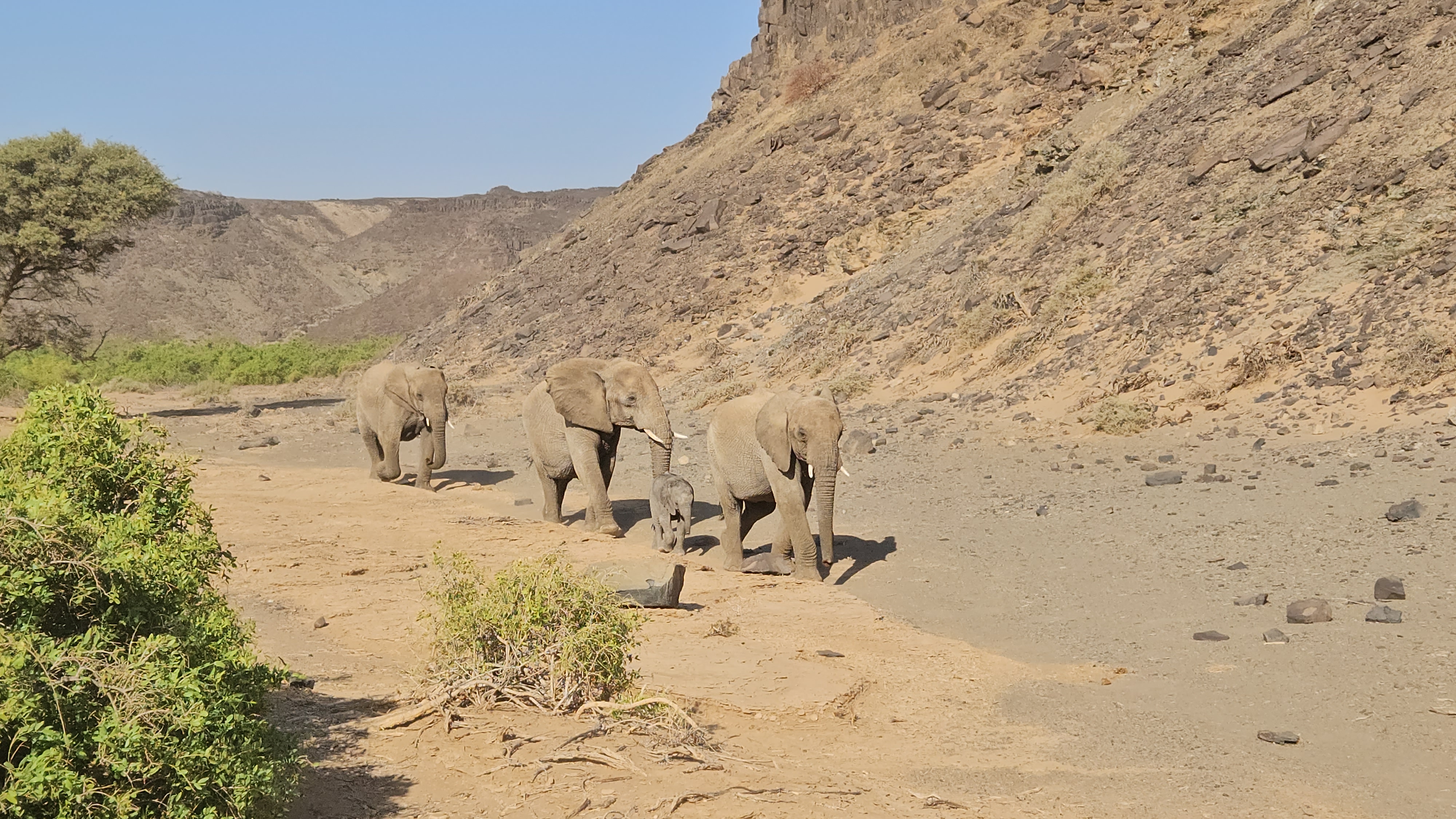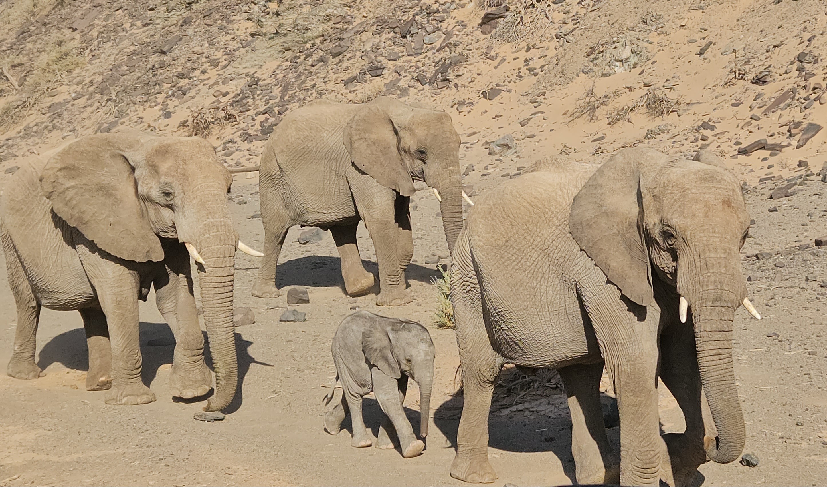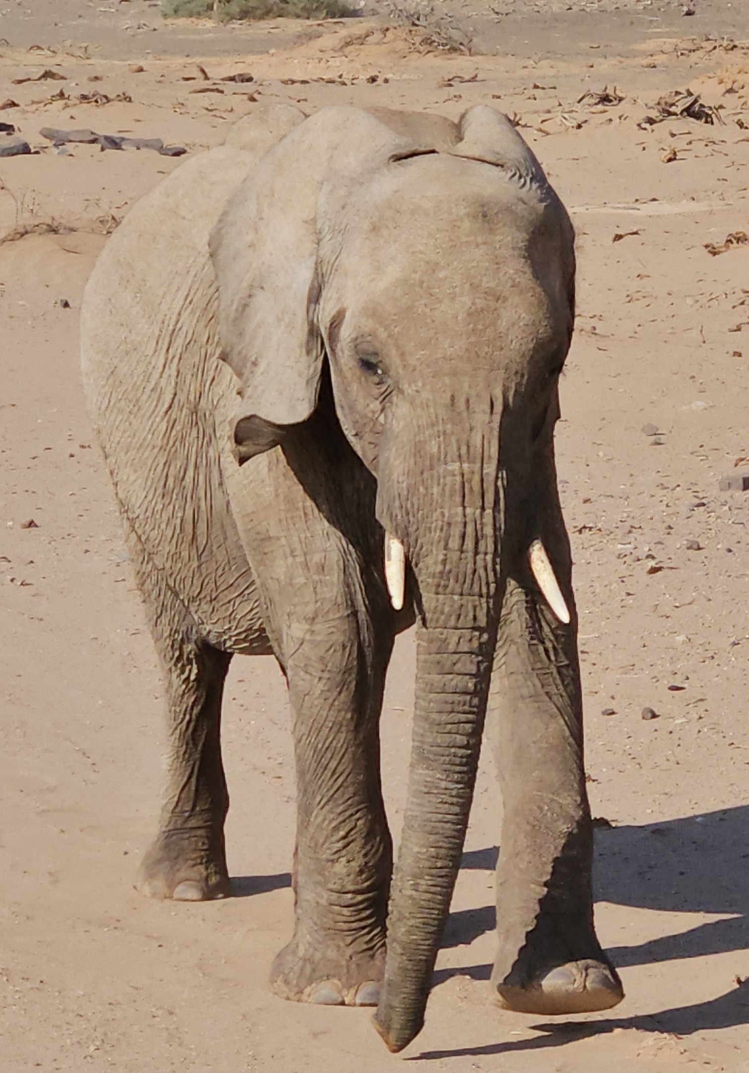 Accanto all’autista c’è un ragazzino di 10 anni al massimo. E’ un bimbo sveglio, che credo dia una mano al driver ad individuare gli animali di cui siamo in cerca. Girovaghiamo in mezzo al deserto entrando e uscendo da piccole alture circondate da arbusti, in cerca del giusto punto di avvistamento. Dopo pochi minuti notiamo i primi esemplari. E’ un gruppo di 4-5 elefanti. Sono a pochi metri da noi, e l’emozione di vedere da vicino e in libertà questi animali meravigliosi è unica.