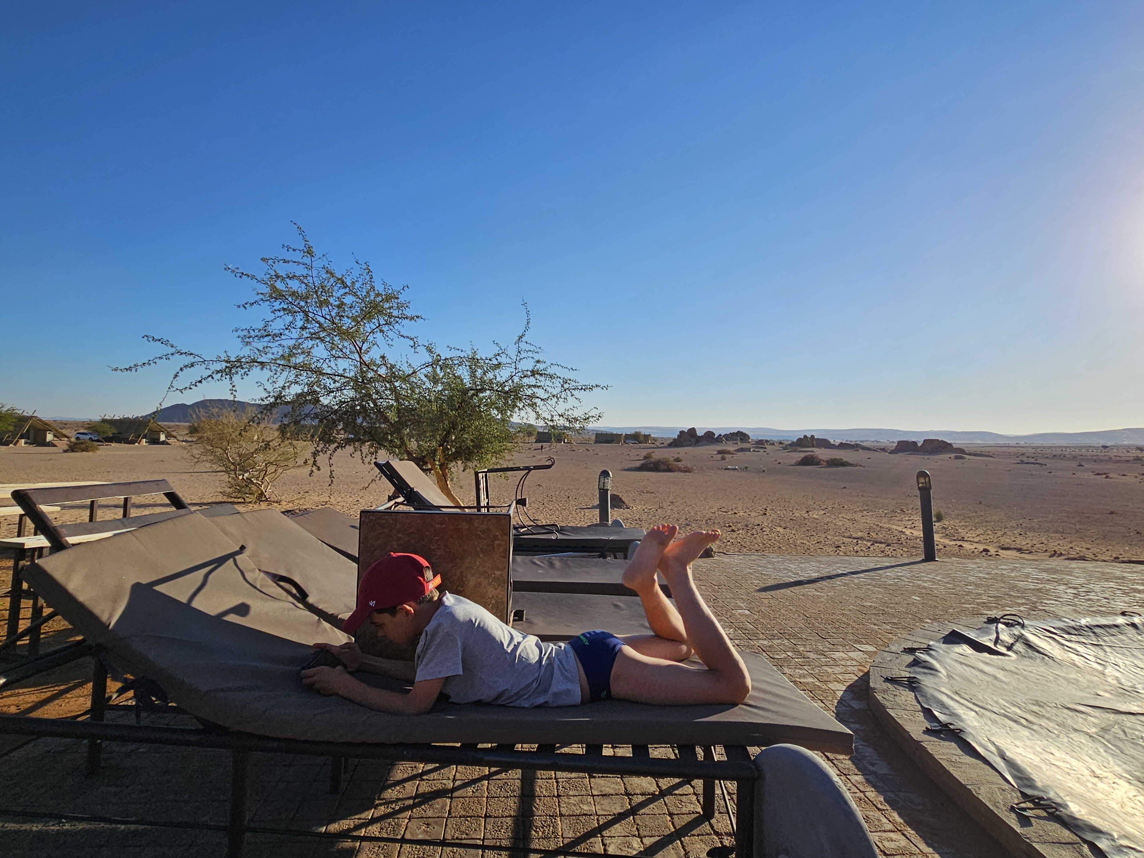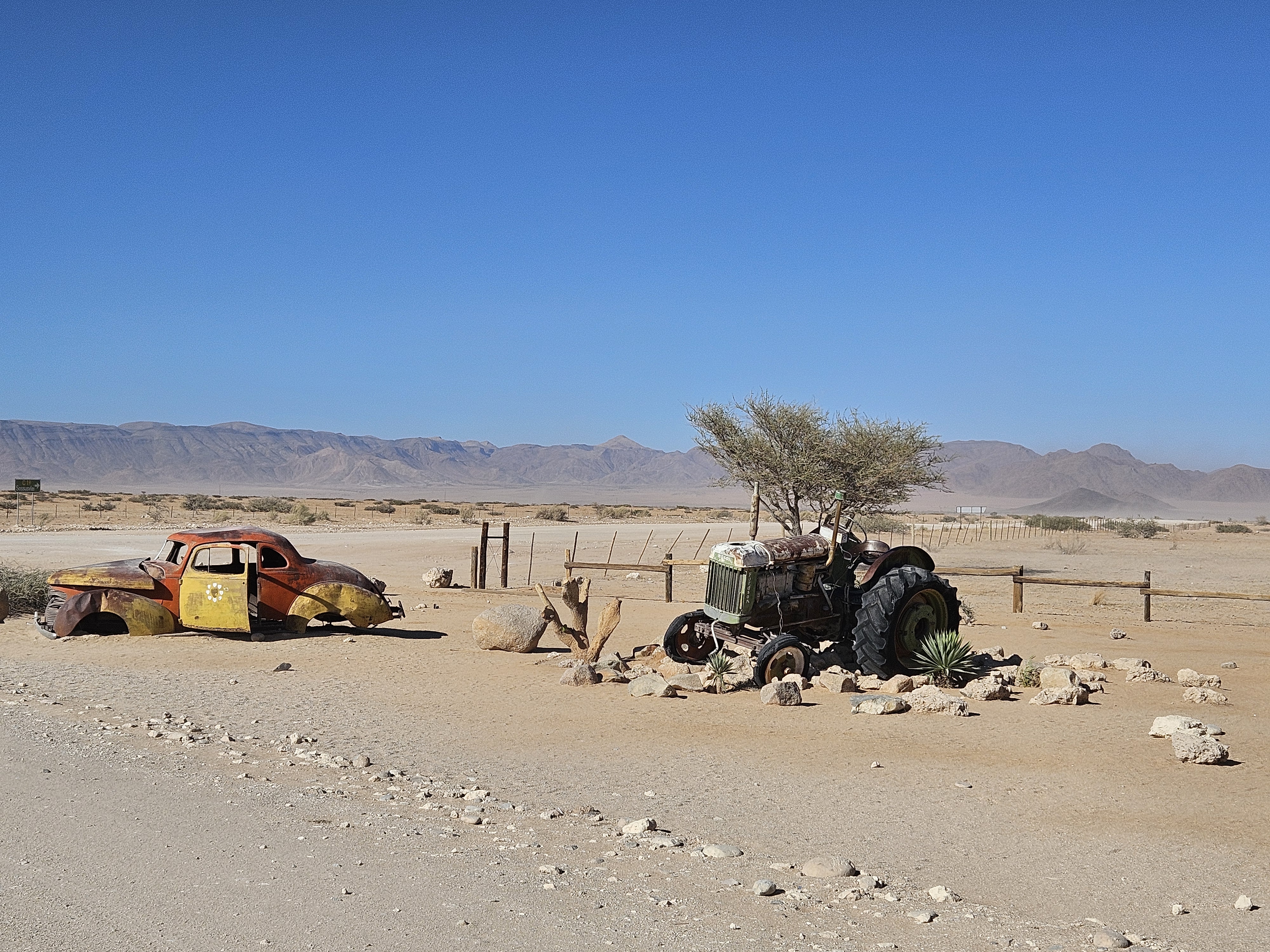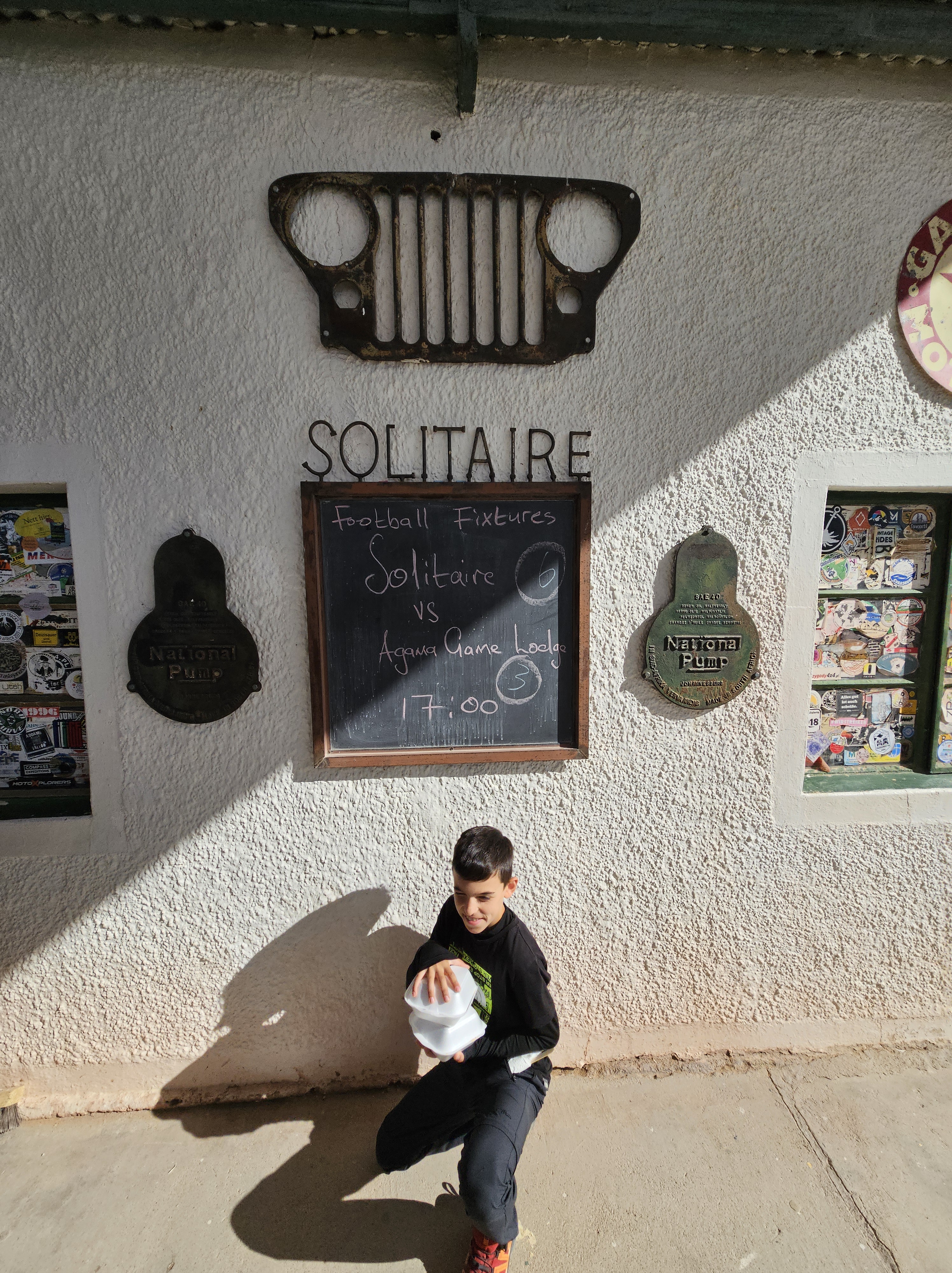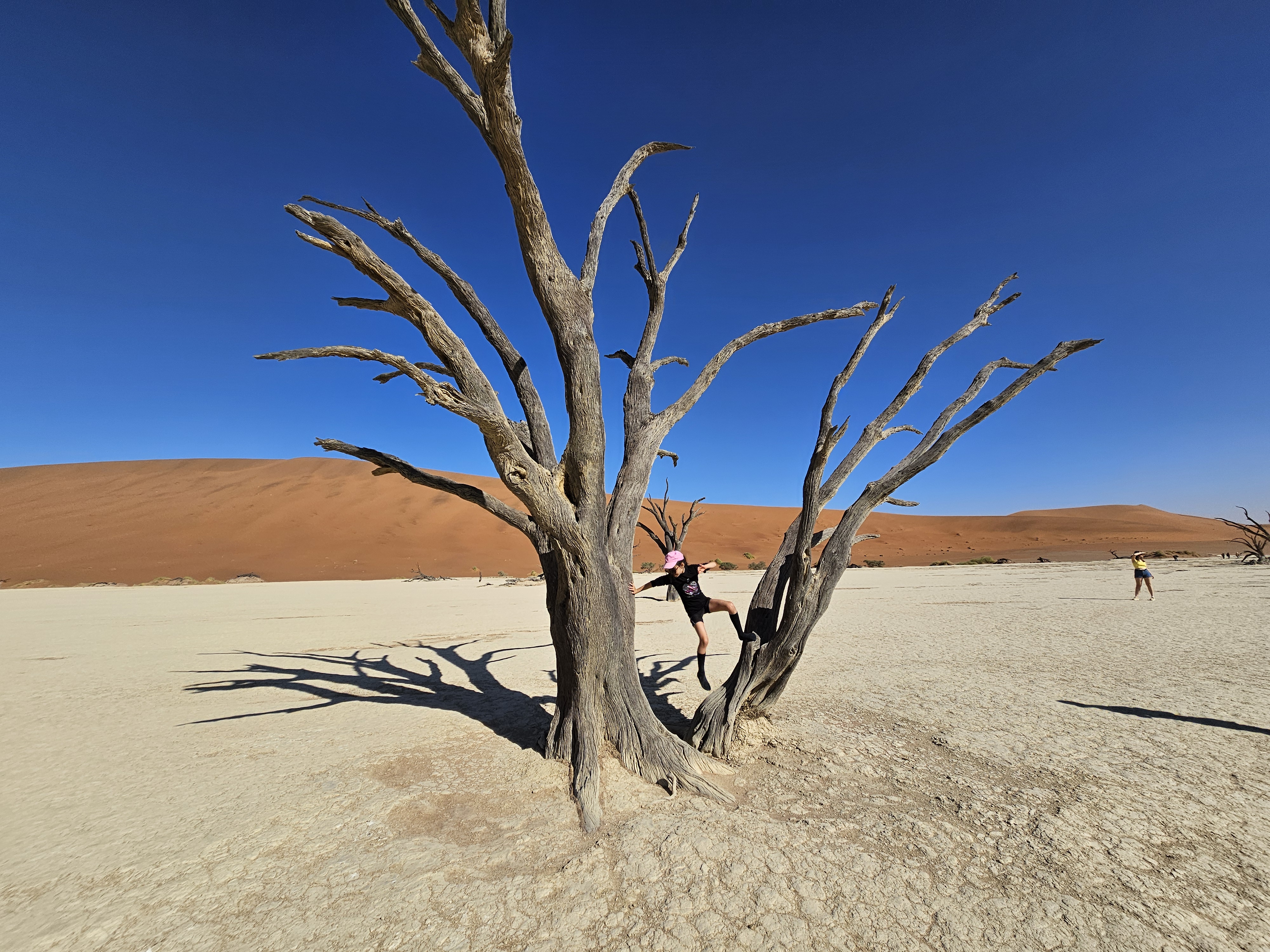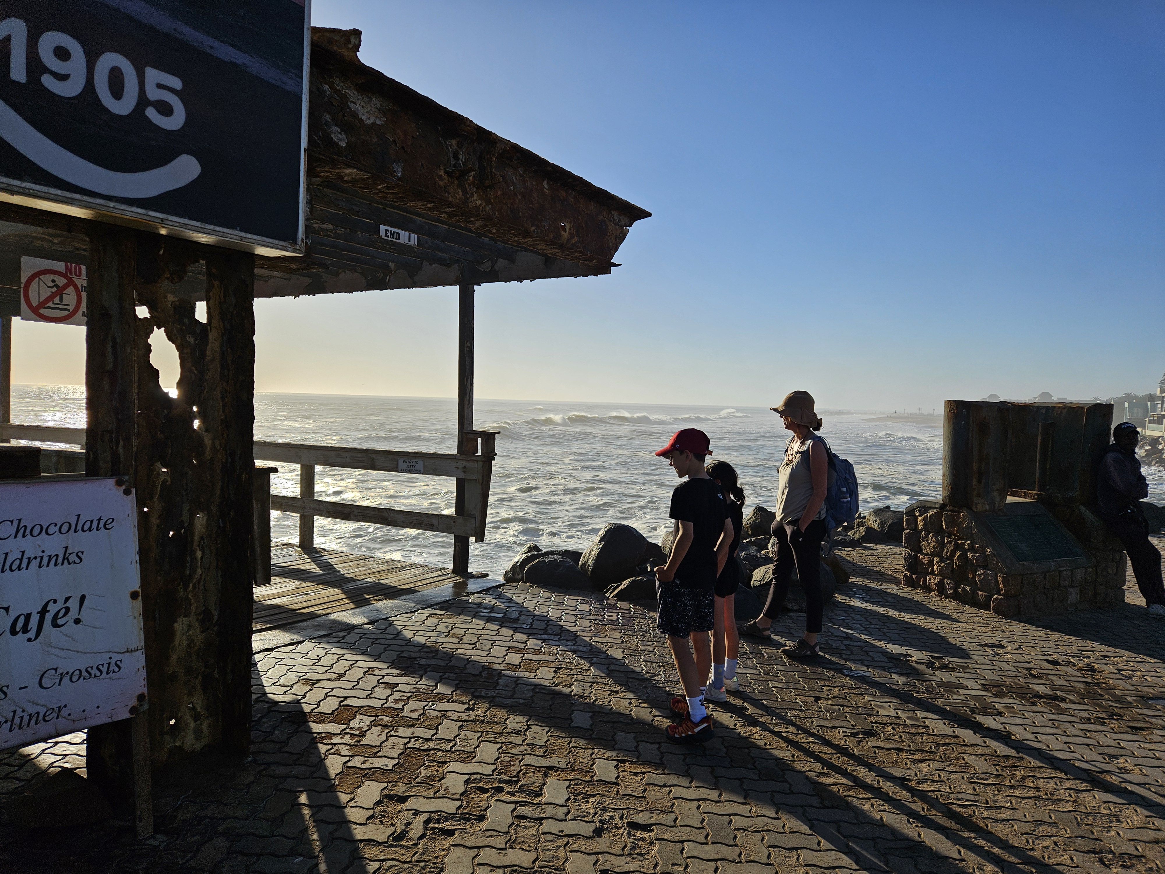Ci fermiamo in prossimità di un cartello di legno che sancisce l’ingresso al Namib Naukluft Park. Penso al fatto che il giorno prima eravamo nello stesso parco, a cavallo delle dune che si trovano nell’entroterra, a centinaia di km da lì, e a quanto sia esteso quel deserto immane. La sosta serve per bere una bibita e per adunarsi. Una graziosa bimba francese si avvicina ai miei e subito scatta l’intesa istintiva che spesso sboccia fra ragazzini: privi come sono delle sovrastrutture tipiche del mondo dei grandi, i bambini hanno una predisposizione naturale a instaurare una concordanza tale da vanificare ogni barriera linguistica.