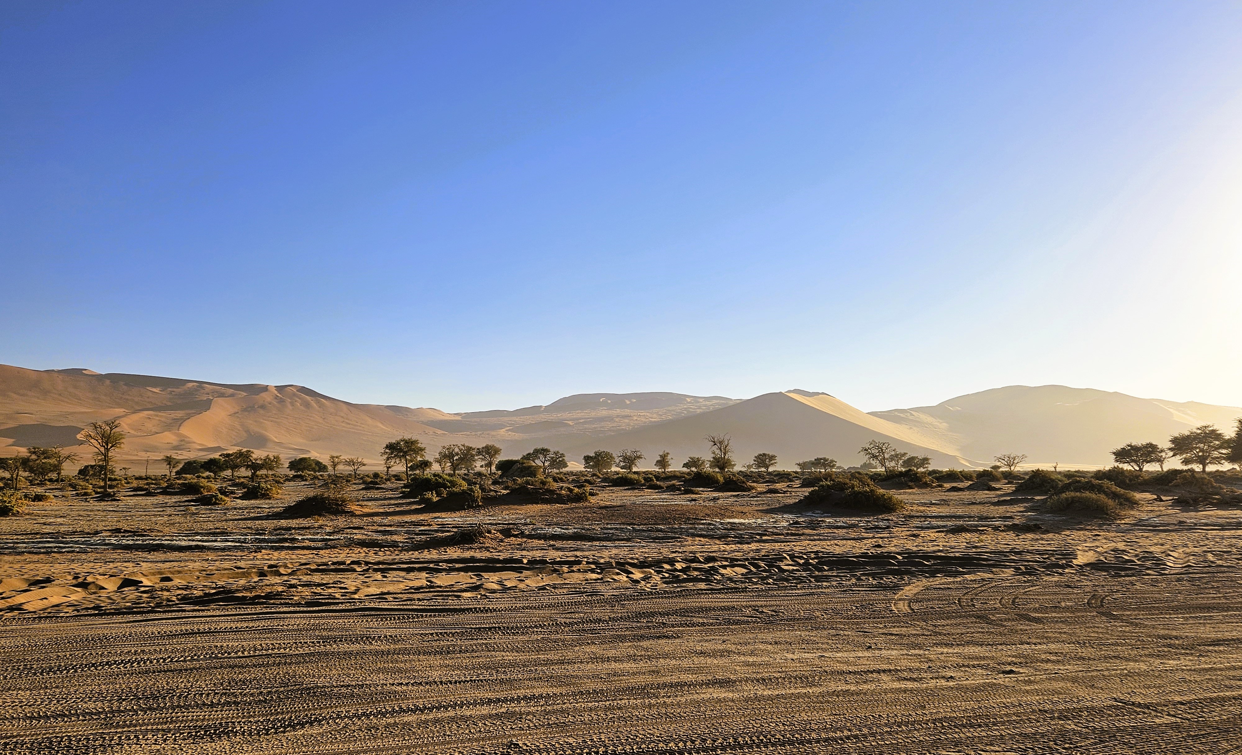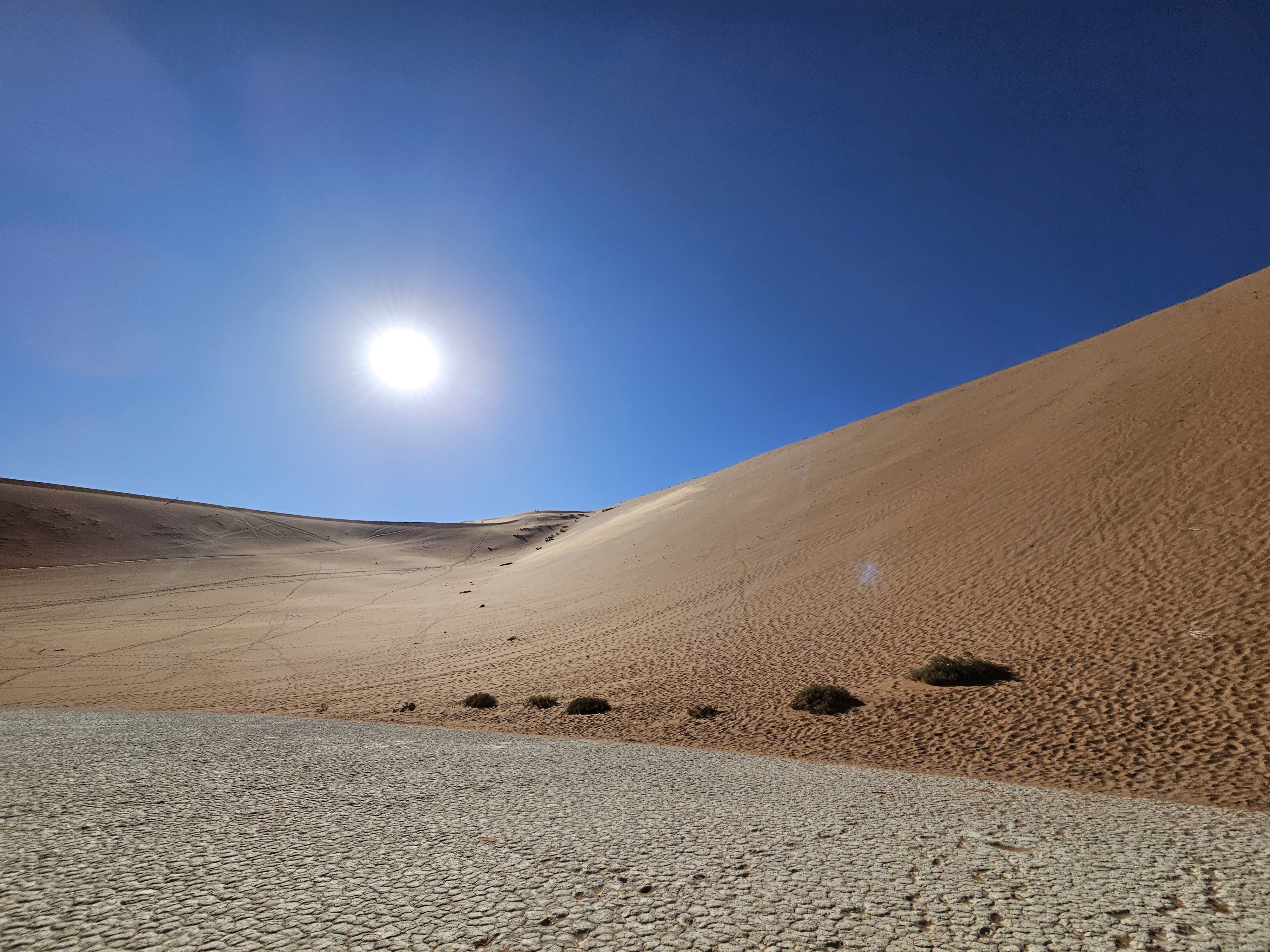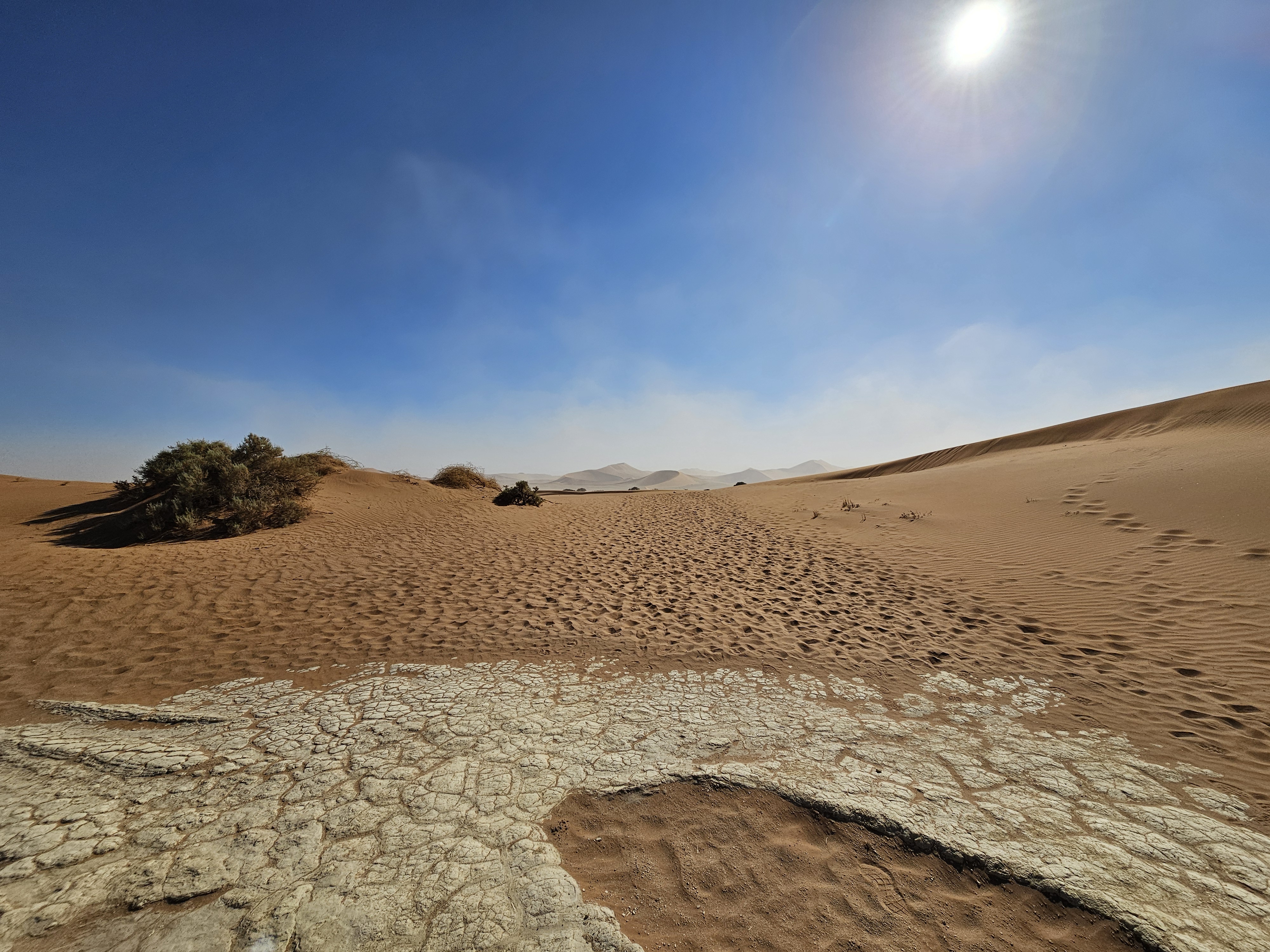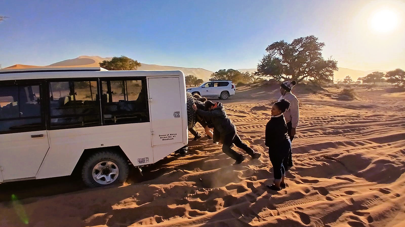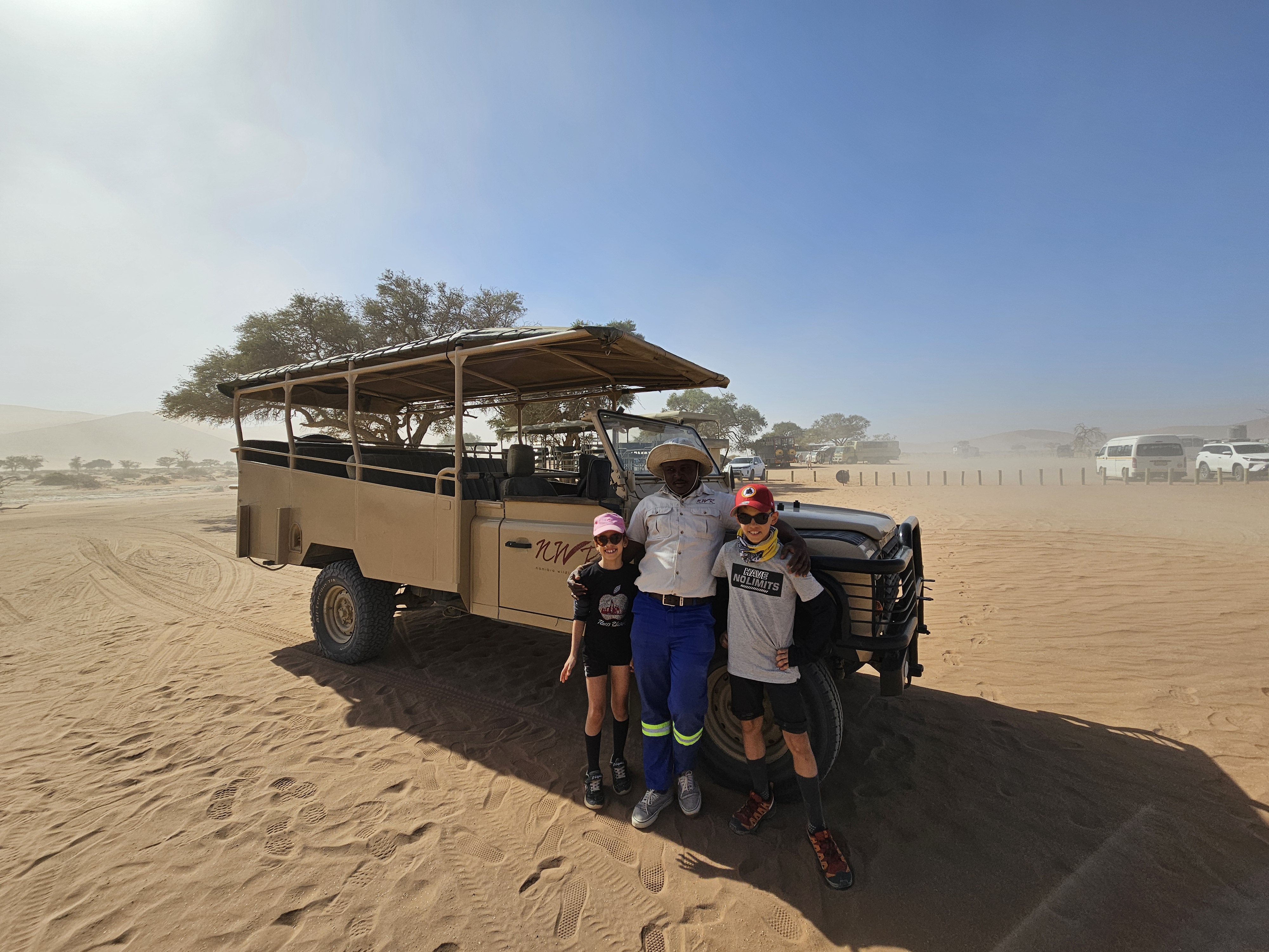 Torniamo al nostro appartamento e alle 12 l’addetta alla reception ci chiama. Un cowboy ci attende a bordo di un fuoristrada. Il suo nome è Andrew Strauss. Facciamo tappa nel punto esatto in cui eravamo stati pochi istanti prima. Le jeep sono tante. Una tizia si aggira fra i mezzi col pos. Non avevo mai visto un pos vagare fra i clienti in un parcheggio. Paghiamo mentre tutti gli autisti iniziano a sgonfiare gli pneumatici a pressioni mai viste. Andrew depressurizza fino a 0.7. Le gomme sono sostanzialmente a terra. Ci spiegano che è l’unico modo per arrampicarsi sulle dune, e non abbiamo ancora idea di quanto siano alte e di dove finiremo poi. I drivers eseguono dei test radio, per verificare se i walkie talkie di cui sono muniti funzionino bene. Scelgono la frequenza migliore e poi si parte a gruppi di 4-5 fuoristrada per volta.