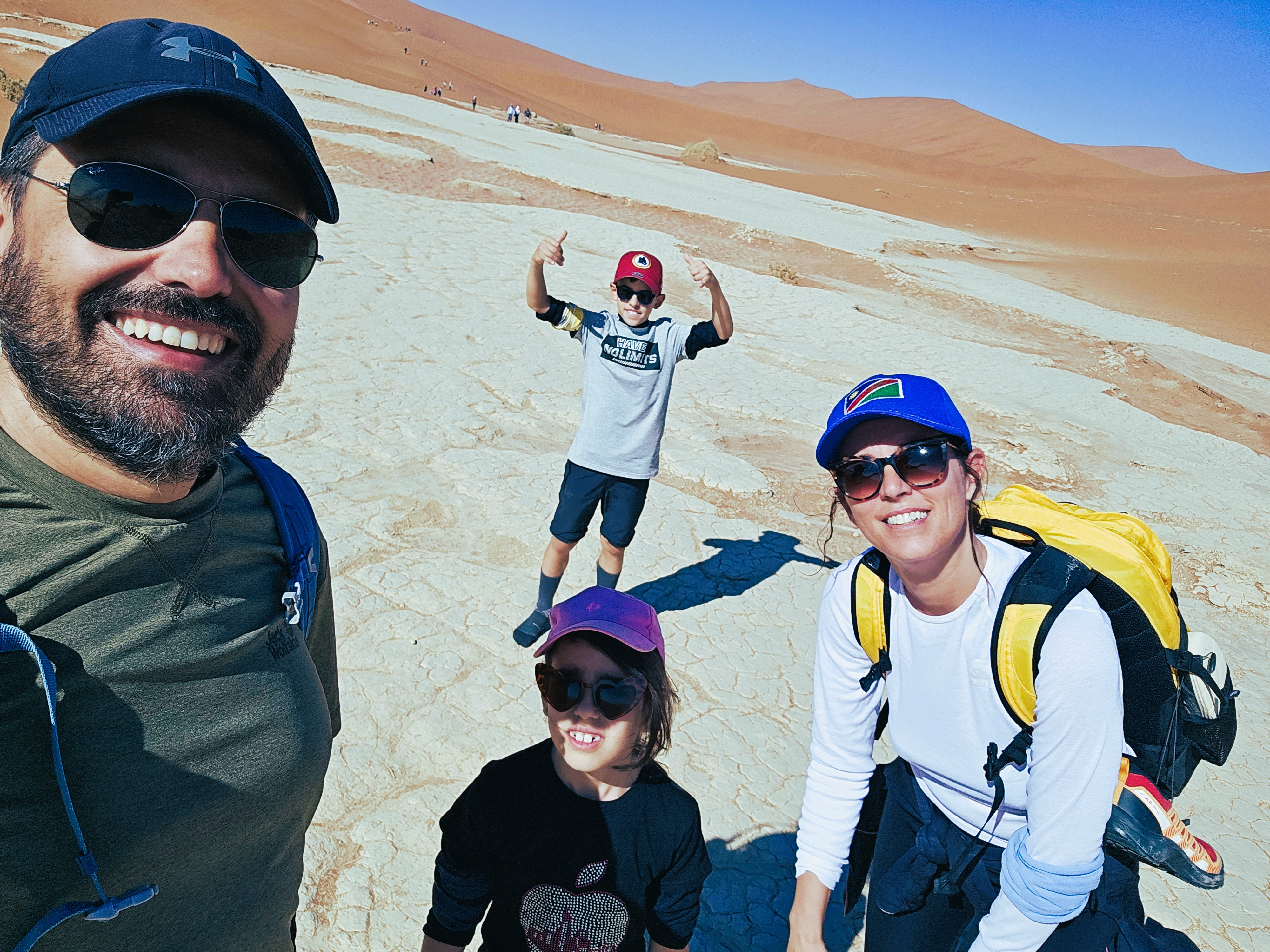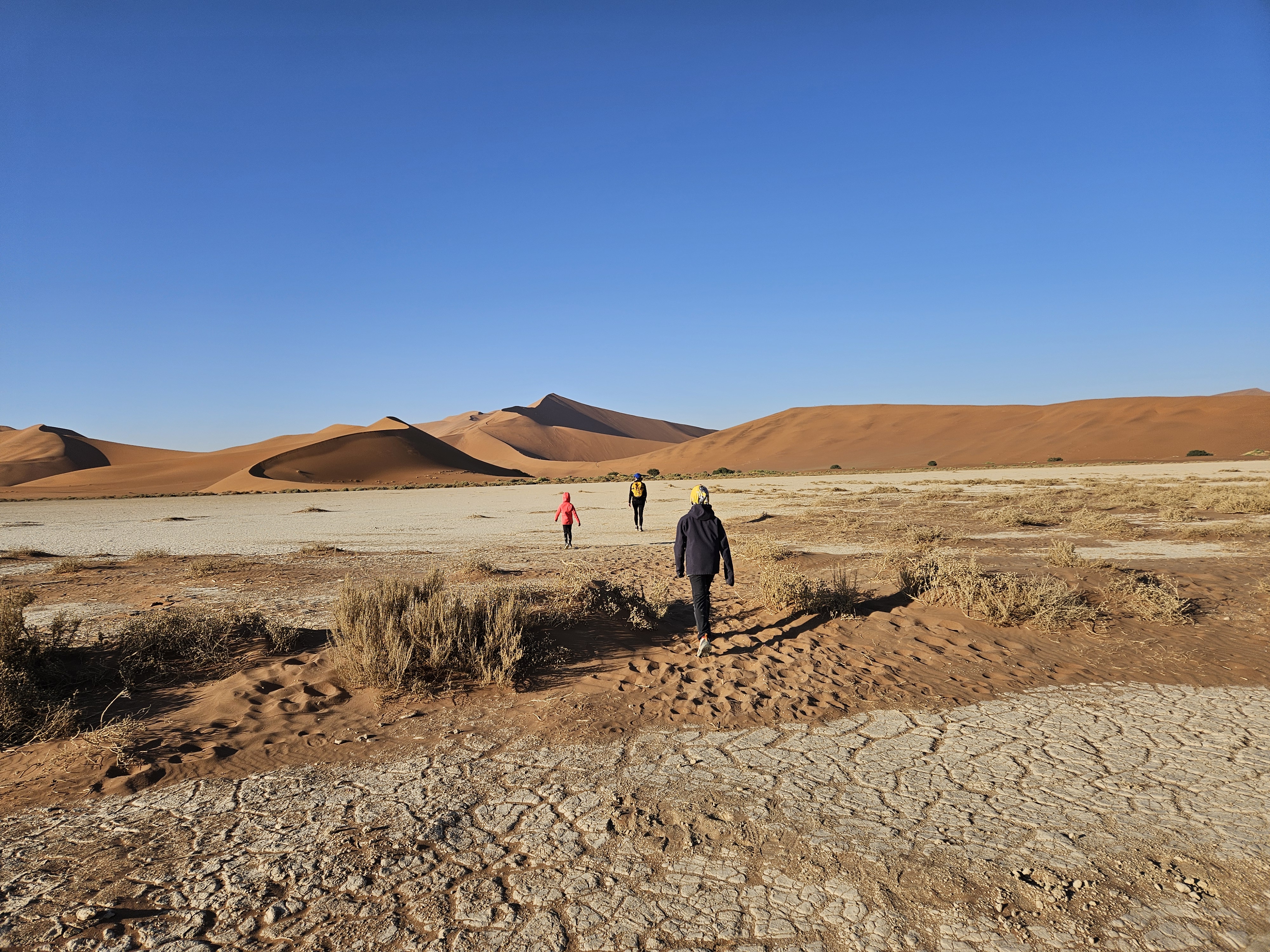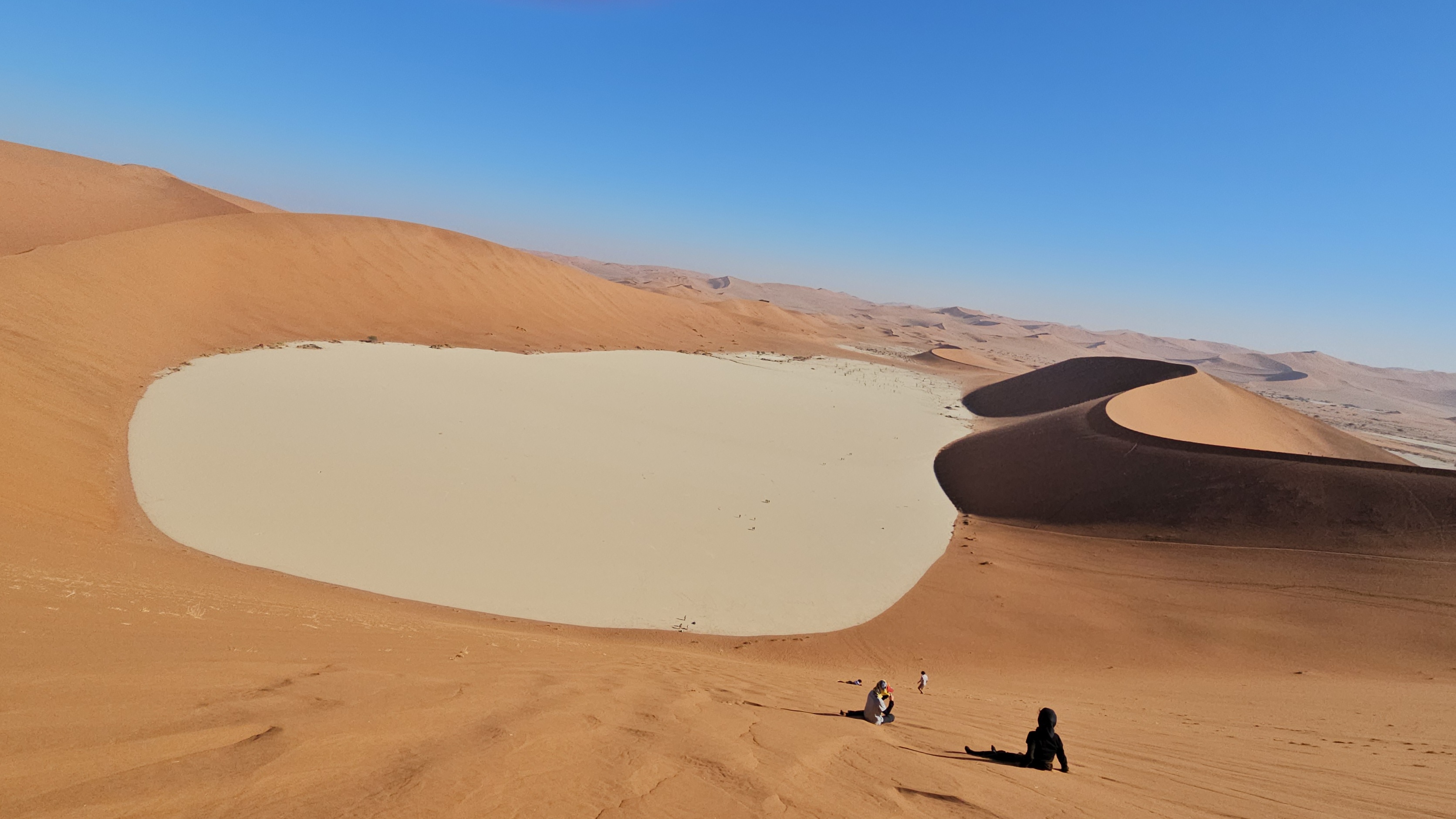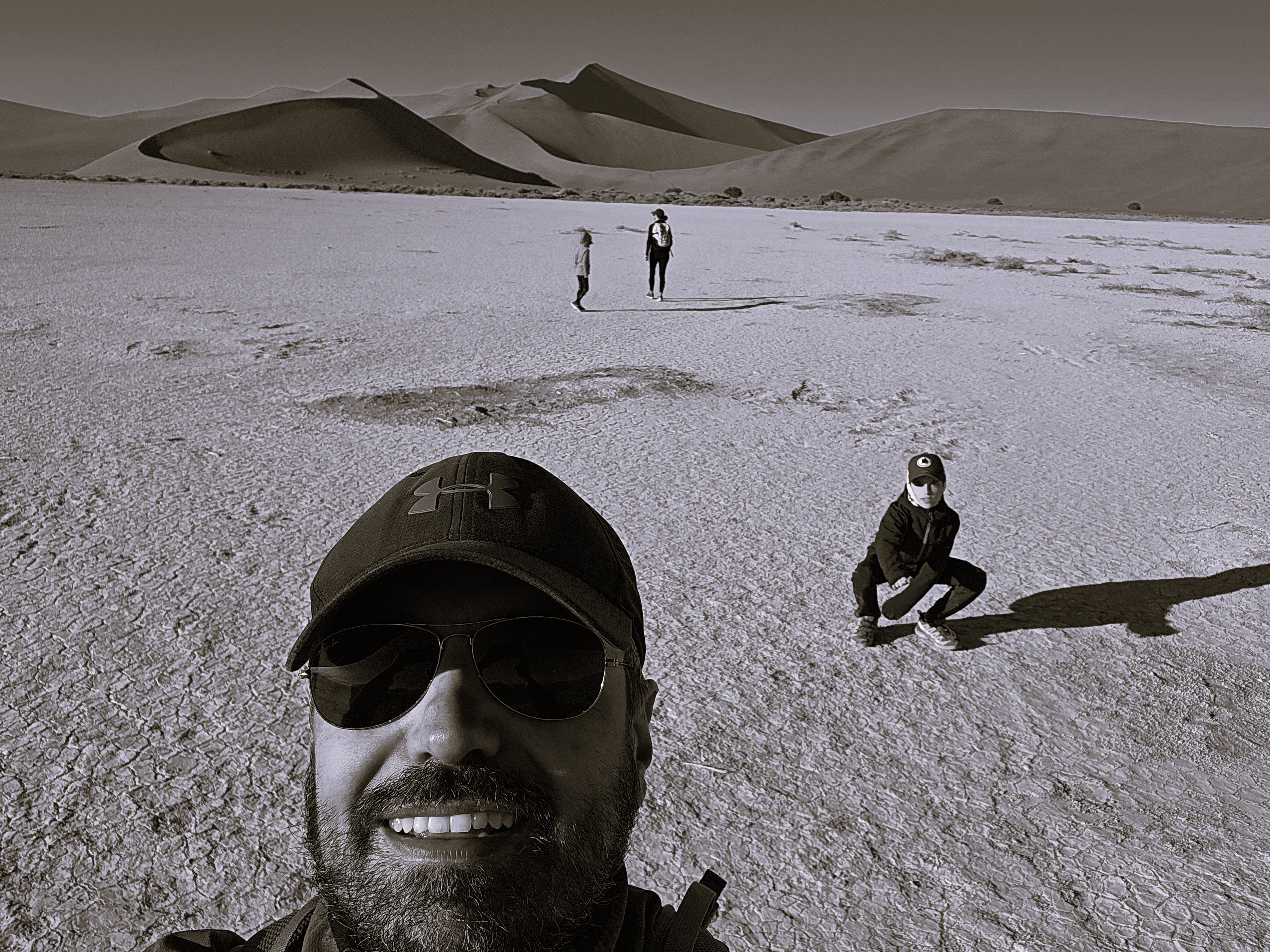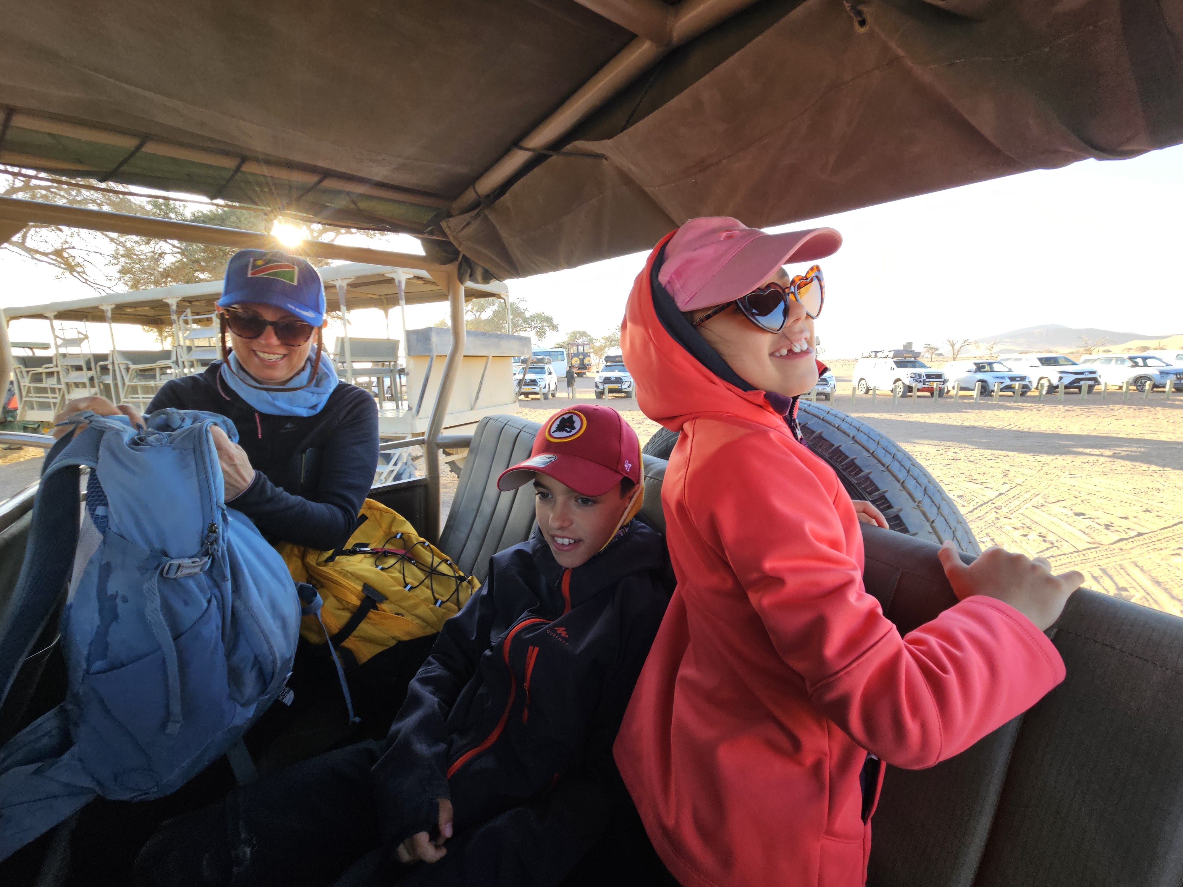 Torniamo al nostro appartamento e alle 12 l’addetta alla reception ci chiama. Un cowboy ci attende a bordo di un fuoristrada. Il suo nome è Andrew Strauss. Facciamo tappa nel punto esatto in cui eravamo stati pochi istanti prima. Le jeep sono tante. Una tizia si aggira fra i mezzi col pos. Non avevo mai visto un pos vagare fra i clienti in un parcheggio. Paghiamo mentre tutti gli autisti iniziano a sgonfiare gli pneumatici a pressioni mai viste. Andrew depressurizza fino a 0.7. Le gomme sono sostanzialmente a terra. Ci spiegano che è l’unico modo per arrampicarsi sulle dune, e non abbiamo ancora idea di quanto siano alte e di dove finiremo poi. I drivers eseguono dei test radio, per verificare se i walkie talkie di cui sono muniti funzionino bene. Scelgono la frequenza migliore e poi si parte a gruppi di 4-5 fuoristrada per volta.