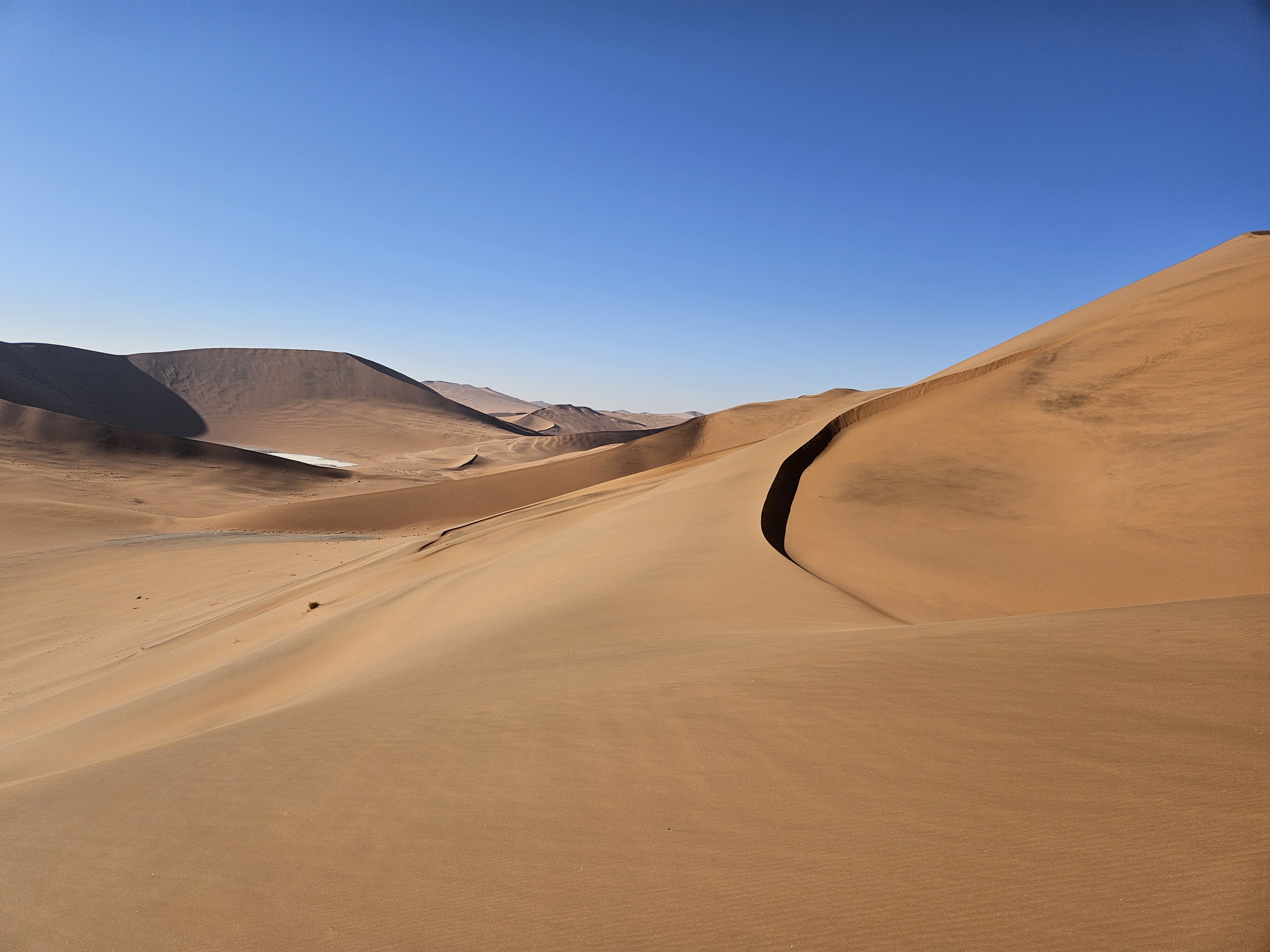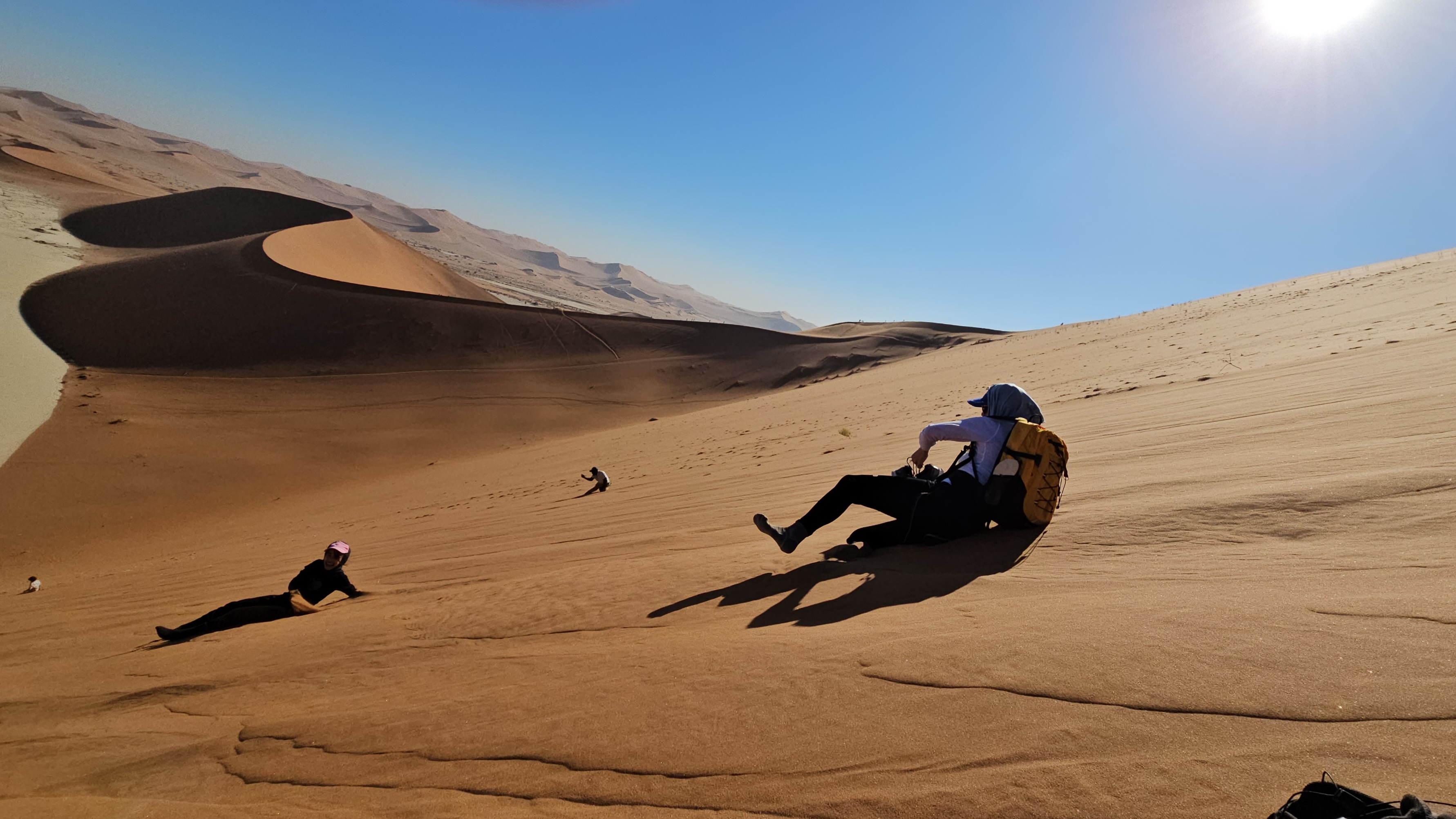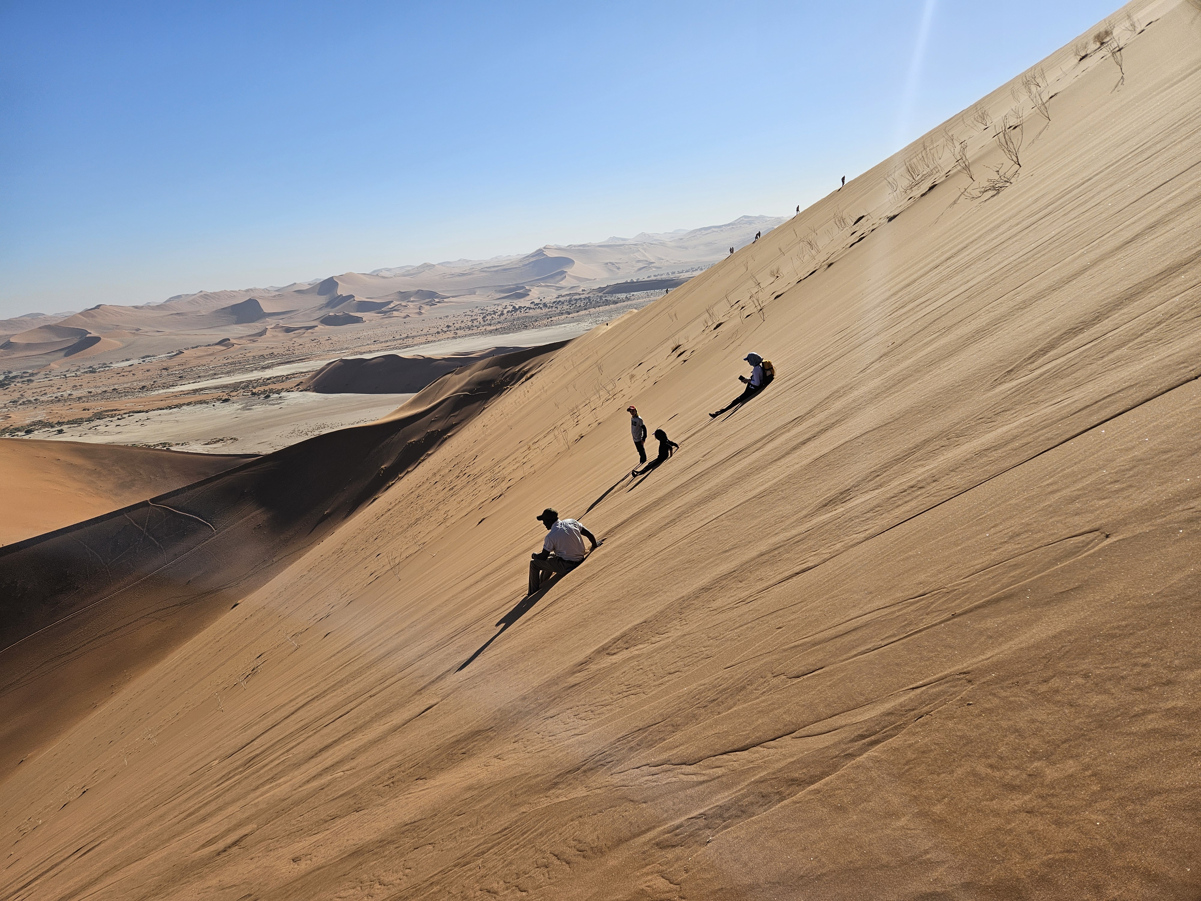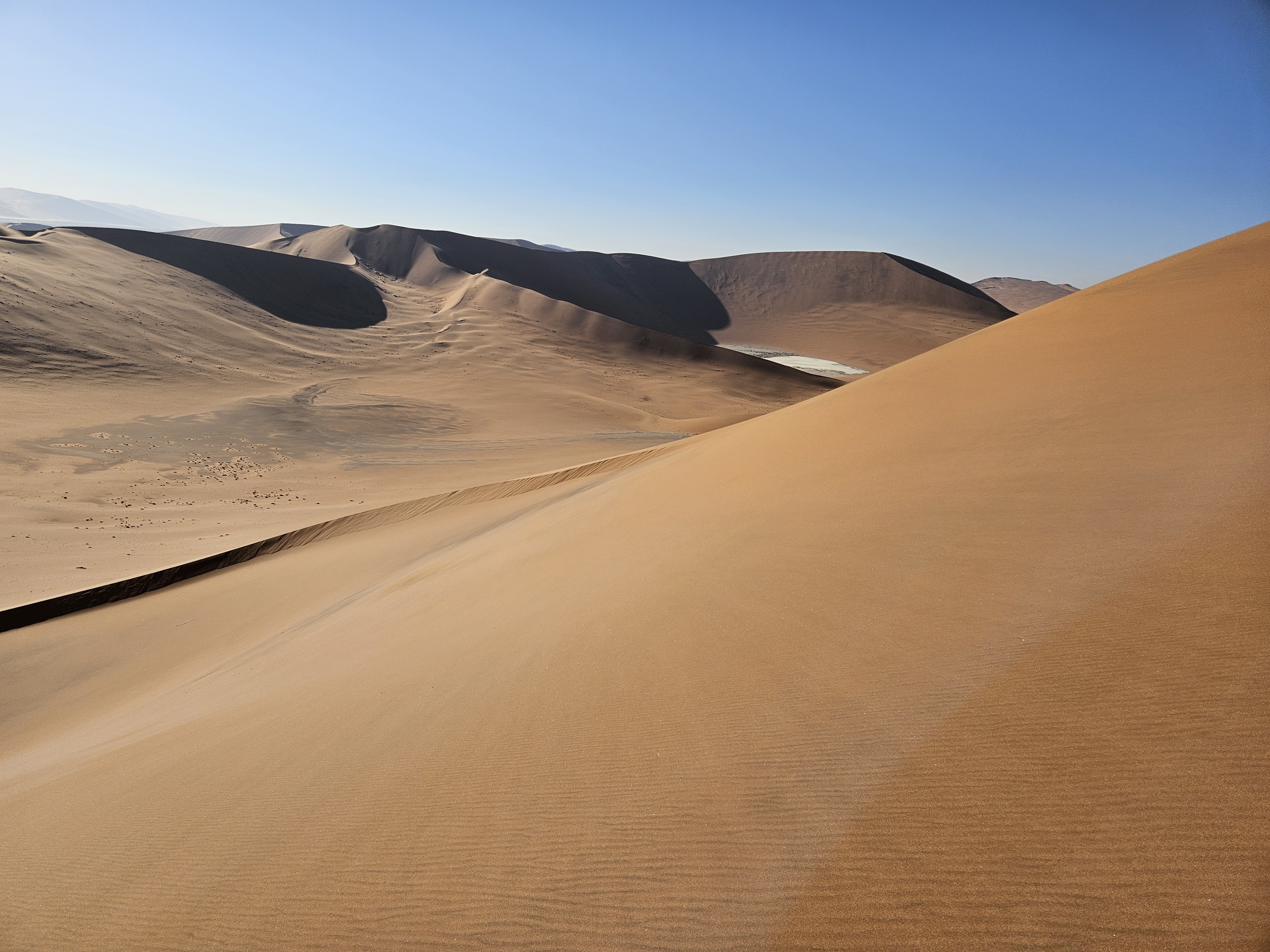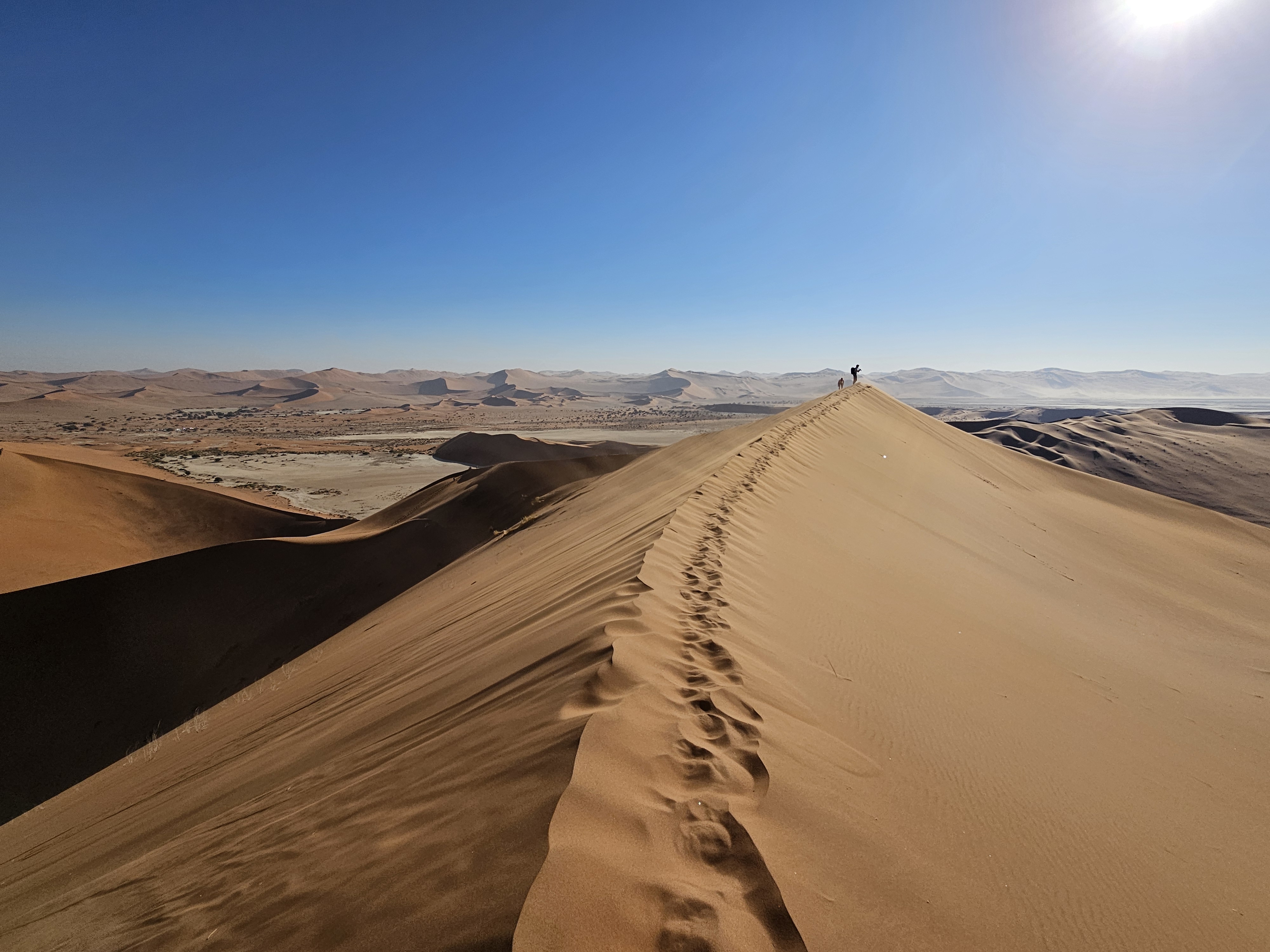 Dopo qualche minuto si riparte. Andrew canticchia i suoi motivetti, mentre le dune iniziano ad avanzare e a moltiplicarsi tumultuosamente da sinistra e a spingerci su una striscia di sabbia sempre più sottile, finchè non ci sono a ridosso e la pista diventa poco più di un’idea strampalata. Ci fermiamo in un punto casuale dove ci arrampichiamo sulla duna per saggiare il vento impetuoso dell’oceano e ammirare il deserto dal suo ciglio estremo. Dicono che questo paesaggio sia unico al mondo, che non esista altrove una simile distesa di dune a ridosso del mare. Chissà se è vero.