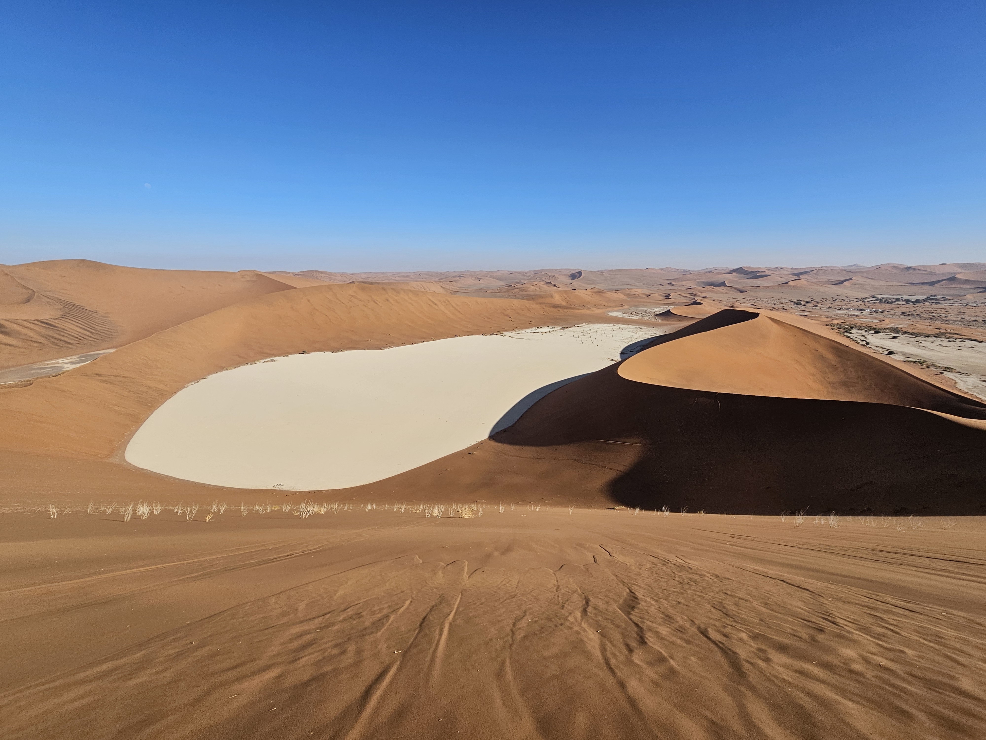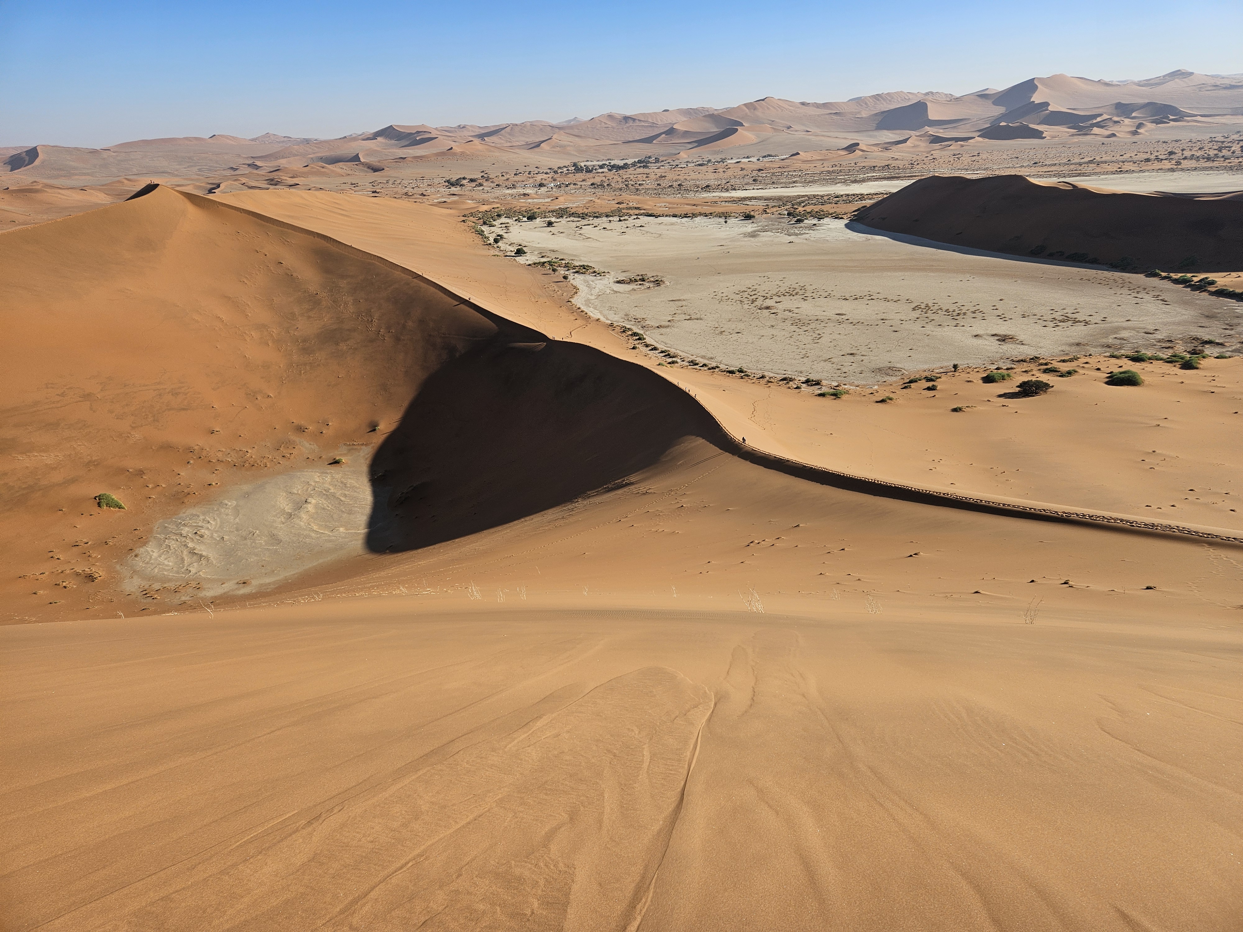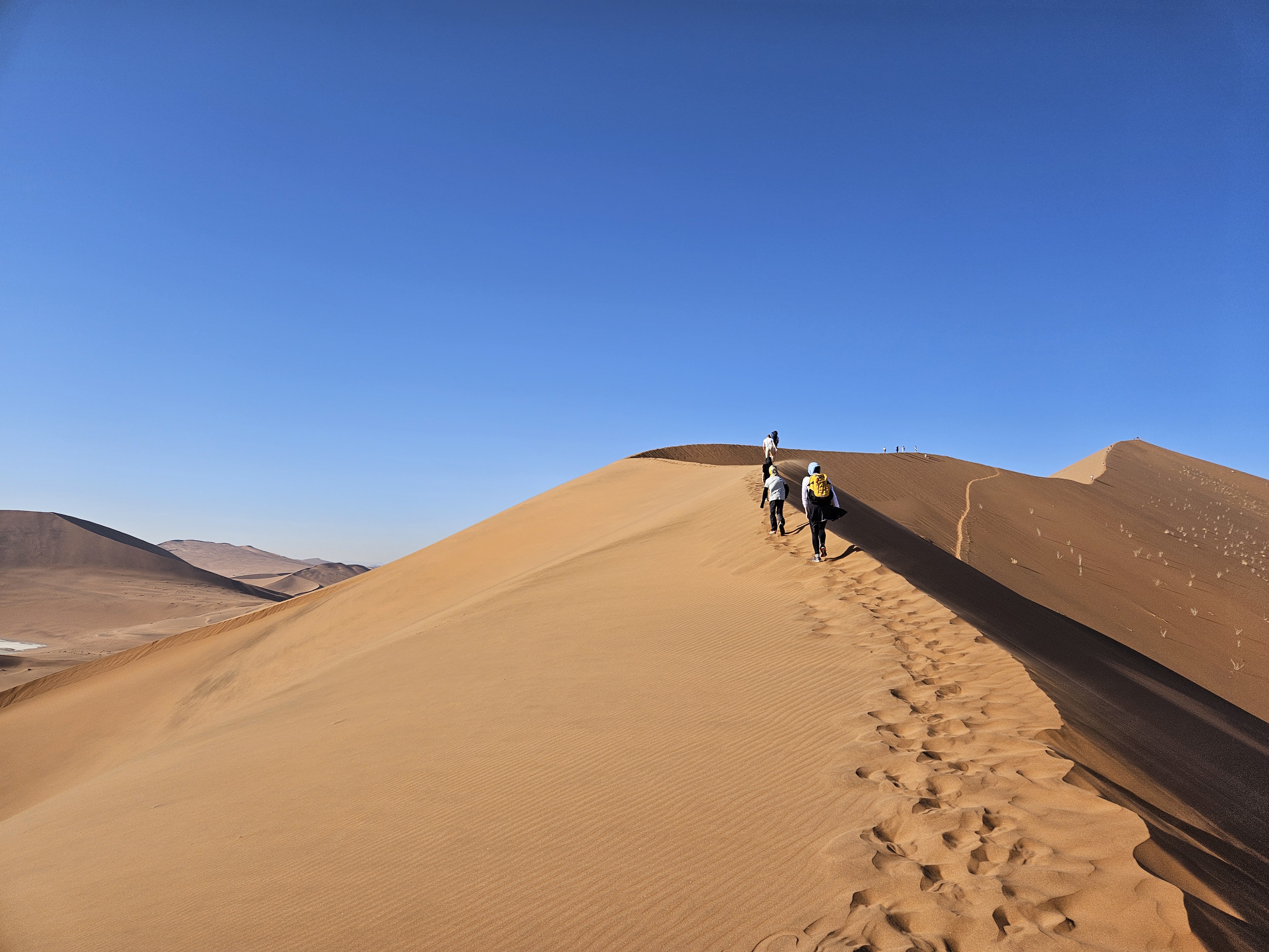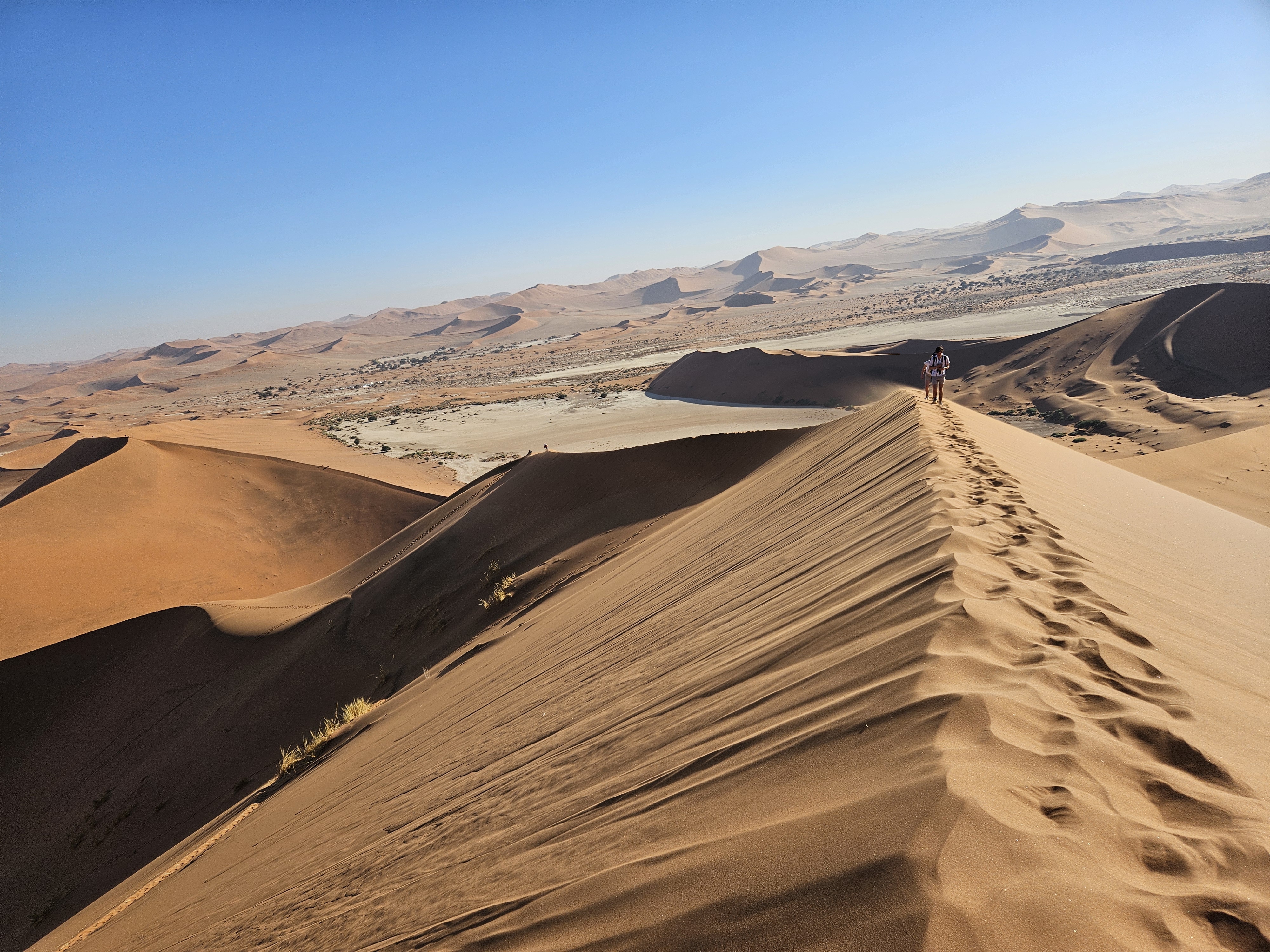 Dopo qualche minuto si riparte. Andrew canticchia i suoi motivetti, mentre le dune iniziano ad avanzare e a moltiplicarsi tumultuosamente da sinistra e a spingerci su una striscia di sabbia sempre più sottile, finchè non ci sono a ridosso e la pista diventa poco più di un’idea strampalata. Ci fermiamo in un punto casuale dove ci arrampichiamo sulla duna per saggiare il vento impetuoso dell’oceano e ammirare il deserto dal suo ciglio estremo. Dicono che questo paesaggio sia unico al mondo, che non esista altrove una simile distesa di dune a ridosso del mare. Chissà se è vero.