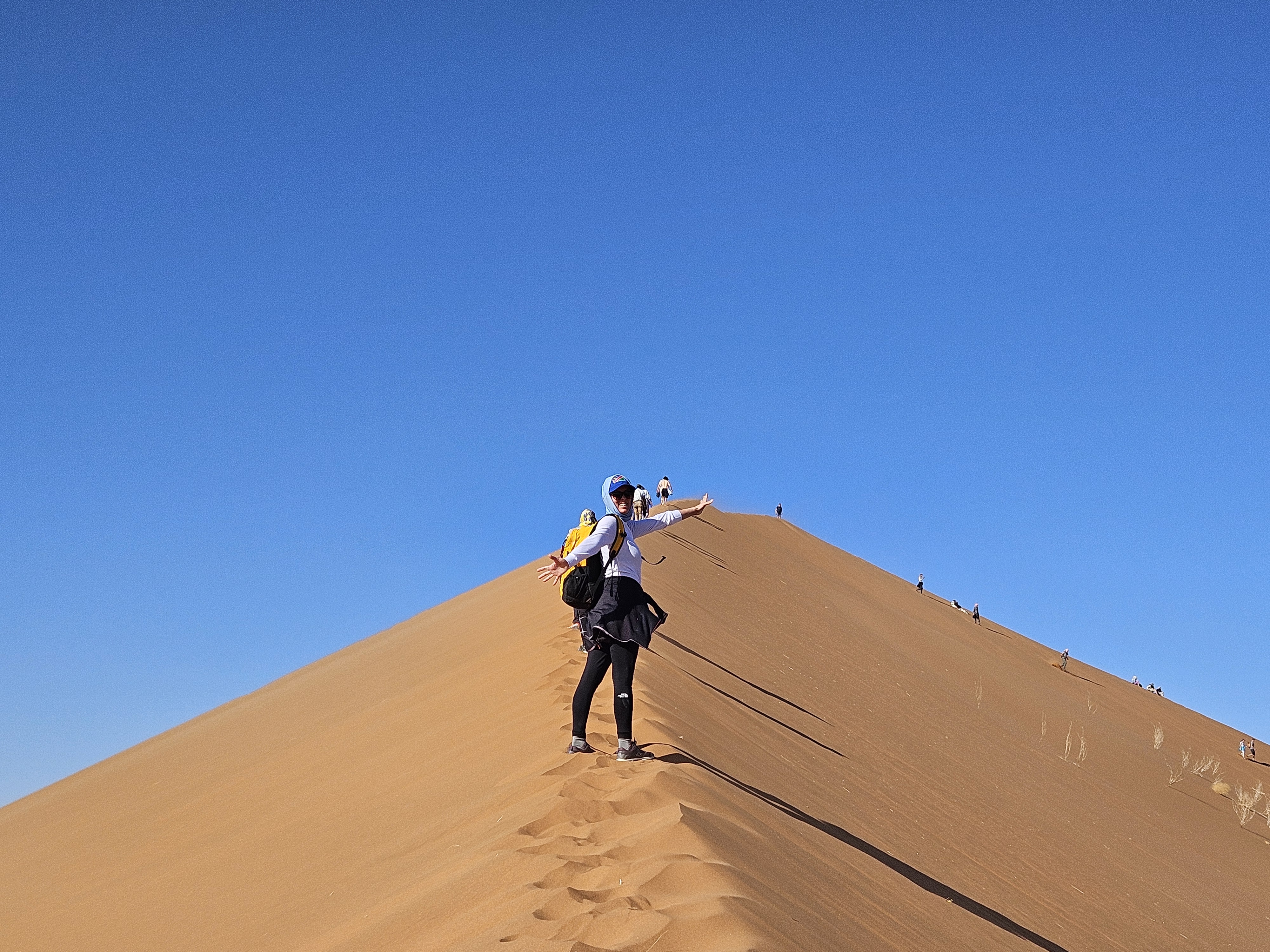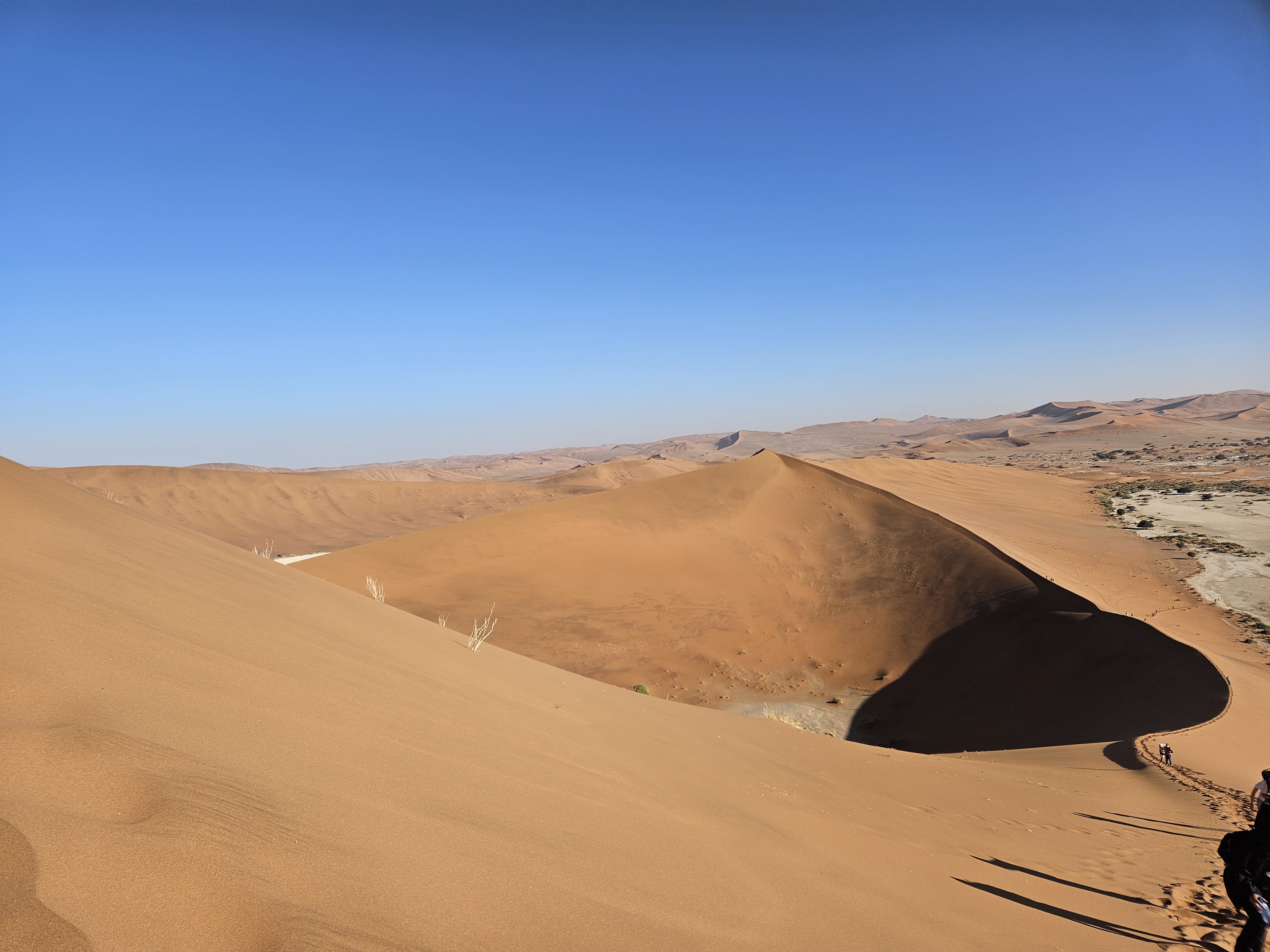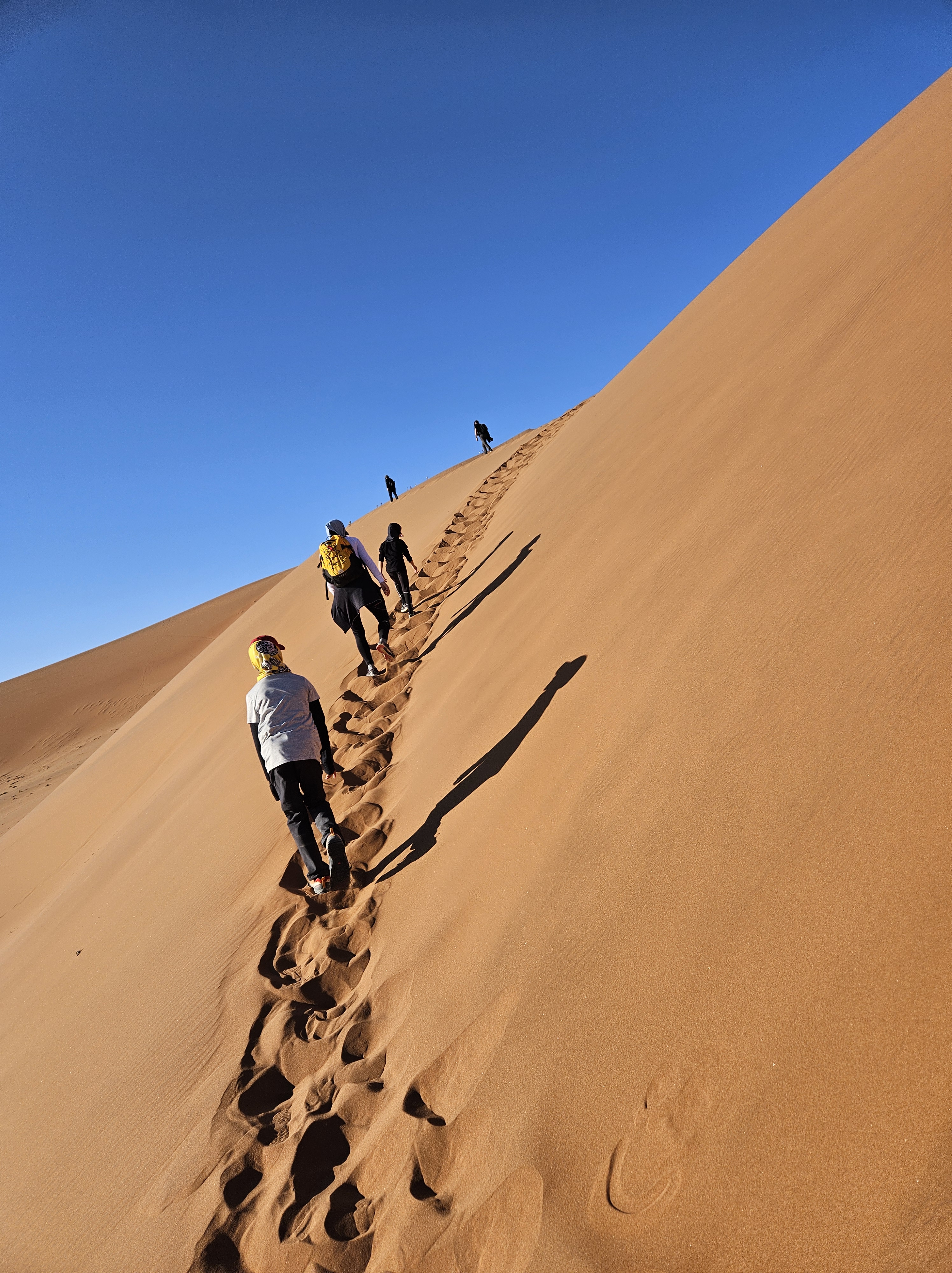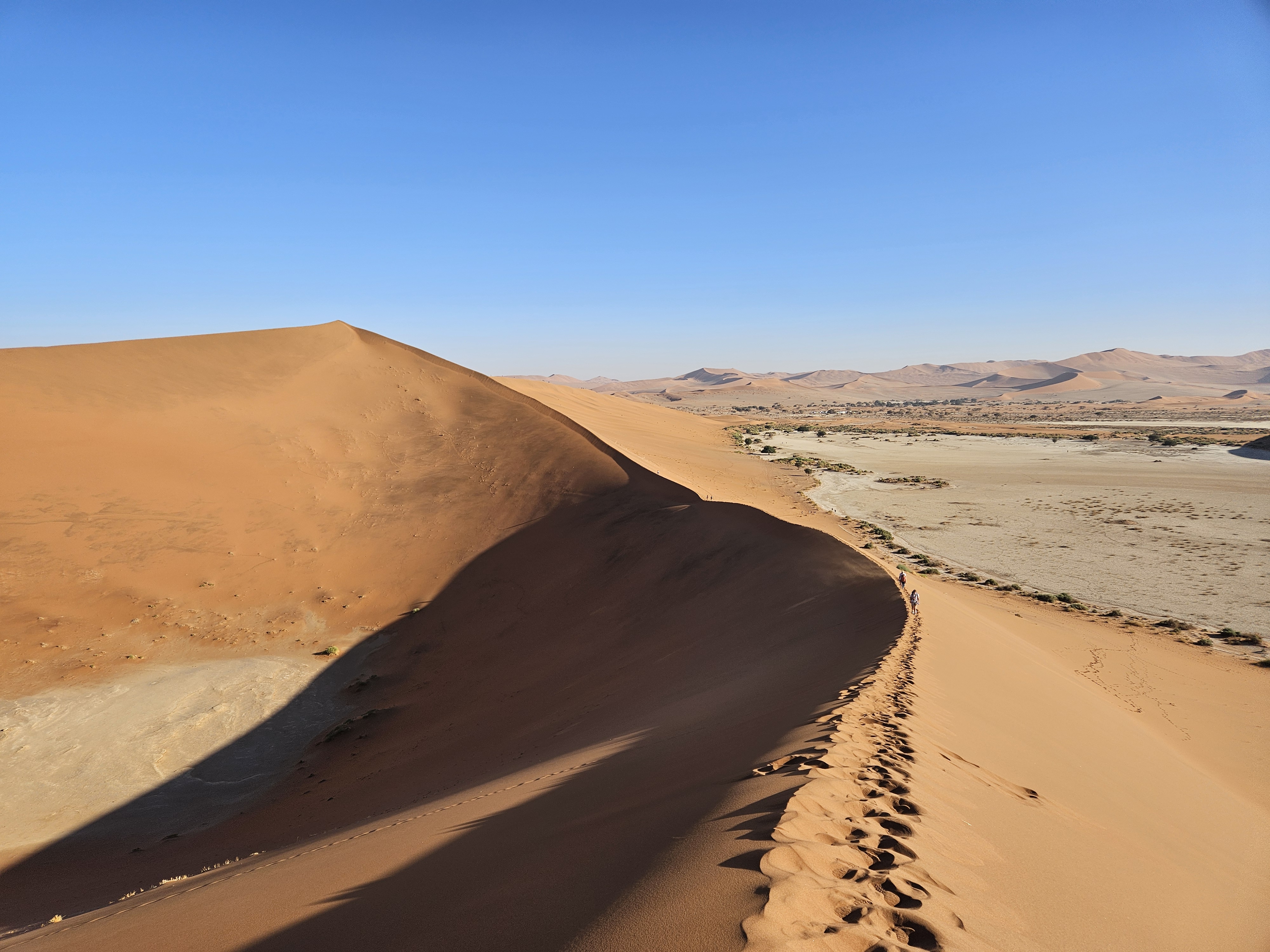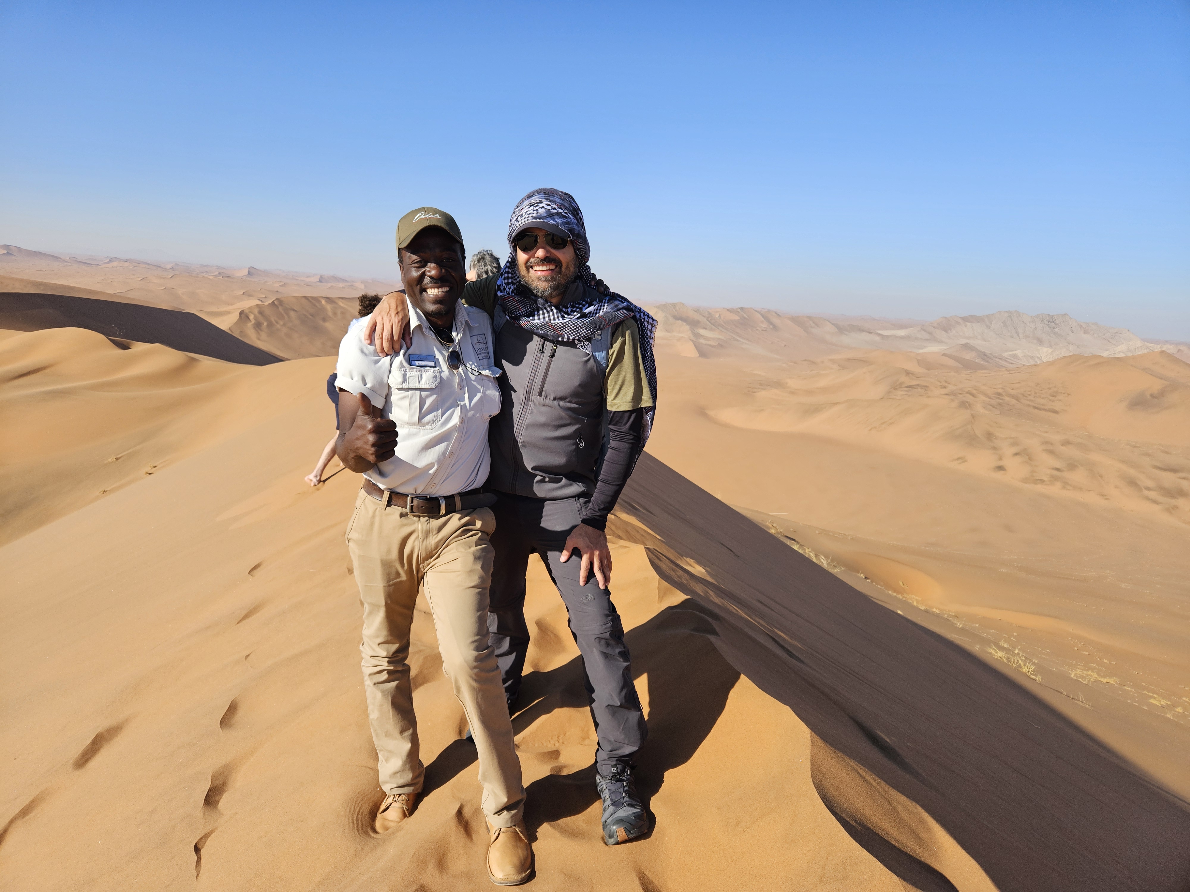 Dopo qualche minuto si riparte. Andrew canticchia i suoi motivetti, mentre le dune iniziano ad avanzare e a moltiplicarsi tumultuosamente da sinistra e a spingerci su una striscia di sabbia sempre più sottile, finchè non ci sono a ridosso e la pista diventa poco più di un’idea strampalata. Ci fermiamo in un punto casuale dove ci arrampichiamo sulla duna per saggiare il vento impetuoso dell’oceano e ammirare il deserto dal suo ciglio estremo. Dicono che questo paesaggio sia unico al mondo, che non esista altrove una simile distesa di dune a ridosso del mare. Chissà se è vero.