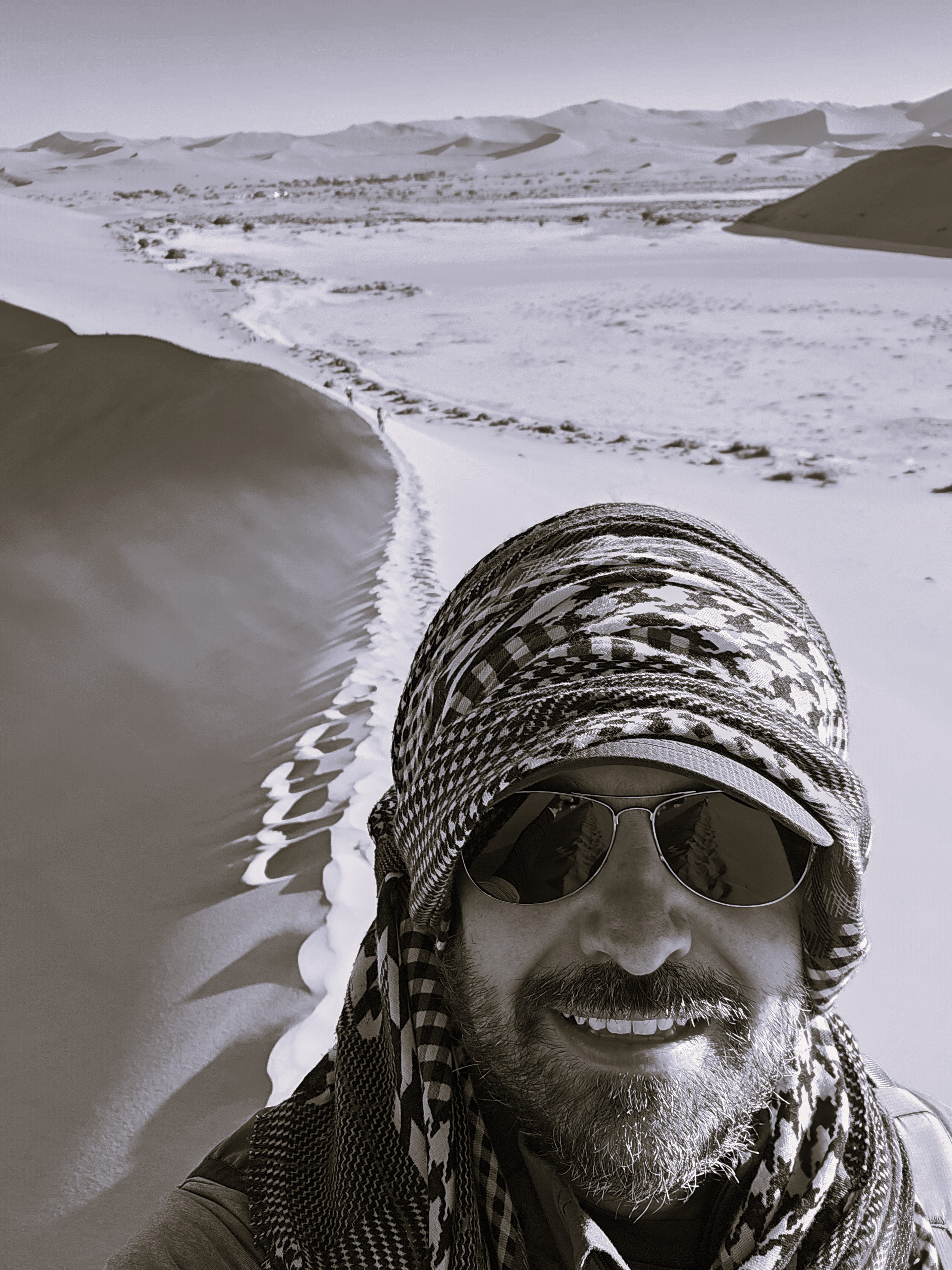 Poi scivoliamo in una piccola depressione fra le dune dove le 4 jeep del gruppo si fermano a semicerchio. Andrew e gli altri aprono i portabagagli e iniziano ad apparecchiare un tavolo da picnic. Tirano fuori da bere e da mangiare. E per quanto il prosecco che ci offrono sia di scarsa qualità, è un piacere tracannarne qualche bicchiere, visto il caldo stagnante che regna nella conca.