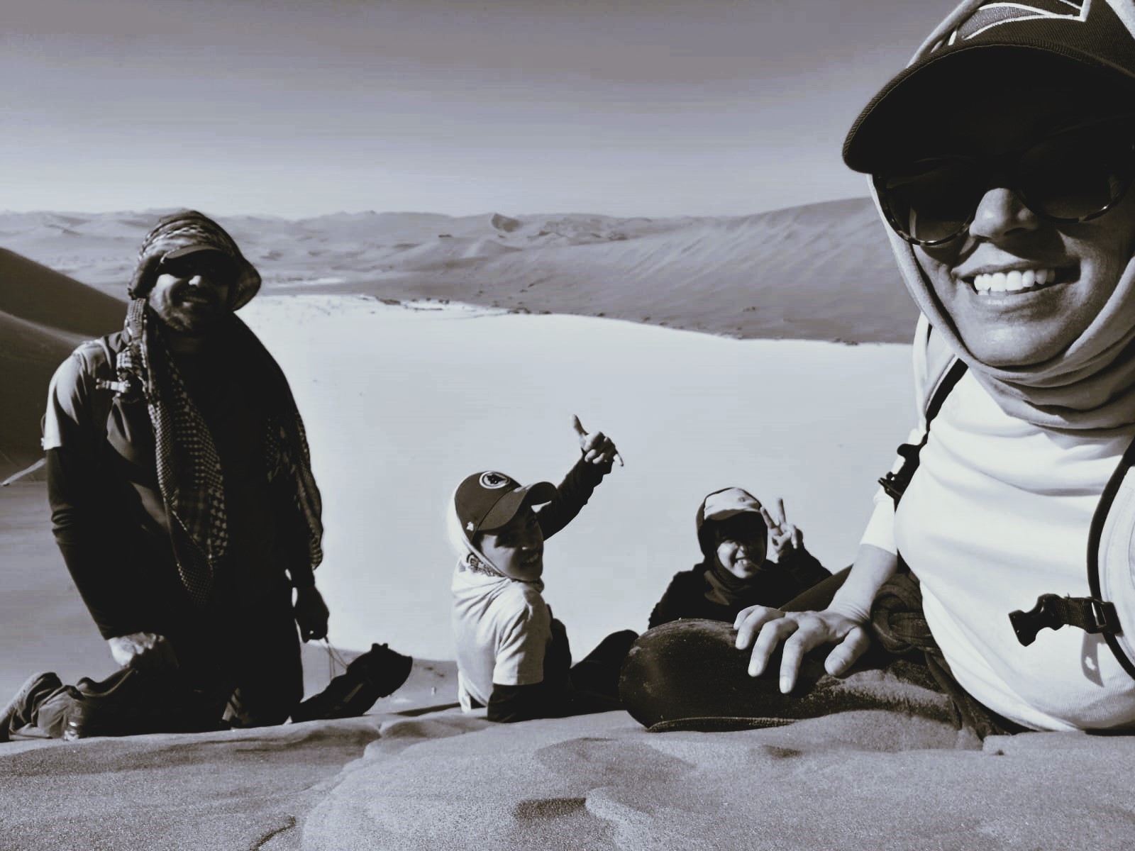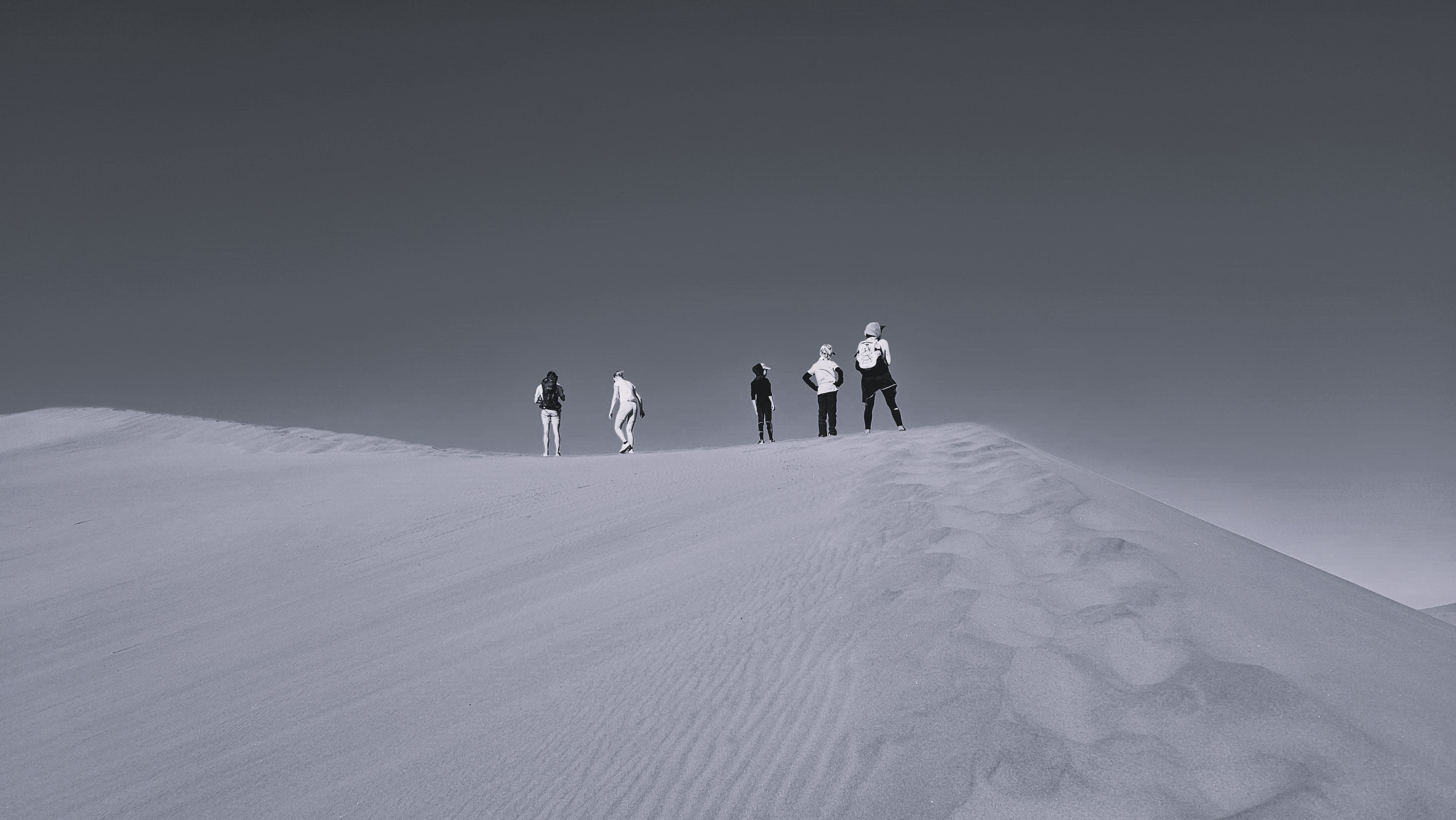 Arriviamo in prossimità delle dune più grandi. Il nostro cowboy sceglie un punto con cura, poi si ferma, e subito dopo aver inserito le ridotte inizia la scalata. Da qui in avanti, produrrà uno strano sibilo nei tratti più impervi, come per concentrarsi o per esorcizzare il momento. Non abbiamo idea di come si orienti o di dove siamo diretti, non ci sono punti di riferimento. Saliamo, scendiamo e curviamo su queste sopraelevate in polvere. Ci rendiamo conto delle reali pendenze quando diamo un occhio ai fuoristrada che ci seguono. A bordo non si ha la sensazione di quanto sia profonda la tana del bianconiglio. E’ ovvio che sia Andrew a rendere tutto più semplice, con la sua abilità e quel suo mantra sonoro a rimorchio.