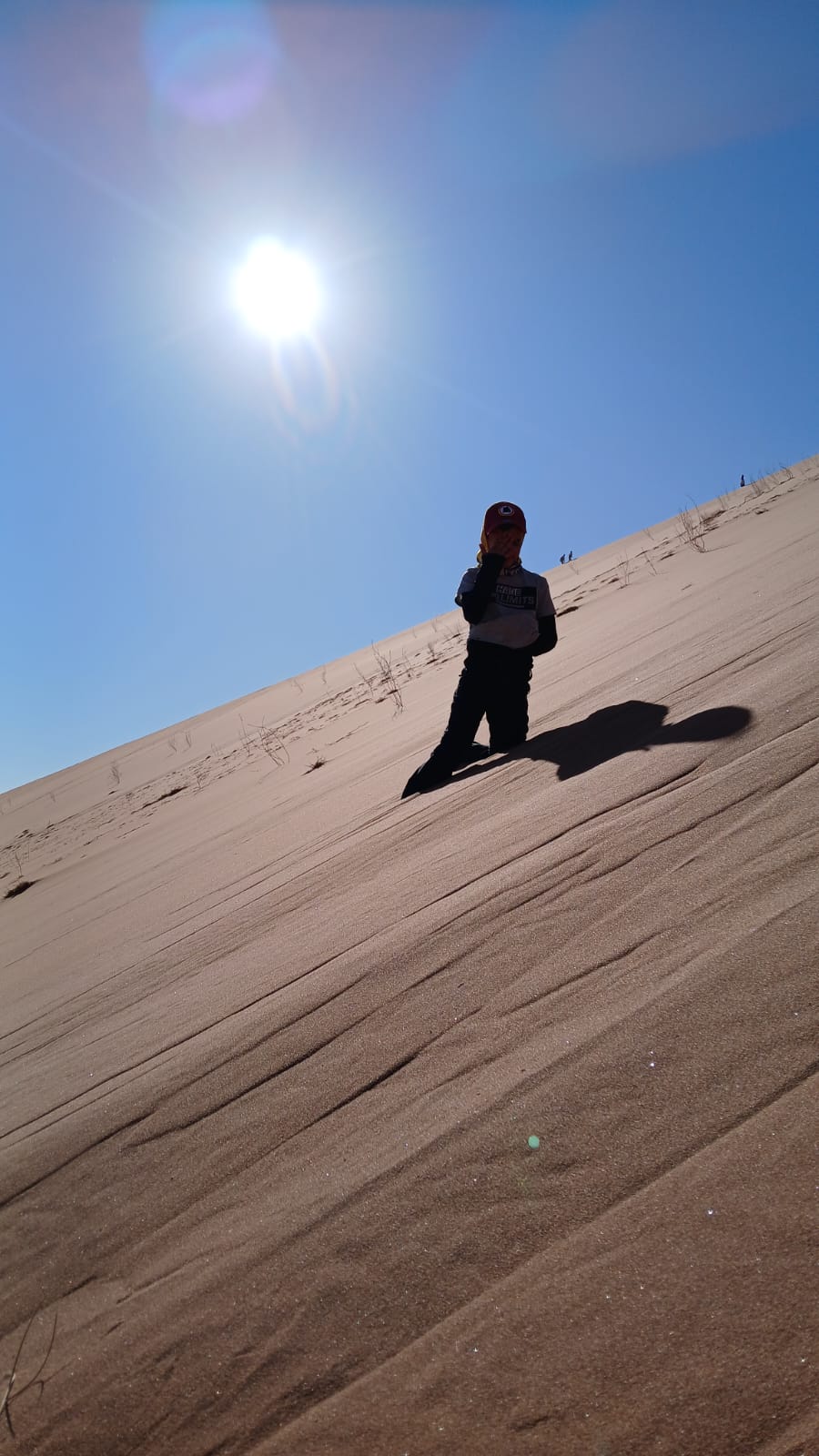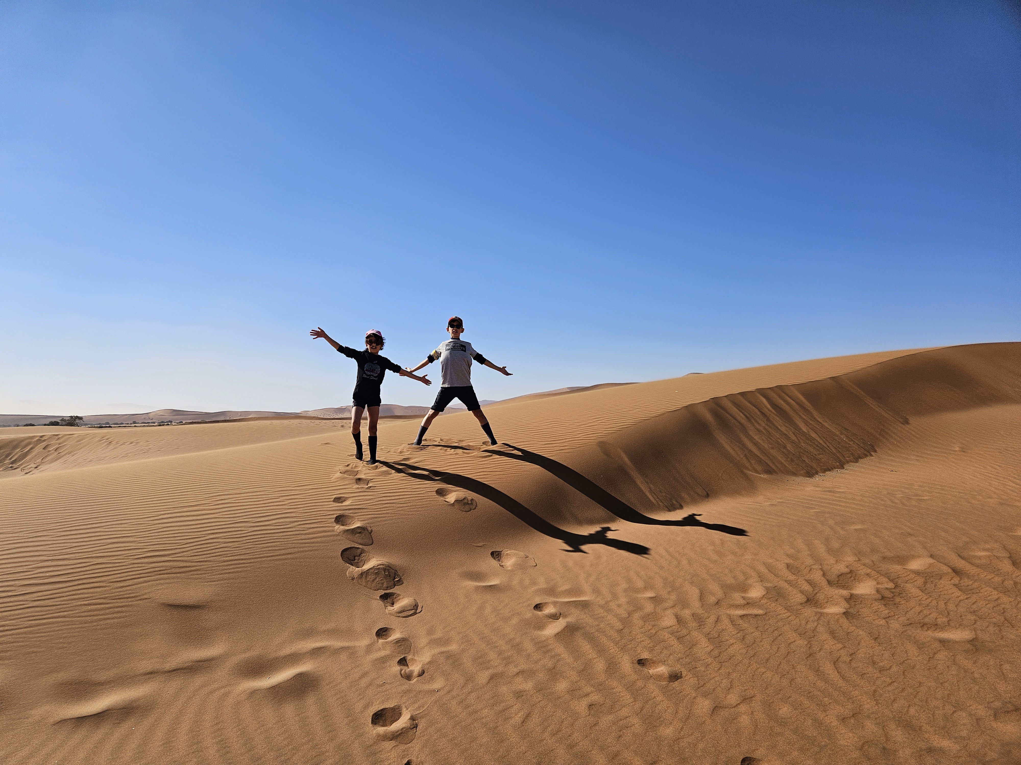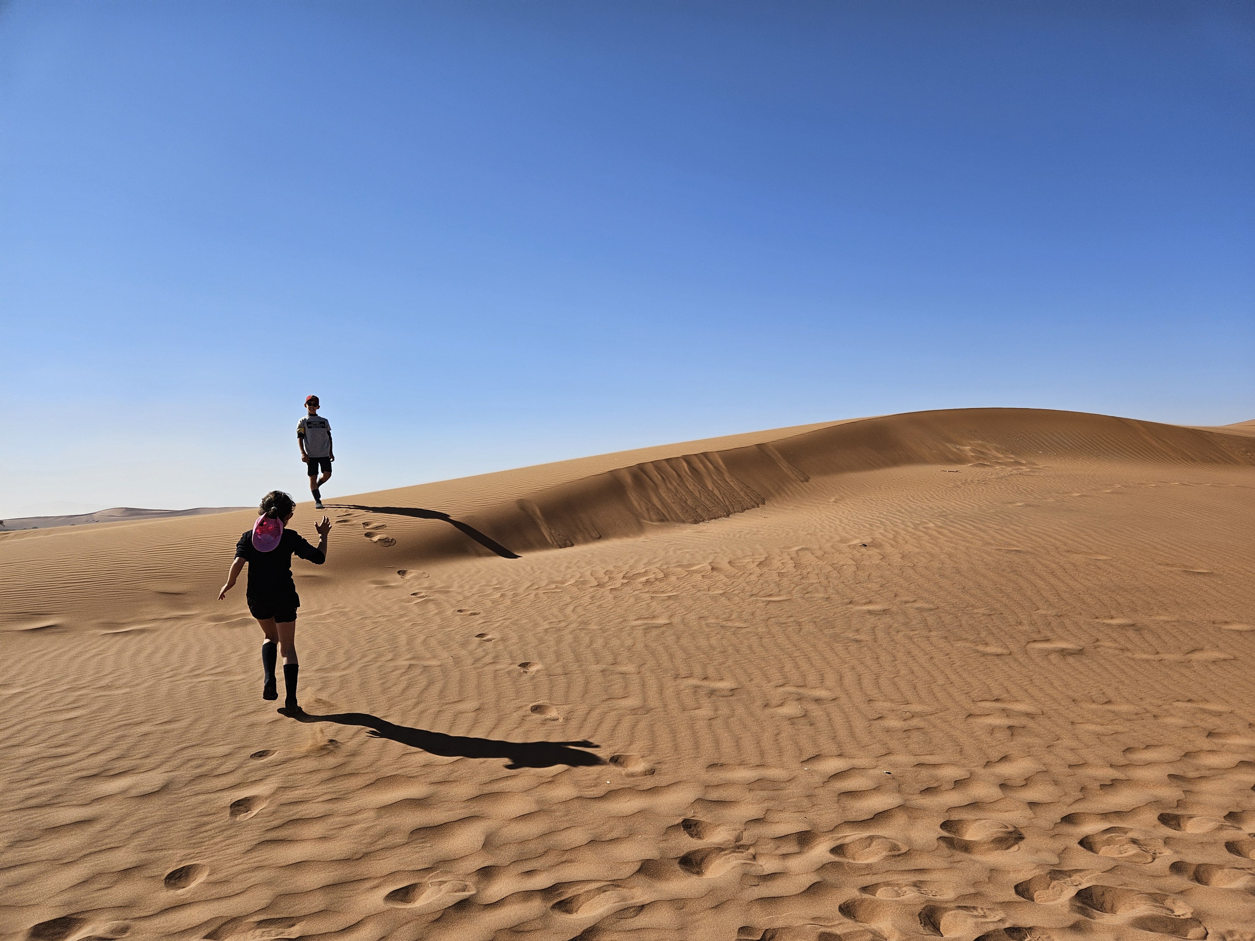 Arriviamo in cima e ci fermiamo. Il vento è sempre più potente, ma è un elemento d’arredo del deserto, come se fosse parte del paesaggio. Le dune qui sono straordinarie, morbide, avvolgenti. Davanti a noi l’oceano sterminato. Fra noi e Rio de Janeiro, fra l’Africa e il Brasile non c’è nulla a parte l’acqua. Sotto di noi una lingua di sabbia circoscrive uno specchio d’acqua blu cobalto. Fra le dune e il mare si stende una macchia di vegetazione di un verde elettrico. Percorriamo un crinale in stato d’ebbrezza, Gim e Iri corrono senza direzione, caracollano, sterzano improvvisamente e fanno salti e capriole. I loro sorrisi sanno di libertà. Fra le maglie del vento sento immancabilmente gridare: “Jiiiim!! Vieni a ballare con me!”.
