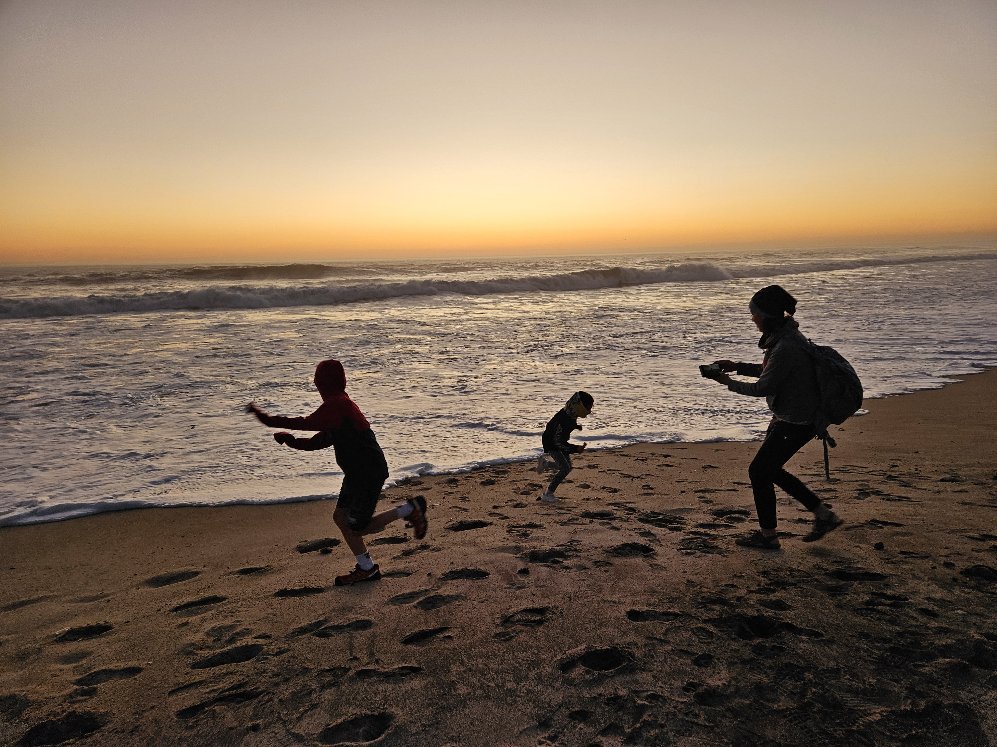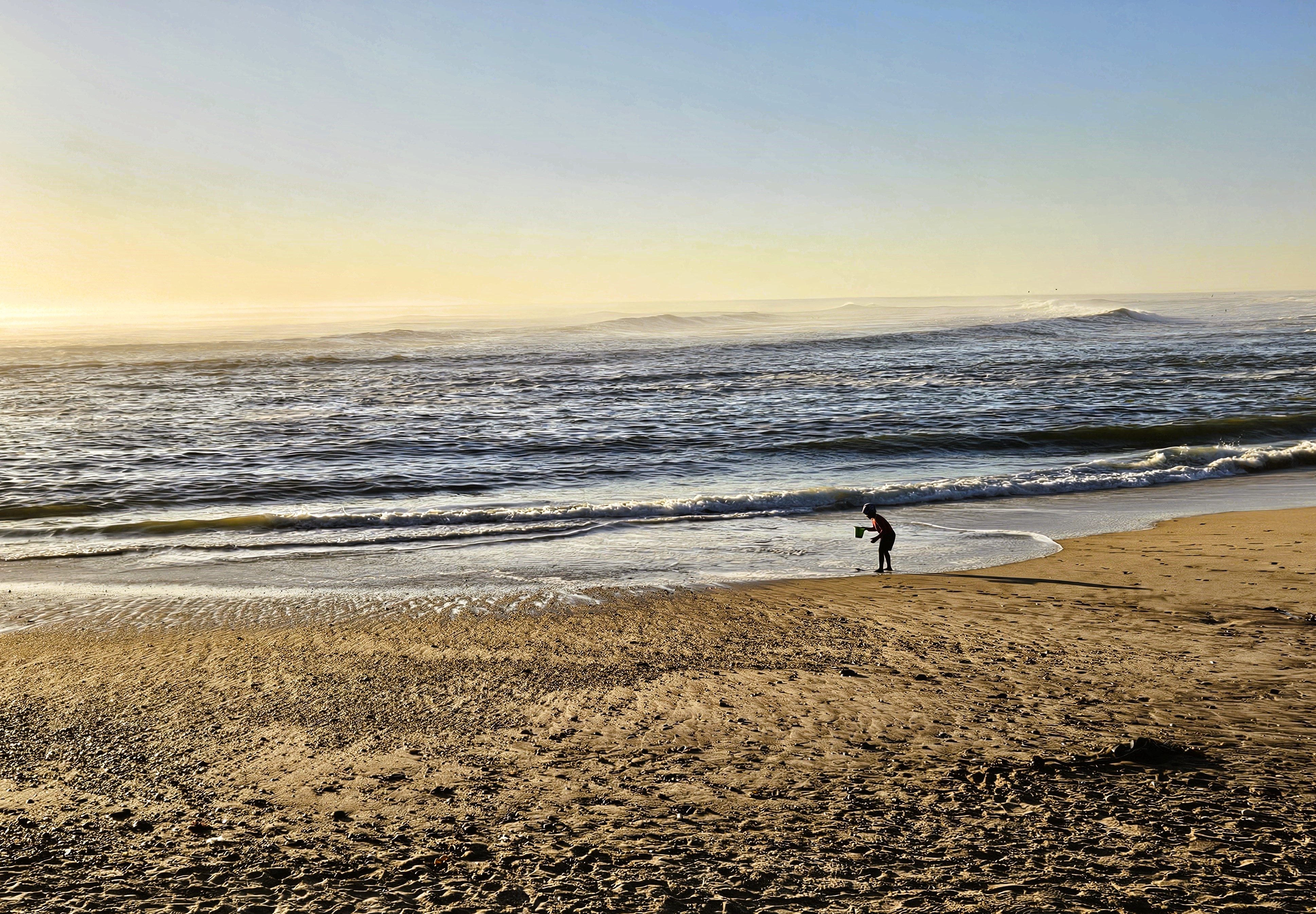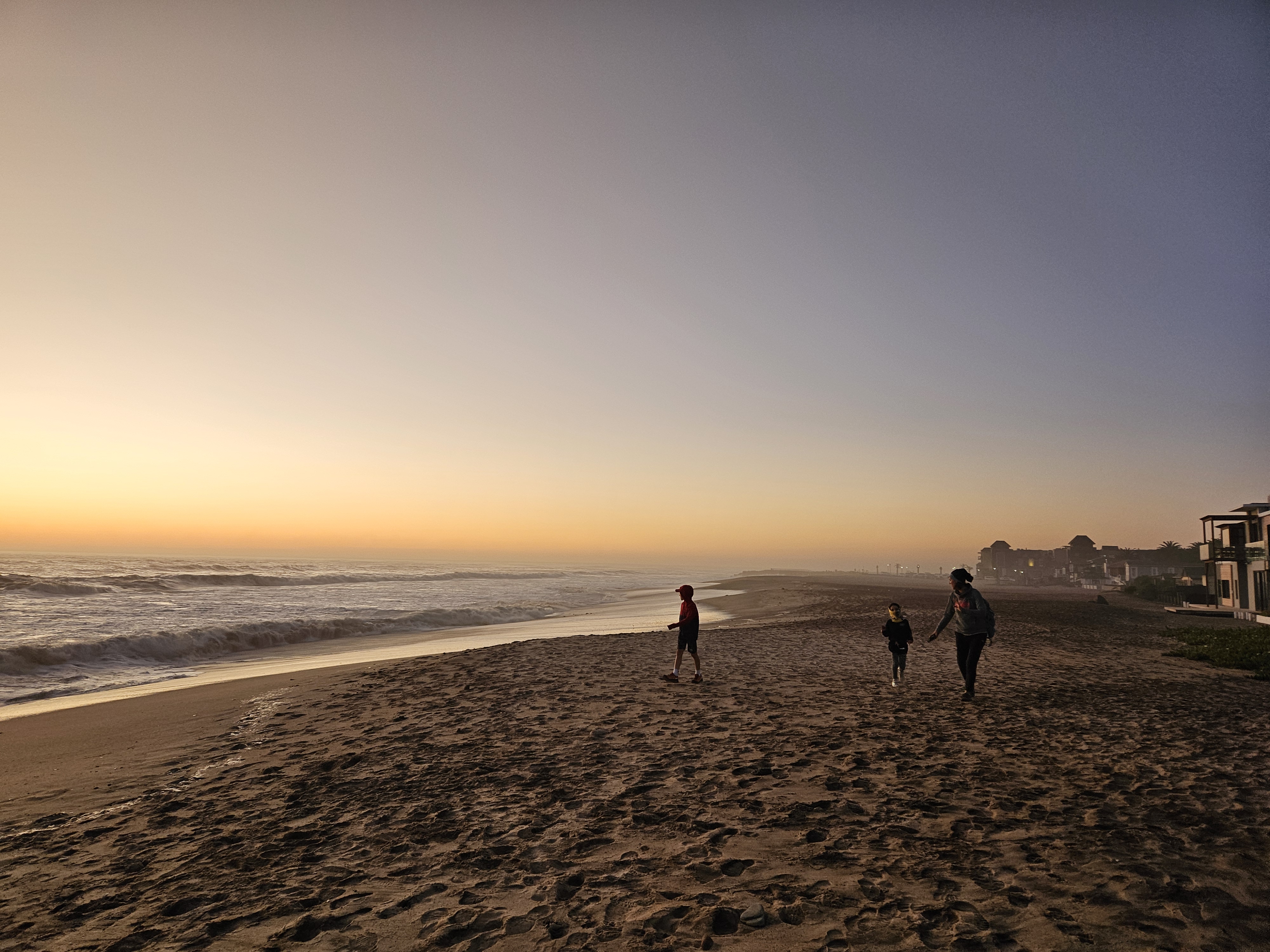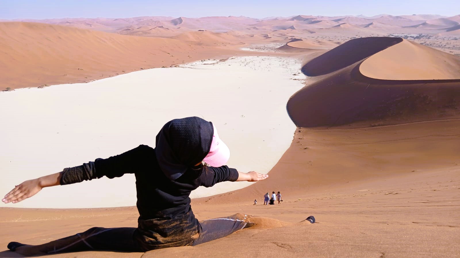 Arriviamo in cima e ci fermiamo. Il vento è sempre più potente, ma è un elemento d’arredo del deserto, come se fosse parte del paesaggio. Le dune qui sono straordinarie, morbide, avvolgenti. Davanti a noi l’oceano sterminato. Fra noi e Rio de Janeiro, fra l’Africa e il Brasile non c’è nulla a parte l’acqua. Sotto di noi una lingua di sabbia circoscrive uno specchio d’acqua blu cobalto. Fra le dune e il mare si stende una macchia di vegetazione di un verde elettrico. Percorriamo un crinale in stato d’ebbrezza, Gim e Iri corrono senza direzione, caracollano, sterzano improvvisamente e fanno salti e capriole. I loro sorrisi sanno di libertà. Fra le maglie del vento sento immancabilmente gridare: “Jiiiim!! Vieni a ballare con me!”.