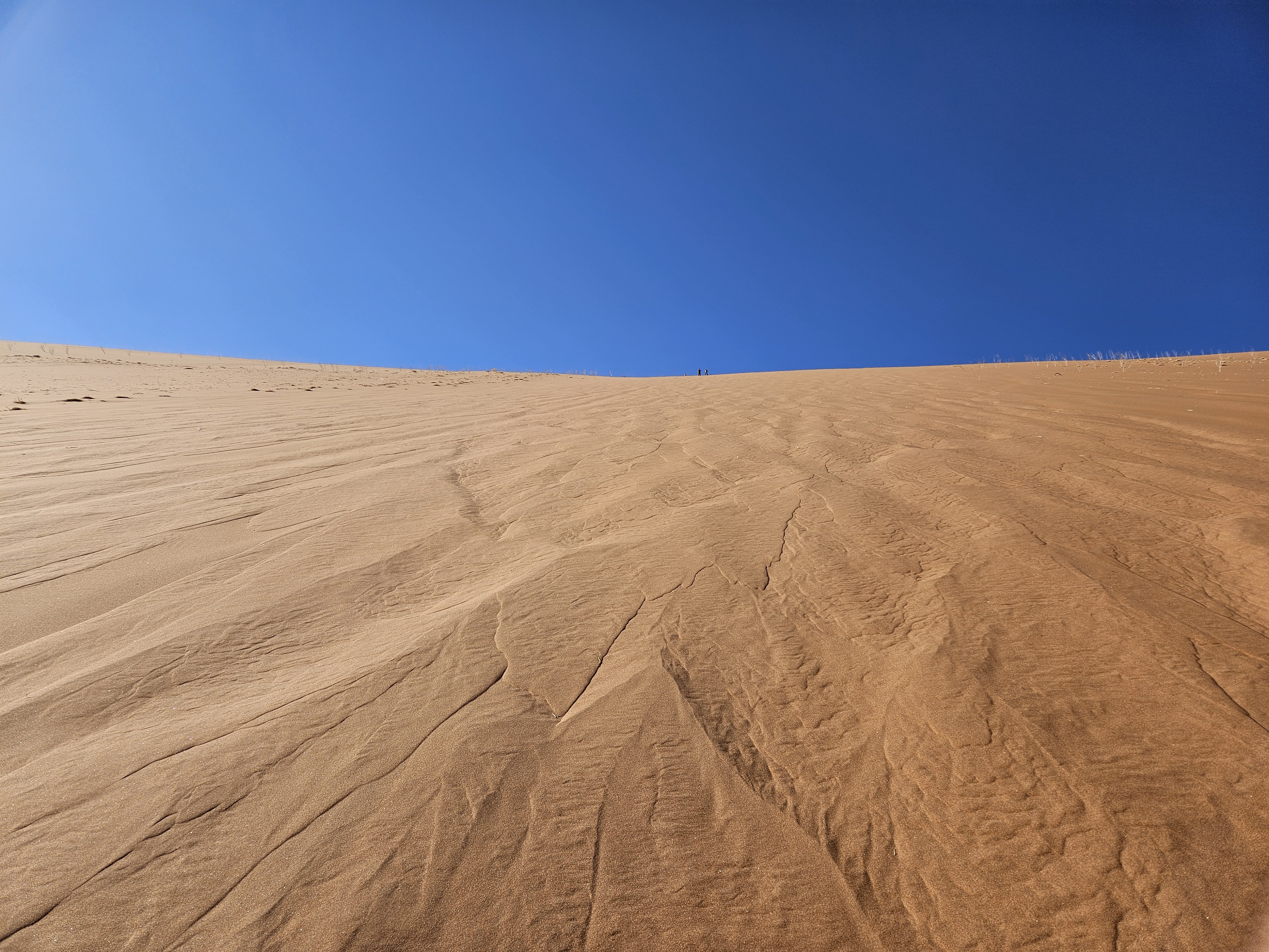 In alcuni tratti il mare sembra voler inghiottire la spiaggia, in altri concede più spazio e respiro. E’ un luogo bellissimo, che conservo negli occhi della mente. D’un tratto la spiaggia si allarga di nuovo e iniziamo a virare verso sinistra, in direzione delle dune. Siamo i primi della cordata, Andrew detta modi e tempi ai colleghi meno esperti.